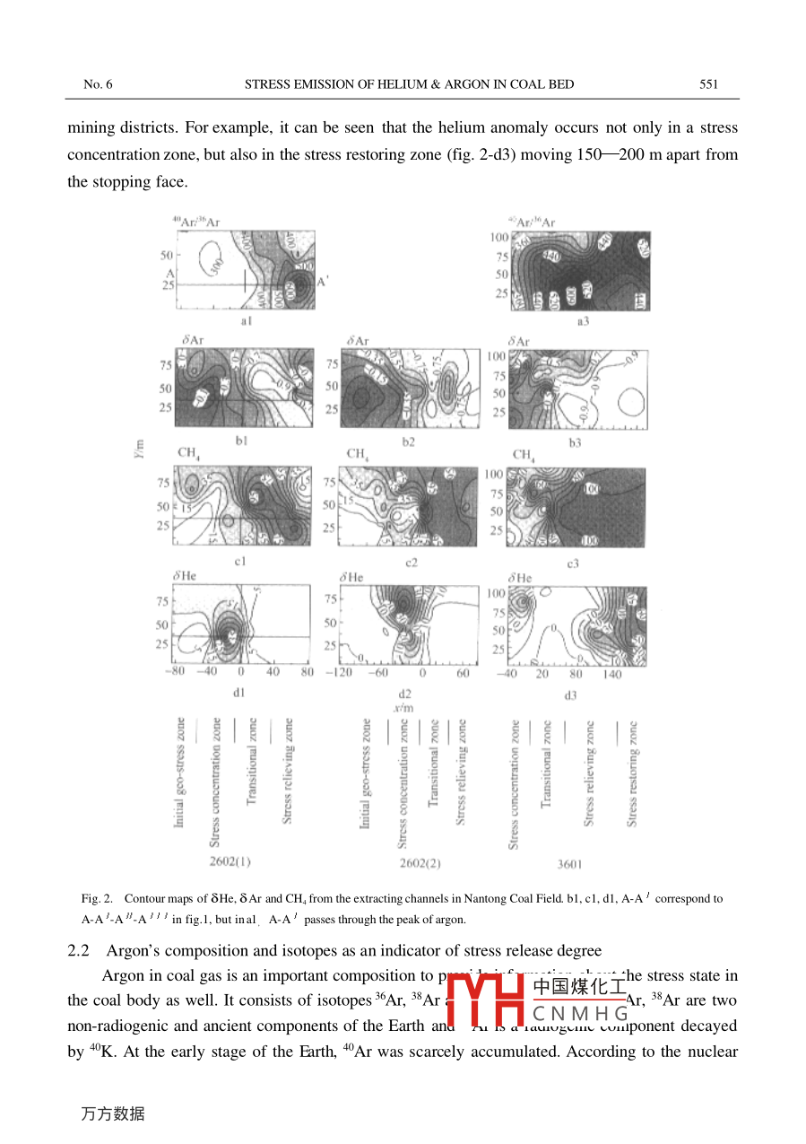 Vol 46 No 6SCIENCE IN CHINA(Series D)June 2003Stress emission of helium and argon in coal seamsZHU Ming(朱銘), ZHOU Ruiguang(周瑞光), YIN Daixun(尹代勛),GAO Yusheng(高玉生), ZHANG Fusong(張福松),CHENG Binfang(成彬芳), LIU Qiang(瀏劉強(qiáng))& LUO Xinhua(羅信華1. Institute of Geology and Geophysics, Chinese Academy of Sciences, Beijing 100029, China2. Nantong Mining Bureau, Chongqing 630802, China3. Tianjin Investigation, Design and Research Institute of Water Resources and Hydropower, Tianjin 300022, ChinaCorrespondenceshouldbeaddressedtoZhuMing(email.Zhmyr@sohu.com)Received December 17. 2002Abstract In the Yutianbao Mine, the Nantong Coal Field, Chongqing a lot of gas samples weremeasured and analyzed. It has been found in these samples that helium is sensitive to stress concentration, while argon is sensitive to stress release. Compared with the flowing out of gas itself, thecombination of helium and argon can be more suitably used as an indicator to predict gas outburstIn a mining area of this mine, both 8 He 30 and 8 Ar <-0.97 can be used critically to define thedangerous area. Also, the contour maps of 8 He, 8 Ar and CH can provide a guidance for engineering monitoringKeywords: helium, argon and its isotope, stress emanation, prediction of gas outburst, contour map, engineering geologyThe relationship between inert gas and geologic stress has been paid attention to by seis-mologists in the recent twenty years. Recent studies of seismic belts show that changes ofgeological stress can lead to emanation of inert gas from geological bodies F. In the studiedemanation of radon in a granite sample under stress in 1981, Holub et al. l found that it emitted alarge number of radon just under 1/2 o. In 1983, Honda et al. studied release effect of heliumand argon from various rocks under a uniaxial stress, concluding that the degas of squeezed sam-ples should primarily depend on new surfaces produced by expansion. These results show that therelease effect of helium and argon is only related to physical process of stress changes. Accordinto Ozima, the emanation of inert, such as helium and argon, due to a geologic dynamic process,is called stress emanation. Of course, an earthquake is a larger scale geological dynamic processThen, can the stress emanation be found in engineering geological scale? It is the problem to bediscussed in this paperIn engineering geological studies, one of the most interesting and important tasks is to evalu-ate and predict geological disasters threatening engineering projects. For this reason, monito中國煤化工)mw,theCNMHGSOft rock, kata-rock and clay rock. Moreover, even in hard rock, it is difficult to know real stress changesCoal is a soft rock and contains a lot of radiogenic helium and argon that had long beenSCIENCE IN CHINA (Series D)VoL 46accumulated owing to decaying of radioactive elements U, Th and K. In addition, a certainamount of non-radiogenic helium and argon (including the atmosphere-derived different geologi-cal periods ) could be trapped, therefore, the abundance of He and the isotopic ratio of Ar are farhigher in coal and gas than in atmosphere. In coal mining process, since the stress state and itschange in different mining positions are sometimes known, it is possible to establish the relation-ship between the stress state and the inert gas emanation. In the Longtan coal system, South Chinathere are a plenty of the suction holes, favorable for gas sampling in this study. Therefore, a coal-an ideal natural laboratory for studying the relationship between stress and helium andargon emanation in soft rockGeological background, sample location and analysis techniqueThe work area is located in the yutian bao mine of the nantong coal district. about 130 kmsouth of Chongqing City, China. In the Nantong Coal District the outbursts of coal and gas havebeen very serious. Since 1955, such accidents have happened more than 1200 times, includingtimes of bursting out 500-1000 t coal and twice of more than 1000 t. The Longtan coal system ofPermian ages here contains 7 bed coals, in which coal seams No 4 and No 6 are exploitable beds2.5-3.2 m and 1.5 m thick, respectively. In coal seam No 4 as the mainly mined bed, the coaland gas outbursts are frequent and serious, while in No. 6 they are accidentalMost part of the Yutianbao Mine is located in the Bamianshan syncline and its east and westflanks belong to the Yaqueyan shear fold zone and the Yutangjiao shear fold zone, respectively.Huge outbursts accidents have been focused near Fault Fl through the central part of the Bamianshan syncline and in the Yaqueyan shear fold zone. In order to decrease the danger of coal and gasoutbursts coal seam No. 6 has first been mined to relieve stress in coal seam no. 4. with miningof coal seam No 6, a different stress state occurs in coal seam No 4 (and it can usually be dividedinto four zones: the initial geo-stress zone (normal stress zone), the stress concentration zone, thetransitional zone, and the stress relieving zone). But as the further mining of the underlying coalseam No 6, the stress state in the overlying coal seam No 4 continued to vary. Although someng measures were adopted, the danger of coal and gas outburst accident has not beenreduced yet. In order to reduce such a danger as much as possible and to utilize gas as fuel, theextracting channels between No 4 and No. 6 were dug in a certain density, and then from thesechannels, the suction holes were drilled toward coal seam No. 4. A gas-extracting system was setup to utilize gas. It is the suction holes that provide us a good chance to collect gas samplesThe samples used in this study were collected from mining areas No 2602(30 m level) andNo, 3601(100 m level) of the Yutianbao Mine. In mining area No 2602 samples were collectedtwice, with an interval of 8 days. In addition, gas was t中國煤化工 machine channelNo3602 of the Yutianbao mine and airway No 2603 ofCNMHGAll samples of H