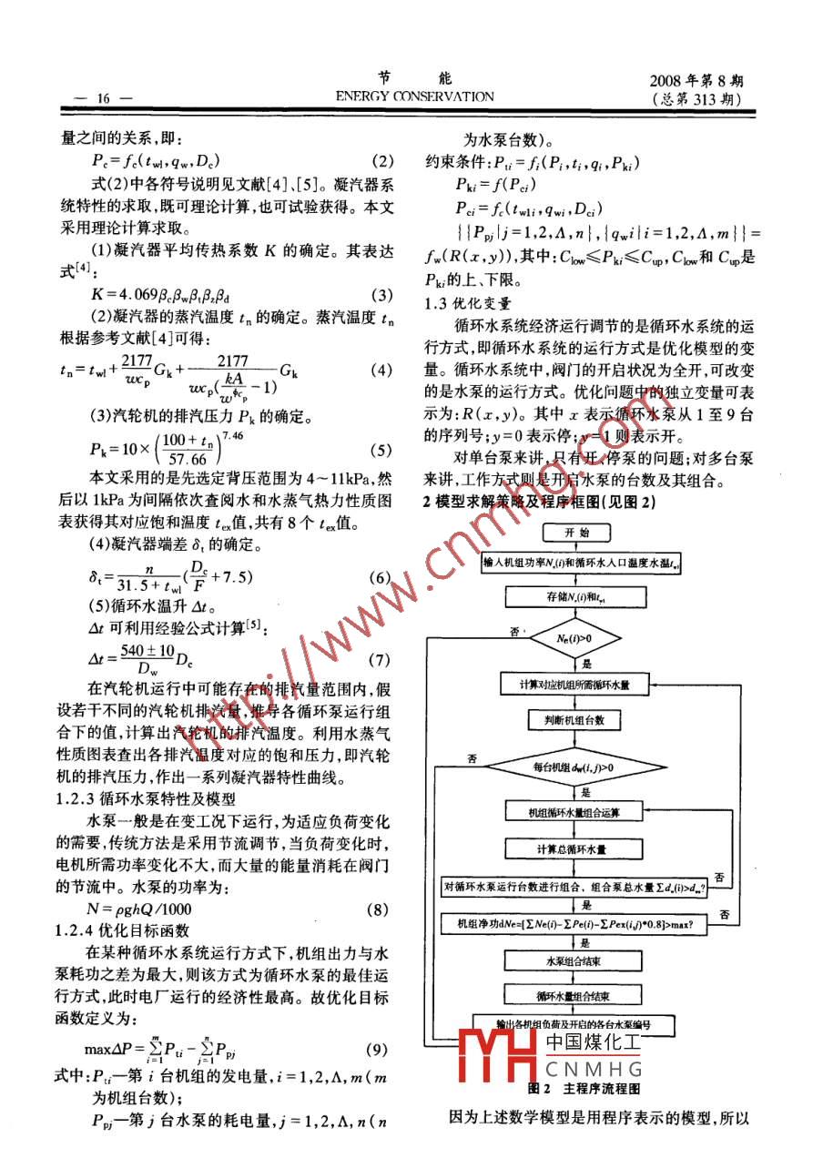 2008年第8期節(jié)能(總第313期)ENERGY CONSERVATION-15-復(fù)雜循環(huán)水系統(tǒng)經(jīng)濟運行方案的優(yōu)化設(shè)計及軟件開發(fā)盧緒祥,喬建,靳攀科,李錄平(長沙理工大學(xué)能源與動力工程學(xué)院,湖南長沙410076)摘要:以金竹山電廠復(fù)雜循環(huán)水系統(tǒng)為例,建立循環(huán)水系統(tǒng)的簡化物理模型以及各主要設(shè)備的數(shù)學(xué)模型,對該廠復(fù)雜循環(huán)水系統(tǒng)經(jīng)濟運行方案進行最優(yōu)化設(shè)計。在Microsoft Visual Besic 6.0環(huán)境下,開發(fā)出循環(huán)水系統(tǒng)經(jīng)濟運行指導(dǎo)系統(tǒng),根據(jù)機組運行方式及季節(jié)的變化合理安排江邊泵房和I泵房循環(huán)水泵的運行,實現(xiàn)循環(huán)水泵的經(jīng)濟調(diào)度。關(guān)鍵詞:火電廠;循環(huán)水系統(tǒng);優(yōu)化設(shè)計;軟件開發(fā)中圖分類號:TM621.4文獻標(biāo)識碼:A 文章編號:1004 - 7948(2008)08 - 0015 -03引言為濕蒸汽,可取多變指數(shù)n=1.13。由能量守恒和熱力發(fā)電廠的循環(huán)水系統(tǒng)是-一個龐大的動力系連續(xù)性方程可得汽輪機的內(nèi)功率增量OP:與背壓統(tǒng),其供水量很大,一般是汽輪機排汽量的50~ 120Pk變化的關(guān)系[4]:倍,其消耗的電能約占總發(fā)電量的1%~1.5%。長SP:=βGrx期以來許多發(fā)電廠結(jié)合各自的系統(tǒng)情況,提出和采pGGkn。1.用了一些優(yōu)化運行方案,取得了一定的經(jīng)濟效[FP-8S - poosB2)1. 13FPk.8一p2s ]xmxOP益[1-3]。(1)最優(yōu)化理論及計算方法的發(fā)展以及計算機的廣式(1)中各符號說明見文獻[4]。泛應(yīng)用為實現(xiàn)循環(huán)水系統(tǒng)的最優(yōu)化提供了良好的基江邊泵房礎(chǔ)I3)。本文根據(jù)金竹山電廠循環(huán)水系統(tǒng)的復(fù)雜性,凝汽器通過建立循環(huán)水系統(tǒng)模型,利用計算機和最優(yōu)化理西國論,對該廠復(fù)雜循環(huán)水系統(tǒng)的運行方案進行最優(yōu)化設(shè)計,并開發(fā)了循環(huán)水系統(tǒng)的運行指導(dǎo)系統(tǒng),根據(jù)機⑤組運行方式及季節(jié)的變化合理安排江邊泵房和I泵C- DQ5"房循環(huán)水泵的運行,以提高機組汽輪機真空,減少廠用電和降低煤耗。1金竹山電廠循環(huán)水系統(tǒng)物理及數(shù)學(xué)模型圖1金竹山電廠 循環(huán)水系統(tǒng)簡圉循環(huán)水系統(tǒng)經(jīng)濟運行優(yōu)化分析中包含循環(huán)水、汽輪機微增出力APT與機組背壓Pk的關(guān)系為凝汽器和汽輪機三組模型。模型除正確反映實際系OPr=f(Pr,Pk)。金竹山電廠6臺機組的微增出統(tǒng)的運行特性外,還要考慮獲得模型的難易程度以力與機組背壓關(guān)系[6]如下:及對優(yōu)化算法的影響等因素。適當(dāng)?shù)哪P蛻?yīng)易于獲(1)對于1#~2#機組:負荷相對于排汽壓力的得,滿足算法簡單、結(jié)果可靠等多方面的要求。1.1循環(huán)水系統(tǒng)簡化物理模型變化率= - 500x 10kW MPa;aPx金竹山電廠循環(huán)水系統(tǒng)是雙母管制系統(tǒng)。江邊(2)對于3# ~6#機組:負荷相對于排汽壓力的泵房和I泵房通過耦合管路相互耦合,凝汽器側(cè)的aNe5#和6#凝汽器可接受來自江邊泵房和I泵房的循變化率。= - 776.2x 10kW/MPa;環(huán)水,但這兩處的循環(huán)水不能混合,而且凝汽器側(cè)的(3)對于4#機組:負荷相對于排汽壓力的變化1#~4#凝汽器不能接受來自IHI 泵房的循環(huán)水。系中國煤化工統(tǒng)簡化模型如圖1所示。HCNMH G1.2循環(huán)水系統(tǒng)數(shù)學(xué)模型1.2.2凝幾奇村性及俁型1.2.1汽輪機特性模型凝汽器特性可表述為在- -定的設(shè)備組成和連接當(dāng)新蒸汽參數(shù)和流量不變時,由于汽輪機末級方式下,凝汽器的壓力與循環(huán)水溫、循環(huán)水量和排汽節(jié)能2008年第8期16一ENERGY CONSERVATION. (總第313期)量之間的關(guān)系,即:為水泵臺數(shù))。P:= fe(twi,qw,D。)(2)約束條件:Pi = f;(Pi,ti,q,Px)式(2)中各符號說明見文獻[4]、[5]。凝汽器系Pki= f(Pe;)統(tǒng)特性的求取,既可理論計算,也可試驗獲得。本文P。i= f&(twi,qwi,Dg;)采用理論計算求取。{{Pp;lj=1,2,A,n},{qwili=1,2,A,m}}=(1)凝汽器平均傳熱系數(shù)K的確定。其表達fw(R(x,y)),其中:Cow≤Ph;≤Cp,Cx和Cq是.式[4]:Px;的上、下限。K =4.069β。βββa .(3)1.3優(yōu)化變量(2)凝汽器的蒸汽溫度tn的確定。蒸汽溫度t,循環(huán)水系統(tǒng)經(jīng)濟運行調(diào)節(jié)的是循環(huán)水系統(tǒng)的運根據(jù)參考文獻[4]可得:行方式,即循環(huán)水系統(tǒng)的運行方式是優(yōu)化模型的變2177tn=tw+ucp:w.(N-1)Jk(4)量。循環(huán)水系統(tǒng)中,閥門的開啟狀況為全開,可改變的是水泵的運行方式。優(yōu)化問題中的獨立變量可表(3)汽輪機的排汽壓力Pk的確定。示為:R(x,y)。其中x表示循環(huán)水泵從1至9臺Pk= 10x100+ tn(5)的序列號;y=0表示停;y=1則表示開。57. 66對單臺泵來講,只有開、停泵的問題;對多臺泵本文采用的是先選定背壓范圍為4~ 11kPa,然來講,工作方式則是開啟水泵的臺數(shù)及其組合。后以1kPa為間隔依次查閱水和水蒸氣熱力性質(zhì)圖2模型求解策略及程序框圖(見圖2)表獲得其對應(yīng)飽和溫度ta值,共有8個te值。C開始口(4)凝汽器端差8, 的確定。輸人機組功率N.()和循環(huán)水人口溫度水溫。8-=31.5+(F +7.5)(6)存儲N.(0)和,(5)循環(huán)水溫升Ot。Ot可利用經(jīng)驗公式計算[5]:Ne()>0Ot=540土10(7)是D+10D。在汽輪機運行中可能存在的排汽量