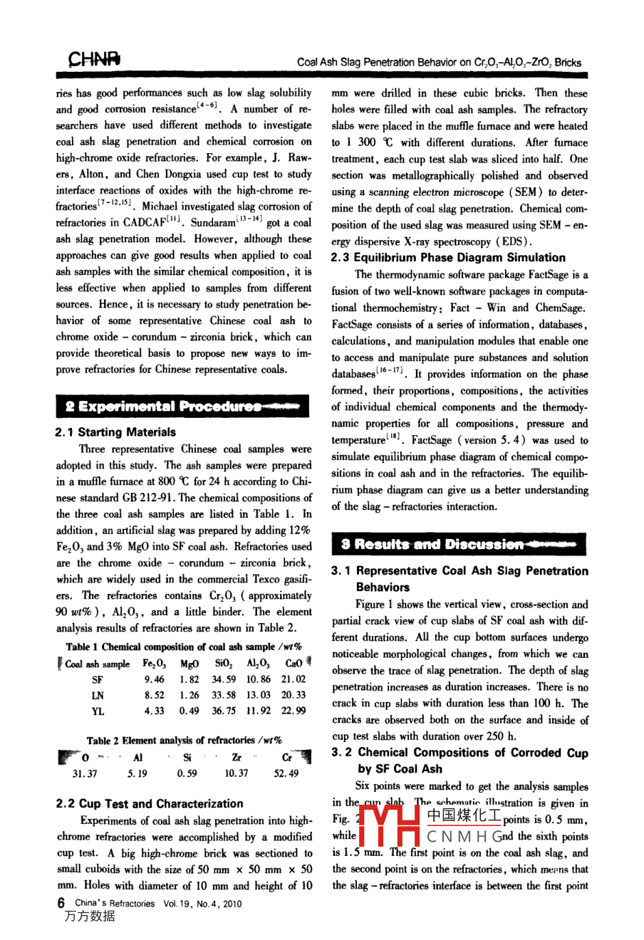 China's RefractoriesCHNPTang Lihua, born in Jan. 1965, obtained his bachelor's degree, master's degree, and doctorsdegree from East China University of Science and Technology(ECUST)in 1987, 1996, and 2004, respec-tively. He is now the lead teacher of core course of Chemical Technology and mainly engages in the researchof coal transformation technology and waste solid resourcing technology. He also holds a part-time job as thejudge expert of Ministry of Education Study-abroad-returm Scientific Research Start Fund and member ofChina Chemical Industry Society. He has authored and co-authored 48 papersCoal ash Slag penetration behavior onCr.. -Zro, bricksTANG Lihua, GAO Ling, WANG Qiong, CHEN Dongxia, ZHOU YamingWANG Wenmei, WU Yongqiang, ZHU Zibin1 Engineering Research Center of Large Scale Reactor Engineering and Technology, East ChinaUniversity of Science and Technology, Shanghai 200237, China2 Shanghai Coking Chemical Corporation, Shanghai 200241, ChinaAbstractpared with the other gasifiers, slagging coal gasiThe penetration behavior of different kinds of coal joys great advantages in technical operationash slags into chrome corundum bricks was studied by ment, and supporting refractories. At presentcup test. As a preliminary attempt, the oxides of Fe20, most popular slagging coal gasifier in China is Texcoand MgO were added into coal ash to reduce the erosion gasifier, which operates at 1 300-1 500C under 2.7of refractories. Different cup tests were carried out to6. 5 MPaJ. Under such harsh conditstudy coal slag erosion to the refractories. Factsage was slag forms when coal ash flows down the refractoriesused to simulate the phase diagram of the main chemical lined wall. The slag penetrates into porous refractoriescompositions in coal ash and in the refractories. Both re- matrix, and subsequently corrosive reactions occursults agreed with each other. The results show that the which may lead to refractories degradation and spalelements in coal slag can penetrate into bricks and the ling. Therefore, the high cost of refractories replace-penetration deepens wih the duration increasing: it is ment( approximately USD I million)and long downdifficult for Fe but easier for Ca and Si to penetrate into time(3-6 weeks) make the industry experts rank imbricks; different kinds of melting coal ashes penetrate in- proving refractory durability No. I in a list of 20 re-to refractories differently and the penetration depth of sil- search and development needs.Previous studiesicon and calcium can be significanly reduced by adding have shown that slag penetration and chemical corrosionKey words: Coal ash slag, Chrome oxide-alumina- gasifier" y causes for refractories degradation in ance the slag refractories interaction iszirconia brick, Penetrate, FactSageunderstood, it becomes possible to develop solutionsminal composition and4 ntrodcti。ving中國(guó)煤化工 educe thCN MHGof great importanceThe gasification process is one of the most impor- to promote theof the gasificaant means to increase Chinas energy supply andStudies and gasifier operation results have showneet the expanding needs of chemical products. Com- that chrome oxide or chrome oxide -alumina refracto-China's Refractories Vol 19. No, 4,2010 5CHNRCoal Ash Slag Penetration Behavior on Cr,O, - -Zro, Bricksries has good performances such as low slag solubility mm were drilled in these cubic bricks. Then theseand good corrosion resistance 4-6. A number of re- holes were filled with coal ash samples. The refractorysearchers have used different methods to investigate slabs were placed in the muffle fumace and were heatedcoal ash slag penetration and chemical corrosion on to 1 300 C with different durations. After furnacehigh-chrome oxide refractories. For example, J. Raw- treatment, each cup test slab was sliced into half.Oneers. Alton and Chend cup test to study section was metallographically polished and observedinterface reactions of oxides with the high-chrome re- using a scanning electron microscope(SEM)to deterfactoriesMichael investigatedof mine the depth of coal slag penetrationrefractories in CADCAFI.Sundaram3-4got a coal position of the used slag was measured using SEM-enash slag penetration model. However, althoughergy dispersive X-ray spectroscopy(EDS)approaches can give good results when applied to2. 3 Equilibrium Phase Diagram Simulationash samples with the similar chemical composition, it isThe thermodFactSage is aless effective when applied to samples from different fusion of two well-known software packages in computa-sources.Hence,it is necessary to study penetration be- tional thermochemistry: Fact-Win and ChemSagehavior of some representative Chinese coal ash to Fact Sage consists of a series of information, databaseschrome oxide - corundum zirconia brick, whichcalculations, and manipulation modules that enable oneprovide theoretical basis to propose new ways toto access and manipulate pure substances and solutionprove refractories for Chinese representative coals.he phaseformed, their proportions, compositions, the activities2 Experimental Proceduresof individual chemical components and the thermodynamic properties for all compositions, pressure and2. 1 Starting Materialstemperature is. FactSage(version 5. 4)was used toThree representative Chinese coal samples were simulate equilibrium phase diagram of chemical compo-adopted in this study. The ash samples were preparedin a mume fumace at 800 C for 24 h according to Chi-sitions in coal ash and in the refractories. The equilibnese standard GB 212-91. The chemical compositions of rium phase diagram can give us a better understandingofthe three coal ash samples are listed in Table 1. Inthe slag-refractories interactionddition, an artificial slag was prepared by adding 12%Fe,O, and 3%MgO into SF coal ash. Refractories8 Results and Discussionare the chrome oxide- corundum -zirconiawhich are widely used in the commercial Texco3.1 Representative Coal Ash Slag PenetrationBehavior