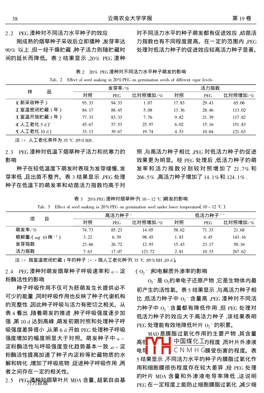 第19卷第1期云南農(nóng)業(yè)大學(xué)學(xué)報Vol.19 No. 12004年2月Journal of Yunnan Agricultural UniversityFeb. 2004聚乙二醇對煙草種子活力及幼苗保護酶活性的影響’張燕',方力,李天飛,吳業(yè)池2 ,馮永新2( 1. 云南煙草科學(xué)研究院生物技術(shù)重點實驗室,云南昆明650106 ;2.中國科學(xué)技術(shù)大學(xué)經(jīng)濟技術(shù)學(xué)院, 安徽合肥230052 )摘要:以煙草種子為材料用不同濃度的聚乙二醇PEG )浸種不同時間測定了浸種后種子萌發(fā)過程中和萌發(fā)后幼苗中某些生理生化指標(biāo)及保護酶活性的變化。結(jié)果表明,PEG浸種能顯著提高種子發(fā)芽率和幼苗活力指數(shù),增強萌發(fā)種子的呼吸強度和淀粉酶活性,以 20% PEG- 6000浸種48 h效果最好。不同活力水平的種子經(jīng)20%PEG處理后幼苗活力指數(shù)明顯提高葉片超氧物歧化酶SOD)過氧化氫酸CAT)和過氧化物酶(P0D等保護酶活性升高膜脂過氧化產(chǎn)物丙二醛(MDA和超氧陰離孔(02-)冶量及電解質(zhì)外滲率顯著低于對照。研究還發(fā)現(xiàn),PEG處理能提高種子在低溫下的萌發(fā)率增強幼苗抗冷性。關(guān)鍵詞: PEG ;活力指數(shù);煙草種子中圖分類號:s 572.041文獻標(biāo)識碼:A文章編號: 1004- 390X( 2004 )01 - 0036- 05Effects of Seed Soaking in PEG on Seed Vigor andProtective Enzyme Activities of Tobacco SeedlingsZHANG Yan' ,FANGLi ,LI Tian-feil ,WU Ye-chi? , FENG Yong- xin?( 1. Key Laboratory of Biotechnology , Yunnan Academy of Tobacco Science , Kunming 650106 ,China ;2. University of Science and Technology of China , Hefei 230052 , China )Abstract : The tobacco seeds were soaked in the different concentration PEG solution and treat them differ-ent time respectively. During germination seeds and growth seedlings , the physiological and biochemical in-dex and the activity of protective enzyme were determined. The results showed that PEG could obviously pro-mote the germination rate of tobacco seeds and vigor index of tobacco seedlings. It also could increase theintensity of respiration and a-amylase activities of germinating seeds and it had best effect with seed soakingin 20% PEG solution for 48 hours. The activity of superoxide dismutase( SOD ) , the peroxidase( POD ) andcatalase( CAT ) increased compare to the control in different vigor levels seeds. While the content of MDAand the rate of O2- production and electric conductivity decreased significantly than those the control. Thisalso indicate that increased germination rate of seeds and the chilling resistance of seedlings under lowertemperature stress thought immersed pretreatment with PEG .Key words : PEG ; vigor index ; tobacco seedPEG是一種高分子滲壓劑其突出的優(yōu)點是齊的良好效果。近幾年來PEG在多種作物和蔬菜本身作為高分子化合物不能滲入種子活細胞內(nèi)但種子中國煤化工;對促進萌發(fā)縮短出可參與細胞內(nèi)許多生理代謝過程。1973 年Hey-苗時MYHCNMH G性有-定作用1-3。decker首次利用PEG處理蔬菜種子取得了出苗整Woodstock又發(fā)現(xiàn)PEG具有修補老化種子膜損傷作*收稿日期:2003-05 -08作者簡趙振燕( 1963- ) ,女安徽合肥人副研究員主要從事煙草生理生化研究。第1期張燕等聚乙二醇對煙草種子活力及幼苗保護酶活性的影響37用。本文就PEG處理對種子活力、幼苗生長及某重計算幼苗活力指數(shù)。些與抗逆性有關(guān)的酶活性變化進行了探討,以期為1.3.2 測定項目及方法PEG在煙草上的應(yīng)用提供理論參考。電解質(zhì)外滲率測定參照陳光儀4]的方法,用DDS一307 型電導(dǎo)率儀測定浸出液電導(dǎo)率;種子發(fā)1材料和方法芽的第6d分別按文獻5和文獻6]的方法測定1.1 供試材料萌發(fā)種子呼吸強度和a-淀粉酶活性,丙二醛煙草品種為NC89 ,PEG- 6000(分析純)為上海( MDA )含量測定參照朱廣廉6的方法超氧陰離子化學(xué)試劑廠進口分裝。(O2-含量測定參照王愛國7等的方法將顯色反1.2 試驗方法應(yīng)產(chǎn)物于530 nm處比色在標(biāo)準(zhǔn)曲線上查得NO2 -1.2.1 PEG處理的濃度后換算成02-產(chǎn)生速率。SOD 活性測定按PEG浸種處理分為2組(1 )分別用10% ,劉鴻先等8]的方法;CAT酶活性按李柏林等9]的方20% 30%( W/V )不同濃度的PEG溶液浸種處理煙法測定;POD 活性測定用愈創(chuàng)木酚法10] ;以上測定草種子24h 48h 72h(2 )用20%的PEG溶液對均重復(fù)3次取平均值。高、低不同活力水平種子浸種48h浸種后用蒸餾水洗去種子表面PEG室溫下晾干對照種子用蒸2結(jié)果與分析餾水浸種。2.1 PEG 浸種對煙草種子萌發(fā)和幼苗活力的影響1.2.2 萌發(fā)試驗.表1結(jié)果顯示經(jīng)不同濃度PEG處理不同時萌發(fā)試驗分為2組( 1將不同濃度PEG處理間后種子發(fā)芽率和發(fā)芽指數(shù)較對照有明顯提高幼種子和對照種子在26 C黑暗條件下發(fā)芽(2 )20%苗活力指數(shù)和生長勢較對照有不同程度的增加在PEG處理的種子和對照種子在10~ 12 C低溫條件田間表現(xiàn)上可能是出苗率高、出苗整齊。PEG 處理.下萌發(fā)。種子萌發(fā)后,定量補充Hongland培養(yǎng)液,對種子活力的效應(yīng)與PEG濃度和作用時間有關(guān)。每天光照12h生長溫度25+2)C培養(yǎng)20d后取生低濃度下種子發(fā)芽率、幼苗活力指數(shù)和生長勢均.長-致的幼苗測定葉片中有 關(guān)生理生化指標(biāo)。隨處理時間的延長而提高高濃度時隨處理時間延1.3 測定項目和方法長種子發(fā)芽率和活力指數(shù)有所下降和對照相比仍1.3.1 種子發(fā)芽率和幼苗活力測定高于對照。綜合各項指標(biāo)分析,以20