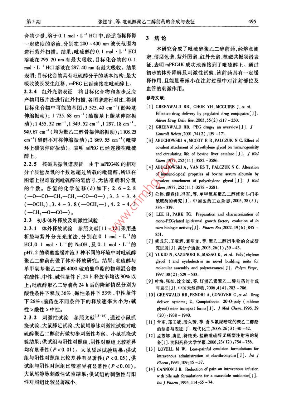 廣東藥學(xué)院學(xué)報Journal of Guangdong Pharmaceutical College Oct, 2009, 25(5)吡硫醇聚乙二醇前藥的合成與表征張圍宇,王紅,蔡波濤,胡春玲(湖北中醫(yī)學(xué)院藥學(xué)院湖北武漢430065)摘要:目的合成吡硫醇聚乙二醇前體藥物,對目標(biāo)化合物進行初步體外釋放及刺激性試驗研究。方法以單甲氧基聚乙二醇4000為原料,與丁二酸酐反應(yīng)后再與N羥基丁二酰亞胺縮合得到活潑酯最后與吡硫醇反應(yīng)得到目標(biāo)化合物;用薄層色譜、紫外、紅外、核磁共振氫譜對其結(jié)構(gòu)進行表征。結(jié)果與結(jié)論合成產(chǎn)物的結(jié)構(gòu)表征結(jié)果表明單甲氧基聚乙二醇4000成功地連接到了吡硫醇上;初步的體外降解及刺激性試驗表明該前藥具有一定緩釋作用,且能顯著減小對注射部位及血管的刺激作用。關(guān)鍵詞:吡硫醇;單甲氧基聚乙二醇;前藥;結(jié)構(gòu)表征中圖分類號:R914文獻標(biāo)識碼:A文章編號:1006-8783(200)05-0493-03Synthesis and characterization of pyritinol-PEGZHANG Wei-yu, WANG Hong, CAI Bo-tao, HU Chun-ling( School of pharmacy, Hubei University ofChinese medicine, Wuhan 430065. ChinaAbstract: Objective To synthesize and characterize pyritinol-PEG prodrug, and assess its in vitro releaseand imitation. Methods mPEG4K was first reacted with succinic anhydride, and then treated with Nhydroxyl succinic anhydride, finally, reacted with pyritinol to give the target pyritinol-PEG which is theprodrug of pyritinol. Results The chemical structure of pyritinol-PEG was characterized by TLC, UV, FTIRand 'H-NMR. Conclusion The structural characterization of the target compound showed that mPEG4Kwas bonded to pyritinol. This prodrug has slow-release profile during in vitro release test, and significantlylow vascular imitationKey words: pyritinol methoxy polyethyleneglycol; prodrug; synthesis高分子量的聚乙二醇及其單甲氧基聚乙二醇等枝狀及注射部位乃至整個上肢皮膚水腫、發(fā)硬癢痛由于其良好的水溶性生物相容性和無免疫原性以等不良反應(yīng)。作者通過采用單甲氧基聚乙二醇的活及無毒等優(yōu)點在前體藥物的制備中有越來越多的化酯與吡硫醇合成前體藥物3叫,以期改善吡硫醇應(yīng)用12。吡硫醇臨床上主要用于腦震蕩綜合癥、藥物半衰期短以及刺激性大的問題腦外傷后遺癥、腦炎及腦炎后遺癥等的頭脹痛、頭暈失眠、記憶力減退注意力不集中情緒變化等癥1實驗部分狀的改善亦用于腦動脈硬化、老年癡呆等。臨床主1.1儀器與試劑要用其鹽酸鹽,因其半衰期短,口服給藥需每天3次很不方便;靜脈滴注時,藥物對血管黏膜有刺激RE52AA旋轉(zhuǎn)蒸發(fā)儀(上海亞榮生化儀器廠);作用,易發(fā)生注射部位血管腫脹疼痛、呈青紫色樹78HW型恒溫磁力攪拌器(杭州儀表電機有限公司);SKFG01電熱恒溫鼓風(fēng)干燥器(湖北省黃石市醫(yī)療器械廠);SHB-Ⅲ循環(huán)水式多用真空泵(鄭州長收稿日期:2009-07-01;修回日期:2009-10-11城科工貿(mào)有限公司);Uv-1700紫外可見分光光度計基金項目:湖北省自然科學(xué)基金資助課題(200ABA213)作者簡介:張圍字(1981-),男在讀碩士研究生,Ema:(日本島津);DFY低溫恒溫反應(yīng)浴(鄭州長城儀器zhangweivusuper@163.com,通訊作者:王紅(98-),有限公司);wRSB數(shù)字熔點儀(上海精密科學(xué)儀女教授碩士生導(dǎo)師,主要從事新藥研究與開發(fā),器公司); Perkin-Elmer Spectrum200FTR光譜儀Email:wanghonghb502@yahoo.com.cne(美國PE公司);AS600(600MHz)高分辨率核磁共494廣東藥學(xué)院學(xué)報第25卷振儀;ZF6型三用紫外線分析儀(上海嘉鵬科技有85%,mp56.3-58.2℃。限公司)。1.2.2吡硫醇聚乙二醇前藥的合成參照文藥用單甲氧聚乙二醇400mPEC4K)(南京威獻進行合成試驗研究。稱取干燥的mPEC4K爾化工有限公司);吡硫醇(質(zhì)量分數(shù):98.5%,水A4.0g(0.1mmoL),用50 mL DMF溶解,0~5℃分:0.17%,批號:080519,上海新云化工有限公司提攪拌20min,依次加人NHs0.23g(0.2mmoL)和供);丁二酸酐、二環(huán)己基碳酰亞胺(DCC)、N羥基DCC0.62g(0.3mmoL),0~5℃攪拌10min,依次琥珀酰亞胺(NHS)、對二甲氨基吡啶(DMAP)、薄層加入吡硫醇0.48g(0.13mmoL)和DMAP0.16g層析硅膠GF、均為化學(xué)純,N,N-二甲基甲酰胺(0.13mmoL)。0~5℃反應(yīng)2h,30~35℃下反應(yīng)(DMF)、三氯甲烷、二氯甲烷、乙醚、甲醇、吡啶、丙20h,停止反應(yīng),反應(yīng)液過濾,濾液在快速攪拌下加酮均為分析純?nèi)肜湟颐?80mL,攪拌5min后置冰箱中靜置301.2方法mn。過濾得淺米黃色固體,將固體用30mL水溶解,1.2.1單甲氧基聚乙二醇4000琥珀酸單酯過濾濾液用二氯甲烷萃取(35mL×3),用1mol/L(mPEC4KA)的合成參照文獻[7-8]進行合成HCl洗滌(10mL×2)后再用水洗(15mL×2)。加試驗研究。稱取干燥的單甲氧基聚乙二醇4000人適量無水硫酸鈉干燥,靜置過夜。過濾干燥劑,濾(mPEC400040g(10mmoL),溶于150mL三氯甲液再用0.45μm微孔濾膜過濾,濾液濃縮,快速攪烷中加入丁二酸酐2.0g(20mmL)和1.6mL吡拌下加入冷無水乙醚沉淀產(chǎn)物,過濾得淺米黃色粉啶加熱回流反應(yīng)48h,減壓回收溶劑,殘余物中加末40℃真空干燥24h(干燥劑為P2O3),得淺米入飽和 NaHco3溶液150mL使溶解,過濾,用80黃色粉末(吡硫醇的載藥量4.89%),mp56.5mL乙酸乙酯萃取2次,水相冷卻至0℃后用2mo59.2℃L的HC酸化至pH2左右,用二氯甲烷100mL分32結(jié)果與討論次萃取,合并二氯甲烷層,無水Na2SO4干燥過夜。濾去干燥劑濃縮至粘稠快速攪拌下加入冷無水乙2.1合成醚300mL,放入冰箱靜置,待產(chǎn)品完全析出后過濾吡硫醇聚乙二醇前藥的