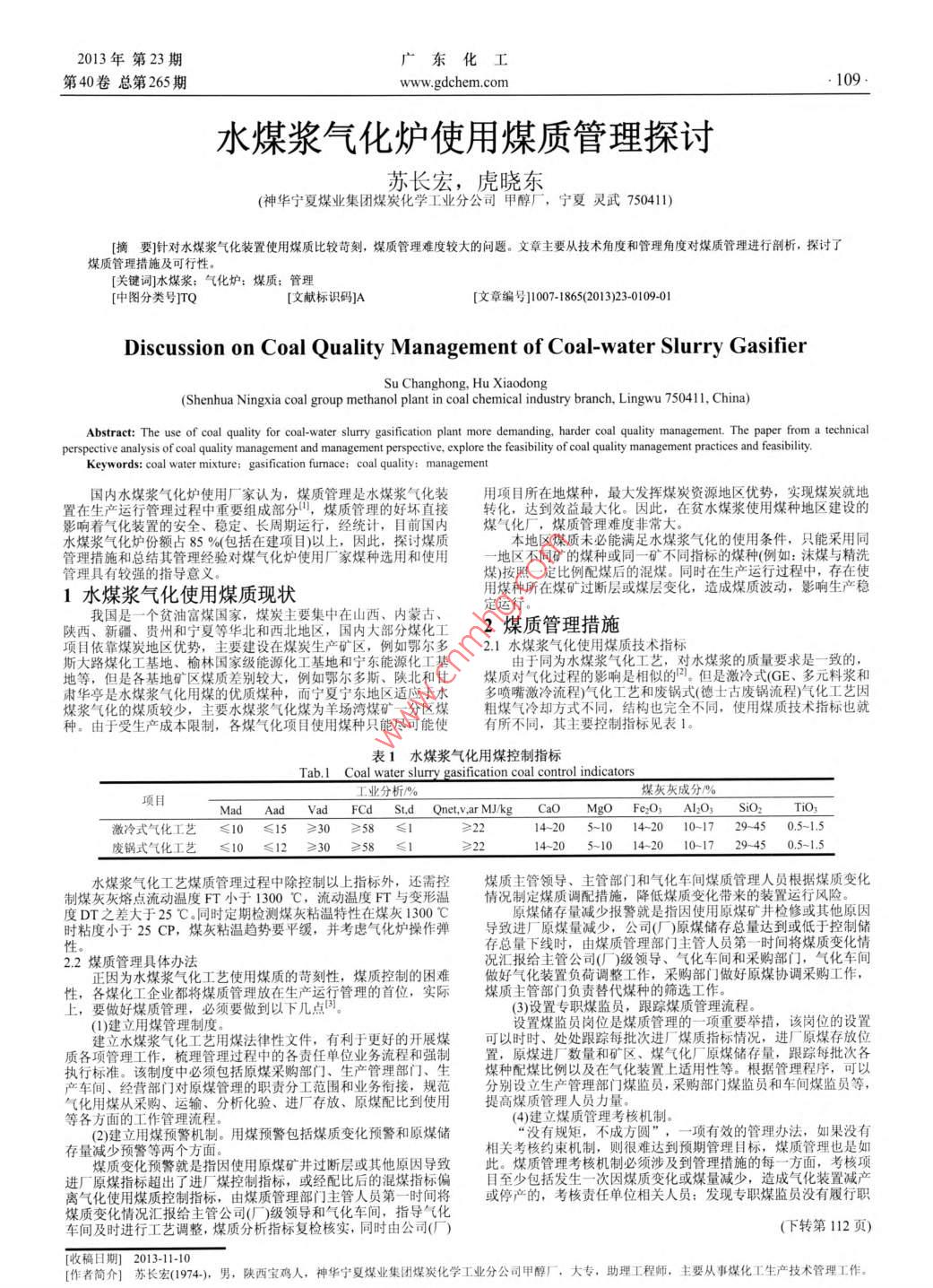 2013年第23期廣東化工第40卷總第265期www.gdchem.com109水煤漿氣化爐使用煤質(zhì)管理探討蘇長(zhǎng)宏,虎曉東(神華寧夏煤業(yè)集團(tuán)煤炭化學(xué)工業(yè)分公司甲醇廠,寧夏靈武750411)摘要]針對(duì)水煤漿氣化裝置使用煤質(zhì)比較苛刻,煤質(zhì)管理難度較大的問題。文章主要叢技術(shù)角度和管理角度對(duì)煤質(zhì)管理進(jìn)行剖析,探討了煤質(zhì)管理措施及可行性關(guān)鍵詞水煤漿;氣化爐;煤質(zhì);管中圖分類號(hào)TQ[文獻(xiàn)標(biāo)識(shí)碼]A[文章編號(hào)]007-1865(2013)23-0109-01Discussion on Coal Quality Management of Coal-water Slurry GasifierSu changhong,Hu Xiaodong(Shenhua Ningxia coal group methanol plant in coal chemical industry branch, Lingwu 750411, China)Abstract: The use of coal quality for coal-water slurry gasification plant more demanding, harder coal quality management. The paper from a technicalperspective analysis of coal quality management and management perspective, explore the feasibility of coal quality management practices and feasibilityKeywords: coal water mixture: gasification fumace: coal quality: management國內(nèi)水煤漿氣化爐使用廠家認(rèn)為,煤質(zhì)管理是水煤漿氣化裝用項(xiàng)目所在地煤種,最大發(fā)揮煤炭資源地區(qū)優(yōu)勢(shì),實(shí)現(xiàn)煤炭就地轉(zhuǎn)化,達(dá)到效益最大化。因此,在貧水煤漿使用煤種地區(qū)建設(shè)的響著氣化裝置的安全、穩(wěn)定、長(zhǎng)周期運(yùn)行,經(jīng)統(tǒng)計(jì),目前國內(nèi)煤氣化廠,煤質(zhì)管理難度非常大水煤漿氣化爐份額占85%(包括在建項(xiàng)目)以上,因此,探討煤質(zhì)本地區(qū)煤質(zhì)未必能滿足水煤漿氣化的使用條件,只能采用同管理措施和總結(jié)其管理經(jīng)驗(yàn)對(duì)煤氣化爐使用廠家煤種選用和使用地區(qū)不同礦的煤種或同一礦不同指標(biāo)的煤種(例如:沫煤與精洗管理具有較強(qiáng)的指導(dǎo)意義。煤)按照一定比例配煤后的混煤。同時(shí)在生產(chǎn)運(yùn)行過程中,存在使1水煤漿氣化使用煤質(zhì)現(xiàn)狀用煤種所在煤礦過斷層或煤層變化,造成煤質(zhì)波動(dòng),影響生產(chǎn)穩(wěn)定運(yùn)行。陜西、霸疆、賈州和寧復(fù)等華北和西北地區(qū),國內(nèi)大部分煤化工2煤質(zhì)管理措施項(xiàng)目依靠煤炭地區(qū)優(yōu)勢(shì),主要建設(shè)在煤炭生產(chǎn)礦區(qū),例如鄂爾多2.1水煤漿氣化使用煤質(zhì)技術(shù)指標(biāo)由于同為水煤漿氣化工藝,對(duì)水煤漿的質(zhì)量要求是一致的地等,但是各基地礦區(qū)煤質(zhì)差別較大,例如鄂爾多斯、陜北和甘煤質(zhì)對(duì)氣化過程的影響是相似的2。但是激冷式(GE、多元料漿和肅華亭是水煤漿氣化用煤的優(yōu)質(zhì)煤種,而寧夏寧東地區(qū)適應(yīng)于水煤漿氣化的煤質(zhì)較少,主要水煤漿氣化煤為羊場(chǎng)灣煤礦一分區(qū)煤粗煤氣冷卻方式不同,結(jié)構(gòu)也完全不同,使用煤質(zhì)技術(shù)指標(biāo)也就種。由于受生產(chǎn)成本限制,各煤氣化項(xiàng)目使用煤種只能盡可能使有所不同,其主要控制指標(biāo)見表1表1水煤漿氣化用煤控制指標(biāo)Tab. I Coal water slurry gasification coal control indicators工業(yè)分析煤灰灰成分%項(xiàng)目Mad Aad Vad FCd St, d Qnet, v, ar MJ/kg Cao Mgo Fe O, Al O, SiO: TI激冷式氣化工藝≤10≤15≥30≥58≤114-205-1014-2010-1750.5-1.5廢鍋式氣化工藝≤10≤12≥30≥58≤114-205-1014-2010-1729450.5-1.5煤漿氣化工藝煤質(zhì)管理過程中除控制以上指標(biāo)外,還霱控煤質(zhì)主管領(lǐng)導(dǎo)、主管部門和氣化車間燦質(zhì)管理人員根據(jù)煤質(zhì)變化制煤灰灰熔點(diǎn)流動(dòng)溫度F小于1300℃,流動(dòng)溫度FT與變形溫情況制定煤質(zhì)調(diào)配措施,降低煤質(zhì)變化帶來的裝置運(yùn)行風(fēng)險(xiǎn)。度DT之差大于25℃。同時(shí)定期檢測(cè)煤灰粘溫特性在煤灰1300℃原煤儲(chǔ)存量減少報(bào)警就是指因使用原煤礦井檢修或其他原因時(shí)粘度小于25CP,煤灰粘溫趨勢(shì)要平緩,并考慮氣化爐操作彈導(dǎo)致進(jìn)廠原煤量減少,公司(廠)原煤儲(chǔ)存總量達(dá)到或低于控制儲(chǔ)存總量下線時(shí),由煤質(zhì)管理部門主管人員第一時(shí)間將煤質(zhì)變化情22煤質(zhì)管理具體辦法況匯報(bào)給主管公司(廠)級(jí)領(lǐng)導(dǎo)、氣化車間和采購部門,氣化車間正因?yàn)樗簼{氣化工藝使用煤質(zhì)的煤質(zhì)控制的困難做好氣化裝置負(fù)荷調(diào)整工作,采購部門做好原煤協(xié)調(diào)采購工作上,要做好煤質(zhì)管理,必須要做到以下幾點(diǎn)理的首位,實(shí)際性,各煤化工企業(yè)都將煤質(zhì)管理放在生管理的首位,實(shí)際煤質(zhì)主管部門負(fù)責(zé)替代煤種的篩選工作。(3)設(shè)置專職煤監(jiān)員,跟蹤煤質(zhì)管理流程。(1)建立用煤管理制度。設(shè)置煤監(jiān)員崗位是煤質(zhì)管理的一項(xiàng)重要舉措,該崗位的設(shè)置建立水煤漿氣化工藝用煤法律性文件,有利于更好的開展煤可以時(shí)時(shí)、處處跟蹤每批次進(jìn)廠煤質(zhì)指標(biāo)情況,進(jìn)廠原煤存放位質(zhì)各項(xiàng)管理工作,梳理管理過程中的各責(zé)任單位業(yè)務(wù)流程和強(qiáng)制置,原煤進(jìn)廠數(shù)量和礦區(qū)、煤氣化廠原煤儲(chǔ)存量,跟蹤每批次各執(zhí)行標(biāo)準(zhǔn)。該制度中必須包括原煤采購部門、生產(chǎn)