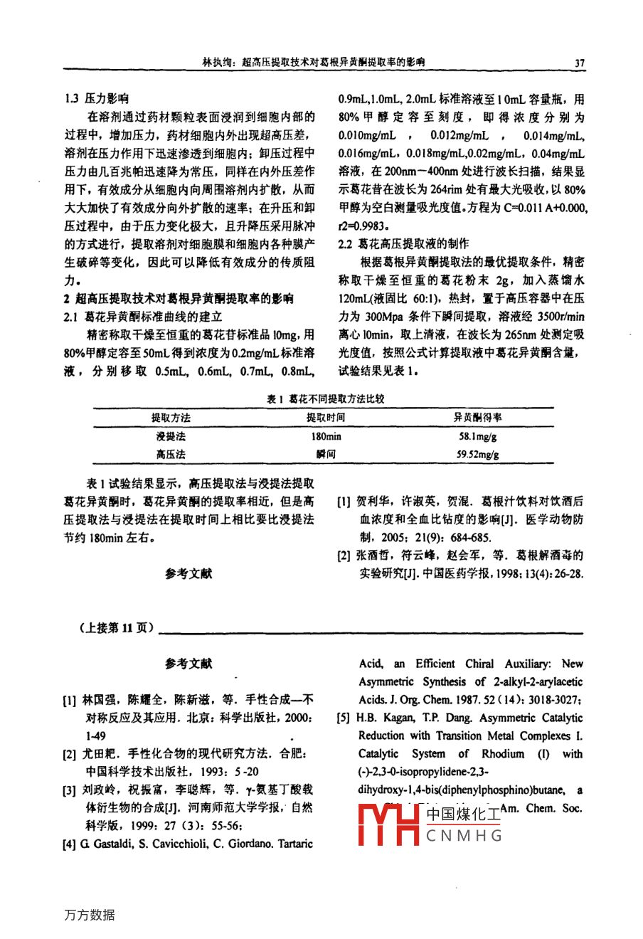 2009年第2期化學(xué)工程與裝備.2009年2月Chemical Engineering & Equipaent手性β一氨基醇的合成肖玲珊,陳瑞,汪永華,馬玥玥,周禁欽(西南大學(xué)化學(xué)化工學(xué)院,重慶400715)摘要: 以廉價(jià)易得的L.苯甘氨酸為原料,經(jīng)過(guò)2步反應(yīng),分別合成了1.1.2.三苯基二氨基乙醇和1.1.二乙基二氨基乙醇化合物,產(chǎn)率分別為71.2%和74.3%.此合成方法的優(yōu)點(diǎn):原料廉價(jià)易得,合成路線短,操作方便.關(guān)鍵詞:手性; B- 氨基醇;合成手性氨基醇分子因具有良好的配位能力的N泛的應(yīng)用。我們以L苯甘氨酸為原料,通過(guò)羧基酯原子和0原子,可與多種元素形成絡(luò)合物,已被廣化,格式反應(yīng),得到手性氨基醇2a和2b,產(chǎn)率分泛應(yīng)用于不對(duì)稱催化反應(yīng),酮的不對(duì)稱還原反應(yīng),別為71.2%和74.3%,化合物2a和2b的合成路線Diels-Alder反應(yīng),醇醛縮合反應(yīng),Herk 反應(yīng),醛和如下:二乙基鋅的加成等反應(yīng),并在藥物化學(xué)中也具有廣PhOHPh、OCH3RSOC2 .RMgBr- H11..CHzOH(C2Hs)2OHR=Ph2bR=Et1實(shí)驗(yàn)部分?jǐn)嚢?2h.往體系中加入15mL飽和氯化銨淬液淬1.1主要試劑與儀器滅反應(yīng),用乙酸乙酯(20mLx3) 萃取,合并有機(jī)L苯酐氨酸為原料、二氣亞砜、溴苯、溴乙烷層,用飽和氧化鈉洗滌,用無(wú)水硫酸鈉干燥過(guò)夜,均為市售分析純。300MHz 核磁共振儀,EYELA旋蒸蒸干溶劑, 用于50°C下真空干燥6h,得1.1.2-PSL-1800型低溫反應(yīng)浴。三笨基-二氨基乙醇(4.962g, 產(chǎn)率71.2%), mp1.2實(shí)驗(yàn)操作197.6°C.手性笨甘氨酸甲酸甲酯鹽酸鹽1的合成參考文2b的合成步驟同2a,產(chǎn)品為白色固體,產(chǎn)率獻(xiàn)[3],產(chǎn)率95.6%,m.p.138~1399C. 手性氨基醇為74.3%,mp: 1229C.2a和2b的合成:以2a的合成為例,氬氣保護(hù)下,2結(jié)果與討論在往干燥的裝有恒壓滴液漏斗和氬氣袋的三頸瓶手性氨基醇2a和2b的合成通過(guò)2步反應(yīng)制得,中加入新制的鎂屑(4.6g, 0.192mol)。 氬氣保護(hù)下合成路線短,操作簡(jiǎn)單,產(chǎn)率分別為71.2%和74.3%,往三頸瓶中滴入溴苯的乙醚溶液(PhBr, 20mL,在合成過(guò)程中,關(guān)鍵是第二步,因?yàn)楸礁拾彼峒柞?.190mol in 60 mL Et2O) ,加熱回流Ih后,冷至室鹽酸鹽與格式試劑反應(yīng)很劇烈,在此過(guò)程中苯甘氨溫后,置于低溫反應(yīng)浴中,冷至一30°C.攪拌 Ih后,酸甲酯鹽酸鹽很容易碳化,所以溫度保持在往體系中加入已制得的苯氦酸甲酯鹽酸鹽(5.0g,- -30°C得創(chuàng)的 ?a和?h本健化-乙基鋅 與醛的不0.025mol),- -30°C 下攪拌反應(yīng)Ih,升至室溫繼續(xù)對(duì)稱加中國(guó)煤化工YHCNMH G第37頁(yè))林執(zhí)絢:超高壓提取技術(shù)對(duì)葛根異黃酮提取事的影響371.3壓力影響0.9mL,1.0mL, 2.0mL標(biāo)準(zhǔn)溶液至1 0mL容量瓶,用在溶劑通過(guò)藥材顆粒表面浸潤(rùn)到細(xì)胞內(nèi)部的80%甲醇定容至刻度,即得濃度分別為過(guò)程中,增加壓力,藥材細(xì)胞內(nèi)外出現(xiàn)超高壓差,0.010mg/mL,0.012mg/mL ,0.014mg/mL,溶劑在壓力作用下迅速滲透到細(xì)胞內(nèi);卸壓過(guò)程中0.016mg/mL, 0.018mg/mL,0.02mg/mL, 0.04mg/mL壓力由幾百兆帕迅速降為常壓,同樣在內(nèi)外壓差作溶液,在200nm- -400nm 處進(jìn)行波長(zhǎng)掃描,結(jié)果顯用下,有效成分從細(xì)胞內(nèi)向周圍溶劑內(nèi)擴(kuò)散,從而示葛花昔在波長(zhǎng)為264rim處有最大光吸收,以80%大大加快了有效成分向外擴(kuò)散的速率;在升壓和卸甲醇為空白測(cè)量吸光度值.方程為C=0.011 A+0.000,壓過(guò)程中,由于壓力變化極大,且升降壓采用脈沖r2=0.9983.的方式進(jìn)行,提取溶劑對(duì)細(xì)胞膜和細(xì)胞內(nèi)各種膜產(chǎn)2.2葛花高壓提取液的制作生破碎等變化,因此可以降低有效成分的傳質(zhì)阻根據(jù)葛根異黃酮提取法的最優(yōu)提取條件,精密力.稱取干燥至恒重的葛花粉末2g, 加入蒸餾水2超高壓提取技術(shù)對(duì)葛根異黃酮提取率的影響120mL(液固比60:1), 熱封,置于高壓容器中在壓2.1葛花異黃酮標(biāo)準(zhǔn)曲線的建立力為300Mpa條件下瞬間提取,溶液經(jīng)3500r/min精密稱取千燥至恒重的葛花苷標(biāo)準(zhǔn)品l0mg,用離心l0min,取上清液,在波長(zhǎng)為265nm處測(cè)定吸80%甲醇定容至50mL得到濃度為0.2mg/mL標(biāo)準(zhǔn)溶光度值, 按照公式計(jì)算提取液中葛花異黃酮含量,液,分別移取0.5mL, 0.6mL, 0.7mL, 0.8mL, 試驗(yàn)結(jié)果見(jiàn)表 1.表1葛花不同提取方法比較提取方法提取時(shí)間異黃酮得事浸提法180mir58.1mg/g高壓法瞬間59.52mg/g表1試驗(yàn)結(jié)果顯示,高壓提取法與浸提法提取葛花異黃酮時(shí),葛花異黃酮的提取率相近,但是高[1]賀利華,許淑英,賀混.葛根汁飲料對(duì)飲酒后壓提取法與浸提法在提取時(shí)間上相比要比浸提法血濃度和全血比鉆度的影響[J].醫(yī)學(xué)動(dòng)物防節(jié)約180min 左右。制,2005; 21(9): 684-685.[2]張酒哲,符云峰,趙會(huì)軍,等.葛根解酒毒的參考文獻(xiàn)實(shí)驗(yàn)研究[J].中國(guó)醫(yī)藥學(xué)報(bào), 1998; 13(4): 26-28.(上接第11頁(yè))Acid, an Efficient Chiral Auxiliary: NewAsymmetric Synthesis of 2-1lkyl-arylacetic[1]林國(guó)強(qiáng),陳耀全,陳新滋,等.手性合成-不Acids. J. Ong. Chem. 1987. 52 ( 14): 3018-3027;對(duì)稱反應(yīng)及其應(yīng)用.北京:科學(xué)出版社, 2000:[5] H.B. Kagan, T.P. Dang. Asymmetric Catalytic1-49Reduction with Transition Metal Complexes I.[2]尤田耙.手性化合