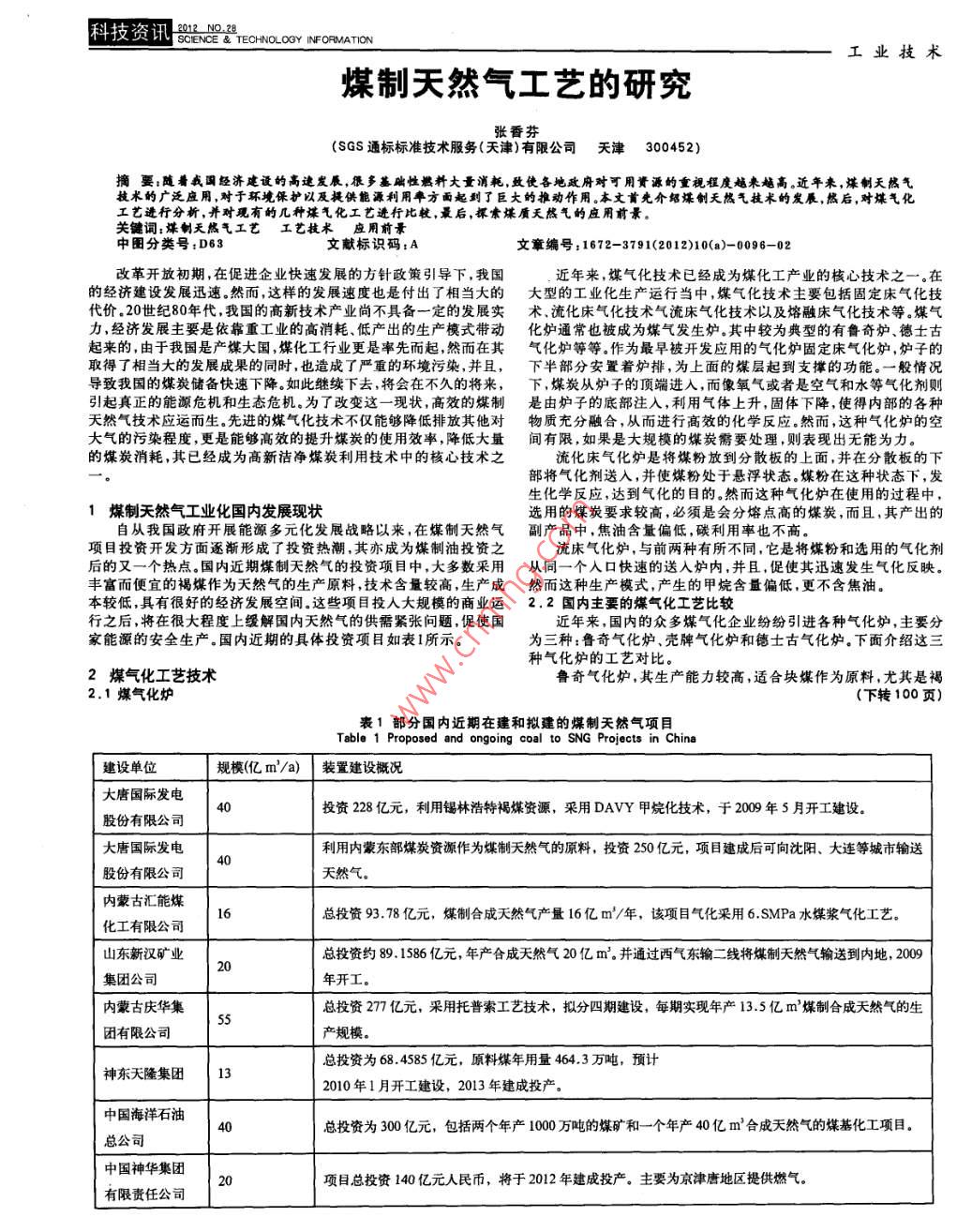 科技資訊蹬TECHNOLOGY INFORMATION工業(yè)技術(shù)煤制天然氣工藝的研究張香芬(SGS通標(biāo)標(biāo)準(zhǔn)技術(shù)服務(wù)(天津)有限公司天津300452)摘要:隨著我國經(jīng)濟(jì)建設(shè)的高逮發(fā)辰,很多基踹性燃大量消耗,致使各地政府對(duì)可用資源的重視租度越來越高。近年來,煤制天然氣披米的廣泛應(yīng)用,對(duì)于環(huán)境保護(hù)以及提供能源利用阜方面起到了巨大的推動(dòng)作用。本文首先介紹煤制天然氣技術(shù)的發(fā)展,然后,對(duì)煤氣化工藝透行分析,并對(duì)現(xiàn)有的幾種煤氣化工藝進(jìn)行比較,最后,探索煤質(zhì)天然氣的應(yīng)用前景。關(guān)鍵詞:煤制天然氣工藝工藝技術(shù)應(yīng)用前景中圖分類號(hào):D63文獻(xiàn)標(biāo)識(shí)碼:A文章編號(hào):1672-3791(2012)10(a)-0096-02改革開放初期,在促進(jìn)企業(yè)快速發(fā)展的方針政策引導(dǎo)下,我國的經(jīng)濟(jì)建設(shè)發(fā)展迅速。然而,這樣的發(fā)展速度也是付出了相當(dāng)大的大型的工業(yè)化生產(chǎn)運(yùn)行當(dāng)中,煤氣化技術(shù)主要包括固定床氣化技代價(jià),20世紀(jì)80年代,我國的高新技術(shù)產(chǎn)業(yè)尚不具備一定的發(fā)展實(shí)術(shù)、流化床氣化技術(shù)氣流床氣化技術(shù)以及熔融床氣化技術(shù)等。煤氣力,經(jīng)濟(jì)發(fā)展主要是依靠重工業(yè)的高消耗、低產(chǎn)出的生產(chǎn)模式帶動(dòng)化爐通常也被成為煤氣發(fā)生爐。其中較為典型的有魯奇爐、德士古起來的,由于我國是產(chǎn)煤大國煤化工行業(yè)更是率先而起,然而在其氣化爐等等。作為最早被開發(fā)應(yīng)用的氣化爐固定床氣化爐,爐子的取得了相當(dāng)大的發(fā)展成果的同時(shí),也造成了嚴(yán)重的環(huán)境污染,并且,下半部分安置著爐排,為上面的煤層起到支撐的功能。一般情況導(dǎo)致我國的煤炭?jī)?chǔ)備快速下降。如此繼續(xù)下去,將會(huì)在不久的將來,下,媒炭從爐子的頂端進(jìn)入,而像氧氣或者是空氣和水等氣化劑則引起真正的能源危機(jī)和生態(tài)危機(jī)。為了改變這一現(xiàn)狀,高效的煤制是由爐子的底部注入,利用氣體上升,固體下降,使得內(nèi)部的各種天然氣技術(shù)應(yīng)運(yùn)而生。先進(jìn)的煤氣化技術(shù)不僅能夠降低排放其他對(duì)物質(zhì)充分融合,從而進(jìn)行高效的化學(xué)反應(yīng)。然而,這種氣化爐的空大氣的污染程度,更是能夠髙效的提升煤炭的使用效率,降低大量間有限,如果是大規(guī)模的煤炭需要處理,則表現(xiàn)出無能為力。的煤炭消耗,其已經(jīng)成為高新潔凈煤炭利用技術(shù)中的核心技術(shù)之流化床氣化爐是將煤粉放到分散板的上面,并在分散板的下部將氣化劑送入,并使煤粉處于懸浮狀態(tài)。煤粉在這種狀態(tài)下,發(fā)生化學(xué)反應(yīng),達(dá)到氣化的目的。然而這種氣化爐在使用的過程中,1煤制天然氣工業(yè)化國內(nèi)發(fā)展現(xiàn)狀選用的煤炭要求較高,必須是會(huì)分熔點(diǎn)高的煤炭,而且,其產(chǎn)出的項(xiàng)目投資開發(fā)方面逐漸形成了投資熱潮,其亦成為煤制油投資之流床氣化爐,與前兩種有所不同,它是將煤粉和選用的氣化劑后的又一個(gè)熱點(diǎn)國內(nèi)近期煤制天然氣的投資項(xiàng)目中,大多數(shù)采用從同一個(gè)入口快速的送入爐內(nèi),并且,促使其迅速發(fā)生氣化反映。豐富而便宜的褐煤作為天然氣的生產(chǎn)原料,技術(shù)含量較高,生產(chǎn)成然而這種生產(chǎn)模式,產(chǎn)生的甲烷含量偏低,更不含焦油。本較低,具有很好的經(jīng)濟(jì)發(fā)展空間。這些項(xiàng)目投入大規(guī)模的商業(yè)運(yùn)2.2國內(nèi)主要的煤氣化工藝比較行之后,將在很大程度上緩解國內(nèi)天然氣的供需緊張問題,促使國近年來,國內(nèi)的眾多煤氣化企業(yè)紛紛引進(jìn)各種氣化爐,主要分家能源的安全生產(chǎn)國內(nèi)近期的具體投資項(xiàng)目如表1所示為三種:魯奇氣化爐、殼牌氣化爐和德士古氣化爐。下面介紹這三種氣化爐的工藝對(duì)比。2煤氣化工藝技術(shù)魯奇氣化爐,其生產(chǎn)能力較高,適合塊煤作為原料,尤其是褐2.1煤氣化爐(下轉(zhuǎn)100頁)表1部分國內(nèi)近期在建和擬建的煤制天然氣項(xiàng)Table 1 Proposed and ongoing coal to SNG Projects in China建設(shè)單位規(guī)模億m/a)裝置建設(shè)概況大唐國際發(fā)電股份有限公司投資228億元,利用錫林浩特褐煤資源,采用DAVY甲烷化技術(shù),于2009年5月開工建設(shè)。大唐國際發(fā)電利用內(nèi)蒙東部煤炭資源作為煤制天然氣的原料,投資250億元,項(xiàng)目建成后可向沈陽、大連等城市輸送股份有限公司內(nèi)蒙古匯能煤16總投資93.78億元,煤制合成天然氣產(chǎn)量16億m/年,該項(xiàng)目氣化采用6SMPa水煤漿氣化工藝化工有限公司山東新漢礦業(yè)總投資約89.1586億元,年產(chǎn)合成天然氣20億m。并通過西氣東輸二線將煤制天然氣輸送到內(nèi)地,2009集團(tuán)公司年開工。內(nèi)蒙古慶華集總投資277億元,采用托普索工藝技術(shù),擬分四期建設(shè),每期實(shí)現(xiàn)年產(chǎn)13.5億m煤制合成天然氣的生團(tuán)有限公司產(chǎn)規(guī)??偼顿Y為684585億元,原料煤年用量464.3萬噸,預(yù)計(jì)神東天隆集團(tuán)2010年1月開工建設(shè),2013年建成投產(chǎn)中