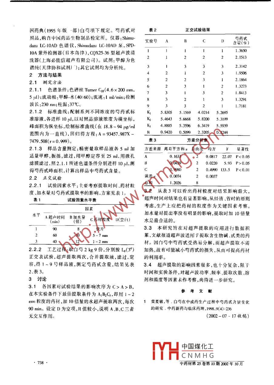 表2含 Urease流出液成分分析CnA經(jīng) Sephadex G-50親和層析后比活提高流出液體積蛋白質(zhì)濃度66.13倍,比活達(dá)6976.83IUmg,得率為80.68%純度達(dá)到電泳純。220.212.5(onA純度鑒定純化樣品經(jīng)聚丙烯酰胺凝膠電泳得條蛋白帶,表明所分離純化的樣品已達(dá)1B.B.L. Agrawal,eta. pacific binding of concanavalin A到電泳純。rosslinked dextran gels. Biochem. J, 1965, 96: 26ConA分離純化結(jié)釆見表3。2中山大學(xué)生物系生化微生物學(xué)教研室,生化技術(shù)導(dǎo)論表3CoMA分離純化結(jié)果北京:人民教育出版社,1978:2053 B B L. Agrawal, et al. Isolation of concanavalin A by specific分離步驟白質(zhì)得率CH得率比活力純化倍數(shù)adsorption on cnss linked dextran gel. Biochem Biophys.ActH洋刀豆豆子100105.50.00緩沖液提取68.859.724 Irvin E. Liener. 'The photometric determination of the h:mag微濾65.2685,09137.561.30glutinating activity of soyin cnide soybean extracts. Arch親和層析686976.8366.13Biochem. biophys. 1955. 54: 223洋刀豆豆子屮CnA經(jīng)緩沖液提取,微濾澄清5蔣傳葵,等.I縣酶的活力測定,上海:上海科技出版社,1982:117后,經(jīng)兩次 Sephadex G50親和層析,純化的ConA血6 Bradford M.M. A rapid and sensitive method for the quantitation凝比活提高66.13倍,得率80.68%。of microgram quantities of prolein utilizing the principle of3結(jié)論teinrdye binding Annal. Biochem 1976, 72: 248筆者用 Sephadex G50親和層析技術(shù)對洋刀豆7張業(yè)旺,等,超濾處理刺五加提取液.水處理技術(shù),提取液中ConA和 Urease進(jìn)行了分離并對ConA進(jìn)行2001,27(2):99了純化。Dhubis M Colorimetric method for determination of sugar and re-通過對提取液微濾預(yù)處理,料液的澄清度得到lated substance. Anal. Chem. 1956, 28: 350明顯提高,但ConA和Urae的活性分別損失9 Andrew C.pean.l. Serun protein electrophoresis in acry-6.20%和9.50%,蛋白質(zhì)損失5.21%mide gel: pattens from nomal human subjects. Scit預(yù)處理后提取液,經(jīng)過 Sephadex G-50親和層析147:145l柱,可使提取液中ConA和 Urease得到完全分離(2002-07-21收稿)白芍超聲提取工藝研究R33 A廣州陳李濟藥廠(5I0290)林慶義汪世瓊摘要目的:探討用超聲提取法提取白芍中芍藥甙的工藝條件,為超聲提取在業(yè)生產(chǎn)中的應(yīng)用積累參數(shù)方法:設(shè)計正交試驗,對白芍的超聲提取工藝進(jìn)行研究,確定最佳提取藝條件。結(jié)果:最佳T藝為川1-2m粒藥材,加10倍量水超聲提取兩次,每次90mina關(guān)鍵詞白芍芍藥甙正交試驗超聲提取白芍為毛茛科植物芍約 Pannonia lactifera Pall.劑,從而提高提出率,縮短提取時間,并且免去了高的十燥根,是最常用的中藥材之一,其主要有效成分溫對提取成分的影響。丙此超聲波作為提取的一種為芍藥甙、丹皮酚等。文獻(xiàn)報道白芍傳統(tǒng)水煎煮.手段,具有良好的應(yīng)用前景。本實驗以白芍為研究藝中,芍藥甙損失率高達(dá)40%以上,白芍中芍藥對象,以其有效成分芍藥甙為指標(biāo),高效液相色譜法甙在生產(chǎn)過程中含量下降主要是受熱帔壞,因此,工測定其含量,對超聲提取白芍中芍藥甙的藝進(jìn)行藝過程中應(yīng)盡量避免長期高溫受熱。研究表明,利出立中的應(yīng)川積累參數(shù)。用超聲波產(chǎn)生的強烈振動高的加速度、強烈的空化中國煤化工效應(yīng)、攪拌作用等,都可加速藥物有效成分進(jìn)入溶CNMHG司,經(jīng)鑒定符合中中藥材第25卷第10期2002年10月國藥典(1995年版·部)白芍項下規(guī)定。芍藥甙對表2正交試驗結(jié)果照品,購自屮國藥品生物制品檢定所。儀器: Shimu-實驗號ABCdaz lc10AD色譜儀, Shimudaz Lc-10AD泵,SPDD)含量(%)0A紫外檢測器(日本島津),CQX2536型超聲波清1.3650洗器(上海必能信超聲有限公司)。試劑:甲醇為色譜純(天津協(xié)和試劑));其它試劑均為分析純。2.31422方法與結(jié)果2.1測定方法2.1.1色譜條件:色譜柱 Turner C18(4.6×200mm1222335山l);流動相:甲醇-水(40:60);流速:Imd/min;檢測23131223312232.18641.3273波長:230mm;柱溫:37℃2.1.2標(biāo)準(zhǔn)曲線:配制系列不同濃度的芍藥甙標(biāo)K15.83055.1569402145209準(zhǔn)溶液各進(jìn)樣10d,以對照品溶液濃度為橫坐標(biāo),K25.46435.6685.82005.31峰面積為縱坐標(biāo)繪制標(biāo)準(zhǔn)曲線(在18.8-94四/mnl485.35966.3495.599范圍內(nèi)為一直線),回歸得方程:A=93457.987X-H0.94200.50992.32057479.508(r=0.999)。表3方差分析表2.13樣品含量測定:精密量取樣品液各5m加方差來源離差平方和s自由度均方F適量甲醇,振搖,濾過,用甲醇定容至25m,用微孔A0.16330.081722.07作濾膜濾過,照2.1.1所述色諧條件分別進(jìn)樣10μl,測B043920.02205.93P>0.05得芍藥甙峰面積,計算出樣品中芍藥甙含量C20.49)133.5P<0誤差e20.003722.1試驗因素水平:主要考察提取時間藥材粒和106度、加水量對芍藥甙提取率的影響,方案見表1。32從表3可以看出藥材粒度對結(jié)果影響最大表1試驗因素水平表超聲時間對結(jié)果也有顯著影響,從經(jīng)濟、省時的塬則因素考慮,生產(chǎn)上應(yīng)把藥材的粒度作為關(guān)鍵因素考察。水平A超盧時問B加水量加水量對提出率沒有明顯的影響提取時加10倍量倍)C藥材粒度空白)水是最合適的。3.3本研究旨在對超聲提取的應(yīng)用進(jìn)行數(shù)據(jù)積5~7累,文獻(xiàn)報道超聲波適川廠提取含生物堿、甙類的藥材。因白門芍中芍藥甙受熱易分解,而超聲提取不需222工藝過程:取白芍2kg9份,分別按I4(34)加熱,故有可能減小芍藥甙的損失,從而可提高藥材正交表試