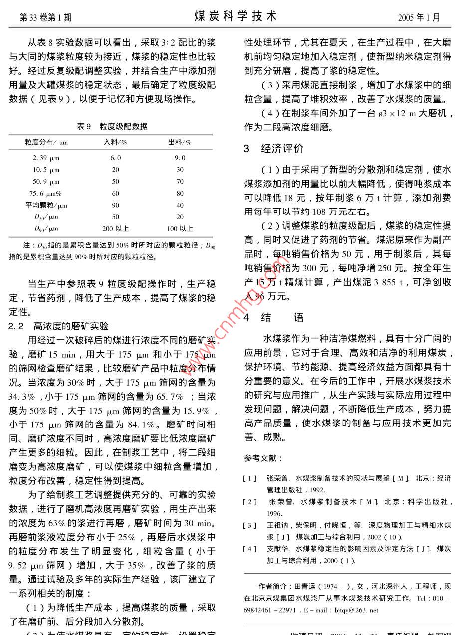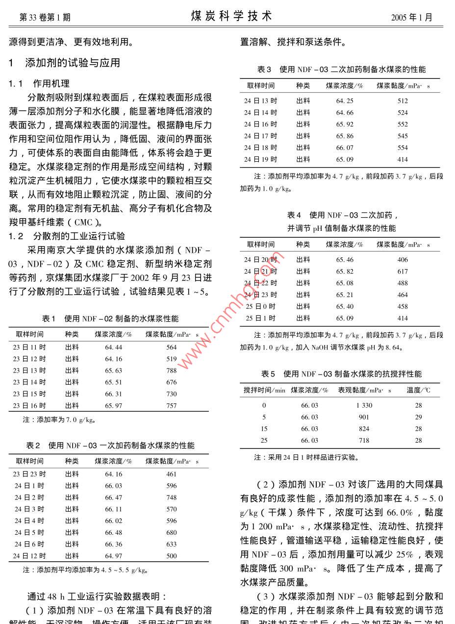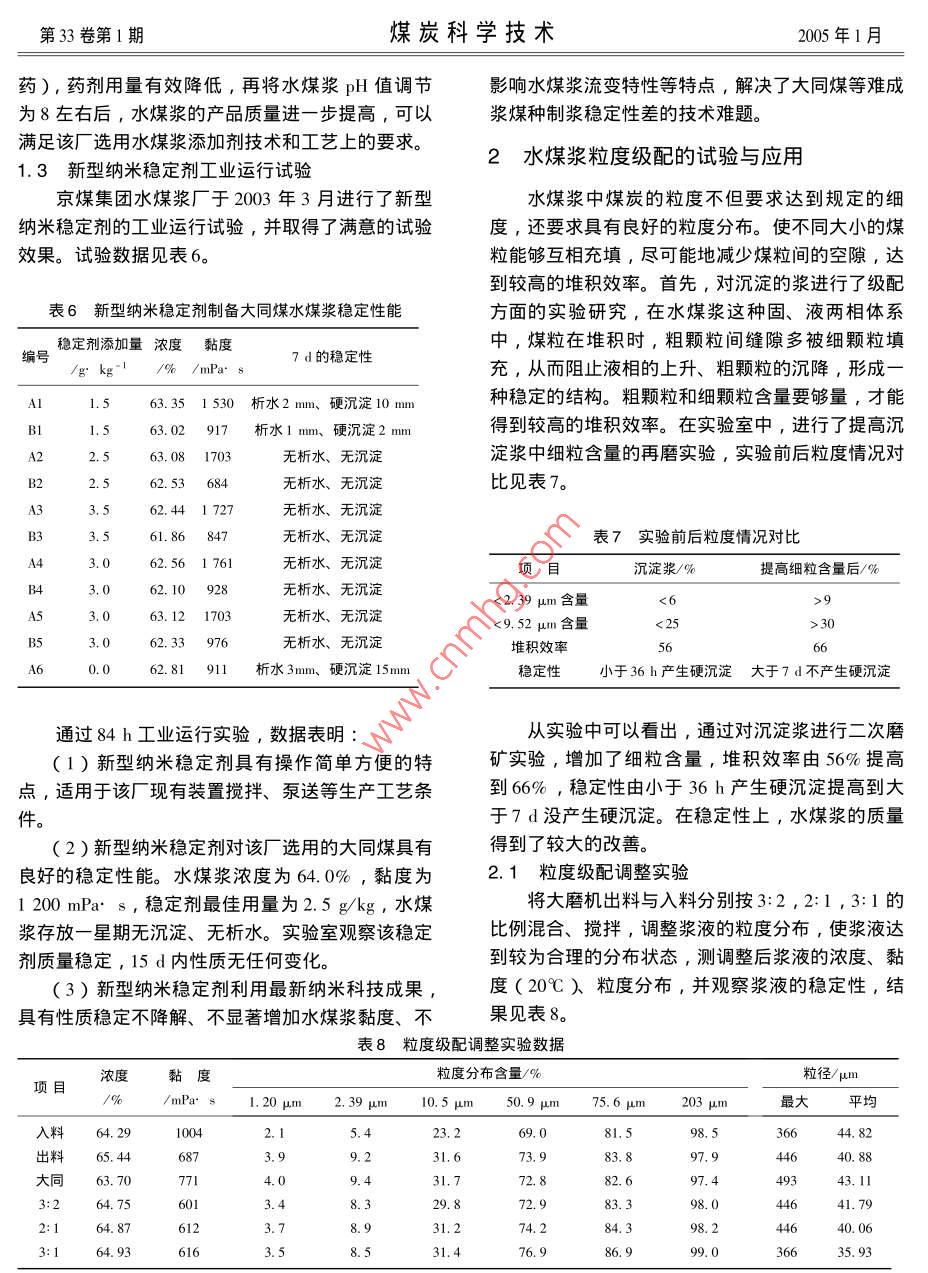 第33卷第1期煤炭科學(xué)技術(shù)2005年1月水煤漿的藥劑、粒度級(jí)配的試驗(yàn)與應(yīng)用田青運(yùn),胡發(fā)亭2,樊學(xué)彬1.北京京煤集團(tuán)水煤漿廠,北京102300;2.煤炭科學(xué)研究總院煤化工分院,北京100013)摘要:介紹了DF-02、DF-03分散劑與納米穩(wěn)定劑在水煤漿生產(chǎn)中的試驗(yàn)與應(yīng)用情況,實(shí)踐證明,較為合理的水煤漿粒度級(jí)配對(duì)產(chǎn)品質(zhì)量和生產(chǎn)成本起著重要的作用,采用新型的分散劑和穩(wěn)定劑,使水煤漿添加劑的用量比以前大幅降低,經(jīng)濟(jì)效益顯著。關(guān)鍵詞:水煤漿;藥劑;粒度級(jí)配Development and application of additives and partic e o44-04中圖分類號(hào):TQ53文獻(xiàn)標(biāo)識(shí)碼:B文章編號(hào):0253-2336(2005)01-00classification for coal water mixtureTIAN Qing-yun, HU Fa-ting, FAN Xue-bin(1. Coal Water Mixture Mill, Beijing Jingmei Group, Beijing 102300, China;2. Beiing Branch of Coal Chemistry, China Coal Research Institute, Beijing 100013, China水煤漿是20世紀(jì)0年代石油危機(jī)中發(fā)展起來(lái)穩(wěn)定著火燃燒。約2t水煤漿可代1t油。由于水的一種新型燃料。水煤漿一般由63%~68%不同煤漿與燃油在相同熱值下相比,其價(jià)格僅為重油的粒度分布的煤,31%~36%的水和約1%的添加劑12左右,燃用水煤漿與直接燒煤相比,具有燃燒制成,具有油一樣的流動(dòng)性和穩(wěn)定性,被稱為液態(tài)效率高、負(fù)荷易調(diào)控、節(jié)能和環(huán)境效益好等顯著優(yōu)環(huán)保型代油產(chǎn)品。水煤漿可以泵送、霧化、儲(chǔ)存與點(diǎn)。因此,將煤炭轉(zhuǎn)化為水煤漿使用,可使煤炭資處于壓縮狀態(tài)。同時(shí)底板3m以內(nèi)裂隙發(fā)育,6m以下局部出現(xiàn)裂隙,但與淺部不溝通,破裂區(qū)范圍參考文獻(xiàn)主要集中在煤柱邊緣及采空區(qū)下方。底板破壞區(qū)為[I]王作宇,劉鴻泉.承壓水上采煤[M]北京:煤炭工業(yè)出分別在煤柱邊緣及采空區(qū)內(nèi)部,最大破壞深度達(dá)版社,19939.2m。通過對(duì)該區(qū)模擬試驗(yàn),長(zhǎng)壁法破壞底板深[2]彭蘇萍,王金安,承壓水體上安全采煤[M]北京:煤炭工業(yè)出版社,2001度是8~12m,條帶法是9.2m左右,雖然破壞深[3]張金才,劉天泉.論煤層底板采動(dòng)裂隙帶的深度及分布特度改變不大,但底板受力狀態(tài)、位移特征、裂隙貫征[J]煤炭學(xué)報(bào),190(2)通性等仍有一定的特點(diǎn)。但這種方法對(duì)底板改善仍[4]徐星寬.礦井充水機(jī)理、水害成因與治理[M]山東科技需要進(jìn)一步研究。大學(xué)學(xué)報(bào),2003(4)該試驗(yàn)應(yīng)用說明,底板突水既是地質(zhì)問題又是[5]薛禹群.地下水動(dòng)力學(xué)[M]北京:地質(zhì)出版社,1997個(gè)采礦問題,五陽(yáng)礦在這方面的做法說明治理突水[6]胡寬瑢.采掘工作面底板突水和防治原則的基本理論研究[M]太原:山西科學(xué)技術(shù)出版社,1999不單純研究底板突水機(jī)理,更應(yīng)該重點(diǎn)研究開采方法的改革,只有這樣才能使其由被動(dòng)治理變?yōu)橹鲃?dòng)作者簡(jiǎn)介:熊崇山(1961-),男,內(nèi)蒙古商都人,副教授,在防治。以上各種方法都是關(guān)于承壓水的理論研究在山西大同大學(xué)采礦系工作,中國(guó)礦業(yè)大學(xué)(北京)博士研究生防治其水害方面的具體應(yīng)用,是科學(xué)轉(zhuǎn)化為技術(shù)的從事礦山壓力及其控制和梁礦工藝方面的教學(xué)和研究與科研工作典型實(shí)例,對(duì)五陽(yáng)礦進(jìn)行優(yōu)化設(shè)計(jì)是很有必要的Tel:0352-7050123,E-mail:ran12345678@tom.com優(yōu)化設(shè)計(jì)對(duì)礦井安全生產(chǎn)有利,在技術(shù)上可行,所取得有接繹濟(jì)效益是客觀的收稿日期:2004-10-08;責(zé)任編輯:曾康生第33卷第1期煤炭科學(xué)技術(shù)2005年1月源得到更潔凈、更有效地利用。置溶解、攪拌和泵送條件。1添加劑的試驗(yàn)與應(yīng)用表3使用NDF-03二次加藥制備水煤漿的性能1作用機(jī)理取樣時(shí)間種類煤漿濃度/%煤漿黏度/mPas分散劑吸附到煤粒表面后,在煤粒表面形成很24日13時(shí)出料薄一層添加劑分子和水化膜,能顯著地降低溶液的24日14時(shí)出表面張力,提高煤粒表面的潤(rùn)濕性。根據(jù)靜電斥力4日16時(shí)作用和空間位阻作用認(rèn)為,降低固、液間的界面張4日17時(shí)出力,可使體系的表面自由能降低,體系將會(huì)趨于更料料料料料666624日18時(shí)出66.024日19時(shí)65.09414穩(wěn)定。水煤漿穩(wěn)定劑的作用是形成空間結(jié)構(gòu),對(duì)顆粒沉淀產(chǎn)生機(jī)械阻力,它使水煤漿中的顆粒相互交注∶添加劑平均添加率為4.7gkg,前段加藥3.7gkg,后段聯(lián),從而有效地阻止顆粒沉淀,防止固、液間的分加藥為1.0g/kgo離。常用的穩(wěn)定劑有無(wú)機(jī)鹽、高分子有機(jī)化合物及表4使用NDF-03二次加藥羧甲基纖維素(CMC)并調(diào)節(jié)pH值制備水煤漿的性能2分散劑的工業(yè)運(yùn)行試驗(yàn)采用南京大學(xué)提供的水煤漿添加劑(NDF取樣時(shí)間種類煤漿濃度/%煤漿黏度/mPa:s03,NDF-02)及CMC穩(wěn)定劑、新型納米穩(wěn)定劑24日20時(shí)出料等藥劑,京煤集團(tuán)水煤漿廠于2002年9月23日進(jìn)24日21時(shí)出料24日22時(shí)出料行了分散劑的工業(yè)運(yùn)行試驗(yàn),試驗(yàn)結(jié)果見表1~524日23時(shí)出料65.2125日0時(shí)出料表1使用NDF-02制備的水煤漿性能25