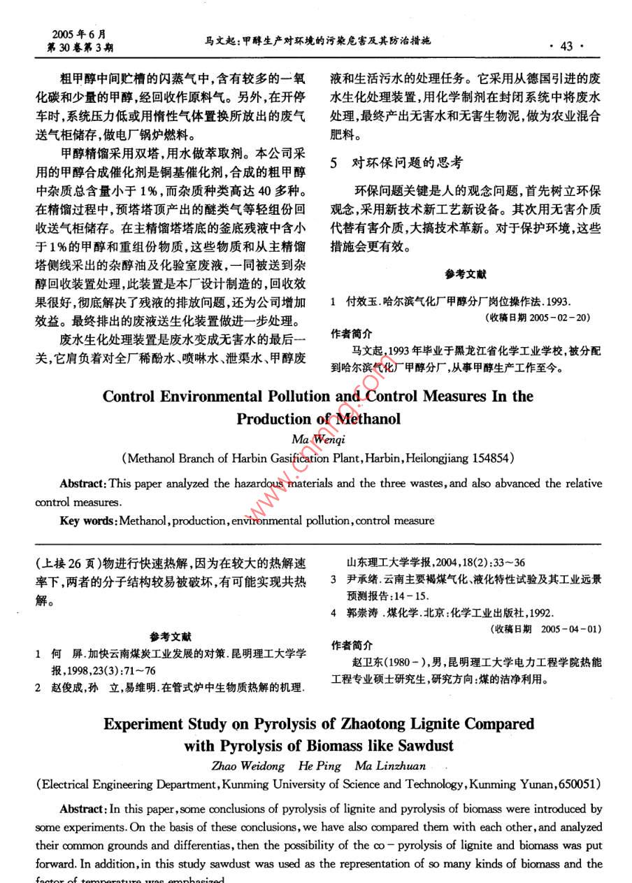 2005年6月貴州化工第30卷第3期Guizhou Chemical Industry昭通褐煤熱解與鋸末類生物質(zhì)熱解對(duì)比實(shí)驗(yàn)研究趙衛(wèi)東何屏馬林轉(zhuǎn)(昆明理工大學(xué)電力工程學(xué)院,云南昆明,650051)摘要分別介紹了褐煤熱解和生物質(zhì)熱解試驗(yàn)得到的-些規(guī)律,并在此基礎(chǔ)上進(jìn)行了對(duì)比,分析了兩者熱解特性中的共同點(diǎn)和不同點(diǎn),提出了褐煤與生物質(zhì)共熱解的可能性,另外需要指出的是在本次研究中使用鋸末作為生物質(zhì)的代表,重點(diǎn)研究熱解溫度這一影響因素。關(guān)鍵詞褐煤生物質(zhì)熱解鋸末中國(guó)分類號(hào)TQ530.2文獻(xiàn)標(biāo)識(shí)碼A'文章編號(hào) 1008- 9411(2005)03 - 0025- 02焦油和熱解氣。熱解溫度、升溫速率、停留時(shí)間、加引言熱終溫等是決定熱解的重要條件。本文重點(diǎn)討論在云南省褐煤資源豐富,占全國(guó)褐煤資源的溫度這一重要條件下褐煤和鋸末熱解產(chǎn)生氣體產(chǎn)物12.6%,占全省煤炭資源的66. 55% ,尤以昭通為最的相關(guān)規(guī)律。多,達(dá)80多億噸,占全省褐煤儲(chǔ)量的51.8%。目前1.2實(shí)驗(yàn)裝置尚未大規(guī)模開(kāi)采利用,該煤種屬于軟褐煤,其高揮發(fā)實(shí)驗(yàn)裝置包括:熱解爐、控溫系統(tǒng)、氣體冷凝系分、高活性高水分熱穩(wěn)定性差等特點(diǎn)較內(nèi)蒙、東北統(tǒng)、氣體分析系統(tǒng)。其中熱解爐采用電流加熱,可以褐煤更為突出。對(duì)褐煤進(jìn)行熱解是一種提高其利用通過(guò)控制電流強(qiáng)弱來(lái)改變加熱強(qiáng)度從而得到不同的效率的好方法[1。升溫速率??販叵到y(tǒng)由熱電偶、數(shù)字顯示溫度控制煤熱解工藝是- -種在相對(duì)溫和的條件下先將煤儀(型號(hào)XMTA- 2001)和交流繼電器(CJT1系列)中富氫組分通過(guò)熱解方式提取出來(lái)作為化工原料或組成。氣體冷凝系統(tǒng)用循環(huán)水進(jìn)行冷凝。氣體分析優(yōu)質(zhì)液體燃料,以提高煤利用率的方法。系統(tǒng)主要采用QF1904型氣體分析儀分析熱解氣成生物質(zhì)包括農(nóng)作物秸稈、稻殼、林業(yè)加工殘余分的百分比組成(包括0O2、00、CH、H2、O2)。實(shí)物、制糖業(yè)蔗渣、造紙業(yè)蔗髓櫥余、動(dòng)物糞便等。生驗(yàn)步 驟為:將褐煤或生物質(zhì)在熱解爐中加熱熱解,得物質(zhì)是- -種潛在的能源資源,是人類未來(lái)能源和化到高 溫?zé)峤鈿怏w和焦油蒸汽進(jìn)人氣體冷凝系統(tǒng)冷凝學(xué)原料的重要來(lái)源。目前,作為能源利用的生物質(zhì)得到焦油,最后經(jīng)過(guò)冷凝后得到的熱解氣進(jìn)入氣體僅為總生物質(zhì)能量的1%,所生產(chǎn)的能量已占總能分析系統(tǒng)進(jìn)行氣體成分分析。耗的14%。生物質(zhì)能是太陽(yáng)能轉(zhuǎn)換和積累的主要2實(shí)驗(yàn)用原料形態(tài)之一- ,是唯一的既有礦物燃料屬性,又可儲(chǔ)存、運(yùn)輸,再可生可轉(zhuǎn)換,并較少受到自然條件制約的實(shí)驗(yàn)中所用褐煤為昭通褐煤,其工業(yè)分析數(shù)據(jù)能源。生物質(zhì)能開(kāi)發(fā)利用在我國(guó)能源結(jié)構(gòu)中占有舉為 :水份11. 14%、揮發(fā)份56.24%、灰份16.71% ;其足輕重的地位,農(nóng)村能耗的80%是生物質(zhì)能。目元素分析數(shù)據(jù)為:碳66.49%、氫4.81%、氧前,我國(guó)生物質(zhì)資源大都用于直接燃燒和廢棄于農(nóng)27.03%、氮1.43%、硫0.24%[3]。田,造成這一資源的浪費(fèi)和環(huán)境污染,每年僅生活用實(shí)驗(yàn)所用的生物質(zhì)(鋸末)來(lái)自昆明市第三木器就燒掉2.7億噸秸稈和2.8億噸薪材,由于燃燒效廠 ,其工業(yè)分析數(shù)據(jù)為:水份6. 9%、揮發(fā)份88.3%、率低,農(nóng)村能源短缺問(wèn)題仍未解決。過(guò)量的森林砍灰份1.1%;其元素分析數(shù)據(jù)為:碳54.9%、氫伐和大量秸稈不能還田,也嚴(yán)重破壞了生態(tài)平衡。6.3%、氧38.5%、氮0.3%、硫0.0%。生物質(zhì)熱解制取可燃?xì)怏w以及焦油是-種十分重要由上面數(shù)據(jù)可見(jiàn),昭通褐煤和鋸末的揮發(fā)份均的生物質(zhì)能的利用方式2]。較高,進(jìn)行熱解可以得到較多的熱解氣。氧元素含量較高,這一點(diǎn)決定了兩者的發(fā)熱量較低。對(duì)于氫1實(shí)驗(yàn)原理和裝置元素和氮元素含量,褐煤與鋸末區(qū)別不大,分別在1.1實(shí)驗(yàn)原理5%和1%左右。熱解是一種熱化學(xué)處理技術(shù),在隔絕或少量供3實(shí)驗(yàn)結(jié)果與 討論貴州化工2005年6月Guizhou Chemical Industry第30卷第3期將40g鋸末和40g褐煤分別進(jìn)行熱解實(shí)驗(yàn),熱物的成分組成與熱解溫度的對(duì)應(yīng)關(guān)系。實(shí)驗(yàn)條件是解終溫為600C ,加熱速率為15C /min。加熱速率為15C /min,加熱終溫為400C。表1熱解氣體流量與溫度的對(duì)應(yīng)關(guān)系在圖1中,0O2的百分含量下降明顯, 100C時(shí),溫度(C) 100 150 200 250 300 350 400 450 500 550 600其值最大,接近50% ;00的百分含量在100~300C熱解氣鋸末0.010.010.150.670.930.470.300.200.200.180.17呈下降的趨勢(shì),但在400C左右時(shí)又出現(xiàn).上升的趨(L/min)褐煤0.00.000.070.180.600.800. 670.600.600.580. 58流量勢(shì),原因可能是,在熱解早期熱穩(wěn)定性較差的羧基先釋放生成C2和cO,隨著氧元素不斷被釋放出,鋸由上表可見(jiàn),昭通褐煤總體產(chǎn)氣流量高于鋸末,末中含氧量在不斷減少,002和00