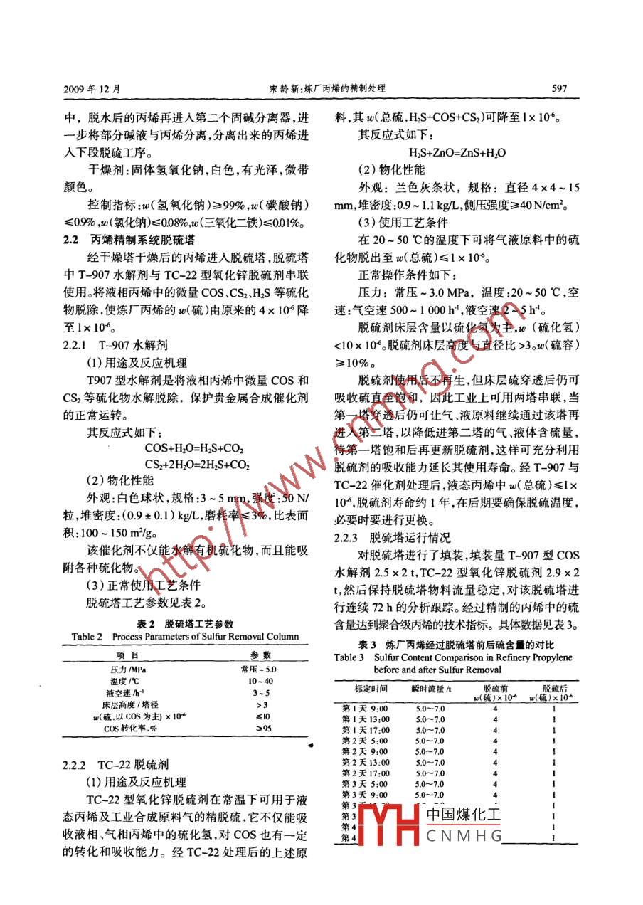 第38卷第6期當代化工vol.38,N162009年12月Contemporary Chemical Industry煉廠丙烯的精制處理宋齡新(中國石油撫順石化公司乙烯化工廠,遼寧撫順113004)摘要:以實際生產為例煉廠丙烯經過脫水、脫硫、再脫水精制后可達到聚合丙烯要求,為聚丙烯裝置補充原料滿足聚丙烯裝置高負荷生產需要,并確保聚內烯產品質量關鍵詞:煉廠;丙烯;精制處理中圖分類號:TQ221.212文獻標識碼:A文章編號:1671-0460(200906-059603撫順乙烯化工廠聚丙烯裝置采用意大利H1煉廠丙烯情況MONT公司 SPHERIPOL工藝技術,原設計能力6萬ta,1999年進行擴能改造到9萬ta。裝置主煉廠丙烯是由催化裂化裝置產生的液化氣催化劑屬于齊格勒-納塔催化劑體系,該催化劑經氣體分餾裝置分餾后得到的隨著催裂化技術對原料丙烯雜質含量的要求特別嚴格,因此聚丙和氣分操作水平的提高,(丙烯)將達到95%甚烯裝置的丙烯原料供給量存在一塊缺口。精制煉至更高,但丙烯中含有一些雜質(水、硫)還是比廠丙烯來補充聚丙烯裝置原料缺口,即提高聚丙聚合級內烯中的雜質含量高出很多,具體數據如烯產量,又使煉廠丙烯得到效益最大化利用。但表1。如果利用煉廠丙烯進行聚合,就必須對粗丙煉廠丙烯中雜質(水、硫砷、一氧化碳)會使丙烯烯進行精制否則易造成內烯的聚合催化劑中毒。聚合的催化劑中毒、活性降低、單耗提高,導致產表1煉廠丙烯與聚合丙烯質量比較品表觀密度下降,使產品質量不合格,釜內產生Table 1 Quality Comparison between Refinery Propyleneand Polymerization-level Propylene粘料,甚至不發(fā)生聚合反應;同時由于硫的存在項聚合丙烯其它雜質的脫除也會受到影響使產品的灰分含w(丙烯),%量升高,導致產品的各項力學性能和后加工性能(C2)×10·≤1500M(總硫)×1045-5.0大大降低。因此在內烯進入聚丙烯裝置的聚合反Mc(水)×10應器之前必須進行精制以除去這些雜質。撫順乙烯化工廠煉廠丙烯精制系統(tǒng)包括一個脫水塔2工藝原理及流程個脫硫塔和一個分子篩干燥器。脫水塔是利用固堿脫水;脫硫塔是采用西北化工研究院生產的2.1丙烯精制系統(tǒng)固堿干燥器T-907型coS水解劑、Tc-22型脫硫劑;分子篩煉廠來的粗丙烯從催化裂化裝置產生的液干燥器采用上海環(huán)球公司UOP分子篩。5000化氣經氣體分餾裝置分餾后得到,其中u(水)在kgh的進料丙烯的含水量由原來的(30~50)正常運行狀態(tài)下是(30~50)×10°,當生產出現(xiàn)波10降至(1-5)×10,(硫)由原來的4×10°降動時,m(水)>50×10°導致后段工序波動很大。至1×10和,經過幾年的運行驗證,煉廠丙烯的在脫硫塔前設有一個固堿脫水塔,進行初步脫精制效果很好,符合聚丙烯裝置生產的需要。水,保證出口丙烯中w(水)<50×10°。干燥器內的堿液通過干燥器下部閥門排放至液堿收集器中國煤化工·收稿日期:2009-11-26作者簡介:末齡新(1966-),男,工程師,1990年畢業(yè)于撫順石化職大有JHCNMHG事聚烯烴的研究E-mail: SIxin(apetrochinacomcn09年12月宋齡新:煉廠丙烯的精制處理中,脫水后的丙烯再進入第二個固堿分離器,進料,其w(總硫,HS+COS+CS2)可降至l×106步將部分堿液與丙烯分離,分離出來的丙烯進其反應式如下人下段脫硫工序。H S+Zn O=ZnS+H,O干燥劑:固體氫氧化鈉,白色,有光澤,微帶2)物化性能顏色。外觀:蘭色灰條狀,規(guī)格:直徑44~15控制指標:(氫氧化鈉)≥99%,w(碳酸鈉mm,堆密度:09~11kgL,側壓強度≥40N/cm2≤0%,(氯化鈉)≤008%,(三氧化二鐵)≤001%3)使用工藝條件2.2丙烯精制系統(tǒng)脫硫塔在20~50℃的溫度下可將氣液原料中的硫經干燥塔干燥后的丙烯進入脫硫塔,脫硫塔化物脫出至υ(總硫)≤1×10°。中T-907水解劑與TC-22型氧化鋅脫硫劑串聯(lián)正常操作條件如下:使用。將液相丙烯中的微量COS、CS2、H2S等硫化壓力:常壓~3.0MPa,溫度:20~50℃,空物脫除使煉廠丙烯的w(硫)由原來的4×10降速:氣空速500~1000h4,液空速2~5至脫硫劑床層含量以硫化氫為主,(硫化氫221T-907水解劑<10×10°。脫硫劑床層高度與直徑比>3。w(硫容(1)用途及反應機理≥10%。T907型水解劑是將液相丙烯中微量COS和脫硫劑使用后不再生,但床層硫穿透后仍可CS2等硫化物水解脫除,保護貴金屬合成催化劑吸收硫直至飽和,因此工業(yè)上可用兩塔串聯(lián),當的正常運轉。第一塔穿透后仍可讓氣、液原料繼續(xù)通過該塔再其反應式如下進入第二塔,以降低進第二塔的氣、液體含硫量,COS+H,O=HS+CO2待第一塔飽和后再更新脫硫劑,這樣可充分利用CSx+2H,O=2H,S+CO脫硫劑的吸收能力延長其使用壽命。經T-907與(2)物化性能TC-22催化劑處理后,液態(tài)丙烯中v(總硫)≤1×外觀:白色球狀,規(guī)格:3~5mm,強度:50106,脫硫劑壽命約1年,在后期要確保脫硫溫度,粒,堆密度:(09±0.1)kgL,磨耗率≤3%,比表面必要時要進行更換。積:100~150m?go22.3脫硫塔運行情況該催化劑不僅能水解有機硫化物,而且能吸對脫硫塔進行了填裝,填裝量T-907型COS附各種硫化物。水解劑25×2t,TC-22型氧化鋅脫硫劑29×2(3)正常使用工藝條件t,然后保持脫硫塔物料流量穩(wěn)定,對該脫硫塔進脫硫塔工藝參數見表2。行連續(xù)72h的分析跟蹤。經過精制的內烯中的硫表2脫硫塔工藝參數含量達到聚合級丙烯的技術指標。具體數據見表3。Table 2 Process Parameters of Sulfur Removal Column表3煉廠丙烯經過脫硫塔前后硫含量的對比項參數Table 3 Sulfur Content Comparison in Refinery Propylene壓力/MPe常壓-50before and after Sulfur Removal溫度℃10~40液空速/h標定時間瞬時流量∧t脫硫前脫