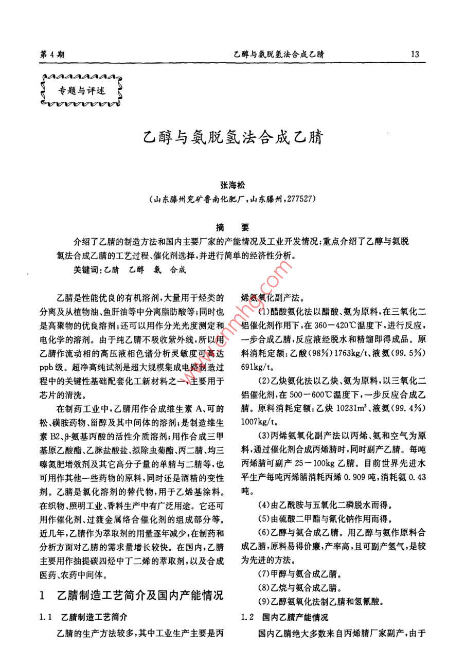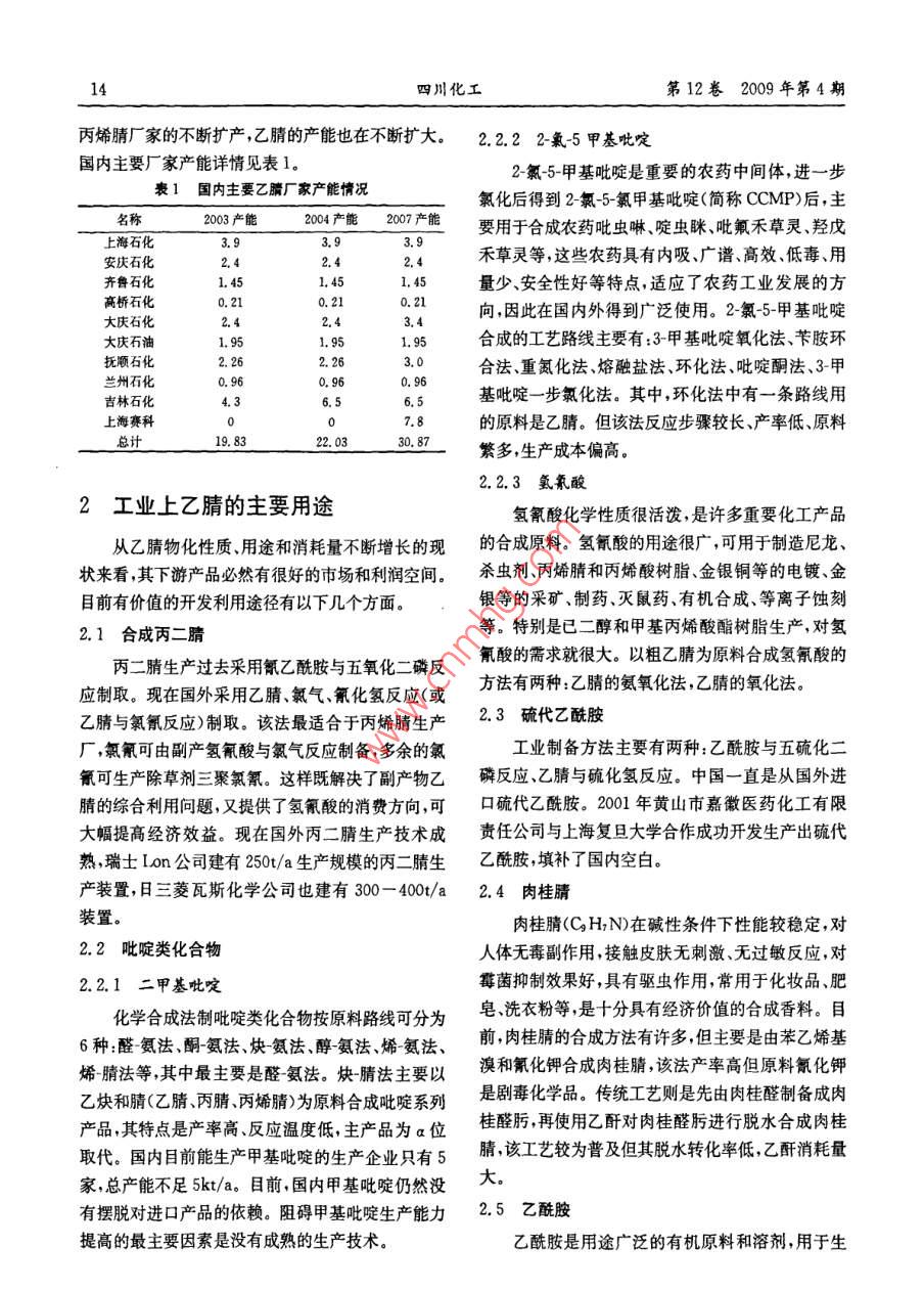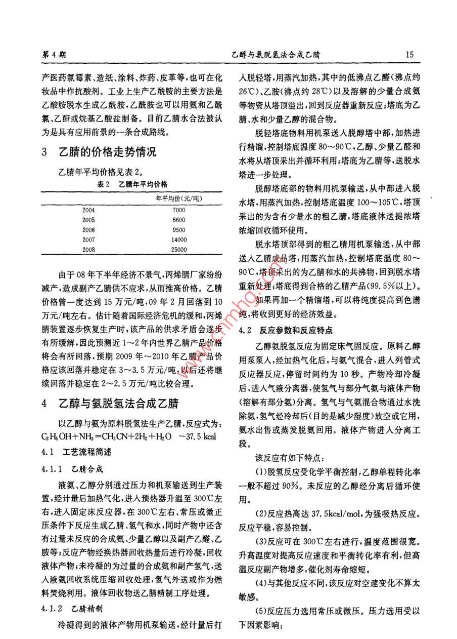 第4期乙醇與氨脫氫法合成乙腈13角AA444專題與評述乙醇與氨脫氬法合成乙腈張海松(山東滕州兗礦魯南化肥廠,山東滕州,277527)摘要介紹了乙腈的制造方法和國內(nèi)主要廠家的產(chǎn)能情況及工業(yè)開發(fā)情況;重點介紹了乙醇與氨脫氫法合成乙腈的工藝過程催化劑選擇,并進行簡單的經(jīng)濟性分析關(guān)鍵詞:乙腈乙醇氨合成乙腈是性能優(yōu)良的有機溶劑,大量用于烴類的烯氨氧化副產(chǎn)法。分離及從植物油、魚肝油等中分離脂肪酸等;同時也(1)醋酸氨化法以醋酸、氨為原料,在三氧化二是高聚物的優(yōu)良溶劑;還可以用作分光光度測定和鋁催化劑作用下,在360-420℃溫度下進行反應(yīng),電化學(xué)的溶劑。由于純乙腈不吸收紫外線所以用步合成乙腈,反應(yīng)液經(jīng)脫水和精餾即得成品。原乙腈作流動相的高壓液相色譜分析靈敏度可高達(dá)料消耗定額:乙酸(98%)1763kg/t液氨(99.5%)ppb級。超凈高純試劑是超大規(guī)模集成電路制造過691kg/t程中的關(guān)鍵性基礎(chǔ)配套化工新材料之一,主要用于(2)乙炔氨化法以乙炔、氨為原料,以三氧化二芯片的清洗。鋁催化劑,在500-600℃溫度下,一步反應(yīng)合成乙在制藥工業(yè)中,乙腈用作合成維生素A可的腈。原料消耗定額:乙炔10231m3、液氨(99.4%)松、磺胺藥物甾醇及其中間體的溶劑;是制造維生1007kg/t素B2、P氨基丙酸的活性介質(zhì)溶劑;用作合成三甲(3)丙烯氨氧化副產(chǎn)法以丙烯、氨和空氣為原基原乙酸酯、乙脒鹽酸鹽、擬除蟲菊酯、丙二腈、均三料,通過催化劑合成丙烯腈時,同時副產(chǎn)乙腈。每噸嗪氮肥增效劑及其它高分子量的單腈與二腈等,也丙烯腈可副產(chǎn)25-100kg乙腈。目前世界先進水可用作其他一些藥物的原料,同時還是酒精的變性平生產(chǎn)每噸丙烯腈消耗丙烯0.909噸,消耗氨0.43劑。乙腈是氯化溶劑的替代物,用于乙烯基涂料。噸。在織物、照明工業(yè)、香料生產(chǎn)中有廣泛用途。它還可(4)由乙酰胺與五氧化二磷脫水而得用作催化劑、過渡金屬絡(luò)合催化劑的組成部分等。(5)由硫酸二甲酯與氰化鈉作用而得。近幾年,乙腈作為萃取劑的用量逐年減少,在制藥和(6)乙醇與氨合成乙腈。用乙醇與氨作原料合分析方面對乙腈的需求量增長較快。在國內(nèi),乙腈成乙腈原料易得價廉產(chǎn)率高,且可副產(chǎn)氫氣,是較主要用作抽提碳四烴中丁二烯的萃取劑,以及合成為先進的方法。醫(yī)藥、農(nóng)藥中間體。(7)甲醇與氨合成乙腈。1乙腈制造工藝簡介及國內(nèi)產(chǎn)能情況(8)乙烷與氨合成乙腈。(9)乙醇氨氧化法制乙腈和氫氰酸。1.1乙腈制造工藝簡介1.2國內(nèi)乙腈產(chǎn)能情況乙腈的生產(chǎn)方法較多,其中工業(yè)生產(chǎn)主要是丙國內(nèi)乙腈絕大多數(shù)來自丙烯腈廠家副產(chǎn),由于四川化工第12卷2009年第4期丙烯腈廠家的不斷擴產(chǎn),乙腈的產(chǎn)能也在不斷擴大。2.2.22氯5甲基吡啶國內(nèi)主要廠家產(chǎn)能詳情見表1。2氯5甲基吡啶是重要的農(nóng)藥中間體,進一步表1國內(nèi)主要乙臍廠家產(chǎn)能情況氯化后得到2氯-5氯甲基吡啶(簡稱CCMP后,主2003產(chǎn)能2004產(chǎn)能2007產(chǎn)能要用于合成農(nóng)藥吡蟲啉、啶蟲瞇、吡氟禾草靈、羥戊上海石化安慶石化禾草靈等,這些農(nóng)藥具有內(nèi)吸、廣譜、高效、低毒、用齊魯石化1.45量少安全性好等特點適應(yīng)了農(nóng)藥工業(yè)發(fā)展的方高橋石化210.210.21向,因此在國內(nèi)外得到廣泛使用。2氯-5-甲基吡啶大慶石化大慶石油1.95合成的工藝路線主要有:3甲基吡啶氧化法、芐胺環(huán)撫穎石化2.263.0合法重氮化法熔融鹽法、環(huán)化法吡啶酮法、3甲蘭州石化0.96吉林石化6.5基吡啶一步氯化法。其中,環(huán)化法中有一條路線用上海賽科78的原料是乙腈。但該法反應(yīng)步驟較長、產(chǎn)率低、原料總計19.8320330.8繁多,生產(chǎn)成本偏高。2.2.3氫氰酸2工業(yè)上乙腈的主要用途氫氰酸化學(xué)性質(zhì)很活潑,是許多重要化工產(chǎn)品從乙腈物化性質(zhì)用途和消耗量不斷增長的現(xiàn)的合成原料。氫氰酸的用途很廣,可用于制造尼龍狀來看其下游產(chǎn)品必然有很好的市場和利潤空間。殺蟲劑、丙烯腈和丙烯酸樹脂、金銀銅等的電鍍、金目前有價值的開發(fā)利用途徑有以下幾個方面銀等的采礦、制藥、滅鼠藥、有機合成、等離子蝕刻2.1合成丙二腈等。特別是已二醇和甲基丙烯酸酯樹脂生產(chǎn),對氫丙二腈生產(chǎn)過去采用氰乙酰胺與五氧化二磷反氰酸的需求就很大。以粗乙腈為原料合成氫氰酸的應(yīng)制取?,F(xiàn)在國外采用乙腈氯氣氰化氫反應(yīng)(或方法有兩種:乙腈的氨氧化法,乙腈的氧化法乙腈與氯氰反應(yīng))制取。該法最適合于丙烯腈生產(chǎn)23硫代乙酰胺廠,氯氰可由副產(chǎn)氫氰酸與氯氣反應(yīng)制備,多余的氯工業(yè)制備方法主要有兩種:乙酰胺與五硫化二氰可生產(chǎn)除草劑三聚氯氰。這樣既解決了副產(chǎn)物乙磷反應(yīng)、乙腈與硫化氫反應(yīng)。中國一直是從國外進腈的綜合利用問題,又提供了氫氰酸的消費方向,可口硫代乙酰胺。2001年黃山市嘉徽醫(yī)藥化工有限大幅提高經(jīng)濟效益?,F(xiàn)在國外丙二腈生產(chǎn)技術(shù)成責(zé)任公司與上海復(fù)旦大學(xué)合作成功開發(fā)生產(chǎn)出硫代熟,瑞士Ion公司建有250