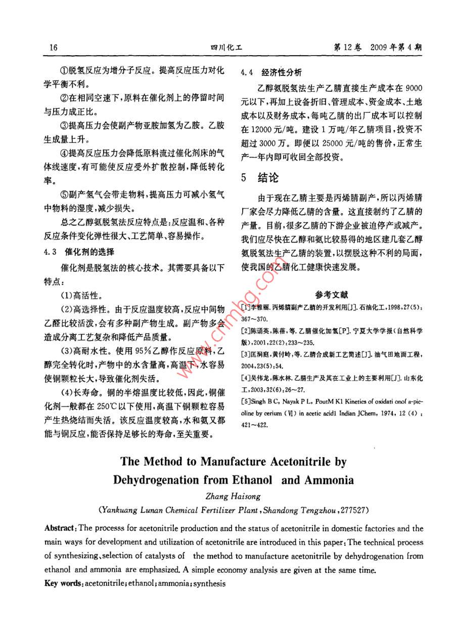 乙醇與氨脫氫法合成乙腈