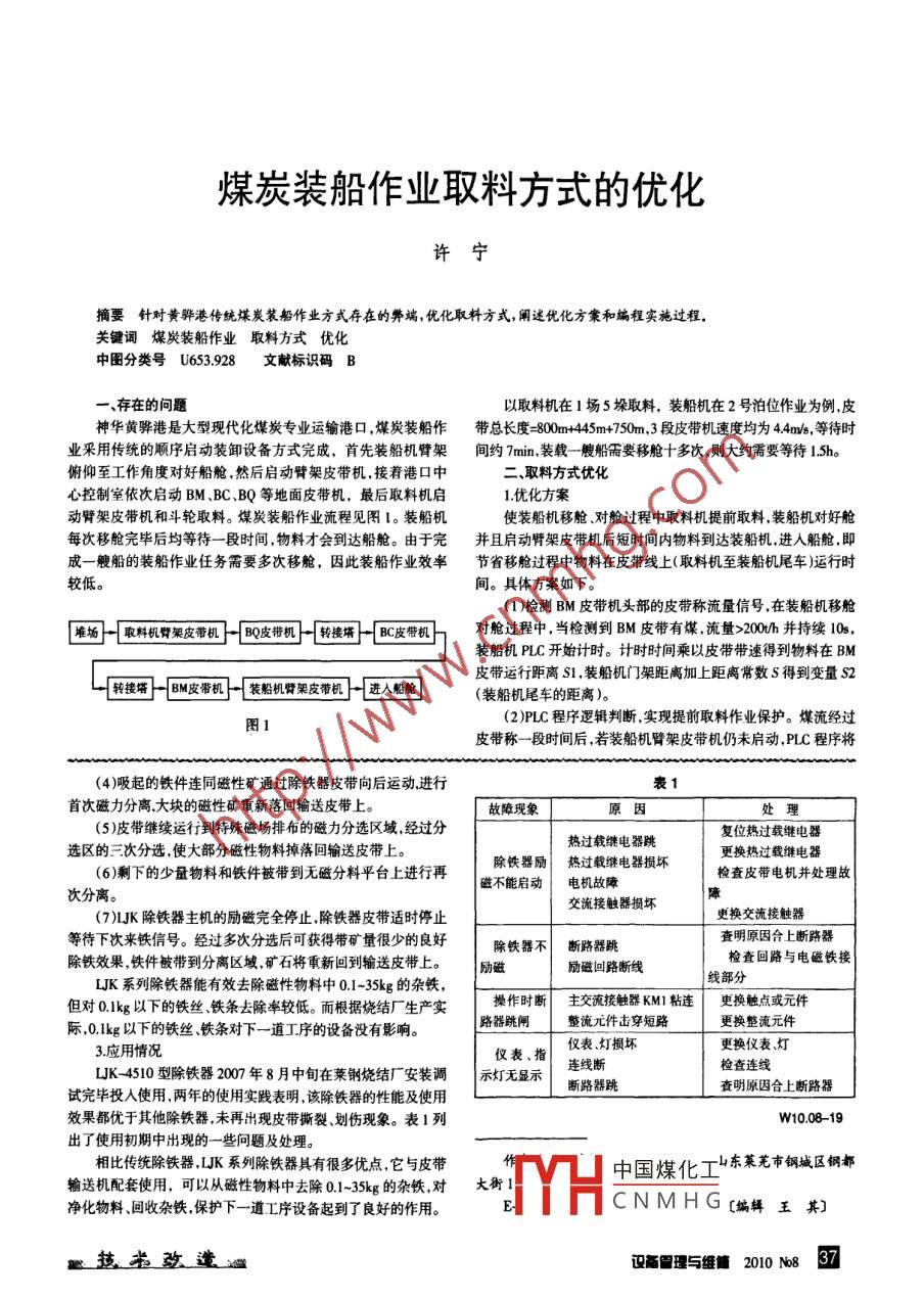 煤炭裝船作業(yè)取料方式的優(yōu)化許寧摘要針對(duì)黃驊港傳統(tǒng)煤炭裝船作業(yè)方式存在的弊端,優(yōu)化取料方式,闡述優(yōu)化方案和編程實(shí)施過程.關(guān)鍵詞煤炭裝船作業(yè)取料方式優(yōu)化中囝分類號(hào)U653.928文獻(xiàn)標(biāo)識(shí)碼一、存在的問題以取料機(jī)在1場5垛取料,裝船機(jī)在2號(hào)泊位作業(yè)為例,皮神華黃驊港是大型現(xiàn)代化煤炭專業(yè)運(yùn)輸港口,煤炭裝船作帶 總長度=800m+445m+750m,3段皮帶機(jī)速度均為4.4mn/s.等待時(shí)業(yè)采用傳統(tǒng)的順序啟動(dòng)裝卸設(shè)備方式完成,首先裝船機(jī)臂架間約7min,裝載- -艘船需要移艙十多次,則大約需要等待1.5h。俯仰至工作角度對(duì)好船艙,然后啟動(dòng)臂架皮帶機(jī),接著港口中二、取料方式優(yōu)化心控制室依次啟動(dòng)BM .BC、BQ等地面皮帶機(jī),最后取料機(jī)啟1.優(yōu)化方案動(dòng)臂架皮帶機(jī)和斗輪取料。煤炭裝船作業(yè)流程見圖1。裝船機(jī)使裝船機(jī)移艙.對(duì)艙過程中取料機(jī)提前取料.裝船機(jī)對(duì)好艙每次移艙完畢后均等待一段時(shí)間, 物料才會(huì)到達(dá)船艙。由于完并且啟動(dòng)臂架皮帶機(jī)后短時(shí)間內(nèi)物料到達(dá)裝船機(jī).進(jìn)入船艙.即成一艘船的裝船作業(yè)任務(wù)需要多次移艙,因此裝船作業(yè)效率節(jié) 省移艙過程中物料在皮帶線上(取料機(jī)至裝船機(jī)尾車)運(yùn)行時(shí)較低。間。具體方案如下。(1)檢測BM皮帶機(jī)頭部的皮帶稱流量信號(hào).在裝船機(jī)移艙堆場}-取料機(jī)臂架皮帶機(jī)]-BO皮帶機(jī)-轉(zhuǎn)接塔}-BC皮帶機(jī)-對(duì)艙過程中,當(dāng)檢測到BM皮帶有煤.流量>200t/h并持續(xù)10s,裝船機(jī)PLC開始計(jì)時(shí)。計(jì)時(shí)時(shí)間乘以皮帶帶速得到物料在BM一轉(zhuǎn)接塔一-BM皮帶機(jī)一[裝船機(jī)臂架皮帶機(jī)}-[進(jìn)入船觸]皮帶運(yùn)行距離SI ,裝船機(jī)門架距離加上距離常數(shù)s得到變量S2(裝船機(jī)尾車的距離)。,圖1(2)PLC程序邏輯判斷,實(shí)現(xiàn)提前取料作業(yè)保護(hù)。煤流經(jīng)過皮帶稱一段時(shí)間后,若裝船機(jī)臂架皮帶機(jī)仍未啟動(dòng),PLC程序?qū)?4)吸起的鐵件連同磁性通過除鐵器皮帶向后運(yùn)動(dòng),進(jìn)行表1首次磁力分離,大塊的磁性礦重新落回輸送皮帶上。故障現(xiàn)象原因t理(5)皮帶繼續(xù)運(yùn)行到特殊磁場排布的磁力分選區(qū)域,經(jīng)過分熱過載繼電器跳復(fù)位熱過載繼電器選區(qū)的三次分選.使大部分磁性物料掉落回輸送皮帶上。除鐵器勵(lì)熱過載繼電 器損壞更換熱過載繼電器(6)剩下的少量物料和鐵件被帶到無磁分料平臺(tái)上進(jìn)行再檢查皮帶電機(jī)并處理故磁不能啟動(dòng)電機(jī)故障次分離。(7)IJK除鐵器主機(jī)的勵(lì)磁完全停止,除鐵器皮帶適時(shí)停止交流接觸器損壞更換交流接觸器等待下次來鐵信號(hào)。經(jīng)過多次分選后可獲得帶礦量很少的良好除鐵器不斷路器跳查明原因合.上斷路器除鐵效果,鐵件被帶到分離區(qū)域,礦石將重新回到輸送皮帶上。勵(lì)磁勵(lì)磁回路斷線檢查回路與電磁鐵接| 線部分LJK系列除鐵器能有效去除磁性物料中0.1~35kg的雜鐵,操作時(shí)斷主交流接觸器KM1粘連更換觸點(diǎn)或元件但對(duì)0.lkg以下的鐵絲、鐵條去除率較低。而根據(jù)燒結(jié)廠生產(chǎn)實(shí)路器跳閘整流元件擊穿短路更換整流元件際,0.1kg以下的鐵絲、鐵條對(duì)下- -道I序的設(shè)備沒有影響。3.應(yīng)用情況儀表、指儀表、燈損壞更換儀表燈連線斷檢查連線LJK-4510型除鐵器2007年8月中旬在萊鋼燒結(jié)廠安裝調(diào)示燈無顯示斷路器跳查明原因合上斷路器試完畢投人使用,兩年的使用實(shí)踐表明,該除鐵器的性能及使用效果都優(yōu)于其他除鐵器,未再出現(xiàn)皮帶撕裂、劃傷現(xiàn)象。表1列W10.08-19出了使用初期中出現(xiàn)的一些問題及 處理。相比傳統(tǒng)除鐵器,LJK系列除鐵器具有很多優(yōu)點(diǎn),它與皮帶中國煤化工4東萊蕪市鋼城區(qū)鋼都輸送機(jī)配套使用,可以從磁性物料中去除0.1~35kg的雜鐵,對(duì)大街 1凈化物料、回收雜鐵,保護(hù)下一道工序設(shè)備起到了良好的作用。:THCNMHG[編輯王其]技米彌造四設(shè)備管理與維修2010 No837給出有煤的聲光報(bào)警信號(hào)提醒操作人員注意。S1