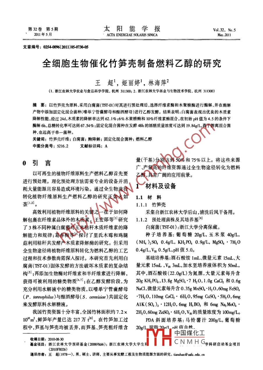 全細(xì)胞生物催化竹筍殼制備燃料乙醇的研究