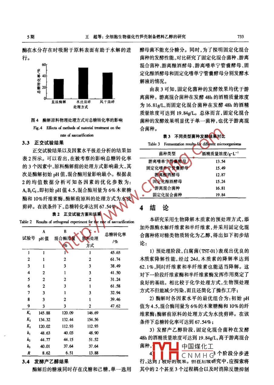 第32卷第5期太陽能學(xué)報(bào)vol 32. No 52011年5月ACTA ENERGIAE SOLARIS SINICAMay,2011文章編號(hào):02540096(2011)05073005全細(xì)胞生物催化竹筍殼制備燃料乙醇的研究王超,姬麗婷,林海萍2(1.漸江農(nóng)林大學(xué)農(nóng)業(yè)與食品科學(xué)學(xué)院,杭州311002.浙江農(nóng)林大學(xué)林業(yè)與生物技術(shù)學(xué)院,杭州31100)摘要:以竹筍殼為原料,采用白腐菌(TST01)對(duì)其進(jìn)行預(yù)處理后,選擇纖維素酶和木聚糖酶進(jìn)行酶解,并在酶解產(chǎn)物中添加固定化混合菌種(嗜單寧管囊酵母和釀酒酵母)進(jìn)行乙醇發(fā)酵。結(jié)果表明:白腐菌表現(xiàn)出優(yōu)良的木質(zhì)素降解性能,經(jīng)過24d,木質(zhì)素的降解率達(dá)到621%;6%木聚糖酶和10%纖維素酶混合,在初始p值為4.5的條件下酶解6h,總糖轉(zhuǎn)化率可達(dá)到67.54%;固定化混合菌種在發(fā)酵48h的酒精質(zhì)量濃度可達(dá)到19.84g/L,高于游離混合菌種,也遠(yuǎn)高于單一菌種。關(guān)鍵詞:竹筍殼纖維;白腐菌;酶降解;固定化混合菌種;燃料乙醇中圖分類號(hào):S2162文獻(xiàn)標(biāo)識(shí)碼:A0引言量(干基)分別達(dá)到50%和75%以上。將這些來源廣、產(chǎn)量高的纖維資源通過全生物途徑轉(zhuǎn)化為燃料以可再生的植物纖維原料生產(chǎn)燃料乙醇首先要乙醇,具有廣闊的應(yīng)用前景進(jìn)行預(yù)處理。理化預(yù)處理方法需要專業(yè)的設(shè)備并消耗大量能源且容易造成環(huán)境污染。通過全生物途徑1材料及設(shè)備轉(zhuǎn)化植物纖維原料生產(chǎn)燃料乙醇的研究正如火如1.1材料茶1.1.1竹筍殼高效利用植物纖維原料的關(guān)鍵之一在于如何降采集自浙江農(nóng)林大學(xué)后山,清洗后風(fēng)干備用。解包裹在纖維素晶體外的木質(zhì)素。王宏鄖等研究1.1.2預(yù)處理菌株及其培養(yǎng)基了3株不同種屬白腐菌對(duì)玉米秸稈木質(zhì)纖維素的降白腐菌(TST0):浙江大學(xué)分離保藏解能力和規(guī)律;葛春梅等“探討了里氏木霉和雞腿種子培養(yǎng)基:葡萄糖20g/L,玉米漿40g/L菇利用秸稈共發(fā)酵產(chǎn)木質(zhì)素降解酶的研究。但采用(NH4)2SO40.4g/L,KH2FO40.9gL,MsO4·7H2O全生物途徑將植物纖維原料轉(zhuǎn)化為燃料乙醇的工藝0.4gL,V0.5g/,pH值5.0過程和技術(shù)參數(shù)尚需深人探討。本研究首先利用白基礎(chǔ)培養(yǎng)基:酒石酸銨1mL、微量元素15mL、大腐菌(TST01)固體發(fā)酵的方法破壞木質(zhì)素的復(fù)雜結(jié)量元素15mL,V3mL,加水至培養(yǎng)液體積為50mL,構(gòu)”;再添加生物酶對(duì)纖維素和半纖維素進(jìn)行降解,其中酒石酸銨(2.0gL)為氮源,大量元素每升含獲得可被利用的糖類物質(zhì)6;在乙醇發(fā)酵階段,為20 g KH,PO4,13.8gMgO4·7H2O,1, Og CaCI2和0.6g充分利用水解液中的糖類物質(zhì),以嗜單寧管囊酵母NaCl,微量元素每升含035 g EnSO4HO,60 mg Feso4(P. tannophilus)與釀酒酵母(S. cereuisiae)共固定化·7H2O, 110mg CoCI2·6H20,95 mg CusO4·5HO,6mg來發(fā)酵原料水解糖液。AIK(SO4)2·12H2O,6 mg H3 BO3和6mgNa2MoO我國竹類資源十分豐富,全國竹林面積約72x2H20,60 mg ZnsO4·6H2O,Vm的質(zhì)量濃度為100mg/L10°m2,鮮筍年產(chǎn)量已達(dá)217萬t。在竹筍加工過PDA斜面培養(yǎng)基:馬鈴薯汁200g/L,葡萄糖程中筍基與筍殼均被丟棄,而筍基、筍殼粗纖維含20g/nH值白中國煤化工收稿日期:20100830基金項(xiàng)目:浙江農(nóng)林大學(xué)預(yù)研基金(2008FK66);浙江農(nóng)林大學(xué)大學(xué)生CNMHG學(xué)科研啟動(dòng)基金項(xiàng)目通訊作者:王超(1978-),男,碩士、講師,主要從事發(fā)酵工程及生物質(zhì)能源方面的研究。 tianshan@ zafu,. edu,cm5期王超等:全細(xì)胞生物催化竹筍殼制備燃料乙醇的研究7311.1.3酶解用酶處理前、后液體中的還原糖量。還原糖測(cè)定采用纖維素酶、木聚糖酶購自淅江騰天生物科技有DN比色定糖法(540mm)限公司,酶活分別為4000g和8000yg221單因子試驗(yàn)1.1.4發(fā)酵產(chǎn)乙醇菌株及其培養(yǎng)基設(shè)置pH值、酶的用量和原料處理方式等三因素嗜單寧管囊酵母(P. tannophilus):該菌種能夠?qū)χ窆S殼酶解糖化的影響試驗(yàn)步發(fā)酵木糖和己糖浙江工業(yè)大學(xué)保存;釀酒酵母(1)竹筍殼糖化的起始pH試驗(yàn)(S. cereuisiae):浙江工業(yè)大學(xué)保存設(shè)置pH值分別為455.0556.065和7.0,酵母細(xì)胞培養(yǎng)基:葡萄糖20g/L,(NL)2SO,對(duì)竹筍殼進(jìn)行混合酶水解糖化,測(cè)定水解后的還原5g/L,蛋白胨20g/L,酵母膏10g/L,瓊脂20g/L糖量。酵母細(xì)胞液體培養(yǎng)基:葡萄糖20g/L,(NL)2(2)混合酶的用量試驗(yàn)5g/L,蛋白胨20g/L酵母膏10gL木聚糖用量分別為2%、6%和10%,對(duì)應(yīng)的纖固定化增值培養(yǎng)基:葡萄糖20g幾,木糖20g/L,維素酶量分別為5%、10%和15%,進(jìn)行竹筍殼的混蛋白胨5g/L,酵母膏5g/L,KH4PO42g/L,MgO4·7mH10合酶的水解糖化測(cè)定水解后的還原糖量。(3)原料處理方式Ig/Le發(fā)酵培養(yǎng)基:竹筍殼水解液濃縮糖液設(shè)置白腐菌預(yù)處理后的竹筍殼采用直接酶水解、水洗剪碎到0.5cm、風(fēng)干搗碎到0.5cm3種處理90-10g,(NH)SO5gL,酵母膏5gl,KBPO2gL,方式,進(jìn)行混合酶水解糖化,測(cè)定水解后的還原糖MgsO4·7H2Olg/L量12設(shè)備2.2.2正交實(shí)驗(yàn)分析天平、生化培養(yǎng)箱、高速組織搗碎機(jī)、精密在竹筍殼水解糖化過程中,對(duì)起始pH值、混合pH計(jì)磁力加熱攪拌器、分光光度計(jì)、電熱恒溫水