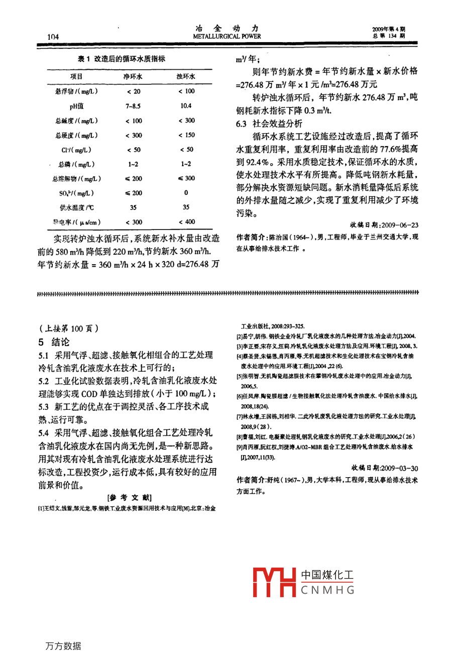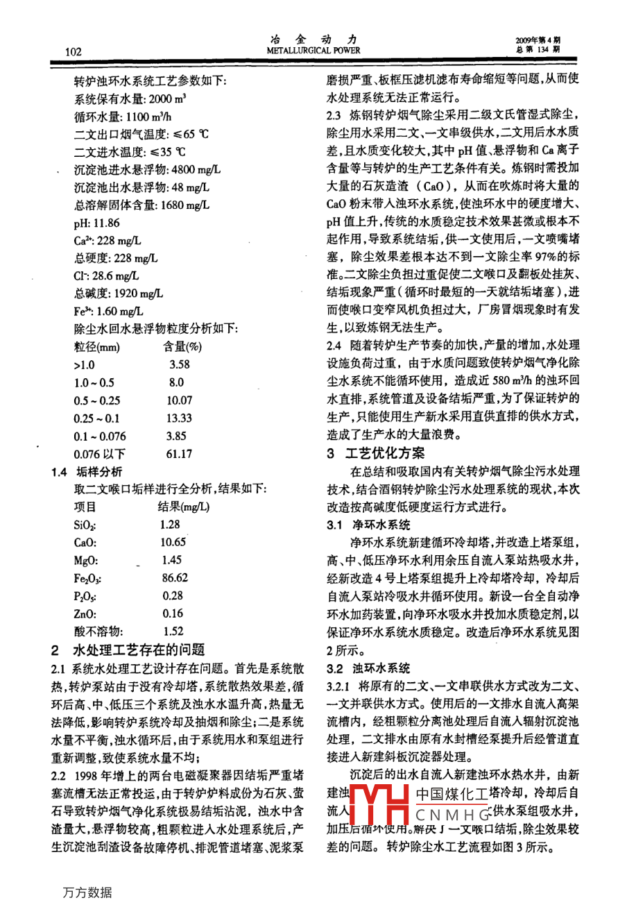 200年第4期冶金動力總第134期METALLURGICAL POWER101一煉鋼轉(zhuǎn)爐循環(huán)水系統(tǒng)改造陳治國,孫麗紅(酒泉鋼鐵公司動力廠甘肅嘉峪關(guān)735100)【摘要】敘述了酒鋼一煉鋼廠凈、濁環(huán)水系統(tǒng)存在的問題并對問題原因進(jìn)行分析針對問題進(jìn)行了優(yōu)化改造最后對改造效果進(jìn)行了綜合評價?!娟P(guān)鍵詞】轉(zhuǎn)爐濁環(huán)水循環(huán)使用【中圖分類號】TK235【文獻(xiàn)標(biāo)識碼】B【文章編號]0606764(200040101-04Reconstruction of Converter Circulation Water System of No. 1 Steel PlantCHEN Zhi-guo, SUN Li-hong(Power Panu, Jiuquan Iron& Sweel(Group)Co. Lad, Jiayuguan, Ganu 735100, China[Abstract]The problems in the clean and turbid circulation water systems of No. 1 Steel Plant ofJiuquan Iron Steel(Group) Co. Ltd were presented. The causes were analyzed and corresponding re.construction measures were adopted. A comprehensive evaluation was made on the reconstruction ef-Key words]converter; turbid circulation water; circulation usage系統(tǒng)概述上,硬度較高。濁環(huán)水系統(tǒng)只要循環(huán),轉(zhuǎn)爐喉口很快酒鋼一煉鋼廠現(xiàn)有的三座50t轉(zhuǎn)爐建于20世結(jié)垢,堵塞,造成抽煙不暢,爐口冒煙,影響煉鋼生紀(jì)80年代,至今已運(yùn)行20多年供水系統(tǒng)包括轉(zhuǎn)爐產(chǎn)為了保證轉(zhuǎn)爐的正常生產(chǎn),只能采用采取生產(chǎn)新高、中、低凈環(huán)水系統(tǒng)和一文、二文除塵水系統(tǒng)循環(huán)水直供直排的方式造成新水較大的浪費(fèi)。水處理設(shè)施由水泵站、輻射式沉淀池及泥漿泵站泥漿脫水間和相應(yīng)的給排水管網(wǎng)組成。隨著煉鋼產(chǎn)量的逐年增加原有水處理工藝存在的問題日益突出,②·450「冷卻單600已遠(yuǎn)不能適應(yīng)生產(chǎn)要求,并成為制約煉鋼生產(chǎn)的主耳軸、吹氧管L水套等用要瓶頸。e20「鼓風(fēng)機(jī)房11凈環(huán)水系統(tǒng)凈環(huán)水系統(tǒng)由高壓水系統(tǒng)、中壓水系統(tǒng)和低壓吸水下二文除塵等用戶水箱2水系統(tǒng)組成,主要為轉(zhuǎn)爐氧槍、爐體和除塵風(fēng)機(jī)煤氣柜提供冷卻用水,凈環(huán)回水均自流人原循環(huán)泵站文除塵等用戶吸水井加壓后循環(huán)使用。外排輻射沉淀池12濁環(huán)水系統(tǒng)轉(zhuǎn)爐除塵濁環(huán)水系統(tǒng)主要供給轉(zhuǎn)爐煙氣除塵凈圖1原供水工藝流程圖化系統(tǒng)“一文”、“二文”噴淋水除塵系統(tǒng)為濕法除13濁環(huán)水水質(zhì)塵,原設(shè)計除塵用水采用二文、一文串級供水方式,由于轉(zhuǎn)爐煉鋼是個非連續(xù)生產(chǎn)過程,使得爐氣洗滌后除塵水中夾雜有大量懸浮物和各種鹽類,一量溫度、煙氣成分都在不斷變化著,因此除塵水的文排水經(jīng)高架流槽流入分配井后再自流入φ20m物理化學(xué)成分和性質(zhì),也在不斷變化中除塵水含有輻射式沉淀池,經(jīng)加藥沉淀處理的出水流入二文吸大量氣件紅廿一其含量在廢水中水井后通過供水泵組供轉(zhuǎn)爐“一文”、“二文除塵是隨昆入大量的石灰粉用水。這套系統(tǒng)自投用以來,由于水處理設(shè)施不完塵CNMHGH>10,廢水中的善水質(zhì)無法達(dá)到使用要求懸浮物在200mg以懸浮物高達(dá)150050mg,水質(zhì)波動范圍大。水冶金動力102ETALLURGICAL POWER總第134轉(zhuǎn)爐濁環(huán)水系統(tǒng)工藝參數(shù)如下磨損嚴(yán)重、板框壓濾機(jī)濾布壽命縮短等問題,從而使系統(tǒng)保有水量:2000m3水處理系統(tǒng)無法正常運(yùn)行循環(huán)水量:1100m/h23煉鋼轉(zhuǎn)爐煙氣除塵采用二級文氏管濕式除塵,二文出口煙氣溫度:≤65℃除塵用水采用二文、一文串級供水,二文用后水水質(zhì)二文進(jìn)水溫度:≤35℃差,且水質(zhì)變化較大,其中pH值、懸浮物和Ca離子沉淀池進(jìn)水懸浮物4800mg/L含量等與轉(zhuǎn)爐的生產(chǎn)工藝條件有關(guān)。煉鋼時需投加沉淀池出水懸浮物:48mg/L大量的石灰造渣(Ca0),從而在吹煉時將大量的總?cè)芙夤腆w含量:1680mgLCaO粉末帶入濁環(huán)水系統(tǒng),使?jié)岘h(huán)水中的硬度增大pH:186pH值上升,傳統(tǒng)的水質(zhì)穩(wěn)定技術(shù)效果甚微或根本不Ca* 228 mg/L起作用,導(dǎo)致系統(tǒng)結(jié)垢,供一文使用后,一文噴嘴堵總硬度:228mg塞,除塵效果差根本達(dá)不到一文除塵率97%的標(biāo)Cl-: 28.6 mg/L準(zhǔn)。二文除塵負(fù)擔(dān)過重促使二文喉口及翻板處掛灰、總堿度:1920mg結(jié)垢現(xiàn)象嚴(yán)重(循環(huán)時最短的一天就結(jié)垢堵塞),進(jìn)Fe*:1.60 mg/L而使喉口變窄風(fēng)機(jī)負(fù)擔(dān)過大,廠房冒煙現(xiàn)象時有發(fā)除塵水回水懸浮物粒度分析如下生,以致煉鋼無法生產(chǎn)。粒徑(mm)含量(%)24隨著轉(zhuǎn)爐生產(chǎn)節(jié)奏的加快,產(chǎn)量的增加,水處理設(shè)施負(fù)荷過重,由于水質(zhì)問題致使轉(zhuǎn)爐煙氣凈化除1.0~0.5塵水系統(tǒng)不能循環(huán)使用,造成近580mh的濁環(huán)回0.5~0.251007水直排,系統(tǒng)管道及設(shè)備結(jié)垢嚴(yán)重為了保證轉(zhuǎn)爐的0.25~0.113.33生產(chǎn),只能使用生產(chǎn)新水采用直供直排的供水方式01~00763.85造成了生產(chǎn)水的大量浪費(fèi)。0.076以下3工藝優(yōu)化方案14垢樣分析在總結(jié)和吸取國內(nèi)有關(guān)轉(zhuǎn)爐煙氣除塵污水處理取二文喉口垢樣進(jìn)行全分析,結(jié)果如下:技術(shù),結(jié)合酒鋼轉(zhuǎn)爐