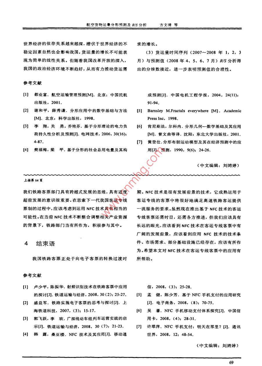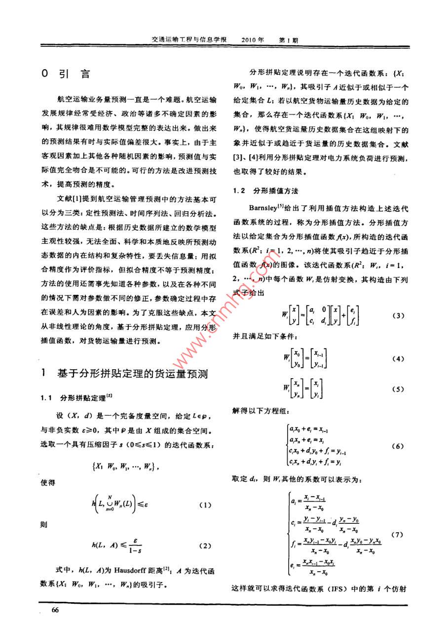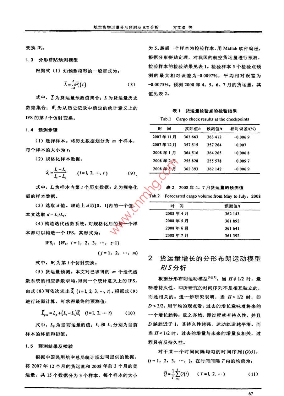 通運(yùn)輸T程與信息學(xué)報(bào)第8卷第1期2010年3月 Joumal of Transportation Engineering and Information No1W18Mar201航空貨物運(yùn)量分形預(yù)測(cè)及R/S分析方文清1常磊21.天津航空有限責(zé)任公司,天津3003002.中國南方航空股份有限公司,上?;剡\(yùn)行指揮部,上海201103摘要:航空貨運(yùn)量預(yù)測(cè)是航空公司運(yùn)力安排的重要參考,本文根據(jù)分形拼貼定理,由分形犧值方法求取個(gè)吸引子與航空貨運(yùn)量歷史數(shù)據(jù)相近的迭代函數(shù)系統(tǒng),建立分形預(yù)測(cè)模型,對(duì)航空貨運(yùn)量進(jìn)行預(yù)測(cè)。預(yù)測(cè)結(jié)果表明,該方法不存在收斂性問題,數(shù)據(jù)收集簡單,具有較好的實(shí)用性,貨運(yùn)量時(shí)間序列RS分析進(jìn)一步表明了預(yù)測(cè)值的合理性關(guān)鍵詞:航空貨運(yùn)量;分形拼貼定理;RS分析;預(yù)測(cè)模型中圖分類號(hào):F560.8文獻(xiàn)標(biāo)識(shí)碼;A文章編號(hào):1672-4747(2010)01-0065-05Fractal Forecast and R/S Analysis of Air Freight VolumeFANG Wen-qing CHANG Lei1. Tianjin Airlines Co. Ltd, Tian jin 300300, China2. Shanghai Base Operation Control SectorChina Southern airlines company Limited, Shanghai 201103, ChinaAbstract: Air freight volume forecast is an important reference for airlines'capacityarrangement. Grounded on the fractal collage theory, an iteration function system, whoseattractor is similar to the history data of air freight volume, is founded in order testablish a fractal forecast model to realize freight volume forecast. It is showed thatthis me thod has no convergence property and collects the data conveniently. Thereforeit has good value in practice. The R/S analysis of air freight volume time series furtherimporved the rationality of the forecast value.Key words: Air freight volume, fractal collage theory R/S analysis, forecast model收稿日期:2009-0420作者簡介:方文清(1984-),福建漳州人,碩士,研究方向?yàn)楹娇者\(yùn)輸管理65交通運(yùn)翰工程與信息學(xué)報(bào)2010年第1期0引言分形拼貼定理說明存在一個(gè)迭代函數(shù)系:{X;Wo,W1,…,W},其吸引子A近似于或相似于一個(gè)航空運(yùn)輸業(yè)務(wù)量預(yù)測(cè)一直是一個(gè)難題。航空運(yùn)輸給定集合L;若以航空貨物運(yùn)輸量歷史數(shù)據(jù)為給定的發(fā)展規(guī)律經(jīng)常受經(jīng)濟(jì)、政治等諸多不確定因素的影集合,那么存在一個(gè)選代函數(shù)系{X;0,W1,…,響,其規(guī)律很難用數(shù)學(xué)模型完整的表達(dá)出來。做出來W},使得航空貨運(yùn)量歷史數(shù)據(jù)集合在這組映射下的的預(yù)測(cè)結(jié)果有時(shí)與實(shí)際值偏差很大。事實(shí)上,由于主象并近似于或趨近于貨運(yùn)量的歷史數(shù)據(jù)集合。文獻(xiàn)客觀因素加上其他各種隨機(jī)因素的影響,預(yù)測(cè)值與實(shí)(3]、[4]利用分形拼貼定理對(duì)電力系統(tǒng)負(fù)荷進(jìn)行預(yù)測(cè)際值完全吻合是不可能的。可行的方法是改進(jìn)預(yù)測(cè)技也取得了較好的結(jié)果。術(shù),提高預(yù)測(cè)的精度。1.2分形插值方法文獻(xiàn)[提到航空運(yùn)輸管理預(yù)測(cè)中的方法基本可以分為三類:定性預(yù)測(cè)法、時(shí)間序列法、回歸分析法。Barnsley給出了利用插值方法構(gòu)造上述迭代這些方法的缺點(diǎn)是:根據(jù)歷史數(shù)據(jù)所建立的數(shù)學(xué)模型函數(shù)系統(tǒng)的過程,稱為分形插值方法。分形插值方主觀性較強(qiáng),無法全面、科學(xué)和本質(zhì)地反映所預(yù)測(cè)動(dòng)法以給定集合為分形插值函數(shù)八(x),所構(gòu)造的迭代函態(tài)數(shù)據(jù)的內(nèi)在結(jié)構(gòu)和復(fù)雜特性,要丟失信息量:用擬數(shù)系(R2;i=1,2,…,n)將使其吸引子趨近于分形插合精度作為評(píng)價(jià)指標(biāo),但擬合精度不等于預(yù)測(cè)精度;值函數(shù)∫x)的圖像。該迭代函數(shù)系(R2:W,i=1,的情況下需對(duì)參數(shù)做不同的修正,參數(shù)確定過程中存式子中每個(gè)函數(shù)H是仿射變換,其構(gòu)造由下列2方法的使用還需事先知道各種參數(shù),以及在各種不同在誤差和人為因素的影響。為了克服這些缺點(diǎn),本文(3)從非線性理論的角度,基于分形拼貼定理,應(yīng)用分形插值函數(shù),對(duì)貨物運(yùn)輸量進(jìn)行預(yù)測(cè)。并且滿足如下條件:(4)1基于分形拼貼定理的貨運(yùn)量預(yù)測(cè)(5)1.1分形拼貼定理設(shè)(X,d)是一個(gè)完備度量空間,給定L∈p,解得以下方程組:與非負(fù)實(shí)數(shù)c≥0,其中即是由X組成的集合空間。a o +e,=xI選取一個(gè)具有壓縮因子s(0≤s≤1)的迭代函數(shù)系a n +e,=I,Io+ yo+f-y-(6){X再…},c,+dy,+f=y使得取定山,則形其他的系數(shù)可以表示為L,∪H2(D)≤eyuyu1-d yn-yo(L,A)≤(2)=y1--d二y血式中,h(L,A)為 Hausdorf距離1;A為迭代函x和數(shù)系{X;W,W1,…,W}的吸引子這樣就可以求得迭代函數(shù)系(IFS)中的第i個(gè)仿射航空貨物運(yùn)量分形預(yù)測(cè)及R/S分析方文清等變換W。為5最后一個(gè)樣本為檢驗(yàn)樣本。用 Matlab軟件編程1.3分形拼貼預(yù)測(cè)模型根據(jù)分形拼貼定理,對(duì)我國的航空貨運(yùn)量進(jìn)行預(yù)測(cè),根據(jù)式(1)知預(yù)測(cè)模型的一般形式為:檢驗(yàn)樣本的檢驗(yàn)結(jié)果見表1。檢驗(yàn)樣本5個(gè)檢驗(yàn)點(diǎn)預(yù)測(cè)的最大相對(duì)誤差為-00097%,平均相對(duì)誤差為(8)00075%。預(yù)測(cè