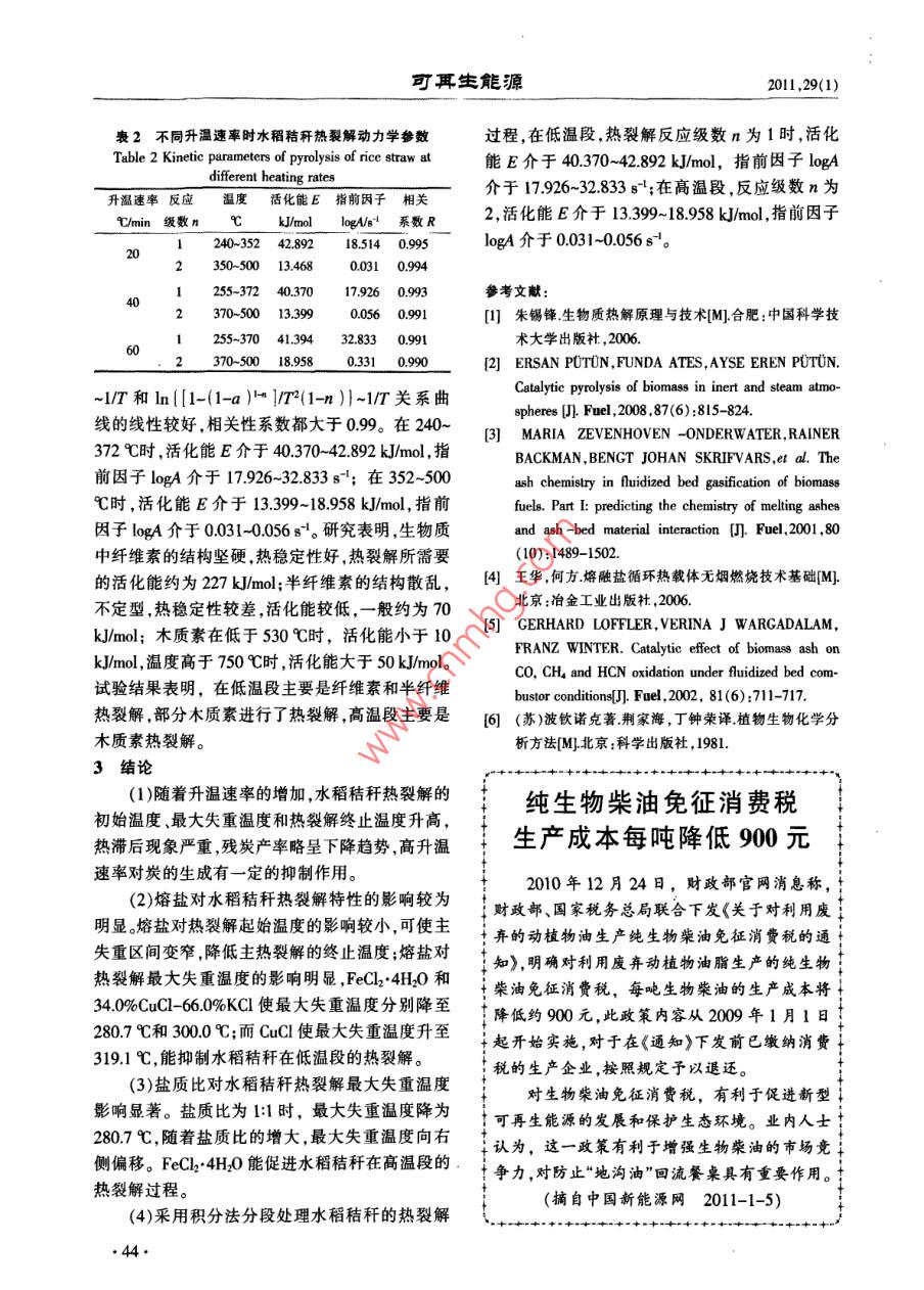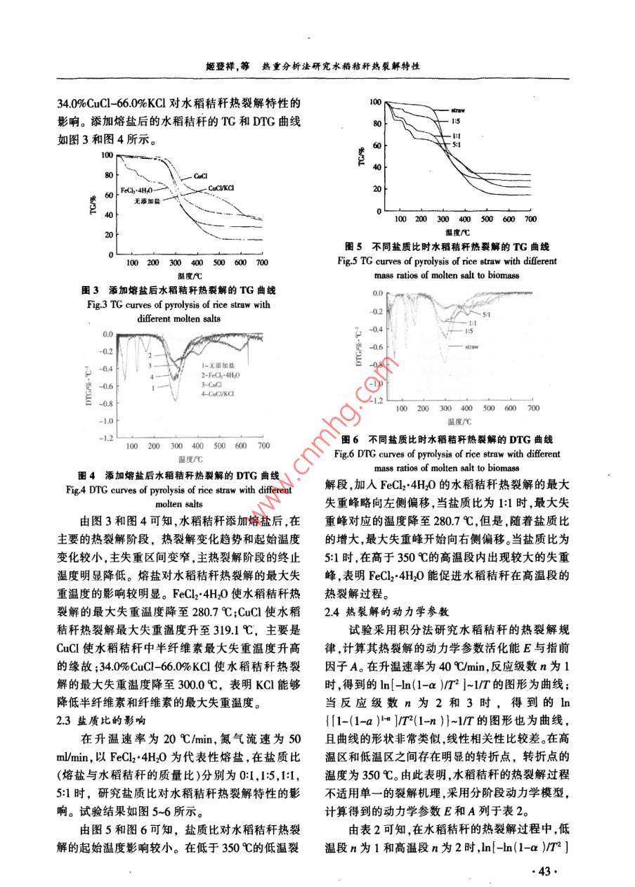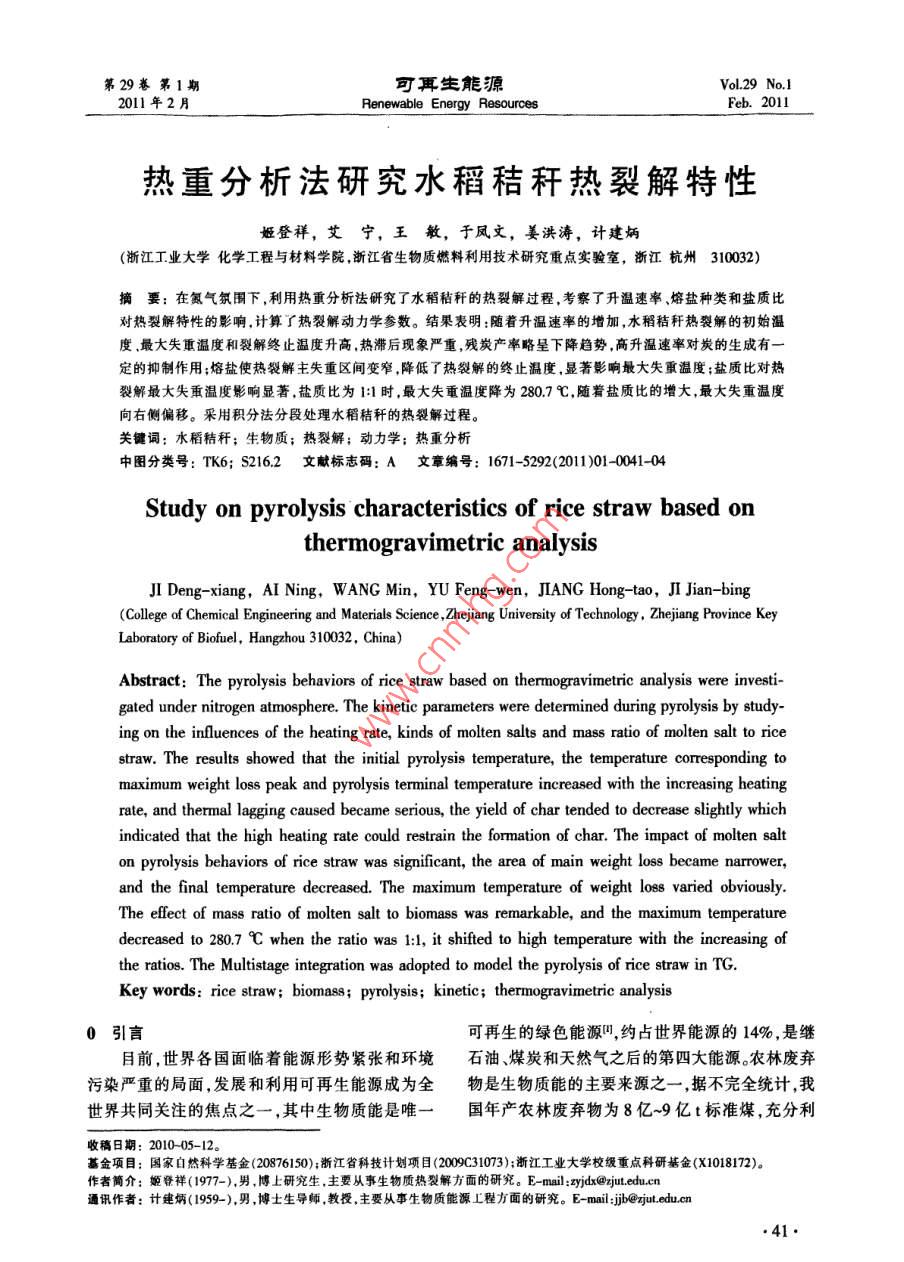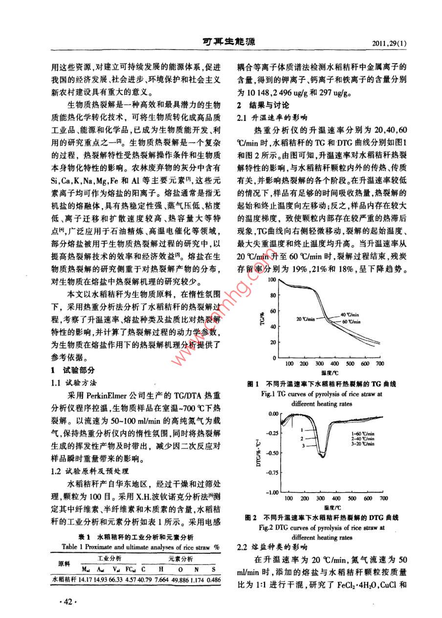 第29卷第1期可再生能源Vol.29 No.12011年2月Renewable Energy ResourcesFeb. 2011熱重分析法研究水稻秸稈熱裂解特性姬登祥,艾寧,王敏,于鳳文,姜洪濤,計(jì)建炳(浙江工業(yè)大學(xué)化學(xué)工程與材料學(xué)院.浙江省生物質(zhì)燃料利用技術(shù)研究重點(diǎn)實(shí)驗(yàn)室,浙江杭州310032)摘要:在氮?dú)夥諊?利用熱重分析法研究了水稻秸稈的熱裂解過程,考察了升溫速率、熔鹽種類和鹽質(zhì)比對(duì)熱裂解特性的影響,計(jì)算了熱裂解動(dòng)力學(xué)參數(shù)。結(jié)果表明:隨著升溫速率的增加,水稻秸稈熱裂解的初始溫度.最大失重溫度和裂解終止溫度升高熱滯后現(xiàn)象嚴(yán)重,殘?zhí)慨a(chǎn)率略呈下降趨勢(shì),高升溫速率對(duì)炭的生成有一定的抑制作用;熔鹽使熱裂解主失重區(qū)間變窄,降低了熱裂解的終止溫度,顯著影響最大失重溫度;鹽質(zhì)比對(duì)熱裂解最大失重溫度影響顯著.鹽質(zhì)比為1:1 時(shí),最大失重溫度降為280.7 C,隨著鹽質(zhì)比的增大,最大失重溫度向右側(cè)偏移。采用積分法分段處理水稻秸稈的熱裂解過程。關(guān)鍵詞:水稻秸稈;生物質(zhì);熱裂解;動(dòng)力學(xué):熱重分析中圖分類號(hào): TK6; S216.2 文獻(xiàn)標(biāo)志碼: A文章編號(hào): 1671-5292(2011)01-0041-04Study on pyrolysis characteristics of rice straw based onthermogravimetric analysisJI Deng xiang, AI Ning, WANG Min,YU Feng- wen, JIANG Hong-tao, JI Jian-bing(College of Chemical Engineering and Materials Science ,Zhejiang Univernity of Technology , Zhejiang Province KeyLaboratory of Biofuel, Hangzhou 310032, China)Abstract: The pyrolysis behaviors of rice straw based on thermogravimetric analysis were investi-gated under nitrogen atmosphere. The kinetie parameters were determined during pyrolysis by study-ing on the influences of the heating rate, kinds of molten salts and mass ratio of molten salt to ricestraw. The results showed that the initial pyrolysis temperature, the temperature corresponding tomaximum weight loss peak and pyrolysis terminal temperature increased with the increasing heatingrate, and thermal lagging caused became serious, the yield of char tended to decrease slightly whichindicated that the high heating rate could restrain the formation of char. The impact of molten salton pyrolysis behaviors of rice straw was significant, the area of main weight loss became narrower,and the final temperature decreased. The maximum temperature of weight lo88 varied obviously.The effect of mass ratio of molten salt to biomass was remarkable, and the maximum temperaturedecreased to 280.7 C when the ratio was 1:1, it shifted to high temperature with the increasing ofthe ratios. The Multistage integration was adopted to model the pyrolysis of rice straw in TG.Key words: rice straw; biomass; pyrolysis; kinetic; thermogravimetric analysis0引言可再生的綠色能源",約占世界能源的14%,是繼目前,世界各國(guó)面臨著能源形勢(shì)緊張和環(huán)境石油、煤炭和天然氣之后的第四大能源。農(nóng)林廢棄污染嚴(yán)重的局面,發(fā)展和利用可再生能源成為全物是生物質(zhì)能的主要來源之一,據(jù)不完全統(tǒng)計(jì),我世界共同關(guān)注的焦點(diǎn)之一,其中生物質(zhì)能是唯一國(guó)年產(chǎn)農(nóng)林廢棄物為8億~9億t標(biāo)準(zhǔn)煤,充分利收稿日期: 2010-05-12?;痦?xiàng)目:國(guó)家白然科學(xué)基金(20876150);浙江省科技計(jì)劃項(xiàng)目(2009C31073);浙江工業(yè)大學(xué)校級(jí)重點(diǎn)科研基金(X1018172)。作者簡(jiǎn)介:姬登祥(1977-),男 ,博上研究生,主要從事生物質(zhì)熱裂解方面的研究。E-mail :zyjdx@ju.edu.cn通訊作者:計(jì)建炳(1959-),男,博士生導(dǎo)師,教授,主要從事生物質(zhì)能源工程方面的研究。E-mail:ii@jut.du.cn.41.可再生能源2011 ,29(1)用這些資源,對(duì)建立可持續(xù)發(fā)展的能源體系,促進(jìn)耦合等離子體質(zhì)譜法檢測(cè)水稻秸稈中金屬離子的我國(guó)的經(jīng)濟(jì)發(fā)展社會(huì)進(jìn)步、環(huán)境保護(hù)和社會(huì)主義含量,得到的鉀離子、鈣離子和鐵離子的含量分別新農(nóng)村建設(shè)具有重大的意義。為10 148 ,2496 ug/g和297 ug/go生物質(zhì)熱裂解是一種高效和最具潛力的生物2結(jié)果與討論質(zhì)能熱化學(xué)轉(zhuǎn)化技術(shù),可將生物質(zhì)轉(zhuǎn)化成高品質(zhì)2.1升溫速率的影響工業(yè)品、能源和化學(xué)品,已成為生物質(zhì)能開發(fā)、利熱重分析儀的升溫速率分別為20,40,60用的研究重點(diǎn)之一口。生物質(zhì)熱裂解是一個(gè)復(fù)雜C/min時(shí),水稻秸稈的TG和DTG曲線分別如圖1的過程,熱裂解特性受熱裂解操作條件和生物質(zhì)和圖2所示。由圖可知,升溫速率對(duì)水稻秸稈熱裂本身物化特性的影響。農(nóng)林廢棄物的灰分中含有解特性的影響,與水稻秸稈顆粒內(nèi)外的傳熱、傳質(zhì)Si,Ca,K,Na,Mg,Fe和Al等主要元素凹,這些元有關(guān),并影響熱裂解的各個(gè)階段。在升溫速率較低素離子均可作為熔鹽的陽離子。熔鹽通常是指無的情況下,樣品有足夠的時(shí)間吸收熱量,熱裂解的機(jī)鹽的熔融體,具有熱穩(wěn)定性強(qiáng)、蒸氣壓低、粘度起始和終止溫度向左移動(dòng);反之,樣品內(nèi)存在較大低、離子遷移和擴(kuò)散速度較高、熱容量大等特的溫度梯度,致使顆粒內(nèi)部存在較嚴(yán)重的熱滯后點(diǎn),廣泛應(yīng)用于石油精煉.高溫電催化等領(lǐng)域,現(xiàn)象,TC曲線向右側(cè)輕微移動(dòng),裂解的起始溫度.部分熔鹽