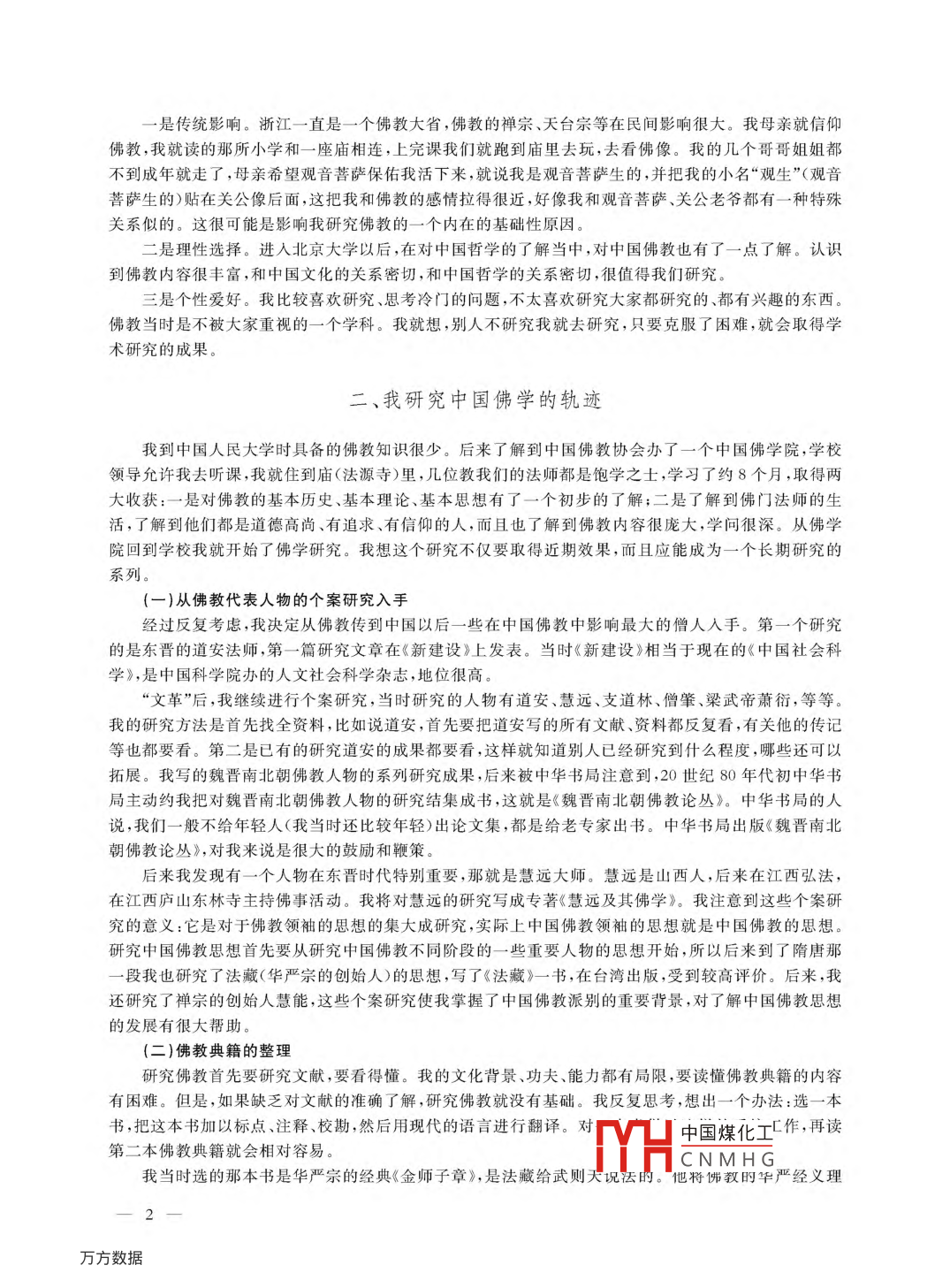 西北民族大學(xué)學(xué)報(bào)(哲學(xué)社會(huì)科學(xué)版)中文核心期刊2014年第5期J. NORTHWEST UNIVERSITY FOR NATIONALITIES (Philosophy and Social Science)NO.5.2014我與中國(guó)佛學(xué)研究方立天(中國(guó)人民大學(xué)哲學(xué)院,北京10010)編者按]三個(gè)月前在北京召開的中國(guó)統(tǒng)一戰(zhàn)線理論研究會(huì)民族宗教理論甘肅研究基地年度工作總結(jié)和表彰會(huì)上還見到了方立天教授,并聆聽了他有關(guān)新時(shí)期民族宗教工作方面的發(fā)言?;靥m州后,一直想求先生賜稿,然得知身體欠安,不宜打擾。后先生得知我刊的訴求,欣然同意并讓秘書轉(zhuǎn)來《我與中國(guó)佛教研究》一文。2014年7月7日編輯部召開統(tǒng)稿會(huì),認(rèn)為《我與中國(guó)佛教研究》一文是先生研究佛學(xué)之立場(chǎng)、觀點(diǎn)、方法的總結(jié)和學(xué)術(shù)人生之感悟,確定在《西北民族大學(xué)學(xué)報(bào)》2014年第5期全文刊發(fā)。就在進(jìn)入編輯程序的第二天,驚悉先生于7月7日9時(shí)26分在北京逝世。先生的逝去是我國(guó)哲學(xué)、宗教學(xué)界的一大損失,然先生的治學(xué)方法與精神將永續(xù)長(zhǎng)存,激勵(lì)后人。[關(guān)鍵詞]中國(guó)佛學(xué);佛教晢學(xué);佛教文化[中圖分類號(hào)]B948[文獻(xiàn)標(biāo)識(shí)碼]A文章編號(hào)]1001-5140(2014)05-0001-05我不是一個(gè)宗教的信仰者,也不是一個(gè)宗教的反對(duì)者,而是把宗教作為一種客觀對(duì)象進(jìn)行研究的個(gè)大學(xué)老師。我想跟佛教有關(guān)的大概有這樣幾類人:直接有關(guān)的就是佛教的信徒;第二類就是研究佛教的一些學(xué)者;第三就是佛教部門有關(guān)的行政官員。佛教學(xué)術(shù)界研究佛教的人是怎么研究的,他們的立場(chǎng)、方法、觀點(diǎn)怎樣,可能對(duì)我們信仰佛教的朋友也會(huì)有參照價(jià)值、我研究中國(guó)佛學(xué)的因緣我是浙江人,1933年出生,1956年進(jìn)入北京大學(xué)哲學(xué)系,1961年從北大哲學(xué)系畢業(yè),分配到中國(guó)人民大學(xué)哲學(xué)系中國(guó)哲學(xué)史教研室當(dāng)教師。當(dāng)時(shí)晢學(xué)系對(duì)老師有兩條要求:一是從先秦到近現(xiàn)代中國(guó)哲學(xué)史要會(huì)通講;二是要確定哪一段哲學(xué)史作為你的重點(diǎn)研究方向。當(dāng)時(shí)很多人報(bào)了先秦、兩漢、宋明、近現(xiàn)代,但魏晉南北朝、隋唐幾乎沒人報(bào)這一階段除了儒學(xué)以外,還有佛教、道教,宗教內(nèi)容比較多,20世紀(jì)60年代初期的政治輿論環(huán)境中道教、佛教研究都被稱為“險(xiǎn)學(xué)”,但我還是報(bào)了這一段,而且決定先研究佛教當(dāng)時(shí)研究佛教有三個(gè)困難:一是內(nèi)容龐雜,歷史很長(zhǎng),派別很多,要系統(tǒng)、全面地把握佛教思想史很不容易;二是佛教有很多概念,它的文字我們大多認(rèn)識(shí),但它的意思有特定的內(nèi)涵,不易了解;三是佛教的思維方式跟我們一般的思維方式不同,是通過排斥肯定,通過否定來呈現(xiàn)事物的真相,通過不是這個(gè)不是那個(gè),然后就是那樣來認(rèn)識(shí)事物,與儒家注重現(xiàn)實(shí)的思維很不一樣。雖然困難不少,但我最后還是確定把佛教研究堅(jiān)持下來我覺得我與佛學(xué)研究有三點(diǎn)因緣:[收稿日期]2014-04-11中國(guó)煤化工作者簡(jiǎn)介]方立天(1933—),男,浙江永康人,中央文史研究館館員,中國(guó)YHaCNMHG書院導(dǎo)師,中國(guó)統(tǒng)一戰(zhàn)線理論研究會(huì)民族宗教理論甘肅研究基地研究員一是傳統(tǒng)影響。浙江一直是一個(gè)佛教大省,佛教的禪宗、天臺(tái)宗等在民間影響很大。我母親就信仰佛教,我就讀的那所小學(xué)和一座廟相連,上完課我們就跑到廟里去玩,去看佛像。我的幾個(gè)哥哥姐姐都不到成年就走了,母親希望觀音菩薩保佑我活下來,就說我是觀音菩薩生的,并把我的小名“觀生”(觀音菩薩生的)貼在關(guān)公像后面,這把我和佛教的感情拉得很近,好像我和觀音菩薩、關(guān)公老爺都有一種特殊關(guān)系似的。這很可能是影響我研究佛教的一個(gè)內(nèi)在的基礎(chǔ)性原因。二是理性選擇。進(jìn)入北京大學(xué)以后,在對(duì)中國(guó)哲學(xué)的了解當(dāng)中,對(duì)中國(guó)佛教也有了一點(diǎn)了解。認(rèn)識(shí)到佛教內(nèi)容很豐富,和中國(guó)文化的關(guān)系密切,和中國(guó)哲學(xué)的關(guān)系密切,很值得我們研究。三是個(gè)性愛好。我比較喜歡研究、思考冷門的問題,不太喜歡研究大家都研究的、都有興趣的東西佛教當(dāng)時(shí)是不被大家重視的一個(gè)學(xué)科。我就想,別人不研究我就去研究,只要克服了困難,就會(huì)取得學(xué)術(shù)研究的成果。、我研究中國(guó)佛學(xué)的軌跡我到中國(guó)人民大學(xué)時(shí)具備的佛教知識(shí)很少。后來了解到中國(guó)佛教協(xié)會(huì)辦了一個(gè)中國(guó)佛學(xué)院,學(xué)校領(lǐng)導(dǎo)允許我去聽課,我就住到廟(法源寺)里,幾位教我們的法師都是飽學(xué)之士,學(xué)習(xí)了約8個(gè)月,取得兩大收獲:一是對(duì)佛教的基本歷史、基本理論、基本思想有了一個(gè)初步的了解;二是了解到佛門法師的生活,了解到他們都是道德髙尚、有追求、有信仰的人,而且也了解到佛教內(nèi)容很龐