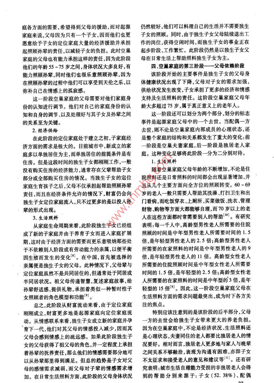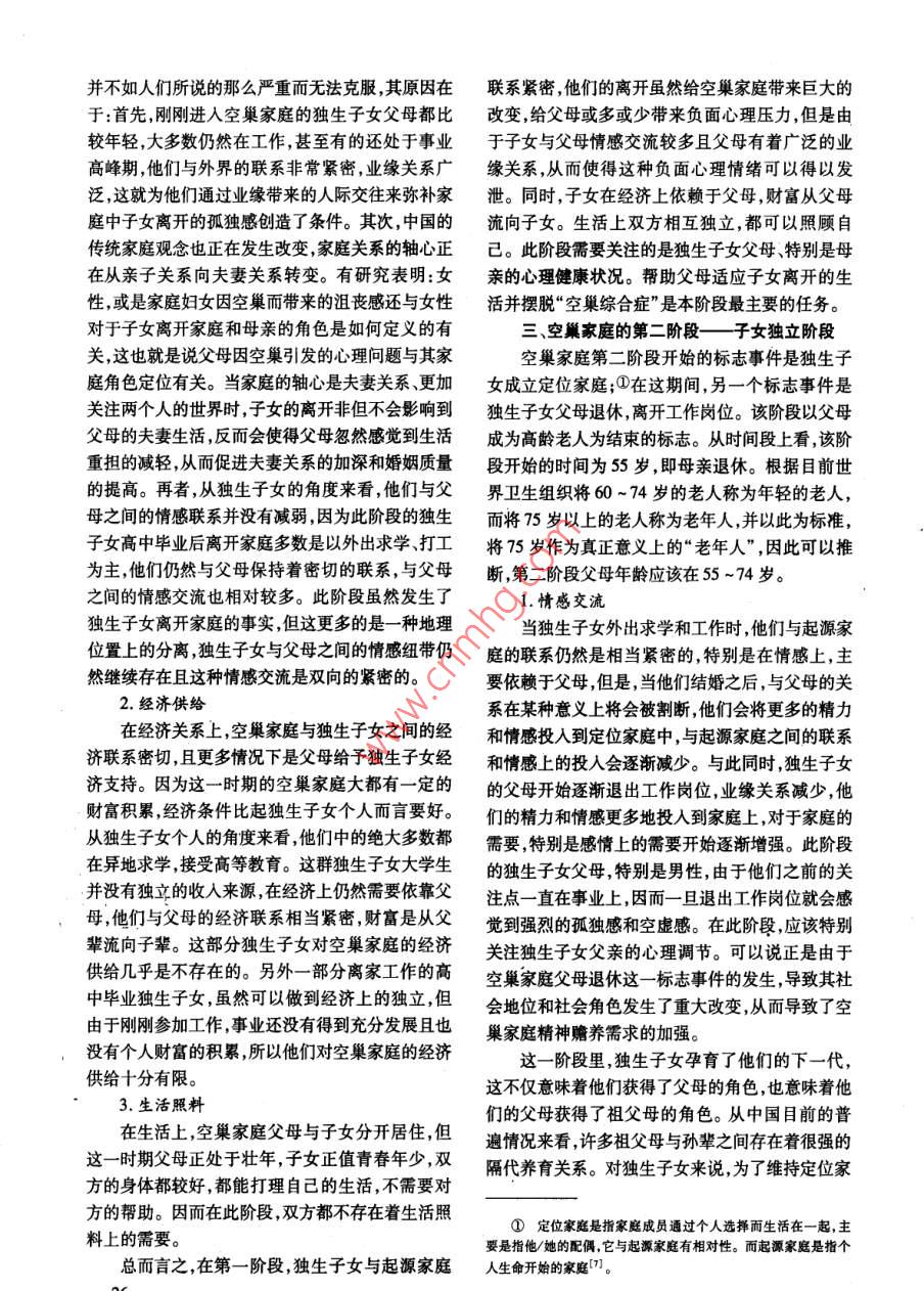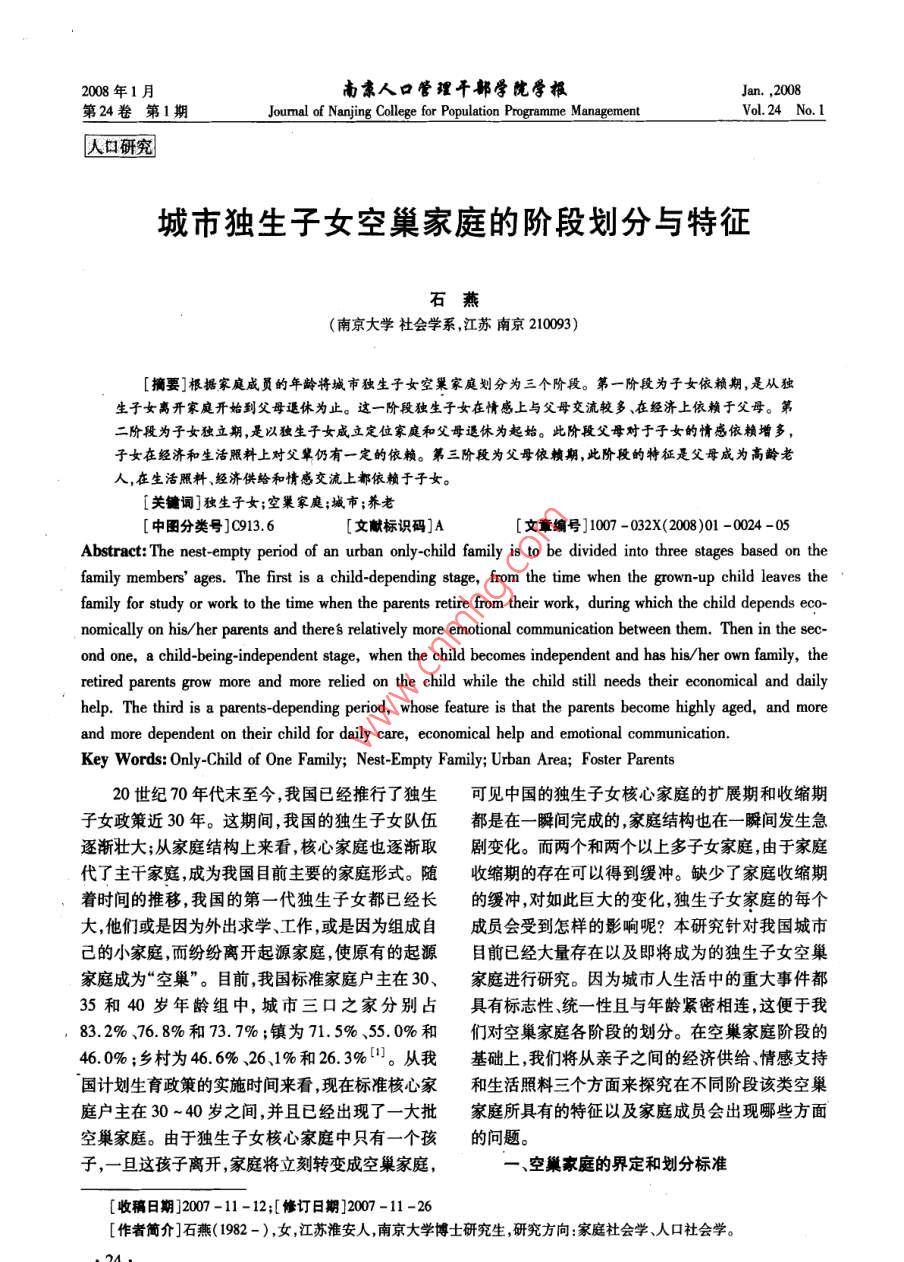 年南隸人口管理干郫學(xué)院嚳報第24卷第1期 Joumal of Nanjing College for Population Programme Management.24N1人口研究城市獨生子女空巢家庭的階段劃分與特征石燕(南京大學(xué)社會學(xué)系,江蘇南京210093)摘要]根據(jù)家庭成員的年齡將城市獨生子女空巢家庭劃分為三個階段。第一階段為子女依賴期,是從獨生子女離開家庭開始到父母還休為止。這一階段獨生子女在情感上與父母交流較多、在經(jīng)濟(jì)上依賴于父母。第二階段為子女獨立期,是以獨生子女威立定位家庭和父母逶休為起始。此階段父母對于子女的情感依賴增多,子女在經(jīng)濟(jì)和生活照料上對父輩仍有一定的依賴。第三階段為父母依賴期,此階段的特征是父母成為高齡老人,在生活照料、經(jīng)濟(jì)供給和情感交流上都依賴于子女。[關(guān)鏞詞]獨生子女;空巢家庭;城市;養(yǎng)老[中圖分類號]013.6[文獻(xiàn)標(biāo)識碼]A[文章編號]1007-032X(2008)01-0024-05Abstract: The nest-empty period of an urban only-child family is to be divided into three stages based on thefamily members'ages. The first is a child-depending stage, from the time when the grown-up child leaves thefamily for study or work to the time when the parents retire from their work, during which the child depends eco-nomically on his/her parents and theres relatively more emotional communication between them. Then in the sec-ond one, a child-being-independent stage, when the child becomes independent and has his/her own family, theretired parents grow more and more relied on the child while the child still needs their economical and dailyhelp. The third is a parents-depending period, whose feature is that the parents become highly aged, and moreand more dependent on their child for daily care, economical help and emotional communicationKey Words: Only-Child of One Family; Nest-Empty Family; Urban Area; Foster Parents20世紀(jì)70年代末至今,我國已經(jīng)推行了獨生可見中國的獨生子女核心家庭的擴(kuò)展期和收縮期子女政策近30年。這期間,我國的獨生子女隊伍都是在一瞬間完成的,家庭結(jié)構(gòu)也在一瞬間發(fā)生急逐漸壯大;從家庭結(jié)構(gòu)上來看核心家庭也逐漸取劇變化。而兩個和兩個以上多子女家庭,由于家庭代了主干家庭,成為我國目前主要的家庭形式。隨收縮期的存在可以得到緩沖。缺少了家庭收縮期著時間的推移,我國的第一代獨生子女都已經(jīng)長的緩沖,對如此巨大的變化,獨生子女家庭的每個大,他們或是因為外出求學(xué)、工作,或是因為組成自成員會受到怎樣的影響呢?本研究針對我國城市己的小家庭,而紛紛離開起源家庭,使原有的起源目前已經(jīng)大量存在以及即將成為的獨生子女空巢家庭成為“空巢”。目前,我國標(biāo)準(zhǔn)家庭戶主在30、家庭進(jìn)行研究。因為城市人生活中的重大事件都35和40歲年齡組中,城市三口之家分別占具有標(biāo)志性、統(tǒng)一性且與年齡緊密相連,這便于我83.2%、76.8%和73.7%;鎮(zhèn)為71.5%、55.0%和們對空巢家庭各階段的劃分。在空巢家庭階段的46.0%;鄉(xiāng)村為46.6%、26、1%和26.3%。從我基礎(chǔ)上我們將從親子之間的經(jīng)濟(jì)供給情感支持國計劃生育政策的實施時間來看現(xiàn)在標(biāo)準(zhǔn)核心家和生活照料三個方面來探究在不同階段該類空巢庭戶主在30~40歲之間,并且已經(jīng)出現(xiàn)了一大批家庭所具有的特征以及家庭成員會出現(xiàn)哪些方面空巢家庭。由于獨生子女核心家庭中只有一個孩的問題。子,一旦這孩子離開,家庭將立刻轉(zhuǎn)變成空巢家庭,空巢家庭的界定和劃分標(biāo)準(zhǔn)[收稿日期]2007-11-12;[修訂日期]2007-11-26[作者簡介]石燕(1982-),女江蘇淮安人,南京大學(xué)博士研究生,研究方向:家庭社會學(xué)、人口社會學(xué)。在對獨生子女空巢家庭進(jìn)行深入研究之前我從高中畢業(yè)并離開起源家庭作為空巢家庭開始的們必須清楚什么是空巢、什么是空巢家庭。主觀指標(biāo)。因此,第一階段是以獨生子女高中畢業(yè)我國對空巢家庭的定義大致有兩個依據(jù):一是并離開起源家庭為開始的標(biāo)志事件,以父母退休為依據(jù)家庭生命周期中的“空巢期”來定義的。目該階段的結(jié)束事件。目前,我國婦女的初育年齡前,國內(nèi)學(xué)者大多認(rèn)可的家庭生命周期劃分標(biāo)準(zhǔn)①般在25歲左右夫妻理想婚齡差在-1到4歲,因是世界衛(wèi)生組織對核心家庭基本模型的劃分2此可以推算子女18歲高中畢業(yè)時,獨生子女父母并認(rèn)為空巢階段是從子女全部離開、父母共同居住的年齡大都在45歲左右另外,女性的法定退休年開始到夫婦中的一方去世為止。如果空巢家庭是齡為55歲,據(jù)此推算第一階段大多數(shù)父母都在按照“空巢期”進(jìn)行定義并且空巢期的家庭就是空45~54歲之間。巢家庭的話那么空巢家庭則應(yīng)該被定義為那些子1.情感交流女離開起源家庭、父母仍共同居住的夫婦家庭。另國外研究表明:處于空巢初期的家庭,其婚姻外一種關(guān)于空巢的界定,即將對空巢家庭的定義建幸福感有明顯增加而只要父母與離家子女之間有立在“空巢”比喻義的基礎(chǔ)之上。如有研究認(rèn)為聯(lián)系則生活幸福感還會出現(xiàn)明顯增加3。但是這空巢家庭是以“鳥兒長大離巢飛去鳥巢空留”一研究結(jié)論在中國卻并不如此,在獨生子女離開起為比喻意指子女長大成人后紛紛離去只剩下父源
