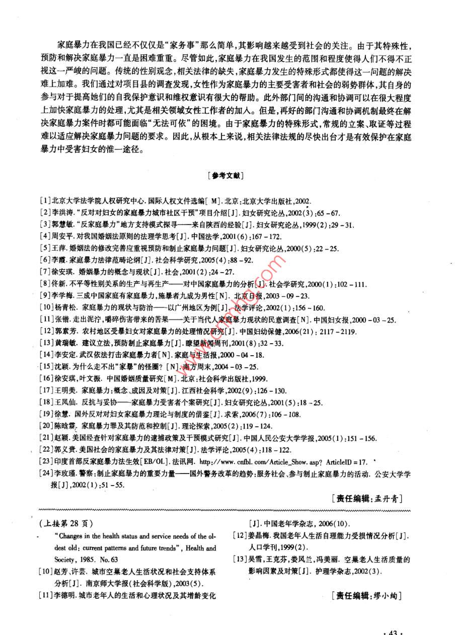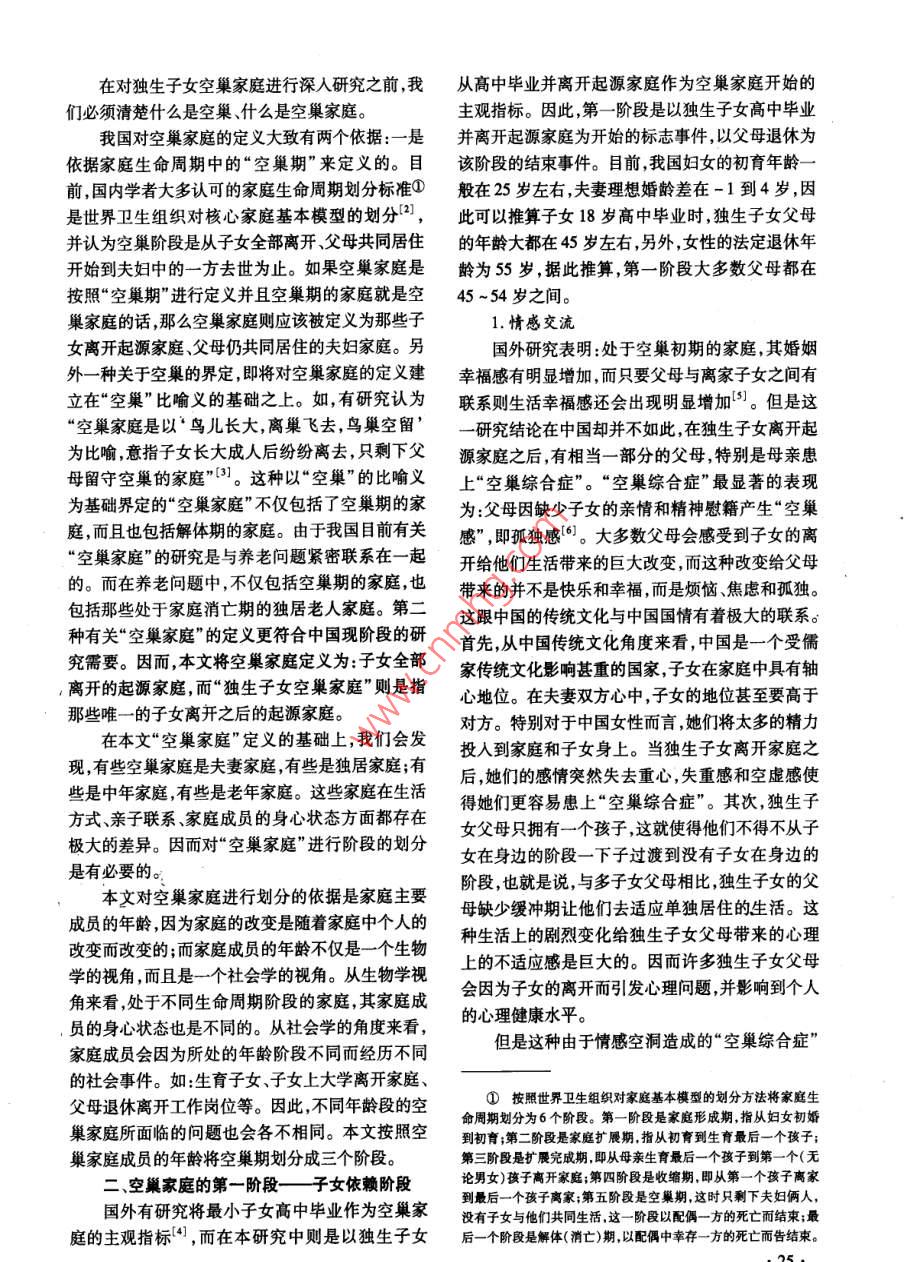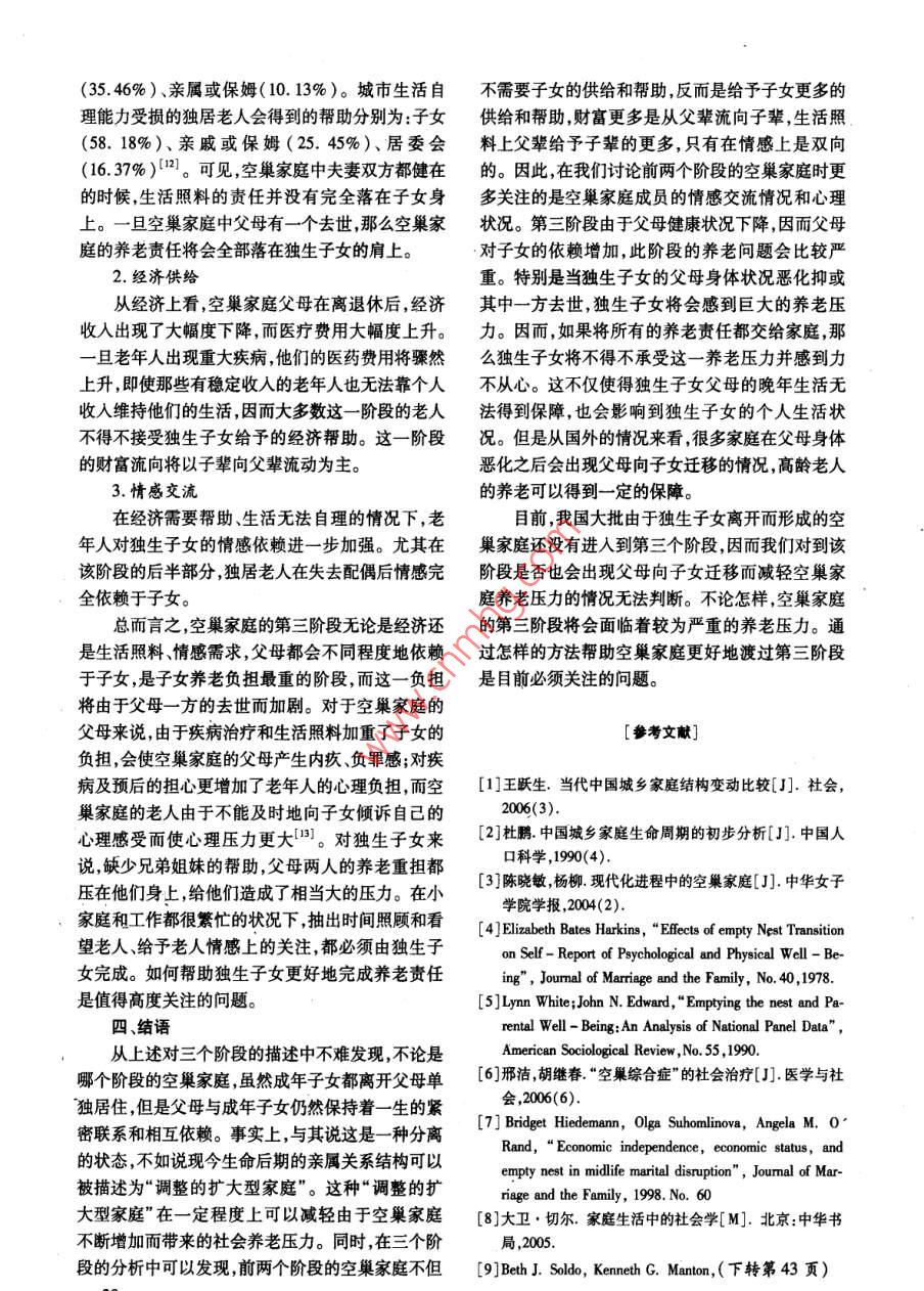 年南隸人口管理干郫學(xué)院嚳報第24卷第1期 Joumal of Nanjing College for Population Programme Management.24N1人口研究城市獨生子女空巢家庭的階段劃分與特征石燕(南京大學(xué)社會學(xué)系,江蘇南京210093)摘要]根據(jù)家庭成員的年齡將城市獨生子女空巢家庭劃分為三個階段。第一階段為子女依賴期,是從獨生子女離開家庭開始到父母還休為止。這一階段獨生子女在情感上與父母交流較多、在經(jīng)濟(jì)上依賴于父母。第二階段為子女獨立期,是以獨生子女威立定位家庭和父母逶休為起始。此階段父母對于子女的情感依賴增多,子女在經(jīng)濟(jì)和生活照料上對父輩仍有一定的依賴。第三階段為父母依賴期,此階段的特征是父母成為高齡老人,在生活照料、經(jīng)濟(jì)供給和情感交流上都依賴于子女。[關(guān)鏞詞]獨生子女;空巢家庭;城市;養(yǎng)老[中圖分類號]013.6[文獻(xiàn)標(biāo)識碼]A[文章編號]1007-032X(2008)01-0024-05Abstract: The nest-empty period of an urban only-child family is to be divided into three stages based on thefamily members'ages. The first is a child-depending stage, from the time when the grown-up child leaves thefamily for study or work to the time when the parents retire from their work, during which the child depends eco-nomically on his/her parents and theres relatively more emotional communication between them. Then in the sec-ond one, a child-being-independent stage, when the child becomes independent and has his/her own family, theretired parents grow more and more relied on the child while the child still needs their economical and dailyhelp. The third is a parents-depending period, whose feature is that the parents become highly aged, and moreand more dependent on their child for daily care, economical help and emotional communicationKey Words: Only-Child of One Family; Nest-Empty Family; Urban Area; Foster Parents20世紀(jì)70年代末至今,我國已經(jīng)推行了獨生可見中國的獨生子女核心家庭的擴(kuò)展期和收縮期子女政策近30年。這期間,我國的獨生子女隊伍都是在一瞬間完成的,家庭結(jié)構(gòu)也在一瞬間發(fā)生急逐漸壯大;從家庭結(jié)構(gòu)上來看核心家庭也逐漸取劇變化。而兩個和兩個以上多子女家庭,由于家庭代了主干家庭,成為我國目前主要的家庭形式。隨收縮期的存在可以得到緩沖。缺少了家庭收縮期著時間的推移,我國的第一代獨生子女都已經(jīng)長的緩沖,對如此巨大的變化,獨生子女家庭的每個大,他們或是因為外出求學(xué)、工作,或是因為組成自成員會受到怎樣的影響呢?本研究針對我國城市己的小家庭,而紛紛離開起源家庭,使原有的起源目前已經(jīng)大量存在以及即將成為的獨生子女空巢家庭成為“空巢”。目前,我國標(biāo)準(zhǔn)家庭戶主在30、家庭進(jìn)行研究。因為城市人生活中的重大事件都35和40歲年齡組中,城市三口之家分別占具有標(biāo)志性、統(tǒng)一性且與年齡緊密相連,這便于我83.2%、76.8%和73.7%;鎮(zhèn)為71.5%、55.0%和們對空巢家庭各階段的劃分。在空巢家庭階段的46.0%;鄉(xiāng)村為46.6%、26、1%和26.3%。從我基礎(chǔ)上我們將從親子之間的經(jīng)濟(jì)供給情感支持國計劃生育政策的實施時間來看現(xiàn)在標(biāo)準(zhǔn)核心家和生活照料三個方面來探究在不同階段該類空巢庭戶主在30~40歲之間,并且已經(jīng)出現(xiàn)了一大批家庭所具有的特征以及家庭成員會出現(xiàn)哪些方面空巢家庭。由于獨生子女核心家庭中只有一個孩的問題。子,一旦這孩子離開,家庭將立刻轉(zhuǎn)變成空巢家庭,空巢家庭的界定和劃分標(biāo)準(zhǔn)[收稿日期]2007-11-12;[修訂日期]2007-11-26[作者簡介]石燕(1982-),女江蘇淮安人,南京大學(xué)博士研究生,研究方向:家庭社會學(xué)、人口社會學(xué)。在對獨生子女空巢家庭進(jìn)行深入研究之前我從高中畢業(yè)并離開起源家庭作為空巢家庭開始的們必須清楚什么是空巢、什么是空巢家庭。主觀指標(biāo)。因此,第一階段是以獨生子女高中畢業(yè)我國對空巢家庭的定義大致有兩個依據(jù):一是并離開起源家庭為開始的標(biāo)志事件,以父母退休為依據(jù)家庭生命周期中的“空巢期”來定義的。目該階段的結(jié)束事件。目前,我國婦女的初育年齡前,國內(nèi)學(xué)者大多認(rèn)可的家庭生命周期劃分標(biāo)準(zhǔn)①般在25歲左右夫妻理想婚齡差在-1到4歲,因是世界衛(wèi)生組織對核心家庭基本模型的劃分2此可以推算子女18歲高中畢業(yè)時,獨生子女父母并認(rèn)為空巢階段是從子女全部離開、父母共同居住的年齡大都在45歲左右另外,女性的法定退休年開始到夫婦中的一方去世為止。如果空巢家庭是齡為55歲,據(jù)此推算第一階段大多數(shù)父母都在按照“空巢期”進(jìn)行定義并且空巢期的家庭就是空45~54歲之間。巢家庭的話那么空巢家庭則應(yīng)該被定義為那些子1.情感交流女離開起源家庭、父母仍共同居住的夫婦家庭。另國外研究表明:處于空巢初期的家庭,其婚姻外一種關(guān)于空巢的界定,即將對空巢家庭的定義建幸福感有明顯增加而只要父母與離家子女之間有立在“空巢”比喻義的基礎(chǔ)之上。如有研究認(rèn)為聯(lián)系則生活幸福感還會出現(xiàn)明顯增加3。但是這空巢家庭是以“鳥兒長大離巢飛去鳥巢空留”一研究結(jié)論在中國卻并不如此,在獨生子女離開起為比喻意指子女長大成人后紛紛離去只剩下父源