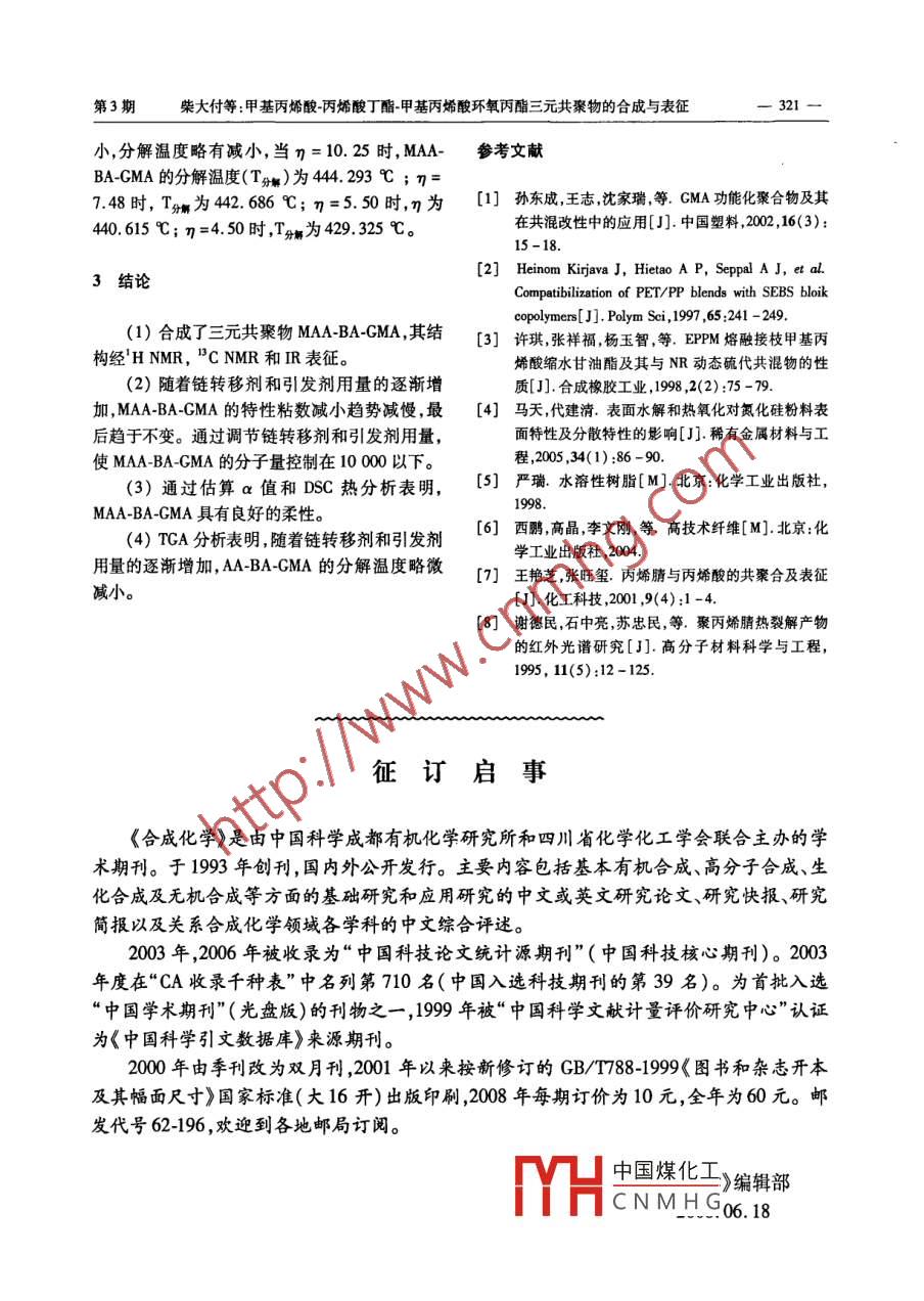 2008年第16卷合成化學(xué)vol.16,2008第3期,318-321Chinese Journal of Synthetic ChemistryNo.3,318~·研究簡報(bào)·甲基丙烯酸-丙烯酸丁酯-甲基丙烯酸環(huán)氧丙酯三元共聚物的合成與表征柴大付,董前年,章于川(安徽大學(xué)化學(xué)化工學(xué)院安徽省綠色高分子材料重點(diǎn)實(shí)驗(yàn)室,安徽合肥230039)摘要:以甲基丙烯酸(MAA),丙烯酸丁酯(BA)和甲基丙烯酸環(huán)氧丙酯(GMA)為原料,偶氮二異丁腈(ABN)為引發(fā)劑,十二硫醇(DT)為鏈轉(zhuǎn)移劑,通過溶液聚合法合成了甲基丙烯酸-丙烯酸丁酯-甲基丙烯酸環(huán)氧丙酯( MAA-BA-GMA)三元共聚物其結(jié)構(gòu)和性能經(jīng)HNMR,CNMR,IR,GPC,DSC和TGA表征。通過調(diào)節(jié)AIBN和DT的用量可控制 MAA-BA-GMA的分子量在7900~23700。熱分析數(shù)據(jù)結(jié)果表明, MAA-BA-GMA具有良好的柔性;分解溫度為429℃~440℃。關(guān)鍵詞:自由基溶液聚合;三元共聚物;甲基丙烯酸環(huán)氧丙酯;大分子表面改性劑中圖分類號(hào):063文獻(xiàn)標(biāo)識(shí)碼:A文章編號(hào):1005-1511(2008)03031804Synthesis and Characterization ofMethacrylic Acid-Butyl Acrvlate- Glycidyl MethacrylateCHAI Da-fu, DONG Qian-nian, ZHANG Yu-chuan( School of Chemistry and Chemical EngineeringAnhui Key Laboratory of Green Polymer Materials, Anhui University, Hefei 230039, China)Abstract: Tercopolymer macromolecular modifier, methacrylic acid-butyl acrylate-glycidyl Methacrylate ( MAA-BA-GMA), was synthesized by radical polymerization from methacrylic acid( MAA)/butylacrylat( BA)/glycidyl methacrylate( GMA)using azobisisobutyronitrile( AIBN)as the initiator,1-do-decanethiol( DT) as the chain transfer agent. The structure and the properties of MAA-BA-GMA werecharacterized by H NMR, C NMR, IR, GPC, DSC and TGA. The molecular weight of MAA-BAGMa was controlled at the range of 7900-23 700 by adjusting amount of AIBN and DT. The resultsof DSC and TGA showed that MAA-BA-GMA exhibited well plasticity and the descomposition temperatures were429℃~440℃Keywords: radical polymerization; tercopolymer; macromolecular modifier甲基丙烯酸環(huán)氧丙酯(GMA)又稱甲基丙烯衍生物,分子結(jié)構(gòu)中的不飽和雙鍵容易發(fā)生共聚酸縮水甘油酯,是一種含有多官能團(tuán)的丙烯酸酯反應(yīng)活性強(qiáng)的環(huán)氧基團(tuán)很容易與羥基胺基等官收稿日期:2007基金項(xiàng)目:國家科技攻關(guān)資助項(xiàng)目(2005BA316C);安徽省科技攻V凵中國煤化工作者簡介:柴大付(1981-),男漢族,安徽亳州人主要從事高CNMHO5515108643,Emcom通訊聯(lián)系人:章于川教授碩士生導(dǎo)師,Emil:yuchuanzhangl46@126.com第3期柴大付等甲基丙烯酸丙烯酸丁酯甲基丙烯酸環(huán)氧丙酯三元共聚物的合成與表征319CHxH2C-C yH2C-CH zH2C=C--CO2CH2C-CH2COHMAAGMAcO2CH2C、CH2長CH2CCH2CHCH2CCO2H CO, Bu CHMAA-BA-GMA能團(tuán)發(fā)生開環(huán)加成反應(yīng),有利于提高高分子合金1實(shí)驗(yàn)部分的相容性。 Heino(2比較了SEBS(苯乙烯乙烯丁二烯苯乙烯), SEBS-g-MA和 SEBS-g-GMA1,1儀器與試劑對(duì)PET/P(聚對(duì)苯二甲酸乙二醇酯/聚丙烯)共Bruker cav400型變換核磁共振譜儀(氘代混物的增容作用。結(jié)果表明, SEBS-g-GMA比丙酮為溶劑TYMS為內(nèi)標(biāo)); Nicolet Neuxs9830型SEBS-g-MA對(duì)PETP有更好的增容性。許琪傅立葉變換紅外光諧儀(K壓片);wac1等通過對(duì)EPDM(三元乙丙膠)熔融接枝CMA型凝膠滲透色譜儀(GPC); Perkin Elmer Pyris-I及其與NR(天然膠)動(dòng)態(tài)硫化共混物的性能研型熱分析儀;烏氏黏度計(jì)。究發(fā)現(xiàn)其拉伸強(qiáng)度和斷裂伸長率有較大幅度的MAA,上海五聯(lián)化工廠;BA,天津市博迪化工提高,這是由于EPDM接枝GMA改善了EPDM有限公司;CMA,上海富蔗化工有限公司;乙酸乙NR的硫化相容性。酯,上海東懿化學(xué)試劑公司;AIBN,湖北成宇制藥本文以甲基丙烯酸(MA),丙烯酸丁酯有限公司;Dr,廣州市珍林貿(mào)易有限公司。以上(BA)和GMA為原料偶氮二異丁腈(ABN)為引試劑均為化學(xué)純發(fā)劑十二硫醇(DT)為鏈轉(zhuǎn)移劑通過溶液聚合12 MAA-BA-GMA的合成法合成了甲基丙烯酸-丙烯酸丁酯-甲基丙烯酸在燒杯中配制反應(yīng)液:MAA2g,按環(huán)氧丙酯(MA-BA-CMA)三元共聚物( Scheme(MAA):m(BA):m(GMA)=1:6:2加入BA1),其結(jié)構(gòu)和性能經(jīng)HNMR,BCMR,皿,和GMA,一定量的ABN和DT[m(AIBN):mGPC,DSC和TGA表征。(DT)=1:1]?;旌暇鶆蚝笕?/3(體積)倒入四合成的 MAA-BA-GMA為大分子表面改性口燒瓶中加入乙酸乙酯100m,攪拌使其完全劑,是針對(duì)極性較強(qiáng)的橡膠改性而設(shè)計(jì)的能顯著溶解N2保護(hù)下于50℃反應(yīng)1h后升至75℃反提高橡膠和陶瓷粉體的增容性。 MAA-BA-GMA應(yīng)2h。自然冷卻至室溫,過濾,濾餅真空干燥后分子鏈側(cè)基上的羧基或環(huán)氧基均可以與納米陶瓷用乙酸乙酯溶解,再真空干燥,重復(fù)2次-3次得粉體表面的OH,NH,NH以等發(fā)生化學(xué)鍵合,淡黃色固體 MAA-BA-GMA;HMMR:,97(s,而其分子鏈上帶酯側(cè)基的鏈段和聚丙烯酸酯氯1H,co2H),4.07(m,2H,CO2CH1),3.70(m,丁橡膠等的結(jié)構(gòu)或極性相似,二者可形成良好的2H,與環(huán)氧基相連的CH2),2.95(m,IH,與環(huán)相互作用,從而在納米陶瓷粉體和橡膠基體之間氧基相連的CH),2.04[m,1H,cH(Co)in架橋、偶聯(lián),有效地改善了無機(jī)陶瓷納米粉體在上BA],1.56(m,2H,主鏈CH2),1.41(d,2H,述橡膠中的相容性和分散性,是一種新型的大分凵中國煤化工c,cCH)子改性劑。MA- BA-GMA對(duì)丙烯酸酯膠耐摩實(shí)·,CCNMHGCH2),0-60驗(yàn)的結(jié)果表明 MAA-BA-GMA改性納米TN在