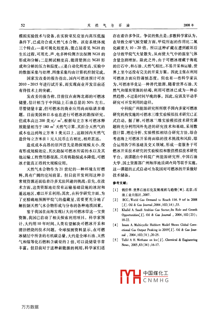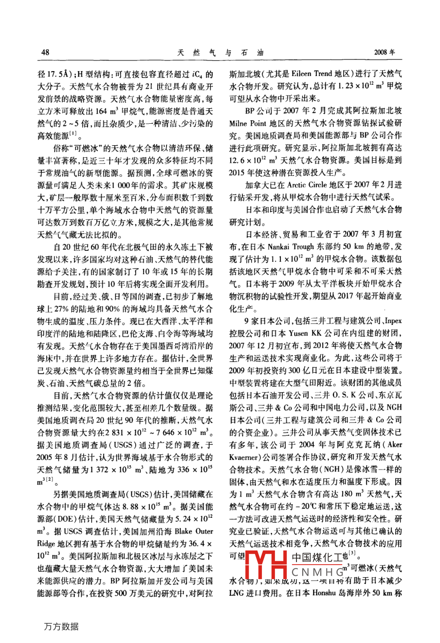第26卷第4期天然與石油2008年8月Natural Gas And OilAug.2008天然氣水合物:巨大的潛在能源錢伯章,朱建芳(上海擎督信息科技公司金秋科技傳播公司,上海200127)摘要:天然氣水合物(又稱可燃冰)分布的范圍約4000×103km2,占海洋總面積的10%海底可燃冰的儲量夠人類使用1000年??扇急l(fā)現(xiàn)儲量是石油夭然氣的2倍,可燃冰將成為人類利用能源的新希望。評述了世界各國可燃冰開發(fā)的探索現(xiàn)狀與前景,對中國可燃冰開發(fā)進行展望。關鍵詞:甲烷水合物;可燃冰;儲量;開發(fā);前景;世界;中國文章編號:10065539(2008)040047406文獻標識碼:A約2800×102m3甲烷就可望滿足美國現(xiàn)能源總消1世界研究開發(fā)現(xiàn)狀費量約達1000年。近二十年來,世界上對深藏地下的清潔能源基于對能源的危機感全世界包括中國,都在尋天然氣水合物的研究和開發(fā)越來越重視。天然氣水找替代能源,科學家估計,1m3天然氣水合物(又稱合物是水和天然氣在高壓和低溫條件下混合時產(chǎn)生可燃冰)可轉化為164m3的天然氣和08m3的水。的一種固態(tài)物質,外貌極像冰雪或固體酒精,點火即海底可燃冰分布的范圍約4000×104km2,占海洋總可燃燒,有“可燃冰”、“氣冰”、“固體瓦斯”之稱,天面積的10%,海底可燃冰的儲量夠人類使用100然氣水合物俗稱“可燃冰”,外表像冰,但其成分中年。因此,可燃冰這個天然氣的水合物將成為人類80%~99.%為甲烷,可以燃燒。它是一種非化學利用能源的新寵計量籠形物,為超分子結構,具有很強的吸附(濃天然氣水合物( Natural Gas Hydrates成為了人縮)氣體能力,單位體積的水合物可含164倍同單們對“后石油時代”能源接替能源的希望。那么,可位的氣體,分子量小,成分不穩(wěn)定除以甲烷氣體為燃冰是否是繼煤炭、石油、天然氣之后,人類最有希主外,還含有乙、丙、丁烷多種氣體。天然氣水合物望的第四代能源?的主要成分是甲烷與水分子(CH4·H2O)。它的形按照目前的石油儲量和人類對石油需求的不斷成與海底石油天然氣的形成過程相傷,而且密切相增加,石油資源將在四五十年后被人類消耗光。按關。埋于海底地層深處的大量有機質在缺氧環(huán)境照專家的預測,目前發(fā)現(xiàn)儲量是石油天然氣2倍的中厭氣性細菌把有機質分解,最后形成石油和天然可燃冰,正好可以接替上氣。其中,許多大然氣又被包進水分子中,在海底的天然氣水合物擁有巨大潛力。事實上,地球上低溫與壓力下又形成可燃冰。這是因為天然氣有個所有有機碳(可采和不可采化石燃料、土壤、溶解性特殊性能,它和水可以在溫度2~5℃內(nèi)結晶,這個有機物、陸上生物群和泥煤)超過一半都是海洋和結晶就是可燃冰。目前研究認為水合物的結構是似永凍地甲烷水合物沉積物的形式。它相當于19768冰狀、立方籠形格子,構型分為:Ⅰ型結構:籠架以體102m3甲烷。美國《油氣雜志》2006年底載文報堆積,只容納小分子烴,如甲烷、乙烷及CO2,H2S道,美國海岸沉積物和少數(shù)永凍地沉積物有95%可等(直徑小于12);Ⅱ型結構:籠架以菱形堆積,不僅能擁有3136×10-3164×10°m甲烷。據(jù)測算,能容中國煤化工,C等大分子(直收稿日期:200802-14CNMHG作者簡介:錢伯章(1939),男,上海市人,教授級高工,畢業(yè)于華東理工大學燃料化工系。長期從事技術與經(jīng)濟情報的調研和傳播工作。電話:(021)58700767。天然氣與石油徑17.5A);H型結構:可直接包容直徑超過iC4的斯加北坡(尤其是 Eileen Trend地區(qū))進行了天然氣大分子。天然氣水合物被譽為21世紀具有商業(yè)開水合物開發(fā)。研究認為總計有1.23×102m3甲烷發(fā)前景的戰(zhàn)略資源。天然氣水合物能量密度高,每可望從水合物中開采出來。立方米可釋放出164m3甲烷氣,能源密度是普通天BP公司于2007年2月完成其阿拉斯加北坡然氣的2~5倍,而且雜質少,是一種清潔、少污染的 Milne point地區(qū)的天然氣水合物資源鉆探試驗研高效能源"。究。美國地質調查局和美國能源部與BP公司合作俗稱“可燃冰”的天然氣水合物以淸潔環(huán)保、儲進行此項研究。研究顯示,阿拉斯加北坡?lián)碛懈哌_量豐富著稱,是近三十年才發(fā)現(xiàn)的眾多特征均不同12.6×102m3天然氣水合物資源。美國目標是到于常規(guī)油氣的新型能源。據(jù)預測,全球可燃冰的資2015年使這種潛在資源投入生產(chǎn)。源量叮滿足人類未來1000年的需求。其礦床規(guī)模加拿大已在 Arctic Circle地區(qū)于2007年2月進大,礦層一般厚數(shù)十厘米至百米,分布面積數(shù)千到數(shù)行鉆采開發(fā)將從甲烷水合物中進行天然氣試采十萬平方公里,單個海域水合物中天然氣的資源量H本和印度與美國合作也啟動了天然氣水合物可達數(shù)萬到數(shù)百萬億立方米,規(guī)模之大,是其他常規(guī)研究計劃。天然氣氣藏無法比擬的日本經(jīng)濟、貿(mào)易和工業(yè)省于2007年3月初宣自20世紀60年代在北極氣田的永久凍土下被布,在日本 Nankai Trough東部約50km的地帶,發(fā)發(fā)現(xiàn)以來許多國家均對這種石油天然氣的替代能現(xiàn)了估計為1.1×102m3的甲烷水合物。該數(shù)據(jù)包源給予關注,有的國家制訂了10年或15年的長期括該地區(qū)天然氣甲烷水合物中可采和不可采大然勘查開發(fā)規(guī)劃,預計10年后將實現(xiàn)全面開發(fā)利用。氣。日本將于2009年從太平洋板塊開始甲烷水合目前經(jīng)過美俄、日等國的