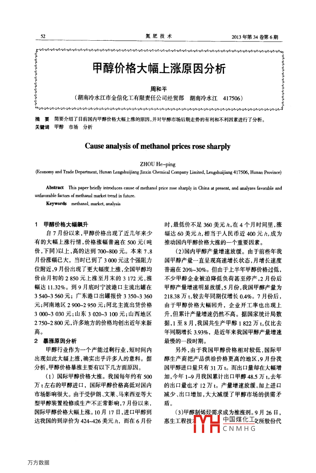 氮肥技術(shù)2013年第34卷第6期甲醇價(jià)格大幅上漲原因分析周和平(湖南冷水江市金信化工有限責(zé)任公司經(jīng)貿(mào)部湖南冷水江417506)摘要簡要介紹了目前國內(nèi)甲醇價(jià)格大幅上漲的原因,并對(duì)甲醇市場(chǎng)后期走勢(shì)的有利和不利因素進(jìn)行了分析。關(guān)鍵詞甲醇市場(chǎng)分析Cause analysis of methanol prices rose sharplyZHOU He-ping(Economy and Trade Department, Hunan Lengshuijiang Jinxin Chemical Company Limited, Lengshuijiang 417506, Hunan Province)Abstract This paper briefly introduces cause of methanol price rose sharply in China at present, and analyzes favorable andunfavorable factors of methanol market trend in futureKeywords methanol, market, anal1甲醇價(jià)格大幅飆升時(shí),最低價(jià)不足360美元/t,在4個(gè)月時(shí)間里,漲自7月份以來,甲醇價(jià)格出現(xiàn)了近幾年來少幅達(dá)60美元止,相當(dāng)于人民幣近400元A,成為有的大幅上漲行情,價(jià)格漲幅普遍在500元(噸推動(dòng)國內(nèi)甲醇價(jià)格大漲的一個(gè)重要因素。價(jià),下同)以上,高的達(dá)到700~800元。本來782)國內(nèi)甲醇產(chǎn)量增速放緩。由于前些年我月份漲幅已大,當(dāng)時(shí)已到了300元這個(gè)強(qiáng)阻力國甲醇產(chǎn)量一直呈現(xiàn)高速增長狀態(tài),月增長速度位附近,9月份出現(xiàn)了更大幅度上漲,全國甲醇均普遍在20%-30%。但由于上半年甲醇價(jià)格過低價(jià)由月初的2850元上漲至月末的3172元,漲不少甲醇企業(yè)被迫降低負(fù)荷甚至停產(chǎn),2月份后幅達(dá)11.32%。到9月底時(shí)寧波港口主流出罐在甲醇產(chǎn)量增速明顯放緩,5月份,我國甲醇產(chǎn)量為3540-3560元;廣東港口出罐報(bào)價(jià)3350-3360218.38萬t,較去年同期僅增長04%。7月份后,元;河南地區(qū)2900~2950元;河北主流出貨價(jià)格由于甲醇價(jià)格大幅回升,企業(yè)開工率也出現(xiàn)上3000-3030元;山東3020-3100元;山西地區(qū)升,但累計(jì)產(chǎn)量增速仍然不高。據(jù)國家統(tǒng)計(jì)局?jǐn)?shù)2750-2800元,許多地方的價(jià)格均創(chuàng)出近年來新?lián)?1至8月我國共生產(chǎn)甲醇1822萬t,僅比去高年同期增長393%,是近年來我國甲醇產(chǎn)量增速2暴漲原因分析最慢的一段時(shí)期。甲醇行業(yè)作為一個(gè)產(chǎn)能過剩行業(yè),短時(shí)間內(nèi)另外,由于我國甲醇價(jià)格相對(duì)較低,國際甲出現(xiàn)如此大幅上漲,確實(shí)出乎許多人的意料。據(jù)醇生產(chǎn)商把產(chǎn)品供給價(jià)格更高的地區(qū),9月份我分析,甲醇價(jià)格暴漲主要有以下幾方面原因。國甲醇進(jìn)口量只有31萬to而出口量卻在大幅增(1)國際甲醇價(jià)格大漲。我國每年約有500加,今年1-9月我國累計(jì)出口甲醇485萬t,去年萬t左右的甲醇進(jìn)口,國際甲醇價(jià)格高低對(duì)國內(nèi)的出口量也才12萬to產(chǎn)量增速放緩,加上進(jìn)口市場(chǎng)影響很大。由于受伊朗、文萊、馬來西亞等大減少、出口增加,大大減緩了甲醇市場(chǎng)的供需矛型甲醇裝置檢修或生產(chǎn)不正常影響,7月份以來,盾。國際甲醇價(jià)格大幅上漲。10月17日,進(jìn)口甲醇到(3)甲醇制烯烴需求成為推漲劑。9月26日,達(dá)我國的到岸價(jià)為424426美元t,而在6月份惠生工程技中國煤化工交所股份代CNMHG第6期周和平:甲醇價(jià)格大幅上漲原因分析號(hào)2236在上海宣布,由其間接非全資附屬公司行情甲醇價(jià)格漲幅超過了30%,也有諸多的炒作惠生工程中國)有限公司設(shè)計(jì)并采用其專有烯烴因素在里面。分離技術(shù)的MTo甲醇制烯烴)裝置26日在南京3后期走勢(shì)分析化學(xué)工業(yè)園區(qū)開車成功,產(chǎn)出合格產(chǎn)品,乙烯、丙綜合來看,甲醇市場(chǎng)后市利多利空因素共烯全部達(dá)到并超過聚合級(jí)產(chǎn)品要求,乙烯產(chǎn)品合存,但總體是利空多于利好,預(yù)計(jì)后市甲醇價(jià)格格率達(dá)到9998%,丙烯產(chǎn)品合格率達(dá)到99.8%。以沖高回落的可能性居大這標(biāo)志著惠生工程甲醇制烯烴分離技術(shù)的首次31主要的不利因素商業(yè)化成功應(yīng)用,對(duì)國內(nèi)煤化工產(chǎn)業(yè)的發(fā)展將產(chǎn)(1)漲幅過大。在8月份時(shí)市場(chǎng)人土認(rèn)為港生積極深遠(yuǎn)的影響??趲齑娴臀?商家挺價(jià)意愿較強(qiáng)部分貨轉(zhuǎn)外銷,另外,寧波禾元化工有限公司60萬ta制烯甲醇貨源偏緊的情況將延續(xù)至8月底或9月上烴項(xiàng)目于今年初投產(chǎn),目前開工率在三五成其旬,甲醇價(jià)格有望繼續(xù)推漲,但上漲空間相對(duì)有消耗甲醇主要為外購,每天甲醇用量為1500~限,國內(nèi)整體價(jià)格突破3000元的可能性不是很200,若進(jìn)人全負(fù)荷生產(chǎn),則年消耗甲醇量將達(dá)大。結(jié)果9月份又掀起第二波強(qiáng)勁上漲行情,并150萬to且比前兩個(gè)月上漲更猛烈,但大幅拉漲后,也暴(4)經(jīng)銷商及下游補(bǔ)庫需求大增。不管是經(jīng)露出甲醇價(jià)格泡沫明顯。銷商還是下游生產(chǎn)廠家,都有“買漲不買跌”的心(2)甲醇開工率上升。我國本來甲醇產(chǎn)能就理,在產(chǎn)品價(jià)格處于跌勢(shì)時(shí)都是努力降低庫存,嚴(yán)重過剩,是由于今年前幾個(gè)月甲醇價(jià)格過低隨用隨買;而在產(chǎn)品價(jià)格處于漲勢(shì)時(shí),都在提前許多企業(yè)被迫停減產(chǎn),才造成甲醇產(chǎn)量