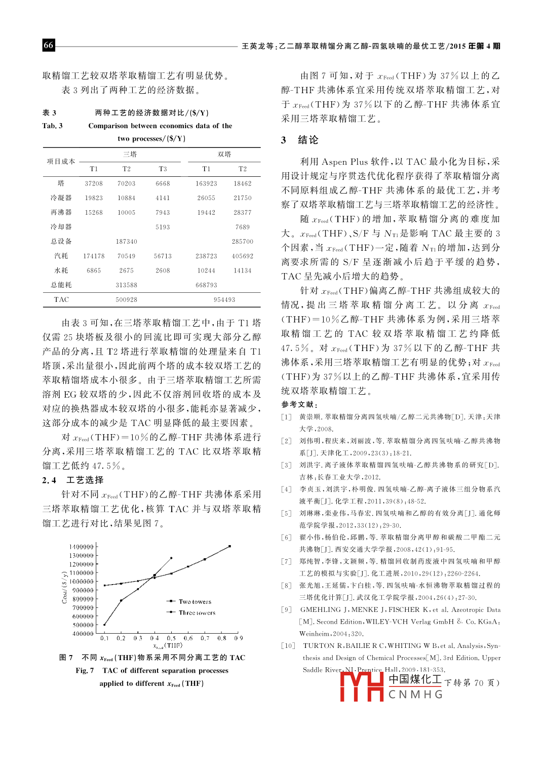 62開發(fā)應(yīng)用www.hxyswgo.cm2015,o.32N.04化學(xué)與生物工程doi:10.3969/j.isn.1672-5425.2015.04.016乙二醇萃取精餾分離乙醇-四氫呋喃的最優(yōu)工藝王英龍,張青,馬羽紅,李鑫,劉興振(青島科技大學(xué)化工學(xué)院,山東青島266042)摘要:對乙二醇萃取精餾分離醇-四氯呋喃共沸體系的工芑基于年度總費(fèi)用最小進(jìn)行了優(yōu)化設(shè)計(jì)。采用設(shè)計(jì)規(guī)定與序貫迭代優(yōu)化程序考察了雙塔萃取精餾工芑與三塔萃取精餾工芑的經(jīng)濟(jì)性。結(jié)果表明,最優(yōu)方案與原料組成有關(guān)當(dāng)四氫呋喃摩爾分欻小于37%時(shí),采用三塔萃取精餾工藝最優(yōu);當(dāng)四氫呋喃摩爾分?jǐn)?shù)大于37%時(shí),采用雙塔萃取精餾工藝最優(yōu)。關(guān)鍵詞:乙醇-四氫呋喃;萃取精餾;優(yōu)化設(shè)計(jì);年度總貲用中圖分類號:TQ028.13文獻(xiàn)標(biāo)識碼:A文章編號:1672-5425(2015)04-0062-05乙醇和四氫呋喃(THF)是化工和制藥行業(yè)中重要的溶劑,一些制藥企業(yè)在生產(chǎn)過程中產(chǎn)生含乙醇0.8THF的廢液,從環(huán)保和經(jīng)濟(jì)的角度出發(fā),都要求對廢20.6液進(jìn)行回收利用。由于二者的混合物形成最低共沸物,普通精餾難以高效分離。常用的共沸物分離方法包括萃取精餾、變壓精餾、共沸精餾等,萃取精餾具有0可控性較好的優(yōu)勢,多用于乙醇-THF共沸體系的分離3。近年來,國內(nèi)外出現(xiàn)了三塔萃取精餾分離共沸id molar fraction x of THF物的研究3,指出了三塔萃取精餾工藝操作能耗低的圖11atm下的乙醇IHF共沸體系yx曲線優(yōu)勢,而采用三塔萃取精餾工藝分離乙醇-THF共沸Fig. 1 y-x Curve for ethanol-THF azeotropic system at 1 atm體系的研究未見報(bào)道。鑒于此,作者基于傳統(tǒng)雙塔萃取精餾工藝,研究了(THF摩爾分?jǐn)?shù)),利用該物性方法所得共沸數(shù)據(jù)與文乙醇-THF共沸體系的三塔萃取精餾工藝。在 Aspen獻(xiàn)值較吻合。Plus平臺上,以年度總費(fèi)用( total annual cost,TAC利用 Aspen Plus中的 Flash2模塊考察乙二醇最小化為目標(biāo),對乙二醇萃取精餾分離乙醇THF共(EG)、二甲基亞砜(DMSO)、二甲基甲酰胺(DMF)及沸體系的工藝進(jìn)行了優(yōu)化得到乙醇THF共沸體系N甲基吡咯烷酮(NMP)對乙醇THF共沸體系氣液不同原料組成時(shí)雙塔或三塔萃取精餾工藝的最優(yōu)方平衡的影響。結(jié)果發(fā)現(xiàn),4種溶劑均能有效破除乙醇案THF的共沸現(xiàn)象,它們對乙醇-THF氣液平衡的影響大小順序?yàn)镈MF>EG>DMSO>NMP。雖然DMF1萃取精餾工藝使得乙醇-THF共沸體系相對揮發(fā)度提高效果最明1.1萃取劑的確定顯,選擇性最高,但平衡的氣相中易出現(xiàn)含量相對較多基于 UNIQUAC物性方法考察乙醇THF共沸的DMF組分,而不利于萃取精餾的實(shí)施。因此,選擇體系的熱力學(xué)性質(zhì)。1atm下的乙醇THF共沸體系EG作為分離乙醇THF共沸體系的萃取劑的yx曲線如圖1所示1.2費(fèi)用模型由圖1可知,在1atm下,共沸體系組成為85.82%按 Turton等10的計(jì)算方法,以TAC最小化作為基金項(xiàng)目:國家自然科學(xué)基金資助項(xiàng)目(21306093),山東省高等學(xué)??萍加?jì)劃項(xiàng)目(J3LD16)收稿日期:2014-12-16TH中國煤化工作者簡介:王英龍(1978—),男,山東泰安人,博士,副教授,研究方向:化工過程系統(tǒng)CNMHG王英龍等:乙二醇萃取精餾分離乙醉四氫呋喃的最優(yōu)工藝/2015年驟4用一目標(biāo)函數(shù)確定最優(yōu)設(shè)計(jì)。TAC為年設(shè)備投資和操作成本的總和,設(shè)備投資主要是精餾系統(tǒng)的主設(shè)備,包括塔和換熱器;操作成本包括冷凝器與再沸器操作使用的冷卻水和蒸汽,公用工程價(jià)格由成本估計(jì)軟件CAPCOST獲得。與汽耗成本相比,電力成本可以忽略。操作時(shí)間按每年8000h計(jì)。表1列出了設(shè)備及能耗的相關(guān)計(jì)算公式以及由 CAPCOST獲取的公用T1為萃取精餾塔,T2為EG回收塔,D1為產(chǎn)品THF,D2為產(chǎn)品乙醇,Bl為乙醇EG混合物,B2為回收EG,H1為冷卻器工程價(jià)格。圖2雙塔萃取精餾工藝流程費(fèi)用模型Fig. 2 Flowsheet of extractive distillationTab. 1Model of costprocess with two towers分項(xiàng)成本計(jì)算基礎(chǔ)要進(jìn)行T1塔的優(yōu)化。優(yōu)化程序總結(jié)如下精餾塔成本塔徑(m):ID= Aspen tray sizing1)暫定萃取精餾塔的總理論塔板數(shù)(Nn),靈敏=17640(ID)1.06(L)0.802塔高(m):L=1.2×0.61X(NT-2)度分析確定進(jìn)料位置(NF);傳熱系數(shù)(Kc)=0.852kW·K-1·m2)暫定溶劑/進(jìn)料比(S/F);傳熱溫差(△Tc)=對數(shù)平均溫差冷凝器成本=7296(Ac)0.653)改變回流比(RR1)直至達(dá)到產(chǎn)品設(shè)計(jì)規(guī)定4)返回第2步,改變S的值直至Qm最小KC×△Tc5)返回第1步,改變Nn直至TAC最小傳熱系數(shù)(KR)=0.568kW·K再沸器成本=7296(AR)0傳熱溫差(△TR)=蒸汽溫度一塔底溫度2.1.3優(yōu)化結(jié)果1)優(yōu)化的工藝參數(shù)采用雙塔萃取精餾工藝優(yōu)化步驟,分別進(jìn)行THF傳熱系數(shù)(K()=0.852kW·K-1·m-2摩爾分?jǐn)?shù)為10%、20%、30%、40%、50%、60%、70%溶劑冷卻器成本傳熱溫差(△Tc)=對數(shù)平均溫及85%的乙醇THF共沸體系的雙塔萃取精餾分離工Aco藝的優(yōu)化,結(jié)果如表2所示。Kco×△TcoLP蒸汽(433K):$7.72/GJ表2優(yōu)化的工藝參數(shù)操作成本公用工程價(jià)格×8×3.6×QHP蒸汽(527K):$9.88/G1Tab 2Optimal processing parameters冷卻水CW(303~313K):$0.354/GJ總設(shè)備投資r Fee (THF) RR回