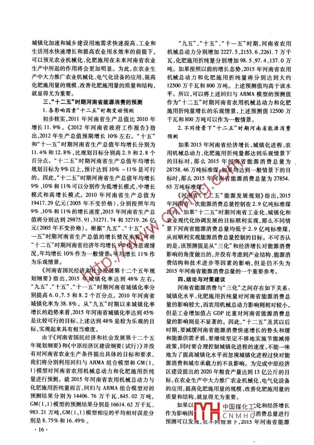 第30卷第1期中州大學(xué)學(xué)報(bào)2013年2月Vol. 30No. 1JOURNAL OF ZHONGZHOU UNIVERSITYFeb. 2013“三化”發(fā)展演變與能源消費(fèi)的關(guān)系:以河南省為例王彥彭(鄭州大學(xué)西亞斯國(guó)際學(xué)院現(xiàn)代經(jīng)濟(jì)研究所,鄭州451150;鄭州大學(xué)市場(chǎng)調(diào)查研究中心,鄭州450001)摘要:以“工 業(yè)化、城鎮(zhèn)化和農(nóng)業(yè)現(xiàn)代化”協(xié)調(diào)發(fā)展問(wèn)題具有典型性和代表性的河南省為例,首先選擇代表性變量,建立回歸分析模型對(duì)“三化"發(fā)展與能源消費(fèi)的數(shù)量關(guān)系進(jìn)行了分析,在此基礎(chǔ)上對(duì)不同情景下2015 年河南省能源消費(fèi)總量進(jìn)行了預(yù)測(cè)。研究結(jié)果表明,改革開(kāi)放尤其是1996年以來(lái)河南省“三化”可以認(rèn)為實(shí)現(xiàn)了協(xié)調(diào)發(fā)展;從長(zhǎng)期來(lái)看,工業(yè)增加值占CDP比重的變動(dòng)對(duì)能源消費(fèi)總量的影響并不顯著,而地區(qū)生產(chǎn)總值、城鎮(zhèn)化水平、農(nóng)業(yè)化學(xué)化和機(jī)械化的影響是顯著的;若“十二五”時(shí)期“三化”協(xié)調(diào)發(fā)展的目標(biāo)得以實(shí)現(xiàn),則河南省能源消費(fèi)總量控制的目標(biāo)就能實(shí)現(xiàn)。關(guān)鍵詞:河南省;“三化”發(fā)展演變;能源消費(fèi)總量;預(yù)測(cè)中圖分類號(hào):F062. 1文獻(xiàn)標(biāo)識(shí)碼:A文章編號(hào):1008 -3715(2013)01 -0014 -04一、文獻(xiàn)綜述社會(huì)某一領(lǐng)域問(wèn)題的探討(白世強(qiáng),2011;宋智勇,河南省是人口大省、糧食和農(nóng)業(yè)生產(chǎn)大省新興2012;朱岱云,2012)。工業(yè)大省,解決好工業(yè)化、城鎮(zhèn)化和農(nóng)業(yè)現(xiàn)代化(以本文則以促進(jìn)“三化”協(xié)調(diào)發(fā)展為背景,針對(duì)河下簡(jiǎn)稱“三化”)協(xié)調(diào)發(fā)展問(wèn)題具有典型性和代表南省“ 三化”發(fā)展與能源消費(fèi)之間關(guān)系進(jìn)行探討,并性。隨著河南省工業(yè)化、城鎮(zhèn)化進(jìn)程加快和消費(fèi)結(jié)借此對(duì)“十二五”時(shí)期河南省能源消費(fèi)總量做出進(jìn)構(gòu)持續(xù)升級(jí),能源需求呈剛性增長(zhǎng),環(huán)境容量不足矛-步的預(yù)測(cè)。盾凸顯,資源環(huán)境約束日趨強(qiáng)化。深人分析河南省二、河南省“三化”發(fā)展與能源消費(fèi)總量的數(shù)量“三化”發(fā)展與能源消費(fèi)之間的關(guān)系,在此基礎(chǔ)上就關(guān)系河南省能源消費(fèi)進(jìn)行預(yù)測(cè),對(duì)于支持河南省加快建1.變量選取與數(shù)據(jù)來(lái)源設(shè)中原經(jīng)濟(jì)區(qū)和實(shí)現(xiàn)能源可持續(xù)利用具有重要的現(xiàn)我們以能源消費(fèi)總量(萬(wàn)噸標(biāo)準(zhǔn)煤;Y,)為被解實(shí)意義,同時(shí)全國(guó)同類地區(qū)具有較強(qiáng)的借鑒意義。釋變量,分別以影響能源消費(fèi)的經(jīng)濟(jì)社會(huì)產(chǎn)出、工業(yè)當(dāng)前,對(duì)于“三化”問(wèn)題的研究成果主要分為以化水平 、城鎮(zhèn)化水平和農(nóng)業(yè)現(xiàn)代化等因素作為解釋下幾類:一是對(duì)于“三化”之間關(guān)系和機(jī)理的研究變量 ,建立模型分析河南省能源消費(fèi)與各影響因素(耿明齋,2012;王永蘇,2012;陳志峰等,2012;崔慧之間的關(guān)系。霞,2012) ,該類成果比較豐富;二是國(guó)外“三化”發(fā)我們分別選擇工業(yè)增加值占GDP比重和城鎮(zhèn)展的經(jīng)濟(jì)總結(jié)和對(duì)我國(guó)的啟示(韓柱等,2012;王瑞化率來(lái)表征工業(yè)化和城鎮(zhèn)化水平。由于兩者都是相波等,2012);三是“三化”協(xié)調(diào)發(fā)展的評(píng)價(jià)研究(方對(duì)指標(biāo),所以我們選擇2005年不變價(jià)格GDP來(lái)表天塹,2012 ;吳旭曉,2012) ,這兩類成果相對(duì)較少;四征經(jīng)濟(jì)社會(huì)產(chǎn)出水平,同時(shí)作為工具變量從而涵蓋是對(duì)地區(qū)或者區(qū)域“三化”協(xié)調(diào)發(fā)展問(wèn)題的探討(宋遺漏的重要解釋變量和非觀測(cè)因素的影響。在上述偉,2011;蔡世忠,2011;王發(fā)曾, 2012;徐君,2012;分析中,我們選擇農(nóng)用機(jī)械總動(dòng)力、農(nóng)田有效灌溉河南省社會(huì)科學(xué)院課題組,2012),主要以中原經(jīng)濟(jì)面積和化肥施用折純量表征 農(nóng)業(yè)現(xiàn)代化水平。結(jié)合區(qū)的研究為主;五是“三化"協(xié)調(diào)發(fā)展背景下對(duì)經(jīng)濟(jì)同類和相關(guān)研究成果,考慮到氣候和地理因素在決收稿日期:2012-11 -20基金項(xiàng)目:2012年度河南省政府決策研究招標(biāo)課題“河南省能源問(wèn)題研究”(2012B674)作者簡(jiǎn)介:王彥彭(1981-),男,河南禹州人,博士,鄭州大學(xué)西亞斯國(guó)際學(xué)院中國(guó)煤化工大學(xué)市場(chǎng)調(diào)查研究中心主任助理,研究方向?yàn)閮尚蜕鐣?huì)建設(shè)、節(jié)能減排。|YHCNM HG14.定農(nóng)田有效灌溉面積時(shí)具有重要作用,以及未來(lái)一-從各解釋變量的估計(jì)結(jié)果來(lái)看,地區(qū)生產(chǎn)總值、段時(shí)期河南省農(nóng)田灌溉面積增速將放緩并趨于穩(wěn)城鎮(zhèn)化水平、化肥施用折純量的提高農(nóng)用機(jī)械總動(dòng)定。因此,在分析“三化”與能源消費(fèi)之間關(guān)系時(shí),力的提升 ,將促使河南