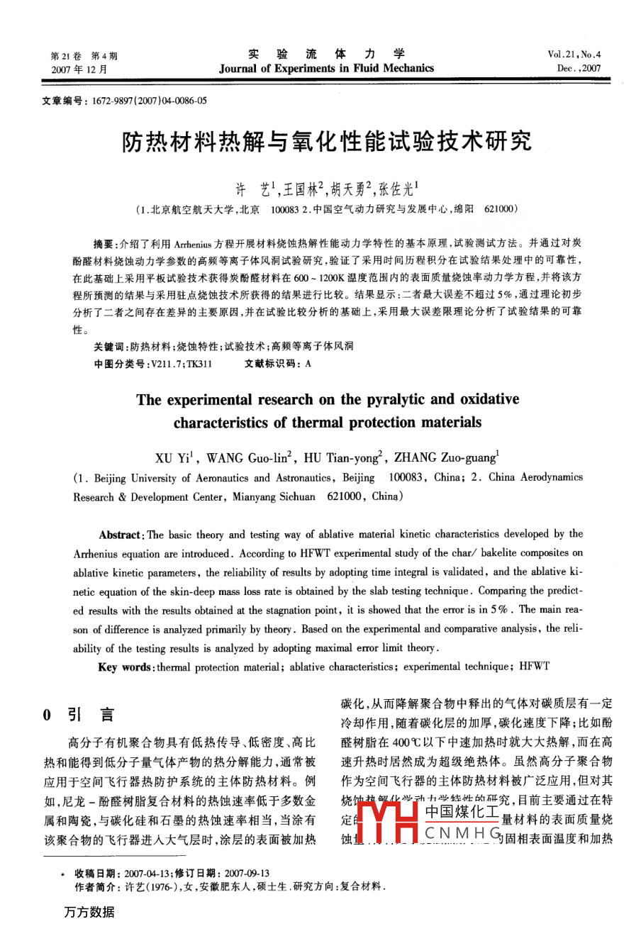 第21卷第4期實(shí)驗(yàn)流體力學(xué)2007年12月Journal of Experiments in Fluid MechanicsDec,,2007文章編號(hào):16729897(2007)04-0086-05防熱材料熱解與氧化性能試驗(yàn)技術(shù)研究許藝,王國(guó)林2,胡天勇2,張佐光(1.北京航空航天大學(xué),北京10002中國(guó)空氣動(dòng)力研究與發(fā)展中心,綿陽(yáng)621000摘要:介紹了利用 Arrhenius方程開(kāi)展材料燒蝕熱解性能動(dòng)力學(xué)特性的基本原理,試驗(yàn)測(cè)試方法。并通過(guò)對(duì)炭酚醛材料燒蝕動(dòng)力學(xué)參數(shù)的高頻等離子體風(fēng)洞試驗(yàn)研究,驗(yàn)證了采用時(shí)間歷程積分在試驗(yàn)結(jié)果處理中的可靠性,在此基礎(chǔ)上采用平板試驗(yàn)技術(shù)獲得炭酚醛材料在600~1200K溫度范圍內(nèi)的表面質(zhì)量燒蝕率動(dòng)力學(xué)方程,并將該方程所預(yù)測(cè)的結(jié)果與采用駐點(diǎn)燒蝕技術(shù)所獲得的結(jié)果進(jìn)行比較。結(jié)果顯示:二者最大誤差不超過(guò)5%,通過(guò)理論初步分析了二者之間存在差異的主要原因,并在試驗(yàn)比較分析的基礎(chǔ)上,采用最大誤差限理論分析了試驗(yàn)結(jié)果的可靠性關(guān)鍵詞:防熱材料;燒蝕特性;試驗(yàn)技術(shù);高頻等離子體風(fēng)洞中圖分類(lèi)號(hào):V211.7;TK311文獻(xiàn)標(biāo)識(shí)碼:AThe experimental research on the paralytic and oxidativecharacteristics of thermal protection materialsXU Yi, WANG Guo-Iin2, HU Tian-yong, ZHANG Zuo-guang(1. Beijing University of Aeronautics and Astronautics, Beijing 100083, China; 2. China AerodynamicsResearch Development Center, Mianyang Sichuan 621000, ChinaAbstract: The basic theory and testing way of ablative material kinetic characteristics developed by theArrhenius equation are introduced. According to HFWT experimental study of the char/ bakelite composites onablative kinetic parameters, the reliability of results by adopting time integral is validated, and the ablative kinetic equation of the skin-deep mass loss rate is obtained by the slab testing technique. Comparing the predicted results with the results obtained at the stagnation point, it is showed that the error is in 5%. The main rea-on of difference is analyzed primarily by theory. Based on the experimental and comparative analysis, the reliability of the testing results is analyzed by adopting maximal error limit theoryKey words: thermal protection material; ablative characteristics; experimental technique; HFWT0引言碳化,從而降解聚合物中釋出的氣體對(duì)碳質(zhì)層有一定冷卻作用,隨著碳化層的加厚,碳化速度下降;比如酚高分子有機(jī)聚合物具有低熱傳導(dǎo)、低密度、高比醛樹(shù)脂在400以下中速加熱時(shí)就大大熱解,而在高熱和能得到低分子量氣體產(chǎn)物的熱分解能力,通常被速升熱時(shí)居然成為超級(jí)絕熱體。雖然高分子聚合物應(yīng)用于空間飛行器熱防護(hù)系統(tǒng)的主體防熱材料。例作為空間飛行器的主體防熱材料被廣泛應(yīng)用,但對(duì)其如,尼龍一酚醛樹(shù)脂復(fù)合材料的熱蝕速率低于多數(shù)金燒學(xué)動(dòng)十學(xué)性的砰究,目前主要通過(guò)在特屬和陶瓷,與碳化硅和石墨的熱蝕速率相當(dāng),當(dāng)涂有定中國(guó)煤化工量材料的表面質(zhì)量燒該聚合物的飛行器進(jìn)入大氣層時(shí),涂層的表面被加熱蝕CNMH⑤固相表面溫度和加熱收稿日期:2007-04-13;修訂日期:20070913作者簡(jiǎn)介:許藝(1976),女,安徽肥東人,碩土生研究方向:復(fù)合材料第4期許藝等:防熱材料熱解與氧化性能試驗(yàn)技術(shù)研究熱時(shí)間三個(gè)參數(shù)之后,利用 Arrhenius經(jīng)驗(yàn)方程獲得數(shù)存在一定的誤差。為了提高測(cè)試準(zhǔn)確度,應(yīng)考慮材材料的表觀質(zhì)量損失動(dòng)力學(xué)方程。筆者對(duì)炭酚醛材料表面溫度隨燒蝕時(shí)間的變化過(guò)程中的相關(guān)細(xì)節(jié),則料在低壓、低熱流環(huán)境下的燒蝕質(zhì)量損失動(dòng)力學(xué)特性所獲得的材料表面質(zhì)量損失為積分過(guò)程,即開(kāi)展了初步試驗(yàn)研究,獲得該材料在表面溫度為△m=sH|ea,dr1400K范圍內(nèi)的質(zhì)量損失動(dòng)力學(xué)方程,并將該動(dòng)力學(xué)方程所預(yù)測(cè)的表面質(zhì)量損失量與采用駐點(diǎn)燒蝕技術(shù)式中:△m為材料表面燒蝕質(zhì)量損失量(g);S為所獲得的結(jié)果進(jìn)行比較初步驗(yàn)證了試驗(yàn)測(cè)試技術(shù)的材料燒蝕表面面積(cm2);t為材料燒蝕時(shí)間(s可靠性。通過(guò)對(duì)試驗(yàn)測(cè)試技術(shù)的進(jìn)一步完善,為防熱材料表面抗氧化、質(zhì)量損失特性和燒蝕特性性能評(píng)估提供了基本技術(shù)支持。1防熱材料燒蝕性能試驗(yàn)研究原理在詳細(xì)研究聚合物的表面燒蝕質(zhì)量損失率的過(guò)程中,除了考慮材料的氧化降解燒蝕之外,應(yīng)對(duì)材料的表面光氧化降解、熱降解兩個(gè)因素同時(shí)進(jìn)行分析,圖1燒蝕過(guò)程中表面溫度變化歷程示意圖但由于受到目前試驗(yàn)和測(cè)試技術(shù)水平的限制,無(wú)法從ig. 1 The sketch of surface temperature vs ablation微觀過(guò)程對(duì)其表面燒蝕質(zhì)量損失率進(jìn)行確定。因此,time in the ablation test該試驗(yàn)研究對(duì)上述綜合因素影響下的材料本征解聚速率,即材料表觀質(zhì)量燒蝕率進(jìn)行宏觀研究14。材2數(shù)據(jù)處理方法料表觀質(zhì)量燒蝕率的基本原理是 Arrhenius經(jīng)驗(y