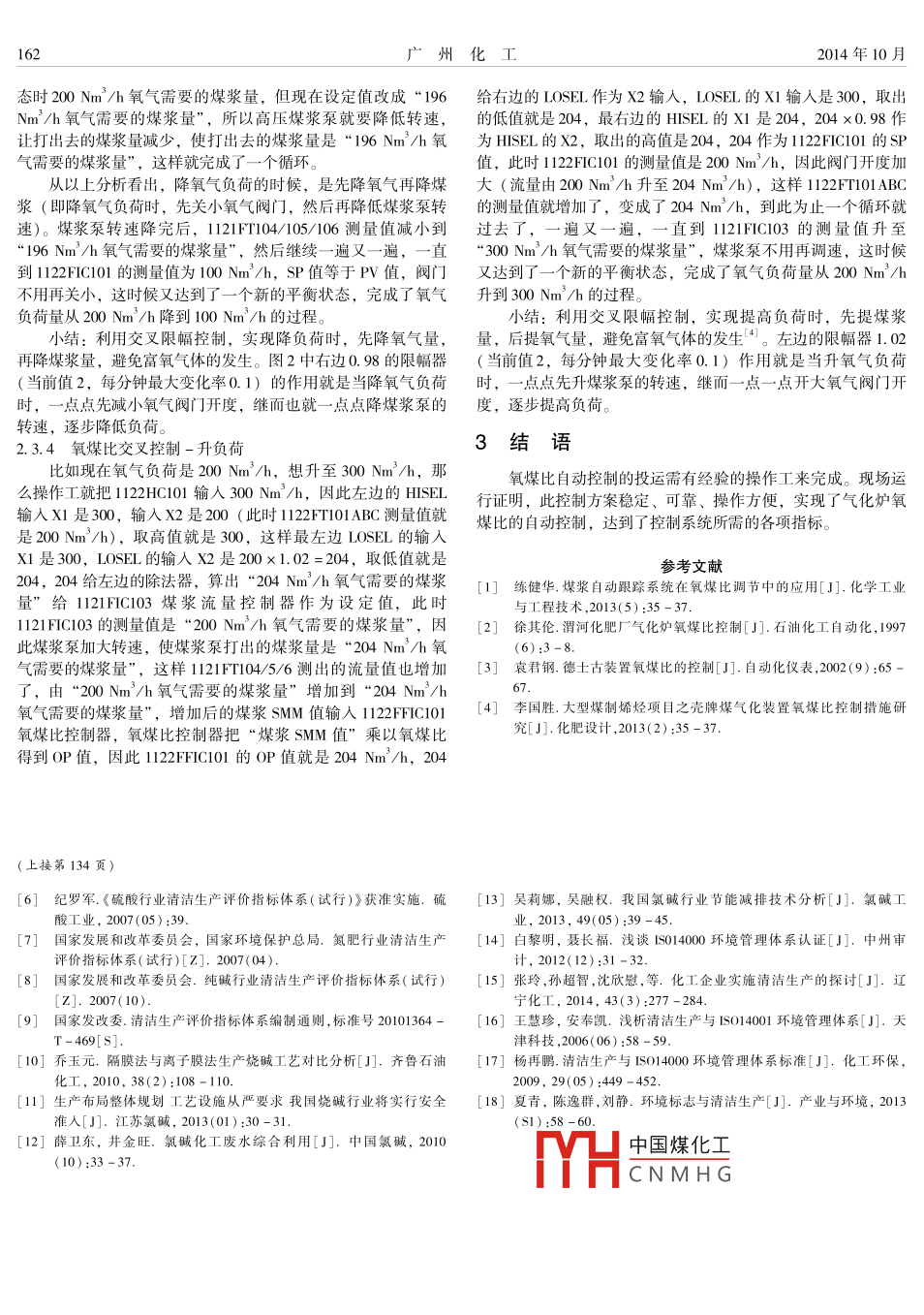 第42卷第19期廣州化工Vol 42 No2014年10月uangzhou Chemical IndustryOct,2014煤氣化的氧煤比控制劉歡(中國天辰工程有限公司,天津300400摘要:闡述了水煤漿氣化裝置在運行過程中,采用氧煤比自動復雜控制,包括中值選擇、溫壓補償、比例調(diào)節(jié)、交叉限幅選擇調(diào)節(jié)等控制原理與方法,精確控制煤漿和氧氣的的λ爐量,實現(xiàn)氧煤比的自動控制。快速克服因煤漿泵不打量而造成的煤漿流量大幅擾動問題,氣化爐過氧和跳車問題,達到氣化爐安全穩(wěn)定運行的目的,使裝置的生產(chǎn)運行更加安全、穩(wěn)定關(guān)鍵詞:氣化爐;氧煤比;交叉限幅選擇調(diào)節(jié)中圖分類號:TP273文獻標志碼:A文章編號:1001-9677(2014)019-0160-03Oxygen-coal Ratio Control of Coal Gasification EquipmentLU HuanChina Tianchen Engineering Corporation, Tianjin 300400, ChinaAbstract: Complicated control of water -coal slurry gasification equipments was described primarily including theprinciple and method of ratio control, Median select, temperature and pressure compensation, ross- limiter adjustmentand exactly control the flow of oxygen and coal slurry into gasifier, automatic control of oxygen -coal mole ratio wasrealized. Through applying oxygen -coal ratio control, the problem that the slurry flow substantially disturbance wassolved, the problem that gasification furmace excess oxygen and interlock shutdown was solved, and the gasificatiefurnace can be operated safely and steadily. The reliable operation of instrument and the security and stability of devicewere ensureKey words: gasification furnace; oxygen-coal ratio; cross-limiter adjustment隨著國內(nèi)煤化工產(chǎn)業(yè)的不斷升溫,德士古水煤漿加壓氣化制取水煤氣的生產(chǎn)工藝被大量采用。中煤陜西榆林榆橫煤化工項目一期氣化裝置采用美國GE專利激冷流程,整個工藝生產(chǎn)操作流程中自動控制系統(tǒng)起著舉足輕重的作用,本文就氣化爐的氧煤比控制的應(yīng)用加以闡述。水煤漿加壓氣化工藝概述從空分來的純氧和高壓煤漿泵送來的濃度(ω)在58%65%之間的煤漿,在一定的安全聯(lián)鎖條件下,經(jīng)工藝燒嘴進入氣化爐,在壓力6.5MPa、溫度1350℃左右的條件下進行氣化0800.850.900.951.001.051.101.151.20反應(yīng),生成以CO+H2為主要成分的粗合成氣。生成的粗合成氧煤化(kg/kg)氣經(jīng)洗滌塔洗滌后送往后續(xù)變換工段。入爐煤量(干)100-105t/h,煤漿濃度80%(重量,銅川煤氣化主要反應(yīng)機理如下圖1氧煤比與碳轉(zhuǎn)化率的關(guān)系Cn Hu +(n/2)O2 nCO+(m/2)H2氧煤比是氣化爐操作的重要參數(shù),對碳轉(zhuǎn)化率的影響十分但是隨著氧煤比的進一步增加,碳的轉(zhuǎn)化率增加不大,同明顯,提高氧煤比可使碳的轉(zhuǎn)化率明顯上升,如下圖1所示。時由于過量的氧氣進入氣化爐,部分碳將完全燃燒,生成二氧氧煤比是指氧氣和水煤漿的體積比,氧煤比增加,將有較化碳中國煤化工,又進一步氧化成二氧化多的煤發(fā)生燃燒反應(yīng),放熱量增大,氣化爐溫度升高,為吸熱碳,從ILR1CNMH使冷煤氣效率、產(chǎn)氣率下的氣化反應(yīng)提供更多的熱量,對氣化反應(yīng)有利。因此,碳的轉(zhuǎn)降。而且,、,以顯上升,而煤耗下降?;?、冷煤氣效率及產(chǎn)氣量上升。般認為氧/碳原子比在1.0左右比較合適。對過程操作來說控制合適的氧煤比是氣化操作最主要的要求第42卷第19期劉歡:煤氣化的氧煤比控制鐘最大變化率是不允許超過5%,因為升降負荷要緩慢,如果2氧煤比控制決速升降負荷,閥門沒有那么準確,容易造成過氧。下面結(jié)合中煤氣化項目的具體組態(tài)內(nèi)容(圖2),講解一下(2)氧煤比設(shè)定值:對應(yīng)圖2中“氧煤比控制器氧煤比在項目中的設(shè)計與應(yīng)用112FCl01”的SP值,是操作工手動給定的,手動給定的“氧煤比設(shè)定值”限幅在450~600以內(nèi),如果輸?shù)臄?shù)值不在這個范圍內(nèi),將不起作用。限幅在這個范圍,是因為氧煤比正常470左右,不能超過450~600這個范圍,氧煤比高,高高會聯(lián)鎖跳車。氧煤比低不聯(lián)鎖停車,但是產(chǎn)生的合成氣不合格(3)氧氣純度-對應(yīng)圖中OsP1氧氣純度設(shè)定值,操作工按當時生產(chǎn)的氧氣純度手動給出。2.3.2投用條件(1)手動輸入?yún)?shù)已輸入完畢(2)氧氣流量控制器投串級(3)煤漿流量控制器投串級。2.3.3氧煤比交叉控制-降負荷圖2中1122FFC01是氧煤比控制器,SP值是操作工手動給定的“氧煤比設(shè)定值”,圖2中SP值給的是480,一旦sP設(shè)定值給定了,氧煤比就是固定值不變了。氧煤比控制器(比值圖2氧煤比控制回路器)112FFCl01把圖2中上面取出來的煤漿量的中值SMM(1122FFCl01的輸人X2)乘以氧煤比,算出需要的氧氣量2.1煤漿流量調(diào)節(jié)回路算出的“需要的氧氣量”就是112FCl01的OP值。而煤漿流量采用三臺電磁流量計(112lrTi04/105/106)測12 FFICIO01的測量值Pv值為氧氣和煤漿流量的體積比,氧氣量,高壓煤漿泵(1121P103)轉(zhuǎn)速也折算成煤漿流量值,三臺流量為1122F1 OIABC三取中經(jīng)過溫壓補償,再經(jīng)氧氣純度校電磁流量計的煤漿流量去掉最小值,剩下兩個再與“煤漿泵轉(zhuǎn)正后的氧氣最終測量值OMP(就是圖2中112FFIC101的輸入速折算出來的煤漿流量值”做三取中,在DCS中作中值選擇,X1),作為分子;煤漿量的中值SMM作為分母,實時計算出的選擇其中間值SMM氣化爐實際的氧煤比,是1122FFC01的PⅤ值煤漿流量控制器為1121FC103,控制器的設(shè)定值是由圖中圖2中112HC101是