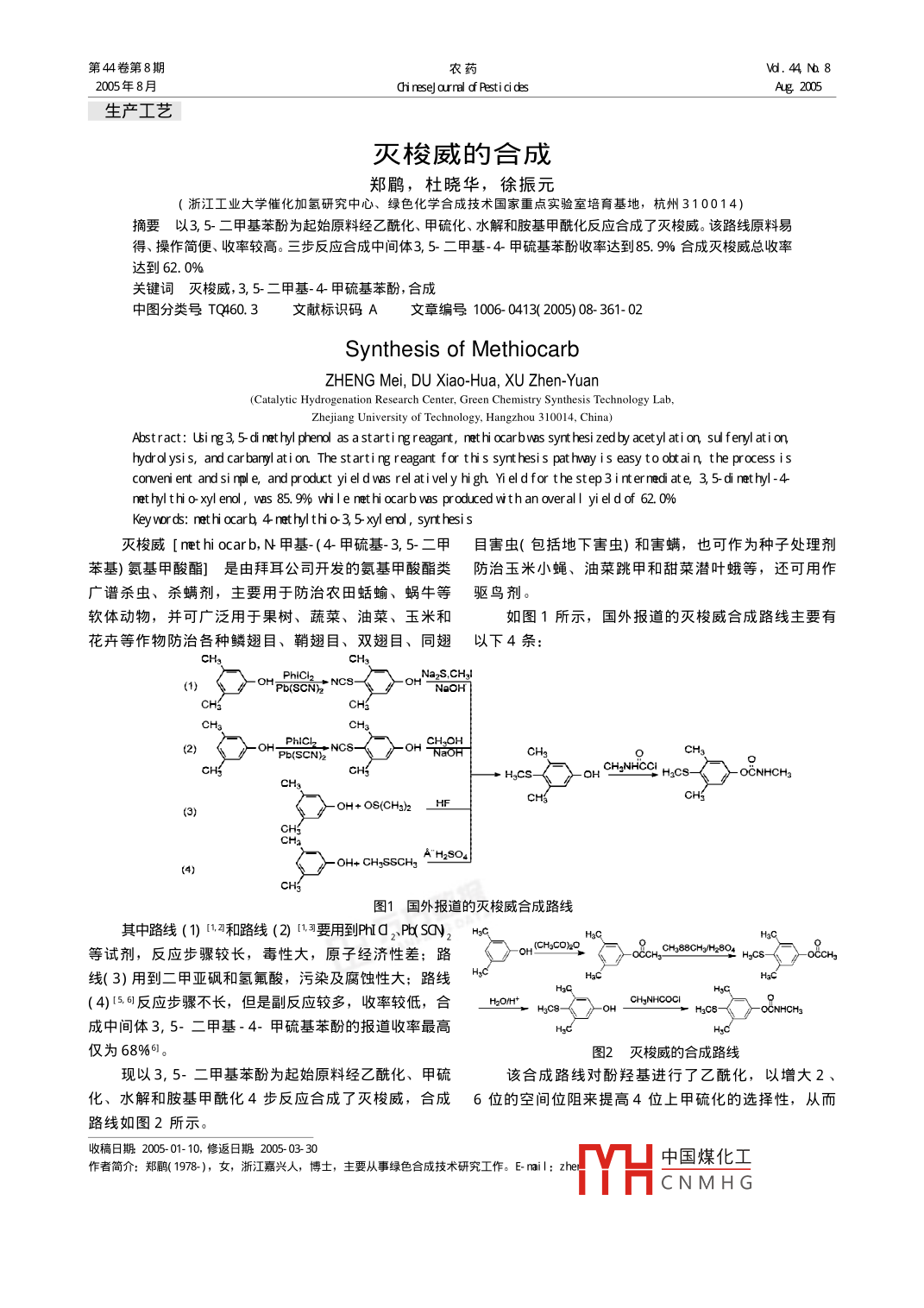 第44卷第8期Vd.44No82005年8月Cinese| orrel df PesticidesAg 2005生產(chǎn)工藝滅梭威的合成鄭鹛,杜曉華,徐振元(浙江工業(yè)大學(xué)催化加氫研究中心、綠色化學(xué)合成技術(shù)國家重點(diǎn)實(shí)驗(yàn)室培育基地,杭州310014)摘要以3, 5-二甲基苯酚為起始原料經(jīng)乙?;?、甲硫化、水解和胺基甲?;磻?yīng)合成了滅梭威。該路線原料易得、操作簡便、收率較高。三步反應(yīng)合成中間體3, 5-二甲基- 4甲硫基苯酚收率達(dá)到85.9%合成滅梭威總收率達(dá)到62. 0%關(guān)鍵詞滅梭威,3, 5-二甲基-4甲硫基苯酚,合成中圖分類號TQ460.3文獻(xiàn)標(biāo)識碼 A文章編號1006- 0413( 2005) 08 361- 02Synthesis of MethiocarbZHENG Mei, DU Xiao-Hua, XU Zhen-Yuan(Catalytic Hydrogenation Research Center, Green Chemistry Synthesis Technology Lab,Zhejiang University of Technology, Hangzhou 310014, China)Abstract: lbsing3, 5- di nethyl phenol as a starti ng reagant, nethi ocarbvas synthesi zedby acetyl ati on, sul feny| ationhydrol ysis, and carbanyl ation The starti ng reagant for this synthesis pathwayis easy toobtain the process isconveni ent andsinpl e, and product yi el dvas rel atively high. Yieldfor the step3internediate, 3, 5-di nethyl -4nethylthi 0 xyI enol, vas 85. 9% whi le nethi ocarb vas produced with an overal | yield of 62. 0%6Keyvords: nethi ocar, 4 nethylthi 0 3, 5 xyI enol, synthesis滅梭威[nethi ocarb, N甲基-(4-甲硫基-3,5-二甲目害蟲( 包括地下害蟲)和害螨,也可作為種子處理劑苯基)氨基甲酸酯]是 由拜耳公司開發(fā)的氨基甲酸酯類防治 玉米小蠅、油菜跳甲和甜菜潛葉蛾等,還可用作廣譜殺蟲、殺螨劑,主要用于防治農(nóng)田蛞蝓、蝸牛等 驅(qū)鳥劑。軟體動物,并可廣泛用于果樹、蔬菜、油菜、玉米和如圖1所示,國外報(bào)道的滅梭威合成路線主要有花卉等作物防治各種鱗翅目、鞘翅目、雙翅目、同翅以下4 條:_ or NazS,CH!! Pb(SCN2NaOHCHCH6PhICI2)Pb(SCN)NCS-- OH NaOHCHg0CH3CHNHicci. H2C8-- 0CNHCH3CHscH6-OH+ OS(CH)2_ HF__3)A"H2S044)cH圖1 國外報(bào)道的滅梭威合成路線其中路線(1) (1.4和路線(2) [1.3要用到PhIG,、Pb(SCN2 Hoc92 HgCS-等試劑,反應(yīng)步驟較長,毒性大,原子經(jīng)濟(jì)性差;路( ) oHChcono線( 3)用到二甲亞砜和氫氟酸,污染及腐蝕性大;路線HslgG(4)[5.61反應(yīng)步驟不長,但是副反應(yīng)較多,收率較低,合HgOHt_ HoCECHsNHCOCIoCNHCHs成中間體3, 5-二甲基-4-甲硫基苯酚的報(bào)道收率最高僅為68%61。圖2 滅梭威的合成路線現(xiàn)以3, 5-二甲基苯酚為起始原料經(jīng)乙?;?、甲硫該合成路線對酚羥基進(jìn)行了乙?;?,以增大2、化、水解和胺基甲?;?步反應(yīng)合成了滅梭威,合成6 位的空間位阻來提高4位上甲硫化的選擇性,從而路線如圖2所示。收稿日期2005- 01- 10,修返日期2005- 03- 30中國煤化工作者簡介:鄭鹛( 1978-),女,浙江嘉興人,博士,主要從事綠色合成技術(shù)研究工作。E-nail: zheMYHCNMH G362農(nóng)藥CineseJarrel df Pasticids第44卷使中間體3, 5-二甲基-4甲硫基苯酚的收率達(dá)到了85. 9%灰白色固體34. 1g。mp.120C~126C(文獻(xiàn)值 121. 5°C [7)。使反應(yīng)的總收率提高到了62.0%。GC含量91.3%收率72. 2%產(chǎn)品經(jīng)TLC (乙酸乙酯/1試驗(yàn)部分石油醚=4/6, v/v)分離得純品。N (ne): 235 (M), 168(MCHNC9, 153 (168- CH), 109(153-CS); HNR(QJ): & 021.1試劑所用試劑均為市售分析純、化學(xué)純或工業(yè)級藥(1H b5), 6 59(2Hs), 276(3H dJ=.4H), 2473H s), 234(6H s)。2結(jié)果與討論品,部分溶劑經(jīng)過干燥和重蒸。1.2儀器.2.1乙?;瘻囟扔?jì)未經(jīng)校正;考慮到酚羥基為鄰對位定位基,對3, 5-二甲基苯酚XT-4雙目顯微熔點(diǎn)測定儀,北京泰克儀器有限直接進(jìn)行甲硫化會生成較多的鄰位產(chǎn)物,從而使中間公司;體3, 5-二甲基-4-甲硫基苯酚的收率較低,也增加了分福力GC- 9070氣相色譜儀,浙江溫嶺福力分析儀離的難度。 因而首先對酚羥基作了乙?;Wo(hù),增加了乙?;徫坏目臻g位阻,提高了在4-位上甲硫化的器有限公司;Bruker AC- 400核磁共振儀,內(nèi)標(biāo)為TMS;選擇性,大大提高了3, 5-二甲基-4-甲硫基苯酚的收率。Vari an Saturn 2000質(zhì)譜儀, 70eV。2.2甲硫化1.3試驗(yàn)方法在乙酸(3, 5-二甲基-4-甲硫基苯酚)酯的合成反應(yīng)中,采用的是無機(jī)酸做催化劑,促進(jìn)二甲二硫在苯酚1.3. 1乙酸(3, 5-二甲基苯酚)酯于100nh三口燒瓶中加入3, 5-二甲基苯酚(24. 4g, .環(huán)上發(fā)生親電取代反應(yīng)。同時(shí)考慮到,取代反應(yīng)后,苯0.2mol)和乙酸酐(30. 6g, 0. 3nol ),攪拌溶解,升溫至環(huán)上便有了兩個(gè)致活基團(tuán)(-OCOCH、 .SCH) ,如果酸度.110C反應(yīng)4h,GC檢測反應(yīng)完全,減壓蒸餾回收副產(chǎn)過高,必然會導(dǎo)致二元取代物的增加,因此,控制投物乙酸和過量的乙酸酐,得橙黃色液體32. 6g,GC含料比例為酚:二甲二硫:濃硫酸=1 :1 :1 (摩爾比)。甲硫化反應(yīng)的文獻(xiàn)報(bào)道中,反應(yīng)都是在回流溫量99.3%收率98.7%度(155C~160C)下進(jìn)行的, 高溫使副反應(yīng)增加,導(dǎo)1.3.2乙酸(3, 5-二甲基4-甲硫基苯酚)酯致收率下降。我們采取較為溫和的反應(yīng)條件,即在室于100mh三口燒瓶中加入乙酸(3, 5-二甲基苯酚)酯溫下反應(yīng),適當(dāng)延長反應(yīng)時(shí)間,得到了很好的收率。(26. 0g, 0.16nol) 和二甲基_硫(15.0g, 0. 16nol ),室溫?cái)?結(jié)論.拌,于1h內(nèi)滴加98%濃硫酸(16g, 0. 16nol),加完后繼以3, 5-二甲基苯酚為起始原料經(jīng)乙?;?、甲硫化、續(xù)于室溫下攪拌10h,然后倒入300m冰水中,用乙水解和胺基