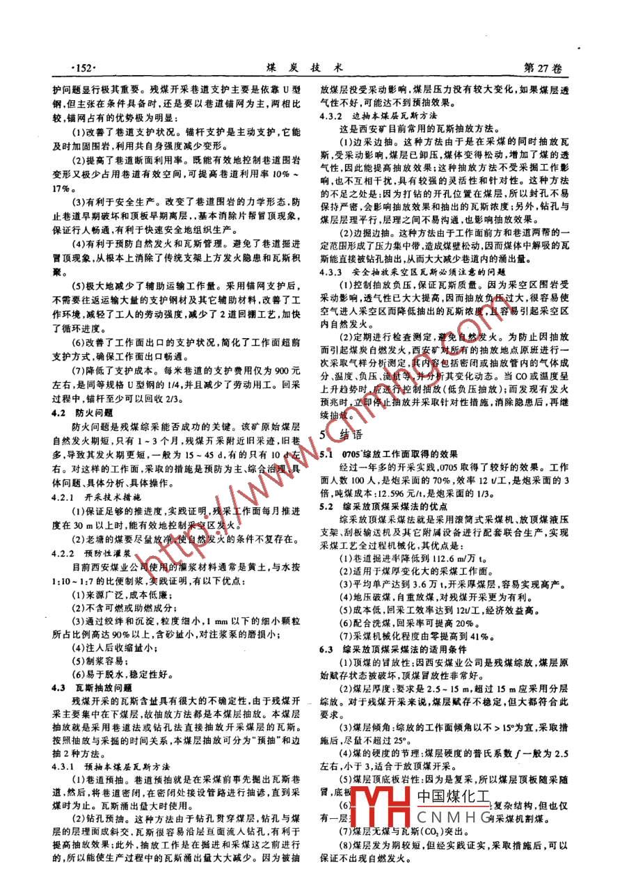 第27卷第12期煤炭技術(shù)Vol.27,No.122008年12月Coal TechnologyDee,2008殘煤采區(qū)綜采放頂煤技術(shù)孫和平(遼寧礦業(yè)集團(tuán)駐西安煤業(yè)公司,西安710000)摘要:通過對(duì)西安煤業(yè)公司殘煤綜采放頂煤的實(shí)踐研究,分析了殘煤綜采放頂煤的相關(guān)問題,提出了解決方案,研究總結(jié)了殘煤綜采放頂煤的優(yōu)缺點(diǎn)和適用條件。關(guān)鍵詞:我存煤量;綜采放頂煤;適用條件中團(tuán)分類號(hào):TD823文獻(xiàn)標(biāo)識(shí)碼:A文章編號(hào):1008 - 8725(2008)12 - 0150- 02Remnant Coal Working Area Synthesis Picks Puts Goes AgainstCoal Technology ResearchSUN He - ping(Liaoning Mining Group Encamp Xi' an Coeal Industry Company, Xi' an 710000, China)Abstract: Through picks to the Xi' an coal industry company remnant coal synthesis puts goes against the coalthe practice research, analyzed the remnant coal synthesis to pick puts goes against the coel the related ques-tion, proposed the solution, the research summarized the remnant coal synthesis to pick puts goes against thecoal the good and bad points and is suitable the condition.Key words: surviving coal amount The synthesis picks puts goes against the coal Is suitable the condition定生產(chǎn)能力為247萬t。0前言西安煤業(yè)公司于1950年11月22日破土動(dòng)工,1955年121綜合機(jī)械化放頂煤的應(yīng)用月1日移交生產(chǎn),該礦井設(shè)計(jì)能力90萬Va,原始地質(zhì)儲(chǔ)量酉安煤業(yè)公司自建成投產(chǎn)以來,相繼采用的采煤方法為9 618.6萬1,實(shí)際地質(zhì)儲(chǔ)量7045.2萬t,可采儲(chǔ)量?jī)H為5283.9走向長(zhǎng)壁 傾斜分層下行全部陷落法、走向長(zhǎng)壁傾斜分層上行萬水砂充填法、金屬網(wǎng)假頂采煤法和單- -長(zhǎng)壁放頂煤法。從1998年開始,西安煤業(yè)公司全面進(jìn)入了殘煤查找開為了穩(wěn)定煤炭產(chǎn)量,實(shí)現(xiàn)安全生產(chǎn),2006年,西安煤業(yè)公采階段。2002 ~ 2004年,共查找殘存煤量961萬1,使全礦的司積極改革采煤方法 ,準(zhǔn)備采用綜放法開采殘煤。共有24煤炭產(chǎn)量一直穩(wěn)定在170萬t以上。目前,該礦查找殘煤的個(gè)塊段比較合適,儲(chǔ)量281萬1,占全礦現(xiàn)有儲(chǔ)量的近1/3。工作仍在繼續(xù),力爭(zhēng)再服務(wù)10年,全公司剩余表內(nèi)地質(zhì)儲(chǔ)量確定殘煤綜采的首采區(qū)為一區(qū)的07采。該區(qū)位于礦井142.8萬1,重新查找的殘煤儲(chǔ)盤916.3萬1,殘采比重已上升第二生產(chǎn)水平,屬下煤區(qū)間殘 留煤柱,首采工作面0705走向.到85%以上。到2006年末,共采出煤炭6328萬t,2007 年核長(zhǎng)550 m,傾斜寬48 m,工作面傾角6- 13%。開采地質(zhì)條件復(fù)附近的炭質(zhì)泥巖極其松軟破碎,遇水就崩解成砂礫狀,加上上改變其性狀提高其自承能力。.地壓較大,支護(hù)起來非常困難.給井巷的支護(hù)與維護(hù)造成的3.3 錨索長(zhǎng)度的選擇成本增加將是沉重的,給將來的生產(chǎn)造成的影響將是深遠(yuǎn).在施工中,開始選用9.3 m錨索,雖然沒有阻止住硐室的,是出乎預(yù)料的。的變形,但錨索附近是沒有變形或變形量很小的。后來,為3.2 注漿時(shí)機(jī)握好了將錨索生根在更牢固的巖層中,把錨索長(zhǎng)度改到了12.5 .劉莊礦西進(jìn)風(fēng)井在井簡(jiǎn)施工之前,也進(jìn)行了地面預(yù)注m,將其生根在上部2m厚的一層砂巖中,結(jié)果錨索眼滴水,漿,而且針對(duì)馬頭門上下的破碎地層,也提高了注漿漿液的錨索繃斷 ,硐室嚴(yán)重變形。分析原因,是鋪索深入砂巖之后,水泥用量與注漿壓力,目的在于固結(jié)園巖、加固地層。但等引出 了砂巖中的水,煤與炭質(zhì)泥巖遇水崩解完全喪失自承能到馬頭門與井底車場(chǎng)施工之后.發(fā)現(xiàn)地面頂注漿對(duì)煤層與泥.力,加上它們的吸水能力很大,嚴(yán)重加大了自身重量,使支撐巖地層的加固作用甚微。雖然漿液也擴(kuò)散了近30m遠(yuǎn),但力 喪失、荷重加大,導(dǎo)致錨索繃斷,硐室嚴(yán)重變形。只是沿著有限的一些劈裂裂隙擴(kuò)散,僅對(duì)地層產(chǎn)生了一些壓4結(jié)語實(shí)作用,而沒有滲透人軟弱地層,沒有根本上改變其性狀。而在掘砌過程中地注漿,是在地層原始應(yīng)力得到釋放,巷道綜上所述,爾室所處層位的選擇,對(duì)爾室的支護(hù)成本與.出現(xiàn)較大變形、煤層與炭質(zhì)泥巖出現(xiàn)崩解之后進(jìn)行的,這時(shí)施 工難度以及使用成本影響很大:支護(hù)方式與支護(hù)強(qiáng)度要在煤層與炭質(zhì)泥巖層中產(chǎn)生了許多相互貫通的大小裂隙,這時(shí)分析圍中國(guó)煤化工地層,要掌握好注漿注漿漿液能夠很均勻的擴(kuò)散到煤層與炭質(zhì)泥巖層中,從根本時(shí)機(jī),YHCNMHG!、變形之后進(jìn)行。.收稿日期:2008 - 07021;修訂日期:2008-09 -27作者簡(jiǎn)介:孫和平(1962-),男,吉林遼源人,工程師,1983年畢業(yè)于阜新礦院,現(xiàn)任遼源礦業(yè)集團(tuán)駐西安煤業(yè)公司安全監(jiān)察處處長(zhǎng)。第12期孫和平:殘煤采區(qū)綜采放頂煤技術(shù)●151.雜,工作面局部過舊采跡,煤層瓦斯絕對(duì)涌出量為0.85 m21(8)工作面支架如較長(zhǎng)時(shí)間不需要操作作液時(shí),應(yīng)通過min,煤塵易爆炸,發(fā)火期為0.5-1.5個(gè)月。聯(lián)系使乳化液泵站停止運(yùn)行。1.1 工作面設(shè) 備選型及配套(9)當(dāng)?shù)装宄霈F(xiàn)臺(tái)階,支架必須采取措施,使臺(tái)階的坡度(1)采煤機(jī)MC