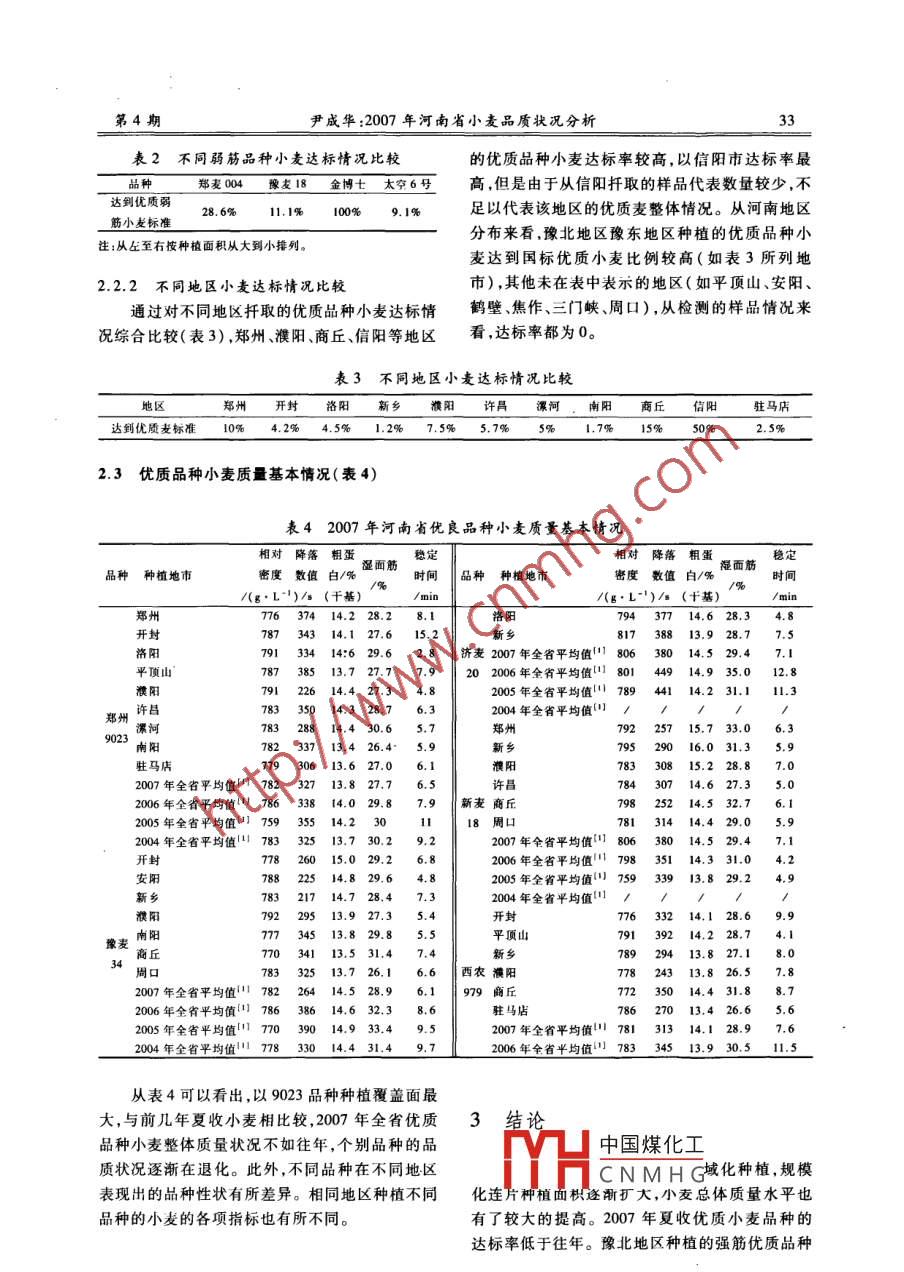 .第29卷第4期河南工業(yè)大學(xué)學(xué)報(自然科學(xué)版)Vol. 29 ,No.42008年8月Journal of Henan University of Technology ( Natural Science Edition )Aug.2008文章編號:1673-2383( 2008 )04-0032- 032007年河南省小麥品質(zhì)狀況分析尹成華(河南省糧油飼料產(chǎn)品質(zhì)量監(jiān)督檢驗站,河南鄭州450008 )摘要:共扦取55個優(yōu)質(zhì)品種小麥樣品559份,檢測數(shù)據(jù)9443個,涉及全省17個省轄市,92個.市(縣)。根據(jù)國家標準強筋小麥品質(zhì)指標判定,所檢優(yōu)良品種小麥符合國家優(yōu)質(zhì)二等以上的.占整體優(yōu)質(zhì)小麥品種的3.8%;根據(jù)國家標準弱筋小麥品質(zhì)指標判定,所檢優(yōu)良品種小麥符合優(yōu)質(zhì)弱筋小麥占整體優(yōu)質(zhì)小麥品種的1%。關(guān)鍵詞:小麥;品質(zhì);檢測中圖分類號:TS210.7文獻標識碼:B優(yōu)質(zhì)品種小麥559份,檢測數(shù)據(jù)9443個。其中,1河南小麥生產(chǎn)現(xiàn)狀主要優(yōu)質(zhì)小麥品種鄭麥9023共131份,占抽樣總.數(shù)的23.4%;西農(nóng)979共73份,占抽樣總數(shù)的河南省是全國小麥主產(chǎn)區(qū),產(chǎn)量位于全國第13. 1%;豫麥34共64份,占抽樣總數(shù)的11.4% ;2007年河南省小麥夏收總面積505.9萬新麥18共42份,占抽樣總數(shù)的7.5% ;濟麥20共hm2 ,與去年510.6萬hm2相比,減少4.7萬hm',13份,占抽樣總數(shù)的2.3%。減幅0.93% ;總產(chǎn)量294.3億kg,與去年的284. 62.2測試樣 品達標情況億kg相比,增加9.7億kg,增幅3.4% ;平均單產(chǎn)根據(jù)國家優(yōu)質(zhì)小麥標準規(guī)定的品質(zhì)指標判.5 817 kg/hm2 ,與去年的5 574 kg/hm2相比,增加定,達到國標“優(yōu)質(zhì)強筋二等”以上的小麥樣品有243 kg/hm2 ,增幅4.4%。全省優(yōu)質(zhì)專用小麥集中21份,占全部測報樣品的3.8% ;達到國標“優(yōu)質(zhì)連片、規(guī)模化種植面積326.7萬hm2 ,占夏收總面弱筋”的小麥樣品有6份,占全部測報樣品的積的64.6%。相比2006年種植優(yōu)質(zhì)品種小麥面積1.0%;其余532份小麥樣品均達不到國家優(yōu)質(zhì)小213.2萬hm2 ,增加113.5萬hm2 ,增幅達53. 2%。麥標準。河南省優(yōu)質(zhì)品種小麥推廣種植面積較大,品2.2.1不同品種小麥達 標情況比較種繁多。全省種植面積在6.7萬hm2以上的優(yōu)質(zhì)通過對2007年河南種植面積較大的幾個優(yōu)品種依次是:鄭麥9023種植面積81.7萬hm';新質(zhì)強筋品種小麥的達標情況比較可以看出(表麥18種植面積53.3萬hm2;豫麥34種植面積1):鄭麥9023、新麥18、豫麥34、濟麥20及西農(nóng)8.2萬hm2 ;濟麥20種植面積8.4萬hm2 ;西農(nóng)979等5個品種的綜合達標比例較高。弱筋品種979種植面積8.4萬hm2。太空6號、鄭麥004、小麥的達標情況如表2所示,只有鄭麥004、豫麥矮抗58等品種種植面積與去年相比增幅較大。18、金博七、太空6號4個品種有個別樣品能夠達到優(yōu)質(zhì)弱筋小麥標準,雖然其種植面積較小,樣品2測試樣品分布與達標情況的所扦取的樣品代表性不夠,但是相比去年無一個樣品能達到優(yōu)質(zhì)弱筋小麥標準相比,達標率有2.1測試樣品分布情況較大提高。本次扦樣涉及到55個品種,樣品覆蓋全省中國煤化王情況比較17個市,92個縣,扦樣覆蓋率達65%以上。扦取品HCNMHG農(nóng)979豫發(fā)34達到優(yōu)質(zhì)強收稿日期:2008-04-133.4% 7.1% 7.1% 12.2% 1. 6%作者簡介:尹成華(1963-),男,河南鄭州人.高級工程師.研兗方筋小發(fā)標準向為糧食產(chǎn)品加工.注:從左至右按種植面職從大到小排列.第4期尹成華:2007年河南省小麥品質(zhì)狀況分析33表2不同弱筋品種小麥達標情況比較的優(yōu)質(zhì)品種小麥達標率較高,以信陽市達標率最品種鄭麥004豫友18金博七太空6號高,但是由于從信陽扦取的樣品代表數(shù)量較少,不達到優(yōu)質(zhì)弱28. 6%11.1%100% 9. 1%足以代表該地區(qū)的優(yōu)質(zhì)麥整體情況。從河南地區(qū)筋小友標準分布來看,豫北地區(qū)豫東地區(qū)種植的優(yōu)質(zhì)品種小注:從左至右按種植面積從大到小排列。麥達到國標優(yōu)質(zhì)小麥比例較高(如表3所列地2.2.2不 同地區(qū)小麥達標情況比較市) ,其他未在表中表示的地區(qū)(如平頂山、安陽、通過對不同地區(qū)扦取的優(yōu)質(zhì)品種小麥達標情鶴壁、焦作、三門峽、周口),從檢測的樣品情況來況綜合比較(表3) ,鄭州、濮陽、商丘、信陽等地區(qū)看,達標率都為0。表3不同地區(qū)小麥達 標情況比較地區(qū)鄭州開封洛陽新鄉(xiāng)濮陽許昌漯河南陽 商丘信陽駐馬店達到優(yōu)質(zhì)麥標準10%4.2% 4.5% 1.2%7.5% 5. 7% 5%1.7% 15%50%2. 5%2.3優(yōu)質(zhì)品種小麥質(zhì)量基本情況(表 4)表4 2007年河南省優(yōu)良品種小麥質(zhì)量基本情況相對降落粗蛋濕面筋穩(wěn)定品種 種植地市密度數(shù)值白/%時間品種種植地市度數(shù)值白/%時間/%%/(g.L-1)/s (干基)/min鄭州776 374 14.2 28. 28.1洛陽794377 14.6 28.3 4.8開封787 343 14.1 27.6 15. 2新鄉(xiāng)1738813.928.77.s791334 14:6 29.6 2.8 | 濟麥2007 年全省平均值'" 806 380 14.5 29.4 7.1平頂山38513.7 27.77.20 2006 年全省平均值["1 801 449 14.9 35.0 12.8791 226 14.4 27.3 4.82005年全省平均值" 789 441 14.2 31.1 11.3783 350 14.3 28.7 6.32004年全省平均值[0] 19023漯河783288 14.4 30.6 s.792 257 15.7 33.0 6.3南陽82 337 13.4 26.4s.95 216.0 31.3.9779 306 13.6 27.0 6. 183 308 15.2 28.87.02007年全省平均值[" 782 327 13.8 27.7 6.5許昌784 307 14.6 27.3.02006年全省平均值"1 786 338 14.0 29.新麥商斤798 252 14.5 32.7.12005年全省平
