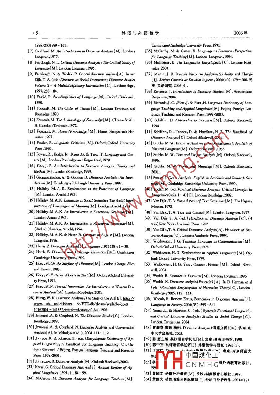 2006年第10期外語與外語教學2006, No10總第211期Foreign Languages and Their TeachingSeria No 211語篇分析與話語分析黃國文1徐珺2(1.中山大學外國語學院,廣東廣州510275;2.大連外國語學院,遼寧大連 116002)摘要:從文獻上看,學 者們對text discourse和disourse analysis或?qū)Α罢Z篇分析”和“話語分析”的使用沒有一致的看法,這是因為大家對這些術語的內(nèi)涵和外延沒有一致或比較一致的觀點。本文對“語篇分析”和“話語分析”進行簡單的回顧,對進行“語篇分析”“話語分析”研究的幾種學派進行梳理,澄清一些概念。此外,本文還就dscoure analysis的漢語譯文提出建議。關鍵詞:語篇;話語;語篇分析/話語分析Astrat:Athough dsourse alysis is udrtaken by sholars in a nunmber of dsiplie, there is no gnerl agement on cncepts such as“text" ,disoure" and' disourse analysis" .This paper aims to carity a mumber of points conceming dscoure analysis and then to suggest Chinesetranslatios for terms such as‘discourse" and' discoure analysis" .Key Words:text; doscourse; discourse analysis中圖分類號:H0文獻標識碼:A 文章編號:1004 - 6038(2006)10-0001 -06coure analysis 分為3種:(1)英美學派( the BishAmerican scool),1.引言(2)以法國哲學家???Michel Focaut)的理論為基礎的學派,(3)批從文獻上看,無論是國外還是國內(nèi),學者們對t,disoure和評話語學派(即citical dsourse alys)。雖然Cook的分類存在需isouse alysis的概念使用沒有-致的看法,這是因為大家對這些要改進的地方,但對于一般讀者來說很有裨益,因此本文接受Cook術語的內(nèi)涵和外延沒有-致或比較- -致的觀點。因此,有些學者在的分類。(有關這些不同學派所做的dscourse alys, 可另參見使用這些術語時做了界定,有些則不做區(qū)分、互換使用。在中國的英Shiffrin et a,2001:1 - 10;Jaworski & Coupland, 199:19 44;Jawors語界,‘語篇分析”和“話語分析’這兩個術語都是譯自英語的"“iki & Coulad,004:114- 19;Manm]jere2004)course alys's ,但它們之間的區(qū)別- -直沒有引起學界足夠的重視。(1)英美學派本文主要討論下面幾個問題:(1)簡單區(qū)分3種不同的dsourse最早研究disourse analysis 的英美學派,可追溯到上世紀30年analyis, (2)介紹語言學派所做的diocourse alys,(3)討論dicoure代倫敦學派奠基人J.R. Firth探討語境中言語意義的研究。這一研analysis 的漢譯問題,(4)建議把dsouses alysis分別譯為“語篇分兗領域的術語discourse analysis 是Hrris(1952)首先提出來的。雖然析”和“話語分析”。在建議漢譯名之前,為了便于討論,我們在行文世界各地都有從事dsoure alyis研究的學者,但由于這-研究傳中使用英語來表述兩個關鍵的術(isouse和dsoure alyis。統(tǒng)是從英國和美國開始的,所以這-學派稱被為“英美學派”。關于英美學派iscouse analysis 方面的論著很多,如Hris(1952)、van D:-2.三種discourse analysisi<(1972, 197)、Hilili (1973, 1985, 1994)、 Hlliday & Hssn根據(jù)Jawoski與Coupland (999:1 - 44)和Shifin等人(97)Widoosu(9717).0uat(l1977)Beugrande & Dresler(Schifin et a,2001:1 - 10)的觀察和分析, dsourse analysis 是個發(fā)(1981)、Browmn & Yule (1983)、Hoey ( 1983, 191, 2001)、Subbs展很快的領域。目前這方面的研究涉及到很多不同的學科,包括探討理解語篇、話語模式和分析語篇、話語方法的語言學、人類學和哲2003)、 Hach (992)、Renkena (1993, 20) McCarthy & Carter學,同時也包括把理解語篇話語模式和分析語算、話語方法應用于(1994)、Scifin (1994)、Gogakopoulou & Goutses (1997)、Gee研究之中的傳播學、認知心理學、社會心理學、人工智能。很多其他(999)和Jonstoe(2002)0學科的學者(如文學批評家批評理論家、地理學家、政治學家、社會國內(nèi)出版的dscourse anlysis方面的著作(如黃國文, 188、胡壯學家心理學家)對dsouse alysis也感興趣并且做了大量研究。麟1994、王得杏,1998、劉辰誕,199.于言,億2000、李悅娥范宏雅,正因為dioure analysis 涉及和被應用到很多學科,所以dis.2002衛(wèi)真道,2002、曹春春宋瑋楊彬,003)基本上都是屬于這里所course 和dsourse analysis這些術語對不同學科的學者來說有著不同說的英美學派研究。這個學派主要活躍在應用語言學和語言教學領的意義。他們使用同一個術語,但所指的內(nèi)容常常并不是一樣的。域,理論基礎和根據(jù)主要 是廣義的功能語言學(包括系統(tǒng)功能語言根據(jù)Guy Cook(見Jobnson & Jonson, 198/2001:99- 102)的學 、社會酒言學酒用學竺等)觀點,可以根據(jù)不同的目標研究方法、理論來源、研究重點等把dis-中國煤化工、eson)與連貫(Coher.TYHCNMHG作者簡介:黃國文(1956- ),教授,博土,博士生導師研究方向:功能語言學,語篇分析,應用語言學,翻譯研究;徐珺(1964-),教授,博士,研究方向:對比語盲學,翻譯學,語篇分析收稿日期:2006- 06-06第10期黃國文徐珺語篇分析與話語分析●2●ence)、語篇話語結構(Texu/Discoure srucure)、信息結構(Inor-產(chǎn)生了權利和權勢,以及社會中權利權勢支配和不平等的結構和關mation snucture)、語篇/話語類型(exul/Discoure type)篇章語法系是怎樣被合法化和合理化的。在這些學者看來,語篇話語建枸社(Text ganmar)、圖式理論(Schema theory)、體裁理論(Genre theo-會結構和社會實踐,也被社會和社會實踐所建構。批評話語學派認y小會話分析(Coverstion alys)、言語行為理論(Speech act theo為,語言的慣用(usge)和使用(use)都攜帶著意識形態(tài)因素,因此語ry)、互動社會語言學(ntractional soininisis)、交際文化學(The言本身就是社會實踐。這個學派所做的分析