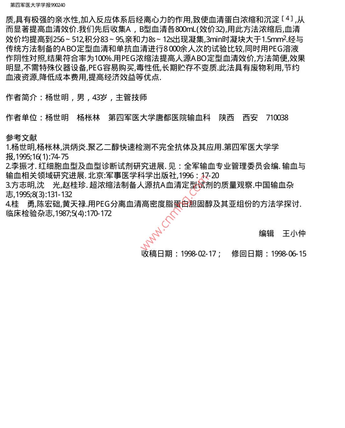 第四軍醫(yī)大學(xué)學(xué)報(bào)990240第四軍醫(yī)大學(xué)學(xué)報(bào)資源系統(tǒng) JOURNAL OF THE FOURTH數(shù)字化期刊 WANFANG DATA (CHINAINFO) MILITARY MEDICAL UNIV ERSITY DIGITIZED PERIODICAL1999年第20卷第2期Vol.20No.21999聚乙二醇對人源ABO定型血清效價(jià)的影響楊世明楊棖林關(guān)鍵詞:聚乙稀二醇類;定型血清ABO血型系統(tǒng);效價(jià)中圖號:R457.11文獻(xiàn)標(biāo)識碼:B0引言實(shí)驗(yàn)觀察與應(yīng)用表明聚乙二醇(PEG)能增強(qiáng)酶法配血和間接抗人球蛋白試驗(yàn)的敏感性,縮短了配血試驗(yàn)和不完全抗體的檢測時(shí)間[1.為了解PEG能否提高人源ABO定型血清的效價(jià),我們用PEG濃縮人源ABO定型血清對PEG不同分子量、不同濃度、不同濃縮時(shí)間和溫度對血清效價(jià)的影響以及濃縮后不同層次的血清效價(jià)進(jìn)行了實(shí)驗(yàn)比較和應(yīng)用1材料和方法1.1試劑與器材PEG試劑,日本進(jìn)口天津天秦精細(xì)化學(xué)品有限公司分裝批號930109.pH7.0磷酸鹽緩沖液(PBS),9g/L生理鹽水單抗血清扭力天平離心沉淀器低溫離心機(jī)水浴箱玻璃試管和瓶子等1.2實(shí)驗(yàn)與應(yīng)用方法收集獻(xiàn)血員化驗(yàn)檢查肝功合格的標(biāo)本血清置4℃冰箱48h吸收冷凝集素離心分離血清置56℃水浴箱30min活用50m/新鮮紅細(xì)胞懸液測定原血清基礎(chǔ)效價(jià).上述血清加入等量PEG溶液,混勻放15min~60min,3000r/min離心10min~30min棄去上清液沉淀物按100g/L加入生理鹽水稀釋再測定濃縮后的血清效價(jià)、親和力和特異性,合格后置-20℃冰箱保存;將因故不輸?shù)难菏占蜏仉x心30min,分離血清置56℃水浴1h以3000r/min離心30min,分離上層血清測定其效價(jià)、親和力和特異性后按上述方法濃縮.1.3結(jié)果判定測定PEG濃縮前、后血清效價(jià)、親和力和特異性所有試驗(yàn)重復(fù)3次測定10份標(biāo)本濃縮后血清效價(jià)均增高2個(gè)滴度和積分均增加13以上判為效價(jià)提高.2結(jié)果2.1不同PEG分子量對血清效價(jià)的影響將種不同分子量的PEG粉劑均按200mL/濃度配制加入等量血清攪拌濃縮分離血清測定效價(jià)結(jié)果顯示PEG6千提高血清效價(jià)的效果非常明顯,PG-1萬和PEG-2萬效果較差(表1)2.2Peg濃度對血清效價(jià)的影響用PBS將PEG-6千粉劑分別配成200g/,150g/L和100g/L的濃度,用不同濃度的PEG溶液濃縮抗A血清結(jié)果表明150mL/L的PEG濃度提高血清效價(jià)的效果最好(表2)第四軍醫(yī)大學(xué)學(xué)報(bào)990240表1不同PEG分子量濃縮前/后效價(jià)的比較PEG分子量效價(jià)積分親和力/s2萬32/3237/37>30/>301萬32/3237/37>30/>300.6萬32/12837/85>30/<15表2不同PEG濃度濃縮前/后效價(jià)的比較PEG濃度/ml'L-1效價(jià)積分親和力/s20032/6437/59>30/>2015032/51237/95>30/<1010032/3237/47>30/>252.3不同層次血清效價(jià)的比較將150溶液與血清等量混勻30min后,3000r/min離心30min,測定不同層次的血清效價(jià)結(jié)果沉淀物效價(jià)為512積分95親和力<10明顯高于1/2和下1/3層的血清效價(jià)(表3).表3PEG濃縮后不同層次血清效價(jià)的比較血清層次效價(jià)積分親和力/s1/24813>30下1/323>25沉淀物51295<102.4濃縮時(shí)間對血清效價(jià)的影響將PE溶液與血清混勻分別濃縮15min,30min和60min,結(jié)果15min,30min效價(jià)均為256積分83,60min效價(jià)為512積分95.2.5不同濃縮溫度對血清效價(jià)的影響將PEG溶液與血清混勻后分別置4C,22℃和37℃濃縮,結(jié)果4C效價(jià)512積分95,22C效價(jià)256積分83,37效價(jià)128積分71.2.6血清抗體特異性測定將濃縮后的定型血清分別與A型、B型、O型和AB型各10名獻(xiàn)血員紅細(xì)胞作凝集試驗(yàn)證實(shí)特異性合格.3討論高質(zhì)量的ABO定型血清是正確鑒定血型確保輸血安全的前提近年來發(fā)達(dá)國家已有用單抗血清取代人源ABO定型血清的趨勢但國內(nèi)該工作起步較晚且單抗血清還存在著因其特異性強(qiáng)而只能判別一個(gè)抗原決定族可能會(huì)使一些A、B亞型漏檢因其濃度高就有大得多的機(jī)會(huì)與另一些非特異性分子發(fā)生假陽性反應(yīng)[2]以及單抗血清本身也易被細(xì)菌污染而造成血型誤定等缺點(diǎn)[31,目前還不能完全取代人源ABO定型血清因此對人源ABO尤其是稀有定型血清進(jìn)行最適制備、保存和提高其效價(jià)的方法學(xué)研究仍有重要意義.我們研究結(jié)果發(fā)現(xiàn)PEG-6千及其150g/L濃度提高血清效價(jià)的效果最明顯PEG提高人源ABO定型血清效價(jià)可能與血清抗體是免疫球蛋白PEG是線形大分子物第四軍醫(yī)大學(xué)學(xué)報(bào)990240質(zhì),具有極強(qiáng)的親水性加入反應(yīng)體系后經(jīng)離心力的作用致使血清蛋白濃縮和沉淀[4],從而顯著提高血清效價(jià).我們先后收集A,B型血清各800mL(效價(jià)32)用此方法濃縮后血清效價(jià)均提高到256~512積分83~95親和力s~12s出現(xiàn)凝集,3min時(shí)凝塊大于1.5mm2經(jīng)與傳統(tǒng)方法制備的ABO定型血清和單抗血清進(jìn)行8000余人次的試驗(yàn)比較同時(shí)用PEG溶液作陰性對照結(jié)果符合率為100%用PEG濃縮法提高人源ABO定型血清效價(jià)方法簡便效果明顯,不需特殊儀器設(shè)備PEG容易購買毒性低長期貯存不變質(zhì)此法具有廢物利用節(jié)約血液資源降低成本費(fèi)用提高經(jīng)濟(jì)效益等優(yōu)點(diǎn).作者簡介:楊世明,男,43歲,主管技師作者單位:楊世明楊棖林第四軍醫(y