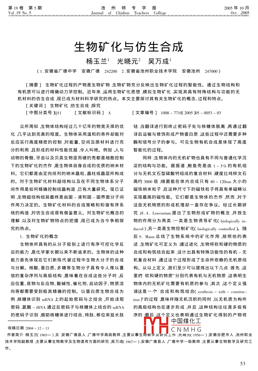 第19卷第5期也州師專學(xué)抵2005年10月Vol.19 No.5Journal_ of Chizhou_ Teachers_ CollegeOct. 2005生物礦化與仿生合成楊玉蘭'光曉元2 吳萬 成'(1.安徽省廣德中學(xué)安徽廣德242200 2.安徽省池州職業(yè)技術(shù)學(xué)院 安徽池州247000 )[摘要]生物礦化過程的產(chǎn)物是生物礦物生物礦物充分反映出生物礦化過程的智能性。通過生物結(jié)構(gòu)和有機(jī)質(zhì)可以進(jìn)行精確動力學(xué)控制。近年來運(yùn)用生物礦化思想模擬生物礦化實(shí)現(xiàn)其具有特殊結(jié)構(gòu)與功能的無機(jī)材料的仿生合成現(xiàn)已成為材料科學(xué)研究的熱點(diǎn)。本文主要探討其有關(guān)生物礦化的概念、過程和特點(diǎn)。[關(guān)鍵詞]生物礦化;仿生合成探究[中圖分類號]Q11[文獻(xiàn)標(biāo)識碼]A[文章編號] 1008 - 7710( 2005 )05 - 0053- 03眾所周知生物體結(jié)構(gòu)經(jīng)過幾十億年的物競天擇的優(yōu)鏈當(dāng)翻譯進(jìn)行到終止密碼子處與核糖體脫離再通過翻.化幾乎達(dá)到完美的程度。生物體采用溫和的條件卻能對譯后運(yùn)輸與修飾形成產(chǎn)物蛋白質(zhì)這些過程中還需要多種反應(yīng)實(shí)行高度精密的控制,對能量、空間及原材料進(jìn)行充酶和信號分子的參與??梢娚镉袡C(jī)合成是體現(xiàn)了高度分的利用,且形成的材料性能優(yōu)越令人叫絕。例如人與智能化的過程。動物的骨骼、牙齒以及貝類生物堅(jiān)而硬的殼都是細(xì)胞控制同樣生物體內(nèi)的無機(jī)礦物也具有不同與普通化學(xué)沉下的生物礦化的杰作是生物體自身合成的優(yōu)質(zhì)的納米材淀的結(jié)構(gòu)與功能。據(jù)報(bào)道鮑魚殼是由1- 5%的有機(jī)組料。它們都是由定向排列的納米晶粒、晶柱或晶層所構(gòu)成.分與無機(jī)文石型碳酸鈣組成的復(fù)合材料硬度比純粹文石的。對于生物礦化材料超結(jié)構(gòu)以及在不同生物體系分子高約3000倍;細(xì)菌能在體內(nèi)合成只有40-120nm大小的間作用是如何精確控制結(jié)晶構(gòu)造,已有大量研究?,F(xiàn)已證磁鐵納米粒子在這種尺寸下的磁鐵粒子將具有單磁疇以明生物超結(jié)構(gòu)組裝最終是由固-液和固-固界面分子間實(shí)現(xiàn)最高的磁性能。它們都是生物體的杰作然而,對于作用力決定的。生物礦化材料的合成策略和和諧有序系這些無機(jī)物質(zhì)的形成機(jī)理卻一直存在爭議。經(jīng)過長期研統(tǒng)的構(gòu)造對仿生合成很有借鑒意義。對生物礦化概念的究H.A.Lowenstam提出了生物形成礦物的概念并按生理解,以及對生物礦物特點(diǎn)的把握現(xiàn)已成為當(dāng)今爭相探物的作用分為兩類:-類是生物誘導(dǎo)礦化( biolgically in-究的熱點(diǎn)。duced)另-類是生物控制礦化( biologically controlled)。 隨1.生物礦化的概念后s. Mann總結(jié)了生物系統(tǒng)中的礦化作用,按照他的表生物體所具有的從分子級別上進(jìn)行有序可控化學(xué)反述生物礦化可定義為通過進(jìn)化生物將軟和硬的物質(zhì)的應(yīng)的能力是化學(xué)家長期以來不斷追求的。生物體的這種合成和構(gòu)筑結(jié)合起來,設(shè)計(jì)出具有特殊功能性的有機(jī)-無能力首先體現(xiàn)在它們新陳代謝過程中生物大分子的合成機(jī)復(fù)合材料通過這個過程形成了生命所依賴的無機(jī)質(zhì)結(jié).與分解。核酸、蛋白質(zhì)、多糖等生物分子具有令人難以置.構(gòu)。從以上定義我們至少可以提煉出以下幾點(diǎn):首先這信的復(fù)雜序列與高級結(jié)構(gòu)意味著在合成這些分子時,反里的軟和硬的物質(zhì)”分別代表有機(jī)與無機(jī)物質(zhì)這表明生.應(yīng)位置、底物與反應(yīng)物、酸堿性、催化劑、啟動因子、物質(zhì)流物體內(nèi)的無機(jī)礦化需要有機(jī)質(zhì)的參與淇次這個定義強(qiáng)向等都需要受到極其精確的控制。以蛋白質(zhì)生物合成為調(diào)這是一個合成和構(gòu)筑結(jié)合(synthesis-with-construc-.例核糖體識別mRNA上的起始密碼與之結(jié)合,開始讀取tion Y"的過程意味伴隨無機(jī)沉積的同時,以無機(jī)質(zhì)為構(gòu)件密碼氨酰-tRNA通過反密碼子與核糖體上結(jié)合的mRNA的高級結(jié)構(gòu)也在逐步形成并且,這種結(jié)構(gòu)往往是多級有.的密碼子識別,借助核糖體進(jìn)行結(jié)合、轉(zhuǎn)肽、移位來延長肽序的最后,這個定義也表明通過生物礦化得到的產(chǎn)物將中國煤化工收稿日期2004-12-13CNMHG作者簡介:楊玉蘭( 1965- )女安徽廣德縣人J廣德中學(xué)高級教師主要從事生物教字及研究⊥作;尤曉兀( 1956- ) 安徽合肥市人池州職業(yè)技術(shù)學(xué)院副教授主要從事生物教學(xué)及生物遺傳方面的研究吳萬成(1967--)安徽廣德縣人廣德中學(xué)一級教師主要從事生物教學(xué)及研究工F。53是有機(jī)-無機(jī)復(fù)合”的并且將具有特殊功能性”。許多情況下同化作用在超結(jié)構(gòu)水平下使得礦物顆粒和生物礦化形成的過程一般發(fā)生在生物組織空間精確生物大分子有序組織在一起形成具有-定力度和剛性的限域的部位但對于多細(xì)胞和單細(xì)胞生物主要沉積部位復(fù)合物。在生物系統(tǒng)中無機(jī)相和有機(jī)相組分締合是十分在細(xì)胞表面(細(xì)胞壁)或細(xì)胞內(nèi)部。細(xì)菌礦化通常與細(xì)胞有趣和微妙的。在許多生物礦化的