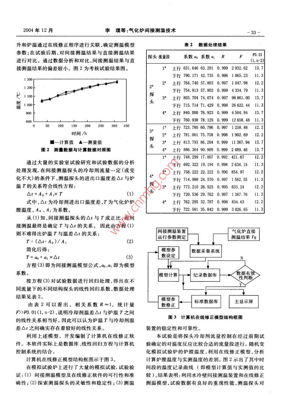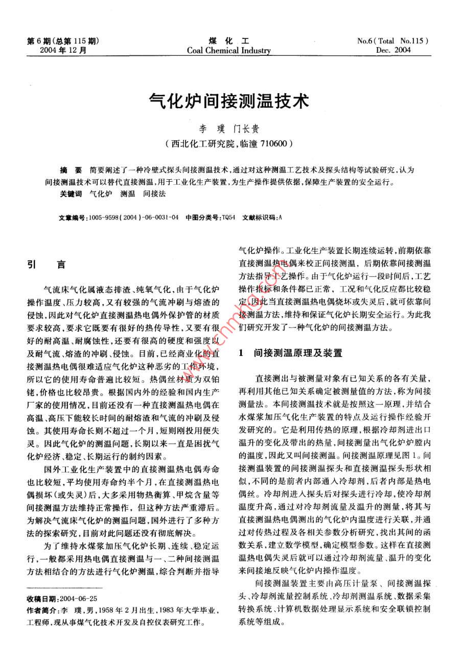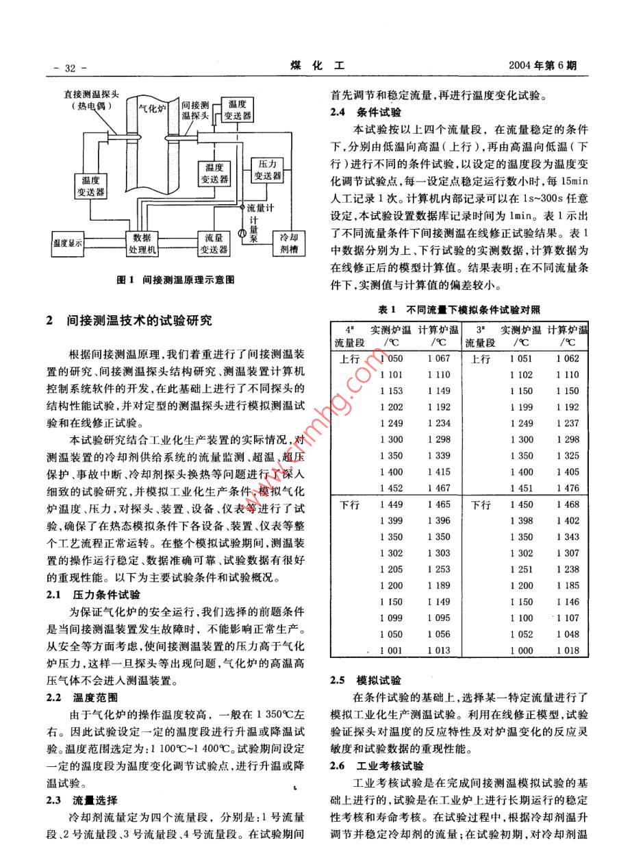 第6期(總第115期)煤化工No.6(Total No.115 )2004年12月Coal Chemical IndustryDec. 2004氣化爐間接測溫技術(shù)李璞門長貴(西北化工研究院,臨潼710600 )摘要簡要闡述了一種冷壁式探頭間接測溫技術(shù),通過對這種測溫工藝技術(shù)及探頭結(jié)構(gòu)等試驗研究,認為間接測溫技術(shù)可以替代直接測溫,用于工業(yè)化生產(chǎn)裝置,為生產(chǎn)操作提供依據(jù),保障生產(chǎn)裝置的安全運行。關(guān)鍵詞氣化爐測溫間接法文編號: 1005- -9598( 2004 )-06-0031-04中圖分類號:T954 文獻標識碼:A氣化爐操作。工業(yè)化生產(chǎn)裝置長期連續(xù)運轉(zhuǎn),前期依靠引言直接測溫?zé)犭娕紒硇Ug接測溫,后期依靠間接測溫方法指導(dǎo)工藝操作。由于氣化爐運行一段時間后,工藝氣流床氣化屬液態(tài)排渣、純氧氣化,由于氣化爐操作指標和條件都已正常,工況和氣化反應(yīng)都比較穩(wěn)操作溫度、壓力較高,又有較強的氣流沖刷與熔渣的定,因此當直接測溫?zé)犭娕紵龎幕蚴ъ`后,就可依靠間侵蝕,因此對氣化爐直接測溫?zé)犭娕纪獗Wo管的材質(zhì)接測溫方法,維持和保證氣化爐長期安全運行。為此我要求較高,要求它既要有很好的熱傳導(dǎo)性,又要有很們研究開發(fā)了一種氣化爐的間接測溫方法。好的耐高溫、耐腐蝕性,還要有很高的硬度和強度以及耐氣流、熔渣的沖刷、侵蝕。目前,已經(jīng)商業(yè)化的直1間接測溫原理及裝置接測溫?zé)犭娕己茈y適應(yīng)氣化爐這種惡劣的工作環(huán)境,所以它的使用壽命普遍比較短。熱偶絲材質(zhì)為雙鉑直接測出與被測量對象有已知關(guān)系的各有關(guān)量,銠,價格也比較昂貴。根據(jù)國內(nèi)外的經(jīng)驗和國內(nèi)生產(chǎn)再利用其他已知關(guān)系確定被測量值的方法,稱為間接廠家的使用情況,目前還沒有一種直接測溫?zé)犭娕荚跍y量法。本間接測溫技術(shù)就是按照這一原理,并結(jié)合高溫、高壓下能較長時間的耐熔渣和氣流的沖刷及侵水煤漿加壓氣化生產(chǎn)裝置的特點及運行操作經(jīng)驗開蝕。其使用壽命長則不超過一一個月,短則剛投用便失發(fā)研究的。它是利用傳熱的原理,根據(jù)冷卻劑進出口靈。因此氣化爐的測溫問題,長期以來--直是困擾氣溫升的變化及帶出的熱量,間接測量出氣化爐爐膛內(nèi)化爐經(jīng)濟、穩(wěn)定、長期運行的制約因素。的溫度,因此又叫間接測溫。間接測溫原理見圖1。間國外工業(yè)化生產(chǎn)裝置中的直接測溫?zé)犭娕級勖訙y溫裝置的間接測溫探頭和直接測溫探頭形狀相也比較短,平均使用壽命約半個月,在直接測溫?zé)犭娝?不同的是前者內(nèi)部通人冷卻劑,后者內(nèi)部是熱電偶損壞(或失靈)后,大多采用物熱衡算、甲烷含量等偶絲。冷卻劑進人探頭后對探頭進行冷卻,使冷卻劑.間接測溫方法維持正常操作,但這種方法嚴重滯后。溫度升高,通過對冷卻劑流量及溫升的測量.將其與為解決氣流床氣化爐的測溫問題,國外進行了多種方直接測溫?zé)犭娕紲y出的氣化爐內(nèi)溫度進行關(guān)聯(lián),并通法的探索研究,目前對此問題還沒有徹底解決。過對傳熱過程及各相關(guān)參數(shù)分析研究,找出其間的函為了維持水煤漿加壓氣化爐長期、連續(xù)、穩(wěn)定運數(shù)關(guān)系,建立數(shù)學(xué)模型,確定模型參數(shù)。這樣在直接測行,一般都采用熱電偶直接測溫與一、二種間接測溫溫?zé)犭娕际ъ`后就可以通過冷卻劑流量、溫升的變化方法相結(jié)合的方法進行氣化爐測溫,綜合判斷并指導(dǎo)來間接地反映氣化爐內(nèi)操作溫度。間接測溫裝置主要由高壓計量泵、間接測溫探收稿日期:2004-06-25頭、冷卻劑流量控制系統(tǒng)、冷卻劑測溫系統(tǒng)數(shù)據(jù)采集作者簡介:李璞,男,1958年2 月出生,1983年大學(xué)畢業(yè),轉(zhuǎn)換系統(tǒng)、計算機數(shù)據(jù)處理顯示系統(tǒng)和安全聯(lián)鎖控制工程師.現(xiàn)從事煤氣化技術(shù)開發(fā)及自控儀表研究工作。系統(tǒng)等組成。煤化工2004年第6期直接測溫探頭首先調(diào)節(jié)和穩(wěn)定流量,再進行溫度變化試驗。(熱電偶)氣化爐「間接測d.溫度晶探頭幾變送器2.4條件試驗本試驗按以上四個流量段,在流量穩(wěn)定的條件下,分別由低溫向高溫(上行),再由高溫向低溫(下溫度壓力行)進行不同的條件試驗,以設(shè)定的溫度段為溫度變I 變送器變送器化調(diào)節(jié)試驗點,每一設(shè)定 點穩(wěn)定運行數(shù)小時,每15min|變送器I人工記錄1次。計算機內(nèi)部記錄可以在1s~300s 任意o流量計設(shè)定,本試驗設(shè)置數(shù)據(jù)庫記錄時間為lmin。表1示出數(shù)據(jù)流量冷卻了不同流量條件下間接測溫在線修正試驗結(jié)果。表1溫度顯示處理機中數(shù)據(jù)分別為上、下行試驗的實測數(shù)據(jù),計算數(shù)據(jù)為在線修正后的模型計算值。結(jié)果表明:在不同流量條圖1間接測溫原理示意圉件下,實測值與計算值的偏差較小。表1不同流下模擬條件試驗對照2間接測溫技術(shù)的試驗研究4"實測爐溫 計算爐溫3實測爐溫 計算爐溫流量段/C| 流量段/9C根據(jù)間接測溫原理,我們著重進行了間接測溫裝上行1 0501 067上行1 0511 062置的研究、間接測溫探頭結(jié)構(gòu)研究、測溫裝置計算機1 1011 1101 102控制系統(tǒng)軟件的開發(fā),在此基礎(chǔ)上進行了不同探頭的1 15311491