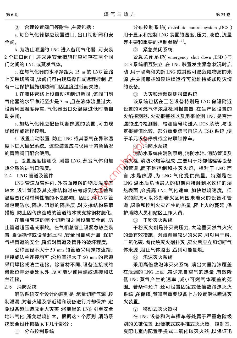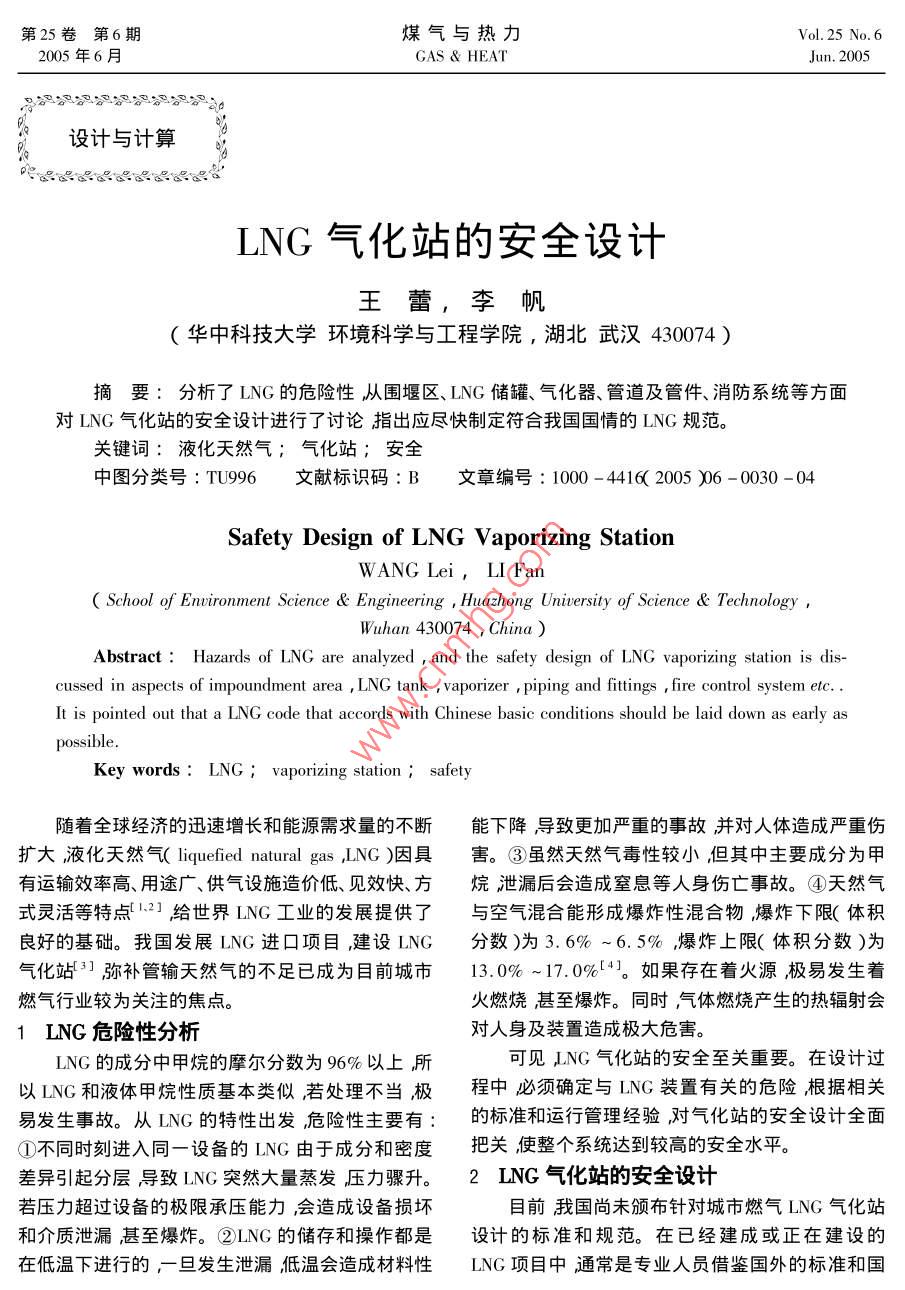 第25卷第6期煤氣與熱力Vol. 25 No. 62005 年6月GAS & HEATJun. 2005設計與計算LNG氣化站的安全設計王蕾,李帆(華中科技大學環(huán)境科學與工程學院,湖北武漢430074 )摘要:分析了LNG的危險性,從圍堰區(qū)、LNG儲罐、氣化器、管道及管件、消防系統(tǒng)等方面對LNG氣化站的安全設計進行了討論指出應盡快制定符合我國國情的LNG規(guī)范。關鍵詞:液化天然氣;氣化站;安全中圖分類號: TU996文獻標識碼: B文章編號: 1000 -4416( 2005 )06 -0030 -04.Safety Design of LNG Vaporizing StationWANG Lei,LI Fan( School of Enwironment Science & Engineering , Huazhong University of Science & Technology,Wuhan 430074 , China )Abstract : Hazards of LNG are analyzed , and the safety design of LNG vaporizing station is dis-cussed in aspects of impoundment area , LNG tank ,vaporizer , piping and fttings ,fire control system etc. .It is pointed out that a LNG code that accords with Chinese basic conditions should be laid down as early aspossible.Key words: LNG ; vaporizing station ; safety隨著全球經(jīng)濟的迅速增長和能源需求量的不斷能下降導致更加嚴重的事故并對人體造成嚴重傷擴大液化天然氣( liquefied natural gas ,LNG )因具害。③雖然天然氣毒性較小,但其中主要成分為甲有運輸效率高、用途廣、供氣設施造價低、見效快、方烷泄漏后會造成窒息等人身傷亡事故。④天然氣式靈活等特點1.21給世界LNG工業(yè)的發(fā)展提供了與空氣混合能形成爆炸性混合物爆炸下限(體積良好的基礎。我國發(fā)展LNG進口項目,建設LNG分數(shù))為3.6% ~6.5% ,爆炸上限(體積分數(shù))為氣化站3]彌補管輸天然氣的不足已成為目前城市13.0% ~17.0%[4。如果存在著火源,極易發(fā)生著燃氣行業(yè)較為關注的焦點?;鹑紵?甚至爆炸。同時氣體燃燒產(chǎn)生的熱輻射會1 LNG 危險性分析對人身及裝置造成極大危害。LNG的成分中甲烷的摩爾分數(shù)為96%以上所可見LNG氣化站的安全至關重要。在設計過以LNG和液體甲烷性質基本類似,若處理不當,極程中必須確定與LNG裝置有關的危險,根據(jù)相關易發(fā)生事故。從LNG的特性出發(fā)危險性主要有:的標準和運行管理經(jīng)驗,對氣化站的安全設計全面①不同時刻進入同一設備的LNG由于成分和密度把關,使整個系統(tǒng)達到較高的安全水平。差異引起分層導致LNG突然大量蒸發(fā),壓力驟升。2 LNG 氣化站的安全設計若壓力超過設備的極限承壓能力,會造成設備損壞目前我國尚未頒布針對城市燃氣LNG氣化站和介質泄漏甚至爆炸。②LNG的儲存和操作都是設計的標準和規(guī)范。在已經(jīng)建成或正在建設的在低溫”下進行的,-旦發(fā)生泄漏低溫會造成材料性LNG項目中通常是專業(yè)人員借鑒國外的標準和國第6期王蕾等1NG氣化站的安全設計第25卷內外的管理經(jīng)驗結合工程實際情況進行設計和施b.設置足夠數(shù)量的安全閥,安全閥與罐體之間工。常用的國外標準主要有美國標準《液化天然氣設手動截止閥,保證儲罐工作壓力在允許范圍內。( LNG )生產(chǎn)、儲存和裝卸標準》( NFPA 59A )日本內筒設安全放空閥連通火炬。外筒泄壓裝置將放部頒標準《一般高壓瓦斯保安法則》等國內標準主空氣體引至放空火炬。要有《石油化工企業(yè)設計防火規(guī)范》、《城鎮(zhèn)燃氣設e. 每個儲罐的液相管上設2個緊急切斷閥發(fā)計規(guī)范》、《火災自動報警系統(tǒng)設計規(guī)范》等。生意外事故時切斷儲罐與外界的連通,防止罐內2.1 圍堰區(qū)LNG泄漏。圍堰區(qū)是指用壓實土、混凝土、金屬等耐低溫材d.每個儲罐設2套相互獨立的液位測量裝置。料在LNG儲罐周圍建造的堤防護墻或排液系統(tǒng)所e.在儲罐真空夾套層設壓力儀表測量壓力是.圍成的區(qū)域。其作用是當LNG泄漏或溢出時將可否在合理范圍內。燃液體限制在圍堰區(qū)內防止進一步擴 散;消發(fā)生火f.多臺儲罐之間隔離閥的操作水平凈距至少災時阻止火焰向四周蔓延。因此確定圍堰區(qū)容積為0.9 m。時應考慮LNG儲罐總容積、冬季積雪或其他原因導g.儲罐投入運行時,設溫度檢測儀,用來監(jiān)測致圍堰區(qū)蓄液能力下降等多方面因素。溫度或作為檢查和校正液位計的工具。2.2 LNG 儲罐④給設計壓力高于100 kPa的儲罐配備相關LNG儲罐安全設計主要有以下幾方面內容:裝置預防LNG充注過量、液體受熱膨脹造成液位①根據(jù)儲罐容積合理確定安全間距,見表超高以及罐內壓力達到安全閥啟動值時液體淹沒安1[5]。全閥進口。表1圍堰墻與站區(qū)圍墻 之間、儲罐之間的水平凈距⑤為避 免罐內形成空氣與天然氣的混合物導Tab. 1 Horizontal distances from impoundment area to致事故,儲罐在首次充注LNG之前,或停止使用內station and between tanks部檢修后需要用惰性氣體將罐內的空氣或天然氣置換出來進行惰化處理8]。儲罐容積| 圍堰墻到站區(qū)圍墻的 儲罐之間水平V/m2水平凈距最小值/m凈距最小值/m :⑥根據(jù)地質、 氣象等資料分析發(fā)生地震、風V/m' <0.50.0災、雪災等自然災害的可能性及其特征考慮儲罐的0.5≤V/m'<1.93.01.0抗震和抵御風雪載荷的能力。1.9≤V/m'<7.6 .4.61.52.3 氣化器7.6≤V/m'<56.87.6美國標準NFPA 59A[5]將LNG氣化器分為加熱|56.8≤V/m' <114.015.0114.0≤V/m≤265.023.0相鄰儲罐公稱直氣化器、環(huán)境氣化器和工藝氣化器3類。其中加熱,265.0< V/m2儲罐公稱直徑的0.7|徑之和的1/4且氣化器的氣化熱源是燃料燃燒、電力、鍋爐或內燃機|倍