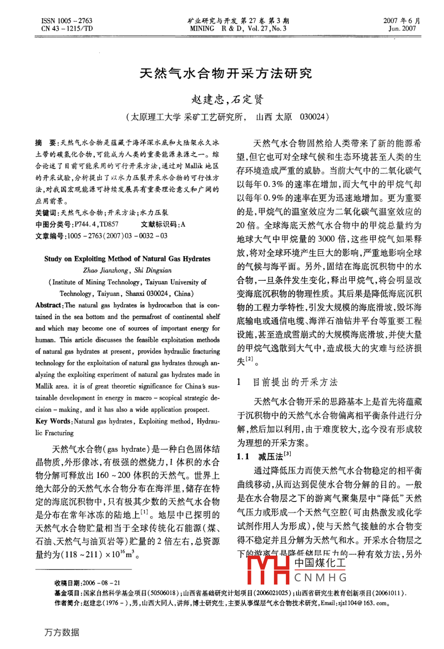IssN1005-2763礦業(yè)研究與開發(fā)第27卷第3期2007年6月CN43-1215/TDMiNING R&d. vol 27. No. 3Jun.2007天然氣水合物開采方法研究趙建忠,石定賢(太原理工大學(xué)采礦工藝研究所,山西太原03002摘要:天然氣水合物是蘊(yùn)藏于海洋深水底和大陸架永久冰天然氣水合物固然給人類帶來了新的能源希土帶的碳?xì)浠衔?可能成為人類的重要能源來源之一。綜望,但它也可對全球氣候和生態(tài)環(huán)境甚至人類的生合論迷了目前可能采用的可行開采方法,通過對Mlik地區(qū)存環(huán)境造成嚴(yán)重的威脅。當(dāng)前大氣中的二氧化碳?xì)獾拈_采試驗(yàn),分析提出了以水力壓裂開采水合物的可行性方法,對我國宏觀能源可持續(xù)發(fā)展具有重要理論意義和廣閫的以每年0.3%的速率在增加,而大氣中的甲烷氣卻應(yīng)用前景。以每年0.9%的速率在更為迅速地增加。更為重要關(guān)鍵詞:天然氣水合物;開采方法;水力壓裂的是,甲烷氣的溫室效應(yīng)為二氧化碳?xì)鉁厥倚?yīng)的中圖分類號:P44.4,TD857文獻(xiàn)標(biāo)識碼:A20倍。全球海底天然氣水合物中的甲烷總量約為文章編號:1005-2763(2007)03-0032-03地球大氣中甲烷量的3000倍,這些甲烷氣如果釋放,將對全球環(huán)境產(chǎn)生巨大的影響,嚴(yán)重地影響全球Study on Exploiting Method of Natural Gas HydratesZhao Jianzhong, Shi Dingxian的氣候與海平面。另外,固結(jié)在海底沉積物中的水Institute of Mining Technology, Taiyuan University of合物,一旦條件發(fā)生變化,釋出甲烷氣,將會明顯改Technology, Taiyuan, Shanxi 030024, Chin變海底沉積物的物理性質(zhì)。其后果是降低海底沉積Abstract: The natural gas hydrates is hydrocarbon that is con物的工程力學(xué)特性引發(fā)大規(guī)模的海底滑坡毀壞海tained in the sea bottom and the permafrost of continental she底輸電或通信電纜、海洋石油鉆井平臺等重要工程設(shè)施,甚至造成雪崩式的大規(guī)模海底滑坡,并使大量of natural gas hydrates at present, provides hydraulic fract的甲烷氣逸散到大氣中,造成極大的災(zāi)難與經(jīng)濟(jì)損technology for the exploitation of natural gas hydrates through an- s oalyzing the exploiting experiment of naturralydrates made inMallik area. it is of great theoretic significance for Chinas sus1目前提出的開采方法tainable天然氣水合物開采的思路基本上是首先將蘊(yùn)藏cision-making, and it has also a wide application prospectKey Words: Natural gas hydrates, Exploiting method, Hydrau于沉積物中的天然氣水合物偏離相平衡條件進(jìn)行分解,然后加以利用,由于難度較大,迄今沒有形成較天然氣水合物( gas hydrate))是一種白色固體結(jié)為理想的開采方案。晶物質(zhì),外形像冰,有極強(qiáng)的燃燒力,1體積的水合1.1減壓法3物分解可釋放出160~200體積的天然氣。世界上通過降低壓力而使天然氣水合物穩(wěn)定的相平衡絕大部分的天然氣水合物分布在海洋里,儲存在特曲線移動,從而達(dá)到促使水合物分解的目的。一般定的海底沉積物中,只有極其少數(shù)的天然氣水合物是在水合物層之下的游離氣聚集層中“降低”天然是分布在常年冰凍的陸地上1l地層中已探明的氣壓力或形成一個天然氣空腔(可由熱激發(fā)或化學(xué)天然氣水合物貯量相當(dāng)于全球傳統(tǒng)化石能源(煤、試劑作用人為形成),使與天然氣接觸的水合物變石油天然氣與油頁巖等)貯量的2倍左右,總資源得不穩(wěn)定并且分解為天然氣和水。開采水合物層之量約為(118~21)×103m3。下低儲壓十的一種有效方法,另外中國煤化工收稿日期:CNMHG趙建忠,等:天然氣水合物開采方法研究33通過調(diào)節(jié)天然氣的提取速度可以達(dá)到控制儲層壓力也有人提出直接在井底放一個高溫催化爐,把的目的,進(jìn)而達(dá)到控制水合物分解的效果。減壓法甲烷催化成一氧化碳和氫氣,利用放出的熱量來分最大的特點(diǎn)是不需要昂貴的連續(xù)激發(fā),因而其可能解水合物,該方案的化學(xué)反應(yīng)方程式為成為今后大規(guī)模開采天然氣水合物的有效方法之2CH4+O2+2CO+4H2但是,單使用減壓法開采天然氣是很慢的,是一從以上各方法的使用來看,單單采用某一種方種弱化被動式開采。法來開采天然氣水合物是不經(jīng)濟(jì)的,只有結(jié)合不同1.2熱激法方法的優(yōu)點(diǎn)才能達(dá)到對水合物的有效開采。例如將將蒸汽、熱水、熱鹽水或其它熱流體從地面泵入降壓法和熱開采技術(shù)結(jié)合使用,即先用熱激發(fā)法分水合物地層,也可采用開采重油時使用的火驅(qū)法,總解天然氣水合物,后用降壓法提取游離氣體。稱為熱激發(fā)法。熱開采技術(shù)的主要不足是會造成2 Mallik地區(qū)的試采實(shí)驗(yàn)之只要能促使溫度上升達(dá)到水合物分解的方法都可量的熱損失,效率很低。特別是在永久凍土區(qū),即使由熱衷于開發(fā)這種可能的替代能源的日本主利用絕熱管道,永凍層也會降低傳遞給儲層的有效導(dǎo),一個由石油公司和政府機(jī)構(gòu)組成的團(tuán)體開展了熱量。為期16a的研究,其目標(biāo)是在2010年前確定水合在熱刺激模型中,水合物產(chǎn)生的熱傳導(dǎo)控制技物是否能成為一種資源。1998年,研究人員在加拿術(shù)有兩種大西北部的北極圈地區(qū)鉆了第一口試驗(yàn)井;2002年(1)用熱水或蒸汽循環(huán)注入預(yù)熱井。通過數(shù)值第一季度,承擔(dān)此計劃的團(tuán)體在經(jīng)