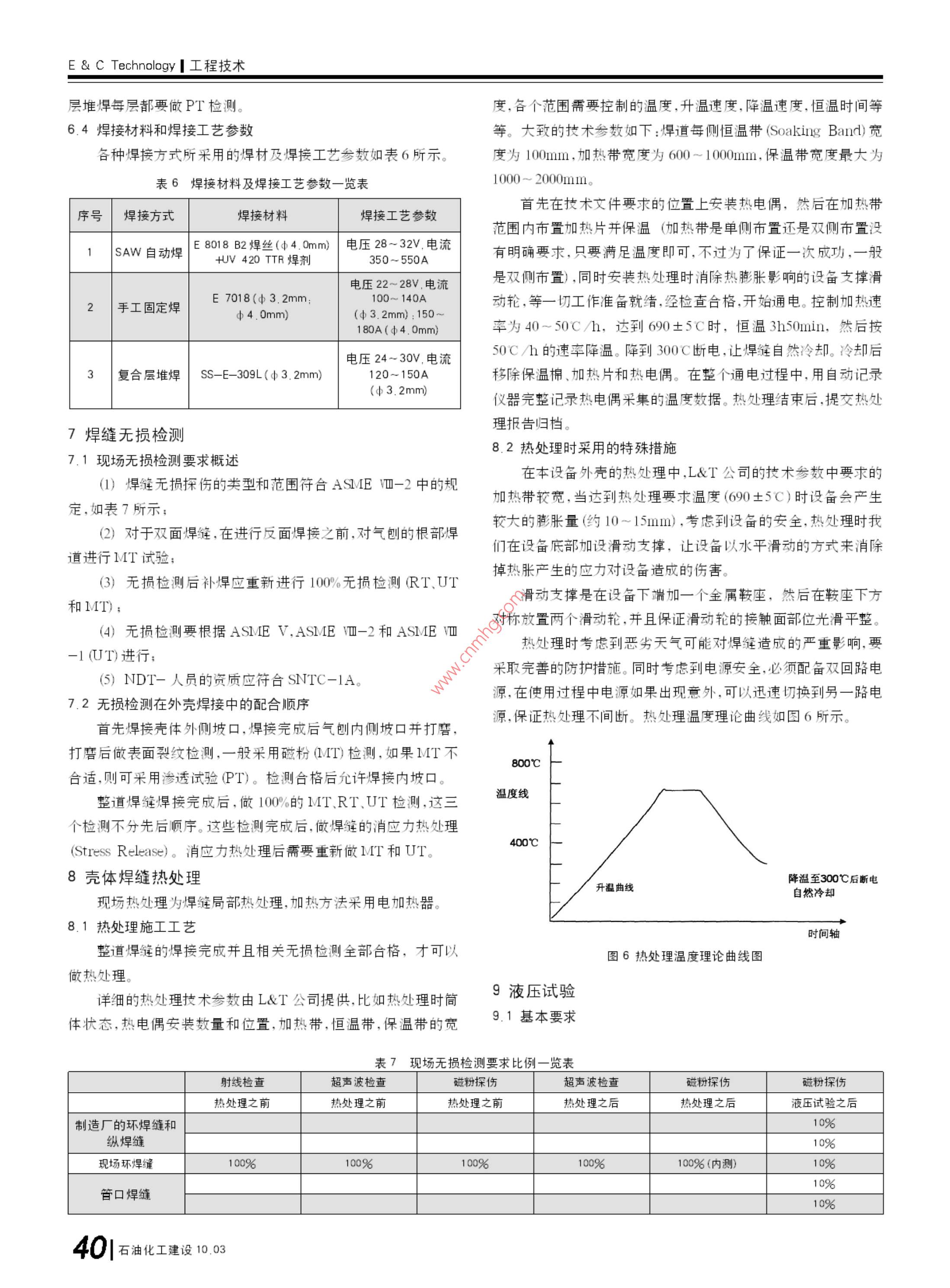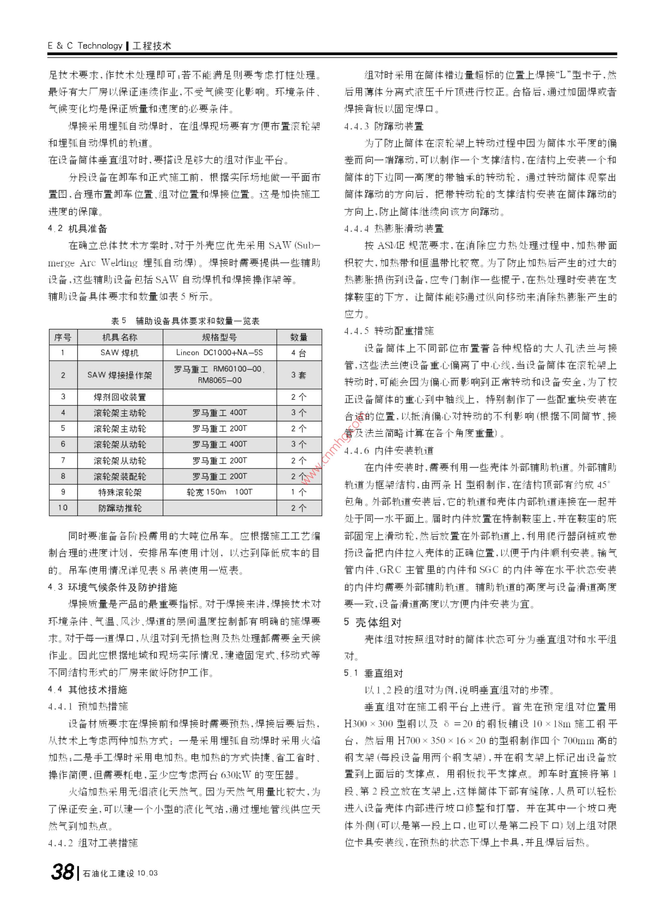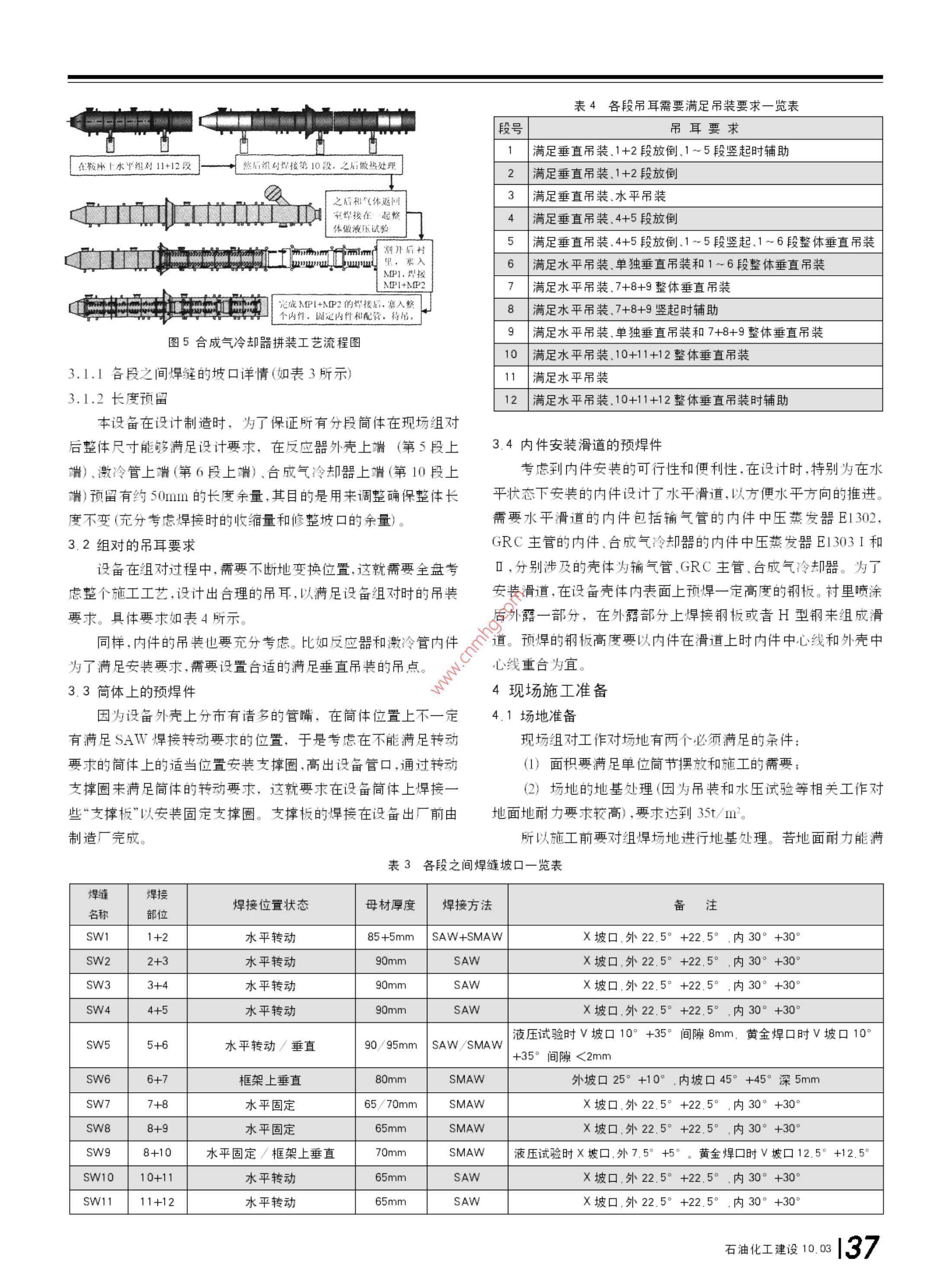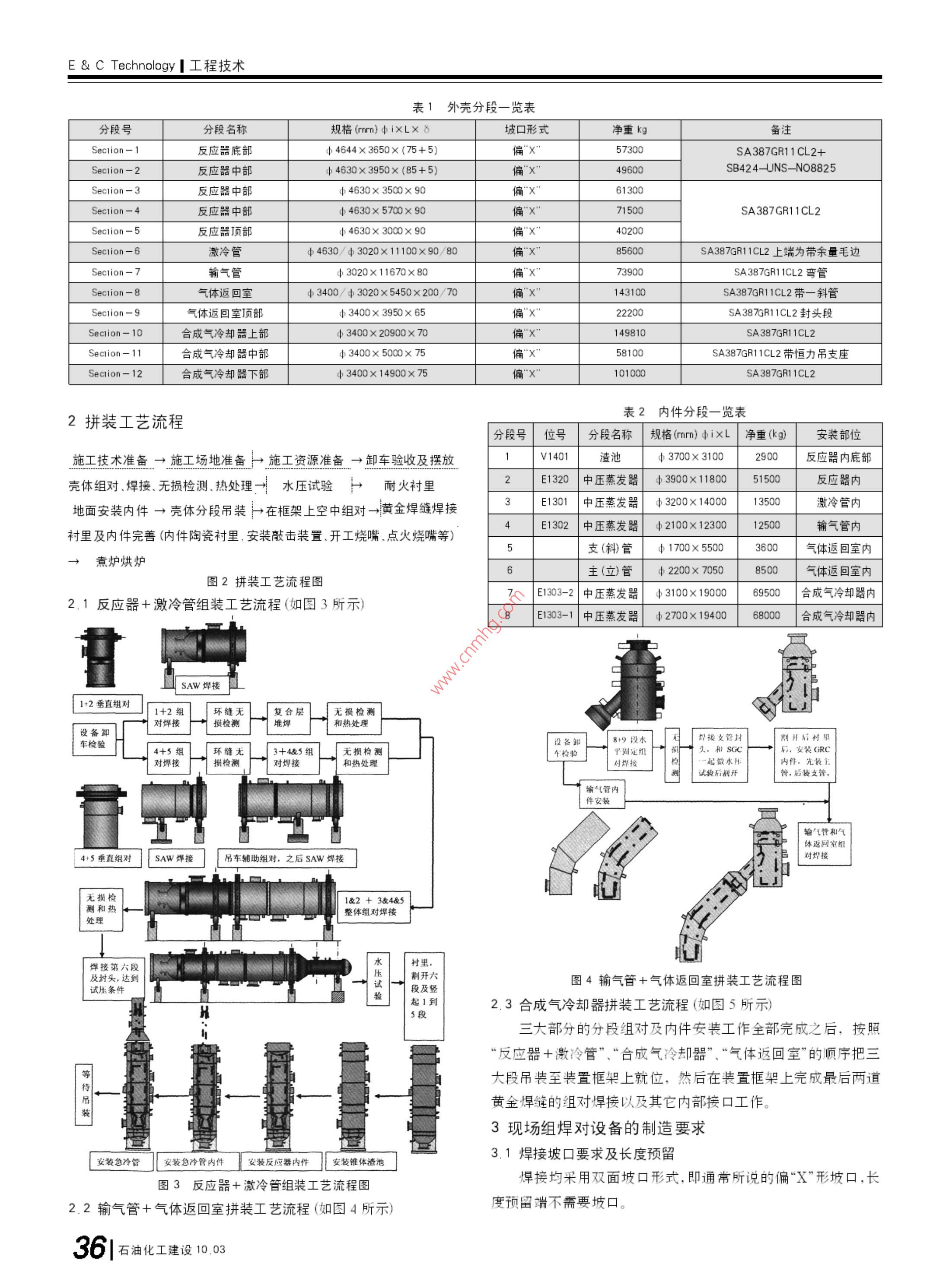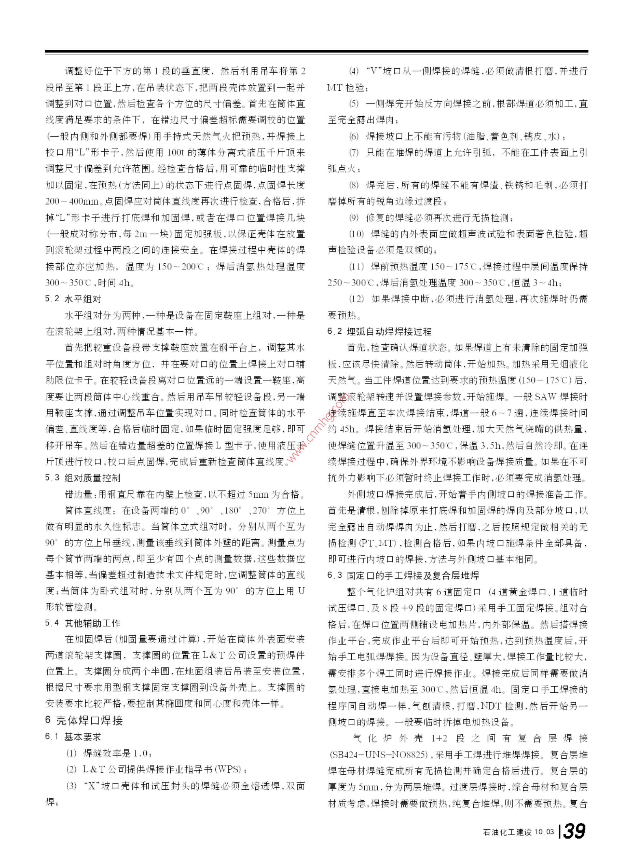 工程技術(shù)& Technology殼牌氣化爐的現(xiàn)場組焊技術(shù)■肖曉磊中國化學工程第十一建設(shè)公司河南開封475002摘要通過與殼牌公司技術(shù)交流,借國外壓力容器組焊先進經(jīng)驗在國內(nèi)中石化油改煤工程投料調(diào)試的經(jīng)驗基礎(chǔ)上,結(jié)合大型氣化爐組焊技術(shù)的工程實例,闡述一項成熟的氣化爐現(xiàn)場組焊技術(shù)。本文重于描述施工程序(組裝流程)、組對與焊接、內(nèi)件安裝。對無損檢測、消除應(yīng)力熱處理、液壓試驗、里等僅做一般性介紹。關(guān)鍵詞殼技術(shù)氣化爐現(xiàn)場組對焊接中圖分類號TG44文獻標識碼B文章編號672-9323(2010-0035-081氣化爐概況近年來,隨著煤化工的興起,煤液化技術(shù)、煤制甲醇、油改煤l+87200 Scctiong在國內(nèi)大批推進,其中殼牌氣化爐(以下簡稱:氣化爐)是采用最三多的設(shè)備之一,如神華煤制油、中原大化50萬t甲醇裝置、大唐 Section8E177800多倫168萬t甲醇46萬t煤基烯烴均采用殼牌專利技術(shù)。殼牌 Section?氣化爐一律為專利設(shè)備整體引進,并由外商進行總體設(shè)計,其殼輸氣管體部分大致分由兩個國家制造:西班牙、印度L&T公司;內(nèi)件部分由荷蘭SEG公司設(shè)計,分別由西班牙和L&T公司制造;其 Section6 Section10結(jié)構(gòu)形式為膜式水冷壁結(jié)構(gòu)。1.1氣化爐總體介紹氣化爐主要由殼體和內(nèi)件組成。其中殼體分為反應(yīng)器(Re- Section12 actor)+激(急)冷管(Quench Pipe)(位號:V1301),臺成氣冷卻器(Syngas Cooler)+氣體返回室(Gas Return Chamber)(位號:V1302),輸氣管(Transfer Duct)(位號:V1303)。內(nèi)件分為渣池(位號:V1401)、激冷管中壓蒸汽發(fā)生器(位號:E1301)、輸氣管中壓蒸汽發(fā)生器(位號:E1302)、合成氣冷卻器中壓蒸汽發(fā)生器7000(位號:E1303)、氣化爐反應(yīng)器中壓蒸汽發(fā)生器(位號:E1320)以及氣體返回室內(nèi)的立管(主管)和斜管(支管)等七部分。1.2設(shè)備材料及設(shè)備規(guī)格圖1氣化爐整體模型3口位外殼外因素按照以尺和重量板sa387gr11CL2+N8825最大厚285mm殼體最大內(nèi)徑(1)組件高度最高5.1m4630mm:需要現(xiàn)場組對焊縫處的壁厚為65~90mm:整體長(2)組件寬度最大7m段50.2m。氣化爐整體模型如圖1所示(3)組件長度最長25.00m1.3設(shè)備分段(以2000爐子為例)(4)組件重量最大150t為了滿足設(shè)備內(nèi)陸道路運輸及組焊吊裝要求,在初步設(shè)計具體的設(shè)備分段情況列表如表1表2所示:(注大唐3000t期間,技術(shù)方案的討論必須有制造廠商參加,他們必須充分考慮爐子分段的幾何尺寸及重量略大些)石油化工建設(shè)10.03135e& Technology工程技術(shù)表1外殼分段一覽表分段號分段名稱規(guī)格(r)ixlx8坡口形式凈重kg備注注 Section-1-1反應(yīng)器底部4044×3607+5)偏57300 SA387GR11CL2+ Secion-2-2反應(yīng)器中部中4630×3950×(85+5)偏49600 SB424-UNS-NO8825 Section-3-3反應(yīng)器中部46303500×90偏61300反應(yīng)器中部4630×5700×90偏71500 SA387GR11CL2 Section-5-5反應(yīng)器頂部43偏40200 Section-6激冷管4630/3020×11100×90/80偏85600SA38711L2上端為帶余量毛邊 Sectlion-7輸氣管30201167080偏73900SA387R1CL2彎管 Secion-B8氣體返回室3400/3020×5450×200/70偏143100SA387G1L2帶一斜管 Section--9氣體返回室頂部中3400×3950×65偏22200SA387G11CL2封頭段 Section--10合成氣冷卻器上部3400×20900×70偏14981031CL2 Section--11合成氣冷卻中部3400×5000×75偏58100SA38711CL2帶恒力吊支座 Section--12合成氣冷卻器下部中3400×14900×75偏101000 SA387GR11CL22拼裝工藝流程表2內(nèi)件分段一覽表分段號位號分段名稱規(guī)格(mm)ix凈重(kg)安裝部位施工技術(shù)準備→施工場地準備→施工資源準備→卸車驗收及擺放1V1401渣池3700×31002900反應(yīng)器內(nèi)底部殼體組對、焊接、無損檢測、熱處理水壓試驗?zāi)突鹨r里2E1320中壓蒸發(fā)器39001180051500反應(yīng)器內(nèi)地面安裝內(nèi)件→殼體分段吊裝在框架上空中組對→黃金焊縫焊接3E1301中壓蒸發(fā)器32001400013500激冷管內(nèi)襯里及內(nèi)件完善(內(nèi)件陶瓷襯里安裝敲擊裝置、開工燒嘴、點火燒嘴等)4E1302中壓蒸發(fā)器2100×1230012500輸氣管內(nèi)5支(斜)管1700×55003600氣體返回室內(nèi)→煮爐烘爐6圖2拼裝工藝流程圖主(立)管200×70508500氣體返回室內(nèi)2.1反應(yīng)器+激冷管組裝工藝流程(如圖3所示)71303-2中壓蒸發(fā)器31001900069500成氣冷卻器內(nèi)81303-1中壓蒸發(fā)器270019408000合成氣冷卻器內(nèi)Aw焊接1+2垂直組對1+2組環(huán)縫無復(fù)合無損檢測設(shè)備卸對焊接損檢測堆和熱處理車檢驗焊接支管封開后4+5組環(huán)縫無3+4&5組無損檢測設(shè)備定和s安裝8+9段水對焊接損檢測對焊接和熱處理焊接一起水試驗后開后裝支管輸氣管內(nèi)件安輸氣管和氣體返回室組4+5垂直組對SAW焊接吊車輔助組對,之后SAW焊接無損檢12+3&4&5測和熱處理整體組對焊接焊接第六段村里及封頭,達到段及豎圖4輸氣管+氣體返回室拼裝工藝流程圖試壓條件起1到5段2.3合成氣冷卻器拼裝工藝流程(如圖5所示三大部分的分段組對及內(nèi)件安裝工作全部完成之后,按照“反應(yīng)器+激冷管”、“合成氣冷卻器”、“氣體返回室”的順序把三等特大段吊裝至裝置框架上就位,然后在裝置框架上完成最后兩道裝黃金焊縫的組對焊接以及其它內(nèi)部接口工作。3現(xiàn)場組焊對設(shè)備的制造要求安裝急冷管安裝急冷管內(nèi)件安裝反應(yīng)器內(nèi)件