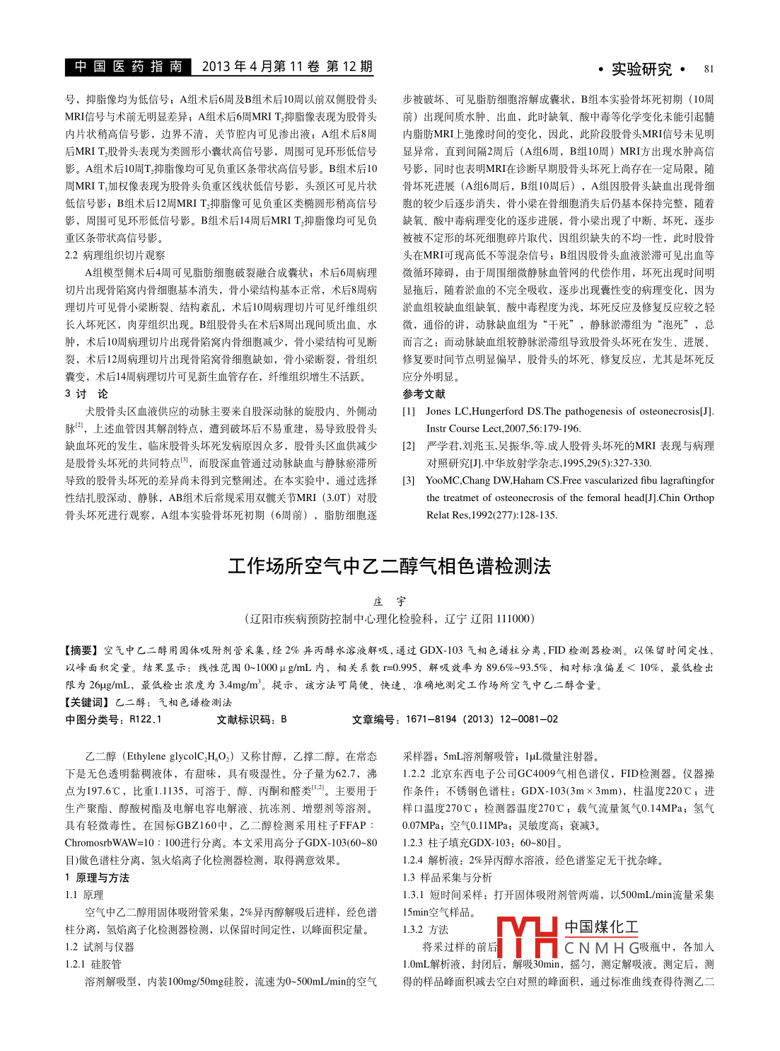 「中國醫(yī)藥指南_2013年4月第11卷第12期·實驗研究號,抑脂像均為低信號;A組術后6周及B組術后10周以前雙側股骨頭步被破壞、可見脂肪細胞溶解成囊狀,B組本實驗骨壞死初期(10MRI信號與術前無明顯差異;A組術后6周MRIT抑脂像表現(xiàn)為股骨頭前)出現(xiàn)間質水腫、出血,此時缺氧、酸中毒等化學變化未能引起髓內片狀稍高信號影,邊界不清,關節(jié)腔內可見滲出液;A組術后8周內脂肪MRI上弛豫時間的變化,因此,此階段股骨頭MRI信號未見明后MRIT股骨頭表現(xiàn)為類圓形小囊狀高信號影,周圍可見環(huán)形低信號顯異常,直到間隔2周后(A組6周,B組10周)MRI方出現(xiàn)水腫高信影。A組術后10周T2抑脂像均可見負重區(qū)條帶狀高信號影。B組術后10號影,同時也表明MR在診斷早期股骨頭壞死上尚存在一定局限。隨周MRIT:加權像表現(xiàn)為股骨頭負重區(qū)線狀低信號影,頭頸區(qū)可見片狀骨壞死進展(A組6周后,B組10周后),A組因股骨頭缺血出現(xiàn)骨細低信號影;B組術后12周MRIT2抑脂像可見負重區(qū)類橢圓形稍高信號胞的較少后逐步消失,骨小梁在骨細胞消失后仍基本保持完整,隨著影,周圍可見環(huán)形低信號影。B組術后14周后MRIT抑脂像均可見負缺氧、酸中毒病理變化的逐步進展,骨小梁出現(xiàn)了中斷、壞死,逐步重區(qū)條帶狀高信號影。被被不定形的壞死細胞碎片取代,因組織缺失的不均一性,此時股骨22病理組織切片觀察頭在MRI可現(xiàn)高低不等混雜信號;B組因股骨頭血液淤滯可見出血等A組模型側術后4周可見脂肪細胞破裂融合成囊狀;術后6周病理微循環(huán)障礙,由于周圍細微靜脈血管網的代償作用,壞死岀現(xiàn)時間明切片出現(xiàn)骨陷窩內骨細胞基本消失,骨小梁結構基本正常,術后8周病顯拖后,隨著淤血的不完全吸收,逐步出現(xiàn)囊性變的病理變化,因為理切片可見骨小梁斷裂、結構紊亂,術后10周病理切片可見纖維組織淤血組較缺血組缺氧、酸中毒程度為淺,壞死反應及修復反應較之輕長人壞死區(qū),肉芽組織出現(xiàn)。B組股骨頭在術后8周出現(xiàn)間質出血、水微,通俗的講,動脈缺血組為“干死”,靜脈淤滯組為“泡死”,總腫,術后10周病理切片岀現(xiàn)骨陷窩內骨細胞減少,骨小梁結構可見斷而言之:而動脈缺血組較靜脈淤滯組導致股骨頭壞死在發(fā)生、進展裂,術后12周病理切片出現(xiàn)骨陷窩骨細胞缺如,骨小梁斷裂,骨組織修復要時間節(jié)點明顯偏早,股骨頭的壞死、修復反應,尤其是壞死反囊變,術后14周病理切片可見新生血管存在,纖維組織增生不活躍應分外明顯。討論參考文獻犬股骨頭區(qū)血液供應的動脈主要來自股深動脈的旋股內、外側動[1] Jones lc. Hungerford ds. The pathogenesis of osteonecrosis脈,上述血管因其解剖特點,遭到破壞后不易重建,易導致股骨頭Instr Course Lect. 2007.56: 179-196缺血壞死的發(fā)生,臨床股骨頭壞死發(fā)病原因眾多,股骨頭區(qū)血供減少[2]嚴學君,劉兆玉,吳振華,等.成人股骨頭壞死的MRI表現(xiàn)與病理是股骨頭壞死的共同特點,而股深血管通過動脈缺血與靜脈瘀滯所對照研究中華放射學雜志1995,29(5):327-330導致的股骨頭壞死的差異尚未得到完整闡述。在本實驗中,通過選擇[3] YooMC Chang Dw,Haham CS. Free vascularized fibu lagraftingfor性結扎股深動、靜脈,AB組術后常規(guī)采用雙髖關節(jié)MRI(30T)對股the treatmet of osteonecrosis of the femoral head[J]. Chin Orthop骨頭壞死進行觀察,A組本實驗骨壞死初期(6周前),脂肪細胞逐Relat res,1992(277):128-135工作場所空氣中乙二醇氣相色譜檢測法莊宇(遼陽市疾病預防控制中心理化檢驗科,遼寧遼陽11000【摘要】空氣中♂二醇用固體吸附劑管釆集,經λ%異丙醇水溶液解吸,通過GDⅹ-103氣相色譜柱分離,FID檢測器檢測。以保留時間定性以峰面積定量。結果顯示:線性范圍0-1000μg/mL內,相關系數(shù)r=0.995,解吸效率為89.6%~93.5%,相對標準偏差<10%,最低檢出限為26μg/mL,最低檢出濃度為34mgm。提示,該方法可簡便、快速、準確地測定工作場所空氣中乙二醇含量【關鍵詞】乙二醇;氣相色譜檢測法中圖分類號:R122.1文獻標識碼:B文章編號:1671-8194(2013)12-0081-02乙二醇(巸 ethylene glycolCH,O2)又稱甘醇,乙撐二醇。在常態(tài)采樣器;5mL溶劑解吸管;lμ微量注射器。下是無色透明黏稠液體,有甜味,具有吸濕性。分子量為62.7,沸1.2.2北京東西電子公司GC4009氣相色譜儀,FID檢測器。儀器操點為197.6℃,比重1.1135,可溶于、醇、丙酮和醛類2。主要用于作條件:不銹鋼色譜柱:GDX-103(3m×3mm),柱溫度220℃;進生產聚酯、醇酸樹酯及電解電容電解液、抗凍劑、增塑劑等溶劑。樣口溫度27℃;檢測器溫度270℃;載氣流量氮氣O.14MPa;氫氣具有輕微毒性。在國標GBZ160中,乙二醇檢測采用柱子FFAP007MPa;空氣0.MPa;靈敏度高;衰減3。Chromosrb wAw=10:100進行分離。本文采用高分子GDX-103(60-801.2.3柱子填充GDX-103:60-80目目)做色譜柱分離,氫火焰離子化檢測器檢測,取得滿意效果1.2.4解析液:2%異丙醇水溶液,經色譜鑒定無干擾雜峰。1原理與方法1.3樣品采集與分析1.1原理1.3.1短時間采樣:打開固體吸附劑管兩端,以500mL/min流量采集空氣中乙二醇用固體吸附管采集,2%異丙醇解吸后進樣,經色譜15min空氣樣品柱分離,氫焰離子化檢測器檢測,以保留時間定性,以峰面積定量。sARAH中國煤化工1.2試劑與儀器CNMHG吸瓶中,各加入1.2.1硅膠管lonL解析液,封閉后,解吸30min,搖勻,測定解吸液。測定
