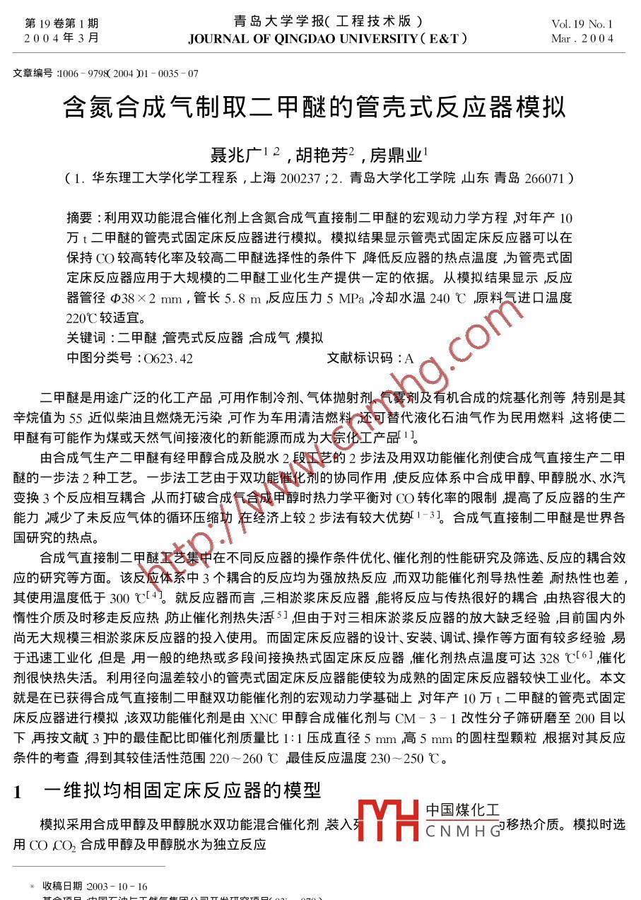 含氮合成氣制取二甲醚的管殼式反應(yīng)器模擬
