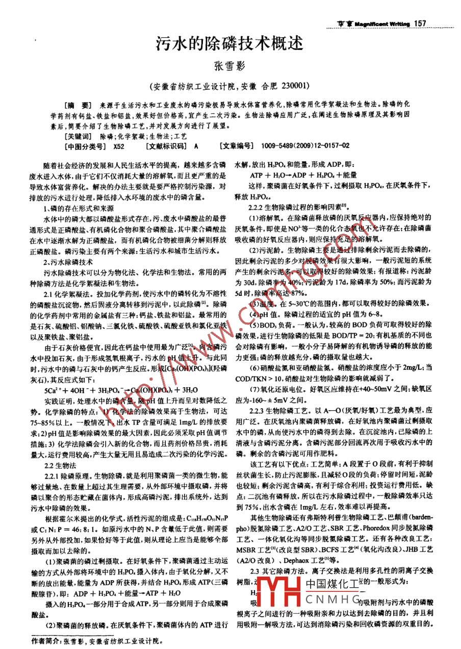 華章MognHMcent wrting 157污水的除磷技術(shù)概述張雪影(安徽省紡織工業(yè)設(shè)計院,安徽合肥230001)[摘要]來源于生活污水和工業(yè)廢水的磷污染板易導(dǎo)致水體富營養(yǎng)化,除磷常用化學(xué)絮凝法和生物法。除磷的化學(xué)藥劑有鈣鹽、鐵鹽和鋁鹽,效果好但價格高,宜產(chǎn)生二次污染。生物法除磷應(yīng)用廣泛,在闡述生物除磷原理及其影響因素后,簡要介紹了生物除磷工藝,并對發(fā)展方向進行了展望。[關(guān)鍵詞] 除磷;化學(xué)絮凝;生 物法;工藝[中圖分類號] X52[文獻標(biāo)識碼] A[文章編號] 1009- 5489(2009)12-0157-02隨著社會經(jīng)濟的發(fā)展和人民生活水平的提高,越來越多含磷水解, 放出HPO,和能量,形成ADP,即:廢水進入水體,由于它們不僅消耗大量的溶解氧,而且更嚴(yán)重的是ATP + H:O→ADP + HPO, +能量導(dǎo)致水體富營養(yǎng)化。解決的辦法主要就是要嚴(yán)格控制污染源,對這樣,聚磷菌在好氧條件下,過剩攝取H,PO,在厭氧條件下,排放的污水進行處理,降低排入水環(huán)境的廢水中的磷含量。釋放H,PO4.1.磷的存在形式和來源2.2.2 生物除磷過程的影響因素”。水體中的磷大都以磷酸鹽形式存在,污、廢水中磷酸鹽的最普(1)溶解氧。在除磷菌釋放磷的厭氧反應(yīng)器內(nèi),應(yīng)保持絕對的通形式是正磷酸鹽有機磷化合物和聚合磷酸鹽。其中聚介磷酸鹽厭氧條件, 即使是NO'等- -類的化合態(tài)氧也不允許存在:在除磷菌在水中逐漸水解為正磷酸鹽,而有機磷化合物被細(xì)蔭分解則釋放吸收磷的好 氧反應(yīng)器內(nèi),則應(yīng)保持充足的溶解氧。正磷酸鹽。磷污染主要有兩個來源:生活污水和城市生活污水。(2)污泥齡。生物除磷主要是通過排除剩余污泥而去除磷的,2.污水除磷技術(shù)因此剩余污泥的多少對脫磷效果有很大影響,- 般污泥短的系統(tǒng)污水除磷技術(shù)可以分為物化法、化學(xué)法和生物法。常用的兩產(chǎn) 生的剩余污泥多,可以取得較好的除磷效果:有報道稱:污瀧齡種除磷方法是化學(xué)絮凝法和生物法。為30d,除磷率為40%;污泥齡為17d,除磷率為50%;而污泥齡為2.1化學(xué)絮凝法。投加化學(xué)藥劑,使污水中的磷轉(zhuǎn)化為不溶性sd 時,除磷率高達87%。的磷酸鹽沉淀物,然后固液分離轉(zhuǎn)移到污泥中,以此除磷”。除磷(3)溫度。在S-30C的范圍內(nèi),都可以取得較好的除磷效果。的化學(xué)藥劑中常用的金屬鹽有三種:鈣鹽、鐵鹽和鋁鹽。最常用的(4)pH值。除磷過程的適宜的pH值為6~8.是石灰、硫酸鋁、鋁酸鈉、三氯化鐵、硫酸鐵、硫酸亞鐵和氯化亞鐵(5)BOD,負(fù)荷。一般認(rèn)為,較高的BOD負(fù)荷可取得較好的除以及聚鐵鹽、聚鋁鹽。磷效果,進行生物除磷的低限是BOD/TP = 20:有機基質(zhì)的不同也由于石灰價格便宜,因此在鈣鹽中使用最為廣泛"。向含磷污會對除磷有影響, 一般小分子易降解的有機物誘導(dǎo)磷的釋放的能水中投加石灰,由于形成氫氧根離子,污水的pH值上升。與此同力吏強; 磷的釋放越充分,磷的攝取量也越大。時,污水中的磷與石灰中的鈣產(chǎn)生反應(yīng)。形成[Ca(OH(PO)J(羥磷(6)硝酸鹽氮和亞硝酸鹽氮。硝酸鹽的濃度應(yīng)小于2mg/L:當(dāng)灰石),其反應(yīng)式如下:COD/TKN> 10,硝酸鹽對生物除磷的影響就減弱了。SCa2 *+ 40H + 3H:PO,~ +Ca(OH)(PO), + 3H2O(7)氧化還原電位.好氧區(qū)應(yīng)維持在+40- 50mV之間:缺氧區(qū)實踐證明,處理水中的磷含量,隨pH值上升而呈對數(shù)降低之應(yīng)為-160~ + 5mV之間。勢?;瘜W(xué)除磷的特點: 1) 化學(xué)法的除磷效果高于生物法,可達2.2.3生物除磷工藝。以A- -0(厭氧好氧)工藝最為典型,應(yīng)75- 85%以上。一般情況下,出水TP含量可滿足Img/L的排放要用廣 泛.在厭氡池內(nèi)聚磷蔭釋放磷,在好氧池內(nèi)聚磷菌過剩攝取求:2)pH值是影響除磷效果的最大因素,因此必須采取pH值調(diào)節(jié)水中的磷, 從而使污水中的磷得到去除。在沉淀池內(nèi),已除磷的上措施: 3)化學(xué)法除磷會引入新的化合物,而且藥劑價格昂貴,消耗清液 與含磷污泥分離。含磷污泥部分回流再次用于吸收污水中的量大,運行費用較高,產(chǎn)生大量無用且易造成二次污染的化學(xué)污泥。磷。 剩余的含磷污泥可用作肥料。2.2生物法該工藝有以下優(yōu)點:工藝簡單: A段置于0段前,有利于抑制22.1除磷原理.生物除磷,就是利用聚磷菌一類的微生物,能絲狀菌生 長,防止污泥膨脹,且減輕0段的負(fù)荷:停留時間短,泥齡夠過量地、在數(shù)量上超過其生理滿要,從外部環(huán)境中攝取磷,并將也較短: 剩余污泥含磷高,有利于綜合利用:投資運行費用低。缺磷以聚合的形態(tài)貯藏在菌體內(nèi),形成高磷污泥,排出系統(tǒng)外,達到點: 二沉池有磷釋放,所以在污水除磷過程中,一-般除磷效率只達污水中除磷的效果。到75%,出水含磷在lImg/左右,效率難以再提高。根據(jù)霍爾米提出的化學(xué)式,活性污泥的組成是: CmuHmOsINnP其他生物除磷還有弗斯特利普生物除磷工藝、巴顛甫(barden-或C:N:P= 46:8; 1.如原污水中的N、P含最低于此值,則需要pho)脫氮除 磷工藝、A2/0工藝、SBR工藝Phoredox同步脫氮除磷另外從外部投加,如果恰好等于此值,則從理論上應(yīng)當(dāng)是能夠全部工藝、 一體化氧化溝等同步脫氮除磷工藝。還有各種改良工藝:攝取而加以去除的。MSBR工藝(改良型SBR). BCFS工藝(氧化溝改良)JHB