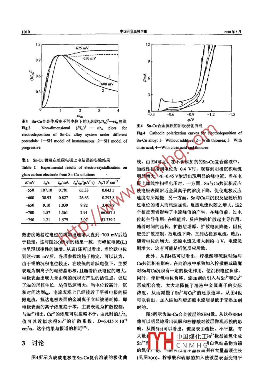 第20卷第5期中國有色金屬學報2010年5月Vol.20 No.5The Chinese Journal of Nonferrous MetalsMay 2010文章編號: 1004-0609(2010)05-1006-07Sn-Cu合金的電沉積行為及添加劑的影響胡煒1,2, 譚澄宇12,崔航',2, 鄭子樵1,2(1.中南大學有色金屬材料科學與工程教育部重點實驗室,長沙410083;2.中南大學材料科學與工程學院,長沙410083)摘要: 利用循環(huán)伏安和計時安培研究Sn-Cu哈金體系在玻碳電極上的電沉積行為,通過陰極極化曲線、SEM觀察及EDS分析討論檸檬酸和硫脲對Sn-Cu共沉積的影響。結(jié)果表明,Sn- Cu共沉積過程為擴散控制的不可逆過程:在沉積電位- 600~-750 mV的范圍內(nèi)Sn-Cu共沉積初期結(jié)晶行為滿足三維Scharifker Hil瞬時成核模型,隨著過電位的增大,形核活性點增多,形核弛豫時間縮短;當沉積過電位大于-700 mV時,Sn2*的擴 散系數(shù)約為6.435X10*cm7/s;檸檬酸和硫脈的加入細化了鍍層晶粒,使鍍層表面更加平整和致密。此外,硫脲的加入降低了鍍層中銅的含量,使合金鍍層中銅的含量維持在0.5%~ 2.0%(質(zhì)量分數(shù))。關(guān)鍵詞: Sn-Cu合金; 形核;循環(huán)伏安:電沉積;中圖分類號: TQ172.84文獻標志碼: AElectrodeposition behavior of Sn-Cu alloy and effect ofadditives on deposition processHU Weil.2 TAN Cheng:yu'., CUI Hang'", ZHENG Zi-qiaol'2(1. Educational Key Laboratory of Non-ferrous Metal Materials Science and Engineering,Central South University, Changsha 410083, China;2. School of Materials Science and Engineering, Central South University, Changsha 410083, China)Abstract: The eletrodeposition of Sn-Cu alay system on the glass carbon electrode was investigated by cyclicvoltammetry (CV) and chronoamperometry (CA). The effet of citric acid and thiourea additives on Sn-Cu alloycodeposition was discussed by cathodic polarization curve, SEM observation and EDS analysis. The results indicate thatthe electrodeposition process of Sn-Cu is an ireversible process controlled by diffusion, and the codeposition of Sa-Cualloy system in the initial stage follows Scharifker-Hills (SH) instantaneous nucleation/growth mechanism in the potentialrange of- 600-- -750 mV. With increasing the overpotential, the activity-point for oucleation increases, and thenucleation relaxation time reduces. When the depositin overpotential is higher than -700 mV, the diffusion coeficientof Sn2+ is 6.435*10*cm2/s. The additin of citric acid and thiourea refines grains in coating and the surface of coatingbecomes more even and compact. The presence of thiourea reduces clearly the copper content in coating and makes thecopper content remain in the range of 0.5% -2.0%(mass fraction),Key words: Sn-Cu alloy; nucleation; cyclic voltammetry; electrodeposition電子產(chǎn)品中使用的印刷電路板和表面貼片元件表Sn-Pb合金鍍層是傳統(tǒng)電子電鍍中廣泛使用的可焊性面通常都需要電鍍可焊性鍍層來實現(xiàn)二者的互聯(lián)。鍍層中國煤煤化工時環(huán)境造成了嚴重基金項目:民門配套資助項月(MKPT98.106)TYHCNMHG收稿日期: 2009-06-01; 修訂日期: 2010-01-15通信怍者:譚澄字,教授,博七: 電話: 03188830270; E-mail: tacbeay@abo.co.cno第20卷第5期胡煒,等: Sn-Cu合金的電沉積行為及添加劑的影響1007污染。在歐盟WEE和RoHS指令中,鉛已經(jīng)被明確禁極。電鍍工藝流程為乙醇除油→蒸餾水洗.10%稀硫止在電子產(chǎn)品中使用2,我國也于2007年3月1日正式酸除氧化膜→蒸餾水洗→磷酸擦拭活化表面→電鍍施行《電子信息產(chǎn)品污染控制管理辦法》,確定了對電Sn-Cu合金- +蒸餾水洗→干燥。利用Sirion200型場發(fā)射子信息產(chǎn)品中含有的鉛等多種有毒、有害物質(zhì)限制或掃描電鏡觀察合金鍍層的微觀表面形貌及對鍍層成分禁止使用,因此,需要開發(fā)無鉛可焊性鍍層以實現(xiàn)電進行EDS分析。子封裝行業(yè)的可持續(xù)發(fā)展。由于Sn-Cu合金鍍層的綜合性能較好,因此,.2 電化學測試Sn-Cu合金鍍層成為最有發(fā)展前途的可焊性鍍層之實驗采用CH1660C型電化學工作站(上海辰華)分其主要表現(xiàn)為低毒、沉積速度快、可焊性好、成別對Sn-Cu鍍液體系進行陰極極化曲線、循環(huán)伏安及本較低,且還具有在波峰焊過程中不污染焊料等優(yōu)點。計時安培測試,研究Sn-Cu合金共沉積機理,探討添Sn-Cu合金鍍層釬料既適宜于表面貼裝的再流焊,也加劑對合金沉積的影響。所有電化學測試都采用三電適用于接插型的波峰焊,是最具研究和應用價值的極體系,以玻碳電極為工作電極,輔助電極采用大面Sn系鍍層體系。OKADA等)研究表明,Sn-Cu(0.1%~積光亮鉑片,232型飽和甘汞電極為參比電極。極化曲0.2%)合金具有很強的抗錫須生長能力,即使在高溫下線掃描速度為1 mV/s,循環(huán)伏安掃描速度為100 mV/s;也有很好的可焊性。日本上村工業(yè)公司開發(fā)的Soft溶液溫度控制在(25士1)C。Alloy GTC220型電鍍液,很好地解決了晶須的產(chǎn)生問題,已具備電鍍作業(yè)性良好和成本低廉等優(yōu)點。目前,2結(jié)果與分析報道有關(guān)Sn-Cu合金鍍層研究的文獻不多,并且大多數(shù)都集中在制備工藝、鍍液組成及相關(guān)性能方面412),2.1循環(huán)伏安分析有關(guān)電化學共沉積過程與電結(jié)晶機理的研究報道較圖1所示為不同掃描速度下Sn-Cu合金鍍液的少。TORRENT-BURGUES和GUAUS [1]對純錫體系在循環(huán)伏安曲線。從圖1(a)可以看出,隨著掃描速度酸性條件下的電結(jié)晶行為進行研究。結(jié)果表明:錫的的加快,正掃過程中的還原峰電流逐漸增大,還原電電結(jié)晶行為遵循擴散控制的三維瞬時形核機制,添加