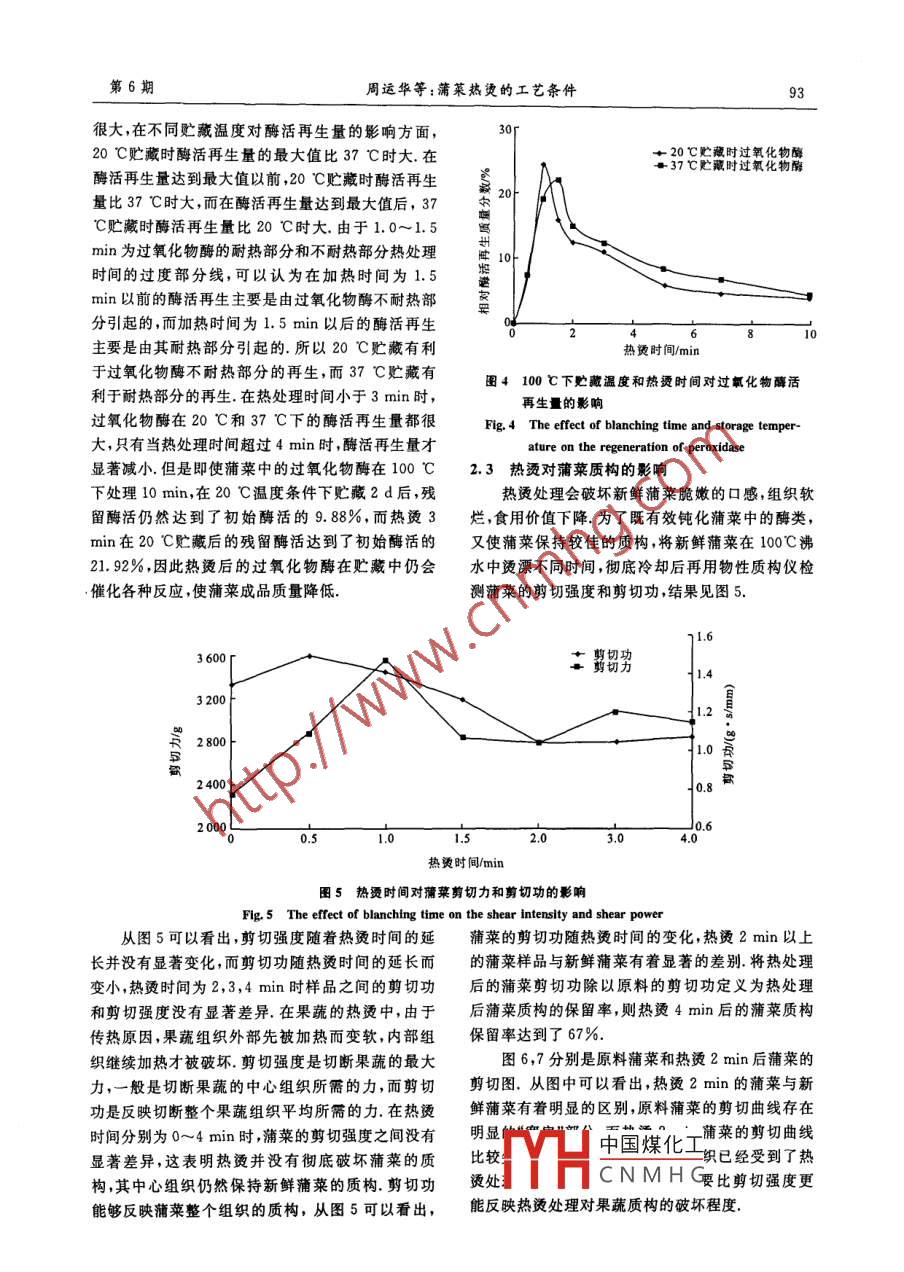 第23卷第6期無錫輕工大學(xué)學(xué)報(bào)Vol 23 No 62004年11月Journal of Wuxi University of Light IndustryNov.2004文章編號(hào):1009-038X(2004)06-0090-06蒲菜熱燙的工藝條件周運(yùn)華,張慜(江南大學(xué)食品學(xué)院,江蘇無錫214036)摘要:通過對(duì)過氧化物酶的殘留酶活、色差、剪切強(qiáng)度和剪切功的分析,研究了熱燙時(shí)間和貯藏溫度對(duì)蒲菜的過氧化物酶、色澤和質(zhì)構(gòu)的影響.結(jié)果表明,在100℃的熱燙溫度下隨著熱燙時(shí)間的延長(zhǎng),過氧化物酶活降低,而貯藏2d后酶活的再生量先增大后降低,在熱處理時(shí)間為1.0~1.5min時(shí)達(dá)到最大值;熱燙時(shí)間為4min時(shí),可基本破壞蒲茉中的過氧化物酶,且蒲萊的質(zhì)構(gòu)和色澤較好關(guān)鍵詞:蒲菜;過氧化物酶;質(zhì)構(gòu);色澤;熱燙中圖分類號(hào):TS255.36文獻(xiàn)標(biāo)識(shí)碼:AThe Study of Heat-Treatment Condition of Typha latifolia L.HOu Yun- hua, ZHANG Min(School of Food Science and Technology, Southern Yangtze University, Wuxi 214036, China)Abstract: By analysis of the retention activity of peroxidase, chromatic aberration, shear intensityand shear power, the effect of different blanching time on the peroxidase, surface color andtexture was studied. The result showed that the activity of peroxidase decreased with the increaseof blanching time at 100 C, while the regeneration amounts of peroxidase after storaging for 2days increased first and then decreased, with the maximum regeneration value occurred when theblanching time was at the range of 1 to 1. 5 minutes. When blanching time was 4 minutes, theperoxidase in Typha latifolia L. were mostly inactivated, the texture and the surface colour canbe well retaineKey words: Typha latifolia L; peroxidase; texture; surface color: heat-treatment蒲菜歸屬于香蒲科的香蒲屬( Typha),在我國(guó)統(tǒng)分類為EC.1.1.1.7,在自然界廣泛分布POD特別是長(zhǎng)江以南的湖、水渠、溝塘中,其分布比較廣能催化4種類型的反應(yīng):(1)過氧化反應(yīng);(2)氧化泛,多呈野生狀態(tài).它在我國(guó)作為蔬菜食用有很強(qiáng)反應(yīng);(3)過氧化氫反應(yīng);(4)羥基化反應(yīng),但主要催的地域性,其他國(guó)家或地區(qū)主要作為水生觀賞植物化以過氧化物和氫供體為底物的過氧化反應(yīng)().過或凈化水質(zhì)或藥用氧化物酶在果蔬加工中的作用主要包括:(1)過氧在果蔬加工中,過氧化物酶是一個(gè)非常重要的化物酶的活力與果蔬產(chǎn)品,特別是與那些非酸性蔬影響因素.過氧化物酶(POD)屬氧化還原酶系,系菜在保存期間形成的不良風(fēng)味有關(guān);(2)過氧化物收稿日期:2004-04-02;修回日期:2004-0630.作者簡(jiǎn)介:周運(yùn)華(1976),男湖南衡山人農(nóng)產(chǎn)品貯藏與加工TH中國(guó)煤化工CNMHG第6期周運(yùn)華等:蒲萊熱燙的工藝條件酶的活力與果蔬中的酶促褐變有關(guān),過氧化物酶能搗碎機(jī)中搗碎成均漿,均漿用雙層紗布過濾后再置催化果蔬中的酚類物質(zhì)生成有色的醌類物質(zhì)而使于冷凍離心機(jī)中以5000r/min的速度離心10min果蔬變色;(3)過氧化物酶屬于最耐熱的酶類,它在得到澄清的酶液制得的酶液保存于冰箱中待用果蔬加工中常被用作熱處理是否充分的指標(biāo),這是1.3.2過氧化物酶液的熱處理在8支試管中加因?yàn)楫?dāng)果蔬中的過氧化物酶在熱加工中失活時(shí),其入一定容量的酶液,先將各試管在溫度為60℃的他酶以活性形式存在的可能性很小;(4)過氧化物水浴中保溫1min,然后將試管移至溫度為100℃酶與果蔬的木質(zhì)化有關(guān)的另一水浴鍋隨即記錄時(shí)間,分別在30s,1,1,5,為了保持加工果蔬的良好品質(zhì)就必須將果蔬2,3,5,7min和10min時(shí)取出一支試管作上相應(yīng)原料中的過氧化物酶鈍化,在果蔬加工中,熱處理的時(shí)間標(biāo)簽,并立即將試管在冰浴中冷卻是一個(gè)非常重要而有效的方法.據(jù)報(bào)道,許多果蔬1.3.3過氧化物酶活力的測(cè)定將待測(cè)酶液靜置中的過氧化物酶在80~90℃溫度范圍的熱失活是20min后,在比色皿中加入2.6mL緩沖液Ⅱ(0.1個(gè)雙相和部分可逆的過程,這是由于過氧化物mol/L磷酸鹽緩沖液pH值7.0),0.1mL鄰苯二酶存在不同的耐熱部分,其中不耐熱部分在熱處理胺乙醇溶液,0.2mL過氧化氫溶液,然后加入0.1時(shí)迅速失活,耐熱部分則緩慢失活,并且熱處理后mL酶液,混合均勻,在430m波長(zhǎng)下,用分光光度的酶在貯藏中,已失活的酶活又可部分再生,由于計(jì)測(cè)定反應(yīng)混合物吸光度的變化,而未經(jīng)熱處理的過氧化物酶的耐熱部分在熱處理中緩慢失活,徹底酶液稀釋10倍后進(jìn)行活力測(cè)定.以每分鐘光密度鈍化果蔬中的過氧化物酶所需要的熱燙時(shí)間將對(duì)增加一個(gè)單位定義為一個(gè)酶活單位,單位為果蔬的質(zhì)構(gòu)和色澤造成較大的破壞,故不能為了破△Asm/min.為方便比較并將原料酶液的酶活定為壞過氧化物酶而任意延長(zhǎng)果蔬的熱燙時(shí)間在有關(guān)100%,其他熱處理后的酶活與其相比較計(jì)算其相對(duì)果蔬熱燙處理工藝的研究文獻(xiàn)中,并沒有熱燙時(shí)對(duì)酶活間和貯藏溫度對(duì)過氧化物酶活的再生及熱燙對(duì)果1.3.4剪切強(qiáng)度和剪切功的測(cè)定采用物性測(cè)試蔬色澤質(zhì)構(gòu)的研究報(bào)道蒲菜的熱燙工藝報(bào)道就更儀測(cè)定模具為A/LKBF,切割前刀片速度為5.0少.在蒲菜軟罐頭的研究中,為了生產(chǎn)品質(zhì)良