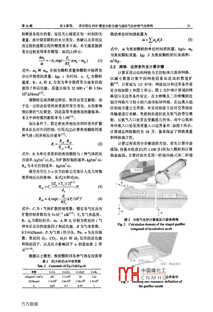 第28卷第26期中國(guó)電機(jī)工程學(xué)報(bào)vol28No.26Sep.15,20082008年9月15日Proceedings of the CSEE@2008 Chin. Soc for Elec Eng. 29文章編號(hào):02588013(200826002906中圖分類號(hào):TQ54文獻(xiàn)標(biāo)志碼:A學(xué)科分類號(hào):47020采用簡(jiǎn)化PDF模型分析分級(jí)氣流床氣化爐的氣化特性吳玉新,張建勝,岳光溪,呂俊復(fù)清華大學(xué)熱科學(xué)與動(dòng)力工程教育部重點(diǎn)實(shí)驗(yàn)室,北京市海淀區(qū)10004Analysis of the Gasification Performance of a Staged EntrainedFlow Gasifier by presumed PDF ModelWU Yu-xin, ZHANG Jian-sheng, YUE Guang-xi, LU Jun-fu( Key Laboratory for Thermal Science and Power Engineering of Ministry of Education, Tsinghua University,Haidian District, Beijing 100084, China)ABSTRACT: n order to study the character of the flow field phased model,DPM)和隨機(jī)軌道模型( stochastic trackingand the gasification performance of staged gasification method,sTM分別模擬顆粒氣化過程和考察顆粒受湍流脈technology, numerical simulation for a staged entrained flow動(dòng)的影響;計(jì)算根據(jù)簡(jiǎn)化PDF模型建立燃燒表以建立溫度、coal gasifier located in Shanxi province was conducted based組分等標(biāo)量同混合分?jǐn)?shù)間的關(guān)系,并由此計(jì)算同相氣化反應(yīng)on Fluent. Body fitted hexahedron mesh was used to minimize過程。除此之外,還引入用戶自定義函數(shù)改進(jìn)了焦炭異相反the numerical diffusion due to mesh quality. Realizable kε應(yīng)模型,通過對(duì)分級(jí)氣化爐流場(chǎng)特性和溫度等值面特征的分model was adopted to make a closure for turbulence equations.析,發(fā)現(xiàn)分級(jí)氣化爐中由于二次對(duì)沖給氧射流的引入,造成dispersed phase model(DPM) and stochastic tracking method了二次卷吸效應(yīng)以及沖擊射流效應(yīng),加強(qiáng)了爐內(nèi)混合過程( STM)were used to describe the coal particle gasification有利于碳轉(zhuǎn)化率的進(jìn)一步提高。process and to predict the turbulent disturbance effects關(guān)鍵詞:數(shù)值模擬;分級(jí)氣流床氣化爐:簡(jiǎn)化PDF模型particle motion. A combustion table was built by presumedPDF model to describe the relationship between mixture0引言fraction and the scalars of temperature, species, et al. InGE氣化工藝(原德士古氣化工藝)采用下噴式tion, User Defined Functions was used to modify the單噴嘴水煤漿氣化技術(shù),具有進(jìn)料簡(jiǎn)單,運(yùn)行穩(wěn)定,碳轉(zhuǎn)化率較高等優(yōu)點(diǎn),也是目前氣流床煤氣化爐中analysis of the flow field and the contours of temperature of thestaged entrained flow coal gasifier show that the engulfment最成熟的技術(shù)。在該工藝中,由于氣化噴嘴長(zhǎng)期and the counter flow aroused by the secondary injection處于高溫高壓環(huán)境下,加之回流氣體的沖刷,噴嘴strengthen the mixing process in the staged gasifier. This had a壽命往往很短。另一方面,工業(yè)實(shí)際運(yùn)行過程中由positive effect on the improvement of coal conversion rate.于工況、煤質(zhì)變化、煤漿流動(dòng)不暢等原因會(huì)使氧煤KEY WORDS: numerical simulation; staged entrained flor比瞬間升高,從而造成近噴嘴區(qū)域溫度過高、火焰黑區(qū)變短,這也是導(dǎo)致噴嘴燒損的重要因素。月前工業(yè)運(yùn)行的GE氣化爐噴嘴壽命般為2個(gè)月左右,摘要:為詳細(xì)研究分級(jí)氣化技術(shù)的流場(chǎng)特點(diǎn)及氣化性能,采用 Fluent軟件對(duì)山西某分級(jí)氣化爐進(jìn)行:維數(shù)值模擬。計(jì)是造成GE氣化爐被迫停爐的主要原因之-15。為算采用貼體六面體網(wǎng)格劃分計(jì)算域以降低數(shù)值擴(kuò)散,采用保護(hù)氣化噴嘴,延長(zhǎng)單爐連續(xù)運(yùn)行時(shí)間,如何在降Realizable k模型封閉湍流方程,應(yīng)用離散相模型 (dispersed低噴嘴附近區(qū)埔淂度的回時(shí)保證爐內(nèi)整體氣化性能是關(guān)中國(guó)煤化工提出非熔渣-熔渣基金項(xiàng)目:國(guó)家重點(diǎn)基礎(chǔ)研究發(fā)展計(jì)劃項(xiàng)目(973項(xiàng)目2004CB分級(jí)CNMHG到工業(yè)應(yīng)用。217705)The National Basic Research Program of China (973 Program)實(shí)驗(yàn)室熱態(tài)實(shí)驗(yàn)和利用小室模型對(duì)分級(jí)氣化2004CB21705技術(shù)的模擬結(jié)果均表明,采用分級(jí)氣化技術(shù)能夠中國(guó)電機(jī)工程學(xué)有效降低主噴嘴附近區(qū)域的氣化溫度,二次給氧加(2)將煤漿看作燃料流股,O2和CO2混合氣入后氣化溫度迅速升高,保證了焦炭氣化反應(yīng)迅速體看作氧化劑流股,以便采用單組分簡(jiǎn)化PDF模型進(jìn)行,分級(jí)式氣化爐碳轉(zhuǎn)化率、冷煤氣效率均高于3)氣化爐內(nèi)任一點(diǎn)在任何時(shí)刻都保持化學(xué)GE氣化爐的設(shè)計(jì)值。這些優(yōu)點(diǎn)已在示范工程運(yùn)行平衡,只是受到湍流影響而偏離平衡狀態(tài),這一影結(jié)果中得到驗(yàn)證。為進(jìn)一步掌握分級(jí)氣化爐流場(chǎng)響可采用牌DF函數(shù)來(lái)表示。特性以及爐內(nèi)各組分、溫度的分布,進(jìn)而深入研究(4)由于微量元素氣體不是該模型的主要考其氣化機(jī)理,需要進(jìn)行更細(xì)致的數(shù)值建模研究。本慮指標(biāo),為簡(jiǎn)化起見,不考慮S元素在反應(yīng)平衡中文采用簡(jiǎn)化PDF模型對(duì)山西某分級(jí)氣化爐進(jìn)行三的作用,將S元素的組分并入N元素,認(rèn)為N元維數(shù)值模擬,并將模擬結(jié)果同某GE氣化爐的數(shù)值