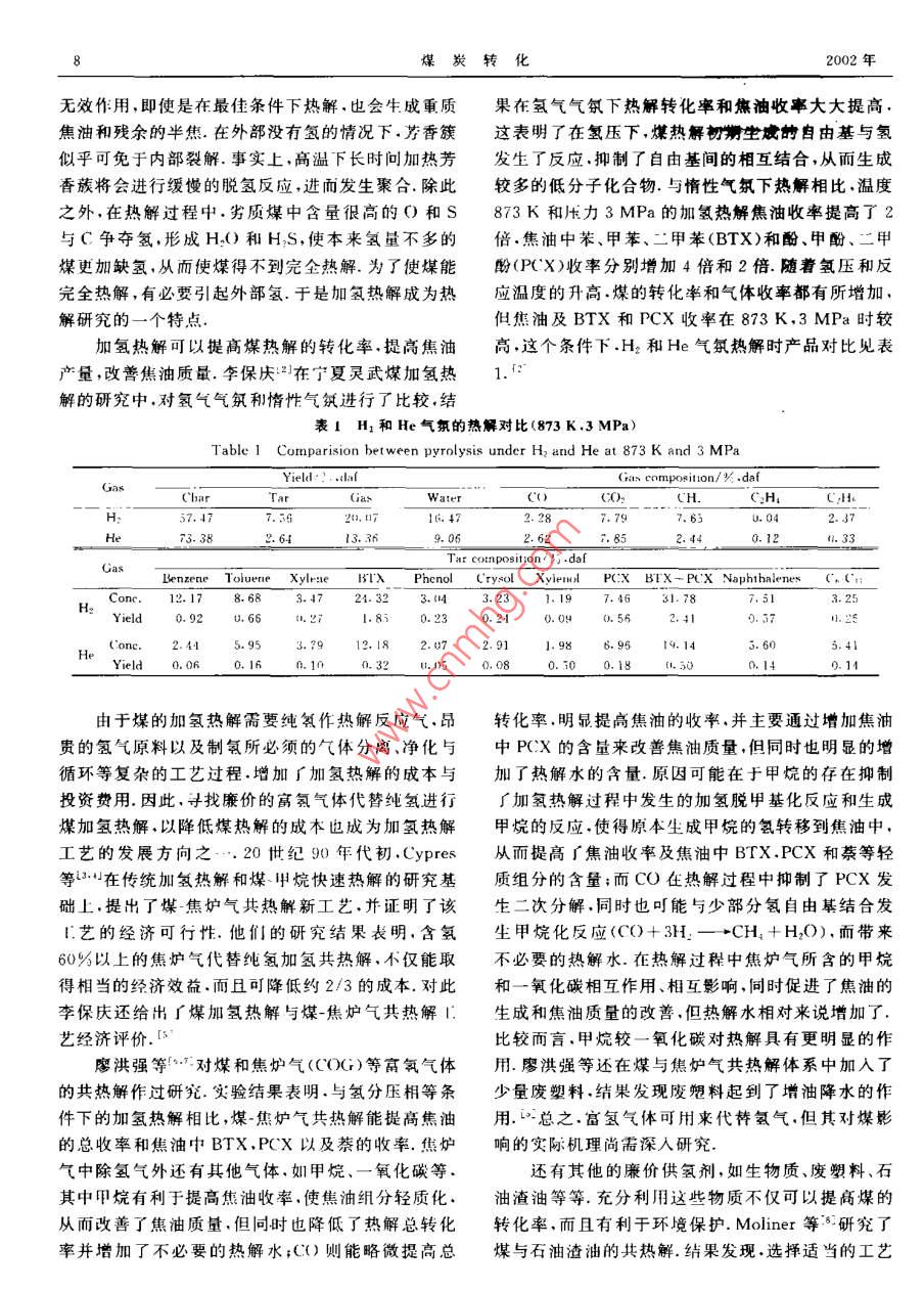 第25卷第1期媒炭轉(zhuǎn)化Vol.21 No. 12002年1月COAI, C(NVERSIONJan. 2002煤與生物質(zhì)的共熱解李世光”徐紹 平1摘要對(duì)近年來煤與生物質(zhì)共熱解的研究作了綜述.研究的焦點(diǎn)集中在由富氨的生物質(zhì)向貧氫的煤的轉(zhuǎn)移,即尋找是否存在所謂的協(xié)同效應(yīng)。在固定床、流化床等類型反應(yīng)器中煤與生物質(zhì)共熱解的研究沒有發(fā)現(xiàn)協(xié)同效應(yīng)。這主要是因?yàn)槊号c生物質(zhì)熱解溫度的差異所造成的.至今還沒見到在自由落下床中煤與生物質(zhì)共熱解的研究報(bào)道.在這種類型的反應(yīng)器中,物料自由落下,物料粒子的溫度很大程度上依賴于其黑度.由于煤的黑度遠(yuǎn)遠(yuǎn)大于生物質(zhì)的黑度。在自由落下床中可以使二者達(dá)到同步熱解.此外.生物質(zhì)熱解產(chǎn)生的富氫氣體可以作為煤加氫熱解的氫源.在這個(gè)基礎(chǔ)上。提出了兩步法共熱解的思路.關(guān)鍵詞煤,生物質(zhì),共熱 解中圖分類號(hào)TQ530. 2解轉(zhuǎn)化率不高。因此如何供氫以提高煤轉(zhuǎn)化率成了0引言熱解研究的關(guān)鍵。這使得加氫熱解度成為煤清潔利用的研究熱點(diǎn).由于純氫的生產(chǎn)成本較高,研究者隨著石油資源儲(chǔ)量的日益臧少.從長(zhǎng)遠(yuǎn)來看.國(guó)們把注意力集中到尋找廉價(jià)的氫源上來.際油價(jià)不斷攀升.各國(guó)都加大對(duì)煤研究開發(fā)的力度.快速熱解不僅足煤清潔利用的-種重要方法.力圖通過煤的清潔利用以達(dá)到最終用煤代替石油.也是使生物質(zhì)轉(zhuǎn)化為氣體和液體燃料很有效的手緩解石油危機(jī)的日的.我國(guó)煤儲(chǔ)量豐富.到月前為段.生物質(zhì)是富禮物質(zhì),可以做煤的供氨劑.煤與生止,我國(guó)能源消費(fèi)主要還是以煤為主.生物質(zhì)則足物質(zhì)共熱解不僅可以提高煤的轉(zhuǎn)化率.降低生產(chǎn)成種可再生資源,它是世界第四大能源.對(duì)全世界一次本.還可有效利用自然資源.關(guān)于煤的快速熱解、加能源的貢獻(xiàn)約占14%.在我國(guó).生物質(zhì)占一次能源氫熱解、多年米有大量的研究報(bào)道.牛物質(zhì)快速熱解總量的33%,是僅次于煤的第_二大能源.我國(guó)的生的研究報(bào)道也比較多.但是生物質(zhì)與煤共熱解.特別物質(zhì)資源豐富,每年農(nóng)作物廢棄物就相當(dāng)于6化多1是快速共熱解的研究鮮有所見.本研究就是在這種標(biāo)準(zhǔn)煤,還有約3億1煤當(dāng)量的林業(yè)發(fā)棄物.5如此情形下進(jìn)行的.試圖尋找一種新的途徑實(shí)現(xiàn)煤與生豐富的資源,同樣引起世界各[國(guó)對(duì)生物質(zhì)利用的高物質(zhì)的共熱解.度重視.煤的利用方法很多,我國(guó)長(zhǎng)期以來主要是以直.1煤加氫熱解接燃燒的方式加以利用.這不僅造成了很大的環(huán)境污染,而且考慮到煤的有機(jī)組成成分,直接燃燒并不假如在煤的熱解過程中.氡能夠適當(dāng)?shù)胤峙浣o能發(fā)揮其最大的潛能.因此研究者們紛紛尋找各種碳原子。則煤中的氫量幾乎足以便之全部揮發(fā),至少清潔利用的新途徑,以達(dá)到既能減少環(huán)境污染,又能對(duì)中、低煤階的煤米說是如此的.然而,由于煤的結(jié)充分而有效地利用煤的有機(jī)成分的月的.快速熱解構(gòu)特點(diǎn).氫主要以化合水(米源于羥基)及高度穩(wěn)定作為煤清潔利用的一-種重要方法.可以使產(chǎn)品簡(jiǎn)單的輕質(zhì)脂肪烴(如甲烷及乙烷)的形式逸出.因而使化、集中化而備受關(guān)注.由于煤有貧氫的特點(diǎn).其熱急需氫的其余碳原子只好空著.由于內(nèi)在氫的這種.●1)鎮(zhèn)士牛:21副教授.大連埋」大學(xué)化T學(xué)院化112系.11號(hào)12大連.收稿口期:2001-11018煤炭轉(zhuǎn)化2002年無效作用,即使是在最佳條件下熱解、也會(huì)生成重質(zhì)果在氫氣氣氛下熱解轉(zhuǎn)化率和焦油收率大大提高.焦油和殘余的半焦.在外部沒有氫的情況下。勞香簇這表明了在氫壓下,煤熱解初搠坐慮的自由基與氫似乎可免于內(nèi)部裂解.事實(shí)上,高溫下長(zhǎng)時(shí)問加熱芳發(fā)生了反應(yīng).抑制了自由基間的相互結(jié)合,從而生成香蔟將會(huì)進(jìn)行緩慢的脫氫反應(yīng),進(jìn)而發(fā)生聚合.除此較多的低分子化合物.與惰性氣氛下熱解相比.溫度之外,在熱解過程中.劣質(zhì)煤中含量很高的O和S873K和壓力3MPa的加氫熱解焦油收率提高了2與C爭(zhēng)奪氫,形成H2O和H,S,使本來氫量不多的倍.焦油中苯、甲苯、二甲苯(BTX)和酚、甲酚、二甲煤更加缺氫,從而使煤得不到完全熱解.為了使煤能酚(P(X)收率分別增加4倍和2倍.隨著氫壓和反完全熱解,有必要引起外部氫,于是加氫熱解成為熱應(yīng)溫度的升高.煤的轉(zhuǎn)化率和氣體收率都有所增加,解研究的一一個(gè)特點(diǎn).但焦油及BTX和PCX收率在873K,3MPa時(shí)較加氫熱解可以提高煤熱解的轉(zhuǎn)化率.提高焦油高,這個(gè)條件下.H2和He氣氛熱解時(shí)產(chǎn)品對(duì)比見表產(chǎn)量,改善焦油質(zhì)量.李保慶:"在寧夏靈武煤加氫熱解的研究中。對(duì)氫氣氣氛利情性氣氛進(jìn)行了比較,結(jié)表1 H:和He氣氛的熱解對(duì)比(873 K .3 MPa)Table 1 Comparision between pyrolysis under H2 and He at 873 K and 3 MPaYield: edaGan eomporion/K .dafGasCharCiasWaterCO:CH57.477.5620. 0716. 472.287.797.63U.042.37te73. 3826413. 369.062.627. 
