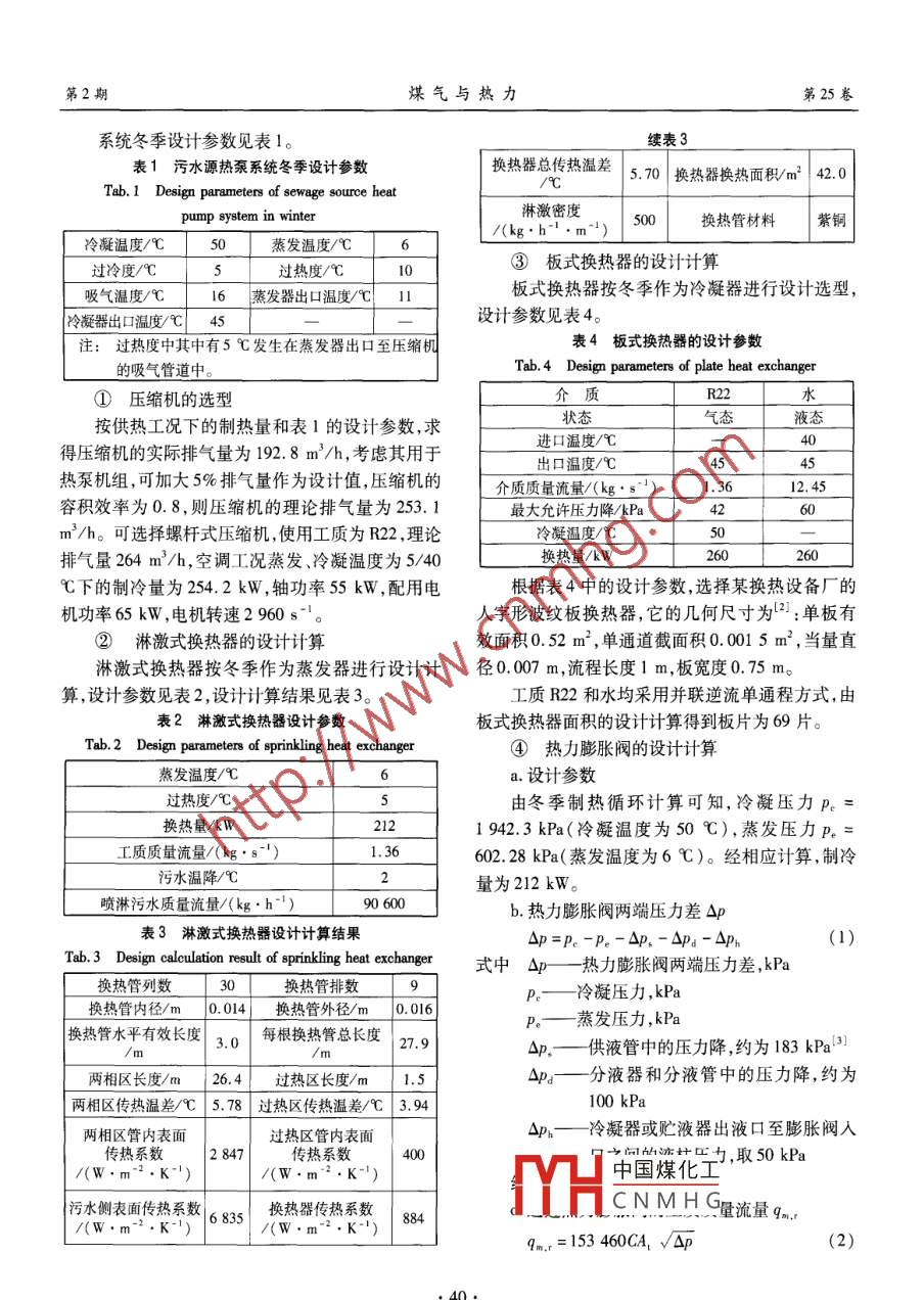 第25卷第2期煤氣與熱力Vol. 25 No.22005年2月GAS & HEATFeb. 2005污水源熱泵系統(tǒng)的設(shè)計(jì)計(jì)算姚楊,馬最良,趙麗瑩(哈爾濱工業(yè)大學(xué)市政環(huán)境工程學(xué)院,黑龍江哈爾濱150090)商要:設(shè)計(jì)了一套污水源熱泵,將經(jīng)過(guò)處理后的污水作為低位熱源。對(duì)污水源熱泵系統(tǒng)中的淋激式換熱器、板式換熱器、壓縮機(jī)、熱力膨脹閥進(jìn)行設(shè)計(jì)和選型計(jì)算。關(guān)鍵詞:水源熱泵; 污水源熱泵; 淋激式換熱器; 板式換熱器;壓縮機(jī);熱力 膨脹閥中圖分類號(hào): TU995文獻(xiàn)標(biāo)識(shí)碼: A文章編號(hào): 1000 -4416(2005)02 -0039 -04Design Calculation of Sewage Source Heat Pump SystemYAO Yang,MA Zui-liang, ZHAO Li-ying( School of Municipal & Enironmental Engineering ,Haerbin Institute of Technology , Haerbin150090, China)Abstract: A sewage source heat pump is designed, and the treated sewage is used as low-levelheat source. The design and model calculation of sprinkling heat exchanger , plate heat exchanger, com-pressor and thermal expansion valve used in the sewage source heat pump system are made.Key words: water source heat pump; sewage source heat pump; sprinkling heat exchanger;plate heat exchanger; compressor; thermal expansion valve哈爾濱的城市污水中可利用的熱量和城市的熱季供熱,夏季供冷。污水源熱泵機(jī)組主要由壓縮機(jī)、需要量都非常高,可以優(yōu)先采用城市污水熱能利用淋激式換熱器、板式換熱器、熱力膨脹閥等設(shè)備組系統(tǒng)"。1999年,哈爾濱市區(qū)工業(yè)廢水處理量為成。冬季供熱系統(tǒng)設(shè)計(jì)供回水溫度為45/40 C,機(jī)5124x10*t。哈爾濱某制藥廠排放的廢水主要由組設(shè)計(jì)制熱量260 kW。為防止地板結(jié)露,夏季供冷生產(chǎn)廢水和生活廢水組成??诜庈囬g排放的廢水水溫度為16 ~18 C,供回水溫差2 ~3 C ,機(jī)組設(shè)計(jì)主要在洗瓶、配劑、刷罐、沖洗地面、冷卻等工序中產(chǎn)制冷量230 kW。污水源熱泵系統(tǒng)見(jiàn)圖1。生,排放量較多且流量穩(wěn)定;片劑、中藥車間排放量適中,流量不穩(wěn)定。生活污水主要為洗滌用水,在夏用戶系統(tǒng)季時(shí)排放量較多。污水全部進(jìn)人污水處理系統(tǒng),經(jīng)13、二級(jí)處理后污水水質(zhì)符合CGB 8978- 96《污水綜合排放標(biāo)準(zhǔn)》規(guī)定的醫(yī)藥污水的排放標(biāo)準(zhǔn)。夏季污水溫度維持在17~22 C ,冬季維持在13~17C,日污冬季工質(zhì)循環(huán)流向一水排放量為2 745 ~4 770 m'/d。將城市污水處理夏季工質(zhì)循環(huán)流向一系統(tǒng)與水源熱泵機(jī)組相結(jié)合,是--種理想的城市污1.壓縮機(jī)2.四通閥3.淋激式換熱器4.高壓貯液器水綜合利用方法。本文對(duì)污水源熱泵系統(tǒng)的設(shè)計(jì)和5.干燥過(guò)濾器6.執(zhí)力膨脹閥7.I止 同閥8.板式換熱器9.污水泵中國(guó)煤化工不水泵13.調(diào)峰鍋爐設(shè)備選型進(jìn)行研究。1系 統(tǒng)的設(shè)計(jì)和設(shè)備選型YHCNMHG統(tǒng)污水源熱泵為廠區(qū)中4 000 m2的住宅建筑冬F(xiàn)ig. 1 Sewage source heat pump system●39●第2期煤氣與熱力第25卷.系統(tǒng)冬季設(shè)計(jì)參數(shù)見(jiàn)表1。續(xù)表3表1污水源熱泵 系統(tǒng)冬季設(shè)計(jì)參數(shù)換熱器總傳熱溫差5.70|換熱器換熱面積/m2 42. 0Tab. 1 Design parameters of sewage source heat/C淋激密度pump system in winter500換熱管材料.紫銅/(kg.h-'.m~)冷凝溫度/C50蒸發(fā)溫度/C6③板式換熱器的設(shè)計(jì)計(jì)算過(guò)冷度/C過(guò)熱度/C1吸氣溫度/C6蒸發(fā)器出口溫度/C 1I板式換熱器按冬季作為冷凝器進(jìn)行設(shè)計(jì)選型,冷凝器出口溫度/C| 45設(shè)計(jì)參數(shù)見(jiàn)表4。注:過(guò)熱度中其中有5C發(fā)生在蒸發(fā)器出口至壓縮機(jī)表4板式換熱器的設(shè)計(jì)參數(shù)的吸氣管道中。Tab. 4 Design parameters of plate heat exchanger①壓縮機(jī)的選型介質(zhì)_R22水狀態(tài)_氣態(tài)液態(tài)按供熱工況下的制熱量和表1的設(shè)計(jì)參數(shù),求進(jìn)口溫度/C40得壓縮機(jī)的實(shí)際排氣量為192.8 m'/h,考慮其用于出口溫度/C4:熱泵機(jī)組,可加大5%排氣量作為設(shè)計(jì)值,壓縮機(jī)的介質(zhì)質(zhì)量流量/(kg.s"I)1.3612.45容積效率為0.8,則壓縮機(jī)的理論排氣量為253. 1最大允許壓力降/kPa42m'/h??蛇x擇螺桿式壓縮機(jī),使用工質(zhì)為R22 ,理論5(-排氣量264m'/h,空調(diào)工況蒸發(fā)、冷凝溫度為5/40換熱量/kW260C下的制冷量為254.2kW,軸功率55kW,配用電根據(jù)表4中的設(shè)計(jì)參數(shù),選擇某換熱設(shè)備廠的機(jī)功率65kW,電機(jī)轉(zhuǎn)速2960s"'。人字形波紋板換熱器,它的幾何尺寸為2:單板有②淋激式換熱器的設(shè)計(jì)計(jì)算效面積0.52 m2 ,單通道截面積0.0015 m2 ,當(dāng)量直淋激式換熱器按冬季作為蒸發(fā)器進(jìn)行設(shè)計(jì)計(jì)徑0.007 m,流程長(zhǎng)度1 m, 板寬度0.75 m。算,設(shè)計(jì)參數(shù)見(jiàn)表2,設(shè)計(jì)計(jì)算結(jié)果見(jiàn)表3。工質(zhì)R22和水均采用并聯(lián)逆流單通程方式,由.表2淋激式換熱器設(shè)計(jì)參數(shù)板式換熱器面積的設(shè)計(jì)計(jì)算得到板片為69片。Tab.2 Design parameters of sprinkling heat exchanger④熱力膨脹閥的設(shè)計(jì)計(jì)算a.設(shè)計(jì)參數(shù)5由冬季制熱循環(huán)計(jì)算可知,冷凝壓力p. =212. 1 942.3 kPa(冷凝溫度為50 C),蒸發(fā)