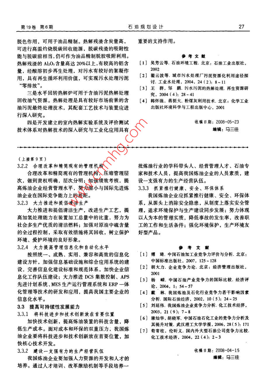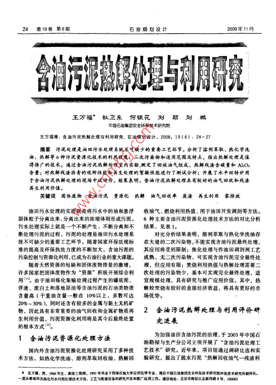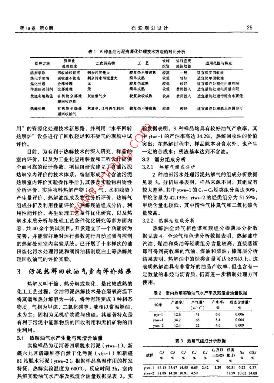 24第19卷第6期石油規(guī)劃設(shè)計2008年11月王萬?!ざ判l(wèi)東何銀花劉穎劉鵬中國石油集團(tuán)安全環(huán)保技術(shù)研究院王萬福等.含油污泥熱解處理與利用研究.石油規(guī)劃設(shè)計,2008,19(6):24~27摘要污泥處理是油田污水處理系統(tǒng)不可缺少的重要工藝環(huán)節(jié)。分析了溶劑萃取、熱化學(xué)洗油、熱解等6種污泥資源化技術(shù)的利用程度、二次污染物和適用范圍及特點,指出熱解處理是值得推廣的技術(shù)。通過含油污泥熱解處理室內(nèi)實驗,測定了回收油氣組成、熱解殘渣含碳量和ALO3含量;對熱解殘渣瀝青的吸附性能和再生處理的絮凝性能進(jìn)行了測試分析;開展了水平回轉(zhuǎn)爐用于含油污泥熱解處理的現(xiàn)場中試評價。結(jié)聚表明,含油污泥熱解處理具有較好的油氣回收和殘渣再生利用價值關(guān)鍵詞固體廢物含油污泥資源化熱解油氣回收率廢渣再生利用零排放油田污水處理的實質(zhì)就是將污水中的油和懸浮收油氣、燃燒利用熱值、用于油田開發(fā)調(diào)剖等方法。固體粒子分離出來,分離出來的濃縮體則形成污泥。6種主要含油污泥資源化處理技術(shù)方法的對比分析污水處理實際上就是一個不斷產(chǎn)生、不斷分離和不結(jié)果,見表1。斷處理污泥的過程,污泥的處理是油田污水處理系對比分析結(jié)果表明,溶劑萃取與熱化學(xué)洗油存統(tǒng)不可缺少的重要工藝環(huán)節(jié)。隨著國家環(huán)保法規(guī)標(biāo)在大量的二次污染物,不能實現(xiàn)含油污泥最終處理,準(zhǔn)的提高及環(huán)保執(zhí)法力度的不斷加大,含油污泥的其應(yīng)用將受到限制;焦化處理與作油田調(diào)剖劑工藝污染控制與資源化利用,已成為石油行業(yè)的重大課題。成熟,無二次污染物,可實現(xiàn)含油污泥完全最終處隨著天然資源的短缺和固體廢物排量的激增,理,但應(yīng)用有限;焚燒利用熱值與熱解處理需要二許多國家把固體廢物作為“資源”積極開展綜合利次處理的污染物少,基本可實現(xiàn)完全最終處理,適用口。由于油田煉化集輸處理過程產(chǎn)生的罐底泥、宜規(guī)模處理,具有研究與推廣應(yīng)用價值。其中,熱浮渣、廢白土和落地原油等含油污泥的石油類物質(zhì)解較焚燒有較好的直接經(jīng)濟(jì)效益,將具有更好的市含量高(千重油含量一般在10%以上,多數(shù)可達(dá)場優(yōu)勢。20%~30%),同時還含有較多的金屬與黏土無機(jī)礦物,因此具有非常重要的油氣回收和金屬礦物質(zhì)再2含油污泥熱解處理與利用評價研生利用價值,污泥資源化利用將是其今后最終處置究進(jìn)長的根本方式(含油污泥資源化處理方瀆為加強(qiáng)油田含油污泥的治理,于2003年中國石油勘探與生產(chǎn)分公司立項開展了“含油污泥處理工國內(nèi)外含油污泥資源化處理研究采用了多種技藝技術(shù)”研究。近年來,項目組通過調(diào)研比選和實術(shù)方法,如熱化學(xué)洗油、溶劑萃取回收油、熱解回驗研究,提出了脫水污泥“熱解回收油氣一殘渣利奉王萬福,男,1966年生,高級工程師。1991年畢業(yè)于西南石油大學(xué)應(yīng)用化學(xué)專業(yè),現(xiàn)任中國石油集團(tuán)安全環(huán)保技術(shù)研究院環(huán)保技術(shù)研究所副所長一直從事油田及煉化污水污泥處理技術(shù)方法、工藝與配套設(shè)備的研究開發(fā)和推廣應(yīng)用工作。通信地址:北京市海淀區(qū)志新西路8號,10008第19卷第6期石油規(guī)劃設(shè)計表16種含油污泥資源化處理技術(shù)方法的對比分析處理方法資源化二次污染物設(shè)施行直接適用范圍與特點處理程度工藝投資經(jīng)濟(jì)效益溶劑萃取回收油較徹底剩余污泥量大較復(fù)雜不夠成熟較高般適宜深度回收油熱化學(xué)洗油回收油不徹底剩余污水污泥量大簡單成熟較低較好適宜簡單回收油焦化處理全部處理較復(fù)雜成熟較低較好適宜最終處理但用量有限作油田調(diào)剖劑全部處理簡單成熟較低費(fèi)用投人適宜最終處理但用量有限焚燒利用熱值有機(jī)物全部處灰渣煙氣少較復(fù)雜較成熟較高費(fèi)用投入適宜最終處理污泥含水要低理回收熱能熱解處理有機(jī)物全部處灰渣少,且可再生利用較復(fù)雜不夠成熟較高較好適宜最終處理脫水泥餅即可理回收油氣用”的資源化處理技術(shù)新思路,并利用“水平回轉(zhuǎn)驗數(shù)據(jù)表明,3種樣品均具有較好油氣產(chǎn)收率,其熱解爐”設(shè)備進(jìn)行了回收輕烴和不凝氣的現(xiàn)場中試中w-1的產(chǎn)油率高達(dá)34.2%,熱解回收油的價值評價。突出;在熱解過程中,樣品除本身含水外,也產(chǎn)生目前,為有利于熱解技術(shù)的深入研究、樣品的一定的合成水;殘渣基本達(dá)到不含油。室內(nèi)評價,以及為工業(yè)化應(yīng)用裝置和工程設(shè)計提供32餾分組成分析全面可靠的設(shè)計參數(shù),項目組研究建立了含油污泥3.21熱解氣組成分析熱解室內(nèi)評價的技術(shù)體系。編制形成了《含油污泥2種油田污水處理污泥熱解氣的組成分析數(shù)據(jù)熱解室內(nèi)評價實驗操作手冊》,其涉及實驗物料物性見表3。分析結(jié)果表明,樣品來源不同,其組成有分析評價、實驗物料熱解產(chǎn)物(油、氣、水和殘渣)較大差異。其中ytws-1的C1~C烴類組分高達(dá)90%,產(chǎn)生量評價、熱解油組成