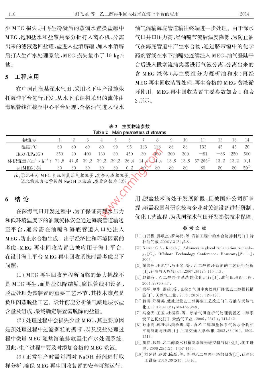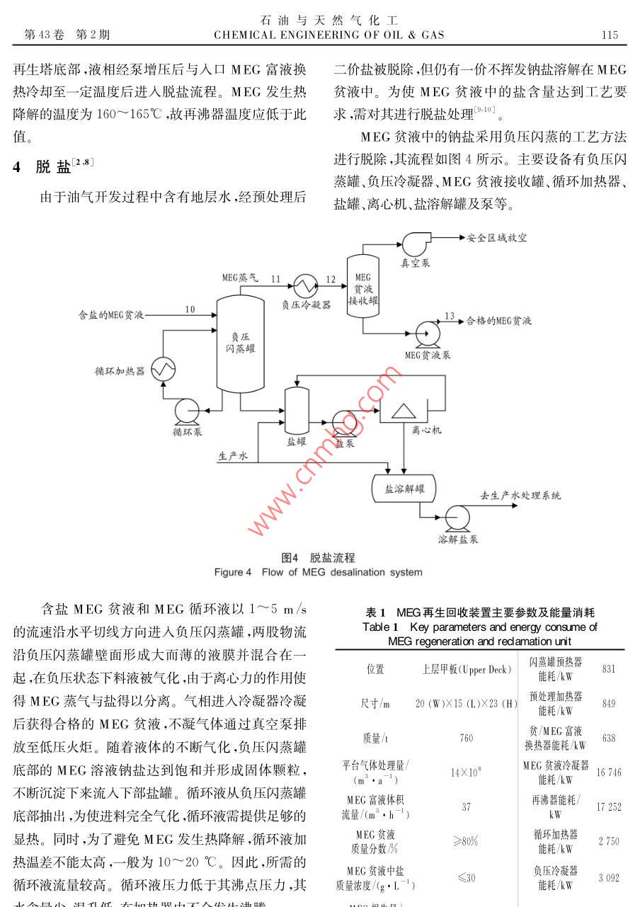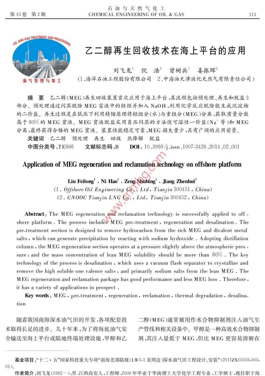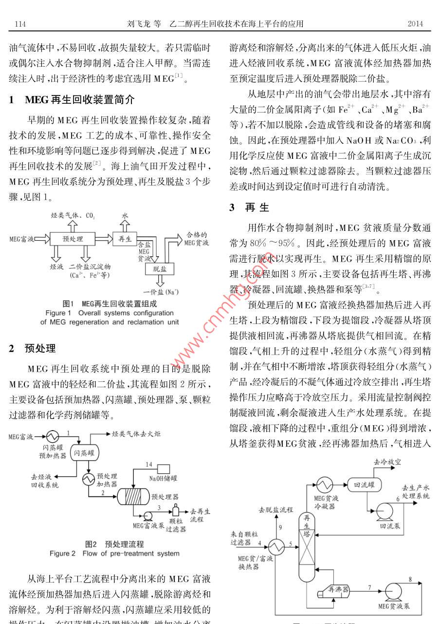 石油與天然氣化工第43卷第2期CHEMICAL ENGINEERING OF OIL gas11OIL AND GAS TREA乙二醇再生回收技術(shù)在海上平臺的應(yīng)用劉飛龍倪浩曾樹兵姜振暉油氣處理與加工(1.海洋石油工程股份有限公司2.中海油天津液化天然氣有限責任公司)摘要乙二醇(MEG)再生回收裝置首次應(yīng)用于海上平臺,其流程包括預(yù)處理、再生和脫鹽3部分。預(yù)處理通過閃蒸脫除MEG富液中的輕烴并加入NaOH,利用化學反應(yīng)脫除能生成沉淀物的二價鹽。再生過程是在低壓下利用精餾原理將輕組分(水)與重組分(MEG)分離,獲取質(zhì)量分數(shù)高于80%的MEG貧液。MEG貧液脫鹽采用負壓閃蒸的方法使可溶性一價鹽(Na等)和MEG分離,最終獲得合格的MEG貧液。裝置性能穩(wěn)定可靠,MEG損失量少,具有廣闊的應(yīng)用前景。關(guān)鍵詞乙二醇預(yù)處理再生回收熱降解脫鹽中圖分類號:TE866文獻標志碼:BDOI:10.3969ssn.1007-3426.2014.02.01pplication of MEg regeneration and reclamation technology on offshore platformLiu Feilong. Ni Hao, Zeng Shubing, Jiang Zhenhui(l. Offshore Oil Engineering Co, Ltd, Tianjin 300451, China)(2. CNoOC Tianjin LNG Co, Ltd, Tianjin 300452, China)Abstract: The MEG regeneration and reclamation technology is successfully applied to offshore platform. The process includes MEG pre-treatment, regeneration and desalination. Thepre-treatment section is designed to remove hydrocarbon from the rich MEG and divalent metalsalts, w hich can generate precipitation by reacting with sodium hy droxide. Adopting distillationcolumn, the MEg regeneration section operates at a pressure slightly above the atmospheric pressure, and the mass concentration of lean MEG solubility should be more than 80%. The keytechnology of the process is desalination, w hich uses a vacuum flash separator to crystallize andremove the high soluble one valence salts, and primarily sodium salts from the lean MEG. TheMEG regeneration and reclamation package has good performance and less MEG loss. Thereforeit has a variety of applications in prospectKey words MEG, pre-treatment, regeneration, reclamation, thermal degradation, desalina-隨著我國南海深水油氣田的開發(fā),各項配套技二醇(MEG)通常被用作水合物抑制劑注入油氣生術(shù)取得長足的進步。幾十年來,為了將海底油氣安產(chǎn)管線和相關(guān)設(shè)備中。甲醇是一種高效水合物抑制全輸送至海上平臺或陸地終端處理設(shè)施,甲醇和乙劑,其注入量低于MEG,但比MEG更容易溶解在基金項目:“十二·五”國家科技重大專項“南海北部陸坡(LW3-1及周邊)深水油氣田工程設(shè)計、安裝”(2011X05056-003-作者簡介:劉飛龍(1982-),男,江西高安人,工程師,2008年畢業(yè)于華南理工大學化學工程專業(yè),工學碩士,現(xiàn)任職于海114劉飛龍等乙二醇再生回收技術(shù)在海上平臺的應(yīng)用2014油氣流體中,不易回收,故損失量較大。若只需臨時游離烴和溶解烴,分離出來的氣體進亼低壓火炬,油或偶爾注亼水合物抑制劑,適合注入甲醇。當需連進入烴液回收系統(tǒng),MEG富液流體經(jīng)加熱器加熱續(xù)注入時,出于經(jīng)濟性的考慮宜選用MEGm至預(yù)定溫度后進入預(yù)處理器脫除二價鹽。1MEG再生回收裝置簡介從地層中產(chǎn)出的油氣會帶出地層水,其中溶有大量的二價金屬陽離子(如Fe+、Ca、Mg、a3早期的MEG再生回收裝置操作較復(fù)雜,隨著等),若不加以脫除會造成管線和設(shè)備的堵塞和腐技術(shù)的發(fā)展,MEG工藝的成本、可靠性操作安全蝕。因此在預(yù)處理器中加入NaOH或NaCO3,利性和環(huán)境影響等問題已逐步得到解決,促進了MEG用化學反應(yīng)使MEG富液中二價金屬陽離子生成沉再生回收技術(shù)的發(fā)展。海上油氣田開發(fā)過程中,淀物,然后通過顆粒過濾器除去。當顆粒過濾器壓MEG再生回收系統(tǒng)分為預(yù)處理、再生及脫鹽3個步差或時間達到設(shè)定值時可進行自動清洗驟,見圖1。3再生烴類氣體.C0水用作水合物抑制劑時,MEG貧液質(zhì)量分數(shù)通MEG富液C預(yù)處理再生合格的MEG貧液常為80%~95%。因此,經(jīng)預(yù)處理后的MEG富液貧需進行脫水以實現(xiàn)再生。MEG再生采用精餾的原烴液二價鹽沉淀物脫鹽(Ca2、Fe"等理,其流程如圖3所示,主要設(shè)備包括再生塔、再沸價鹽(Na)器、冷凝器、回流罐、換熱器和泵等3。圖1MEG再生回收裝置組成預(yù)處理后的MEG富液經(jīng)換熱器加熱后進入再Figure 1 Overall systems configurationof MEG regeneration and reclamation unit生塔,上段為精餾段,下段為提餾段,冷凝器從塔頂提供液相回流,再沸器從塔底提供氣相回流。在精2預(yù)處理餾段,氣相上升的過程中,輕組分(水蒸氣)得到精ⅥEG再生回收系統(tǒng)中預(yù)處理的目的是脫除制,并在氣相中不斷增濃,塔頂獲得輕組分(水蒸氣)MEG富液中的輕烴和二價鹽,其流程如圖2所示,產(chǎn)品,經(jīng)冷凝后的不凝氣體通過冷放空排出,再生塔主要設(shè)備包括預(yù)加熱器、閃蒸罐、預(yù)處理器、泵、顆粒操作壓力應(yīng)略高于冷放空壓力。采用流量控制閥控過濾器和化學藥劑儲罐等。制凝液回流,剩余凝液進入生產(chǎn)水處理系統(tǒng)。在提烴類氣體去火炬餾段,液相下降的過程中,重組分(MEG)得到增濃MEG富液閃蒸(閃蒸罐從塔釜獲得MEG貧液,經(jīng)再沸器加熱后,氣相進入預(yù)加熱器去冷放空去烴液預(yù)處理NaOH儲罐回收系統(tǒng)加熱器回流罐去生產(chǎn)水預(yù)處理器MEG貧液6處理系統(tǒng)→去再生去脫鹽流程冷疑器NEG富液系過濾器流泵來